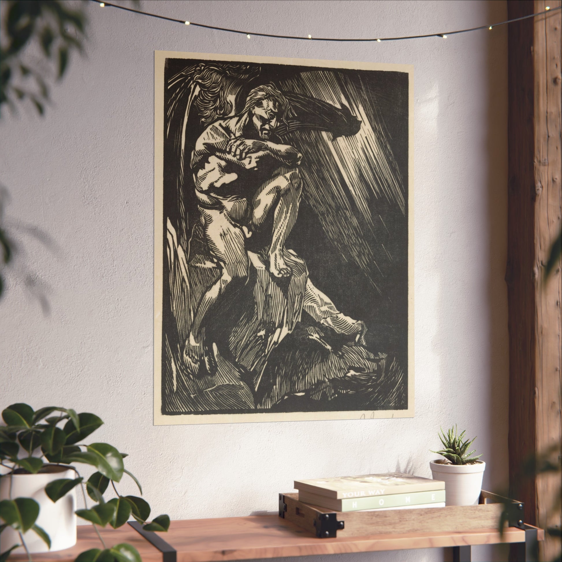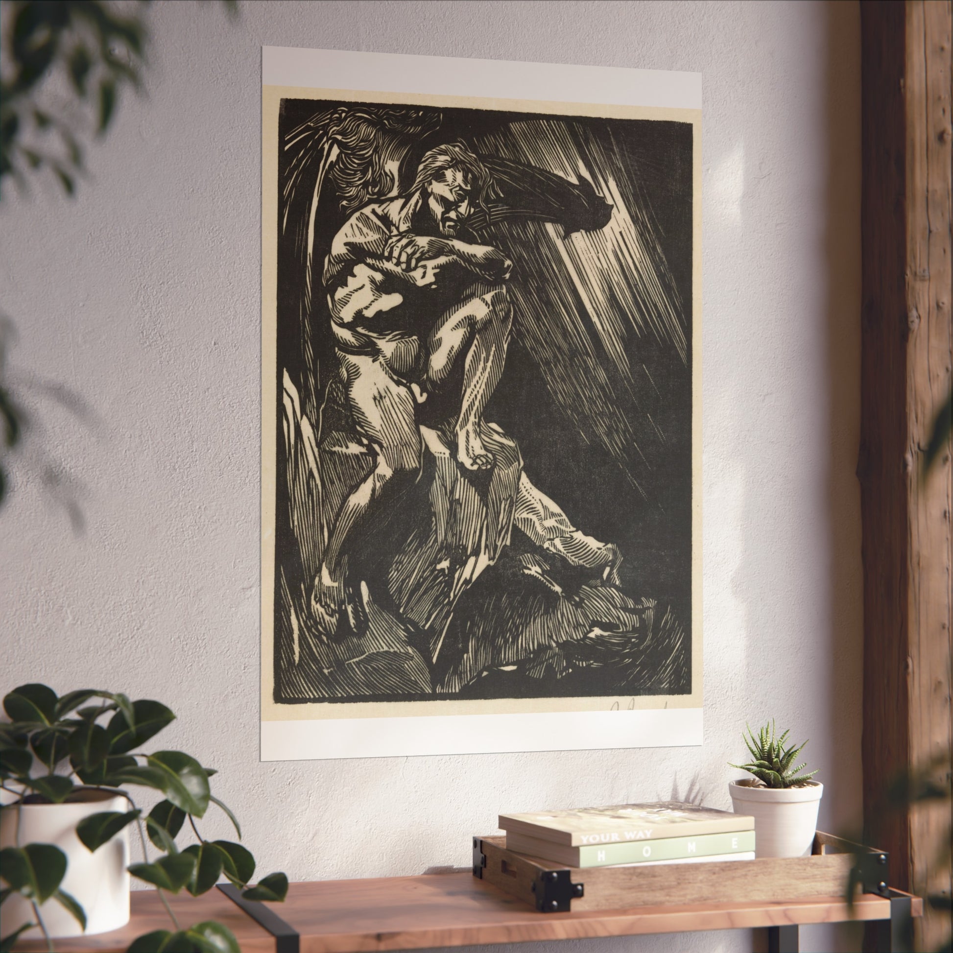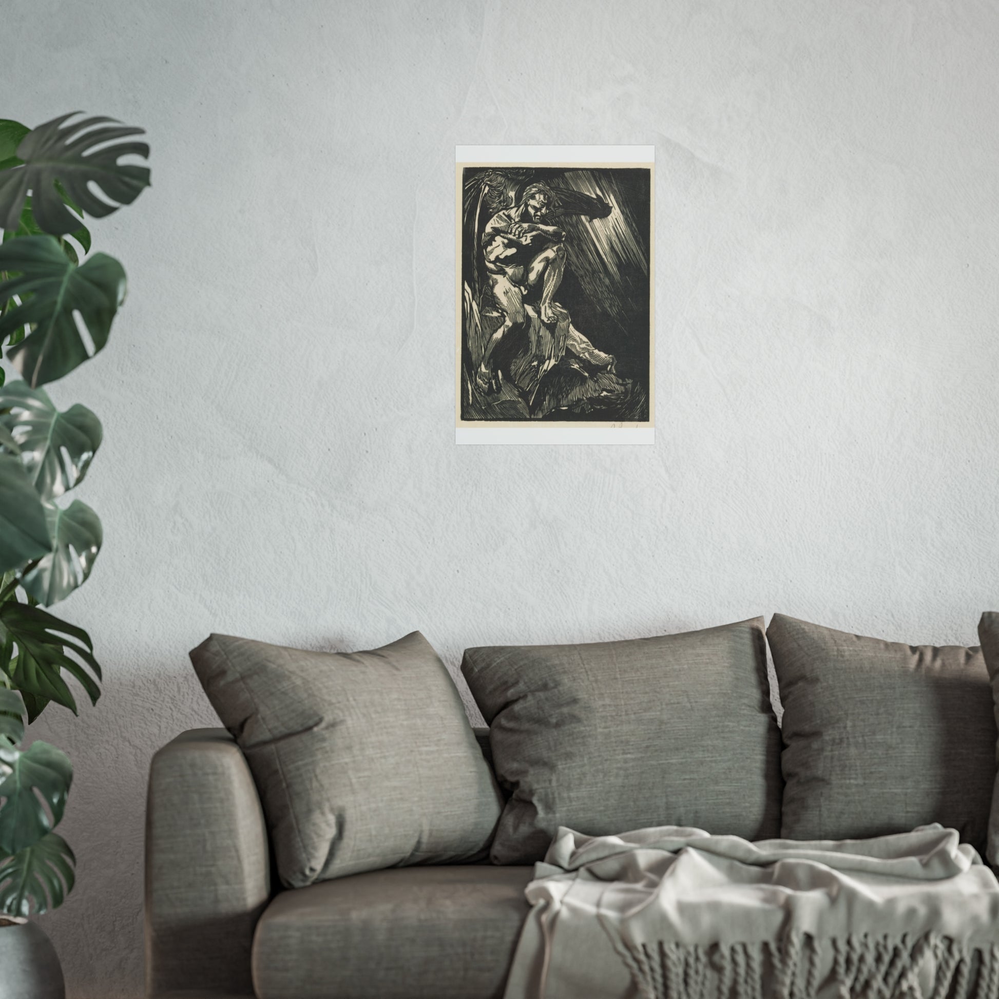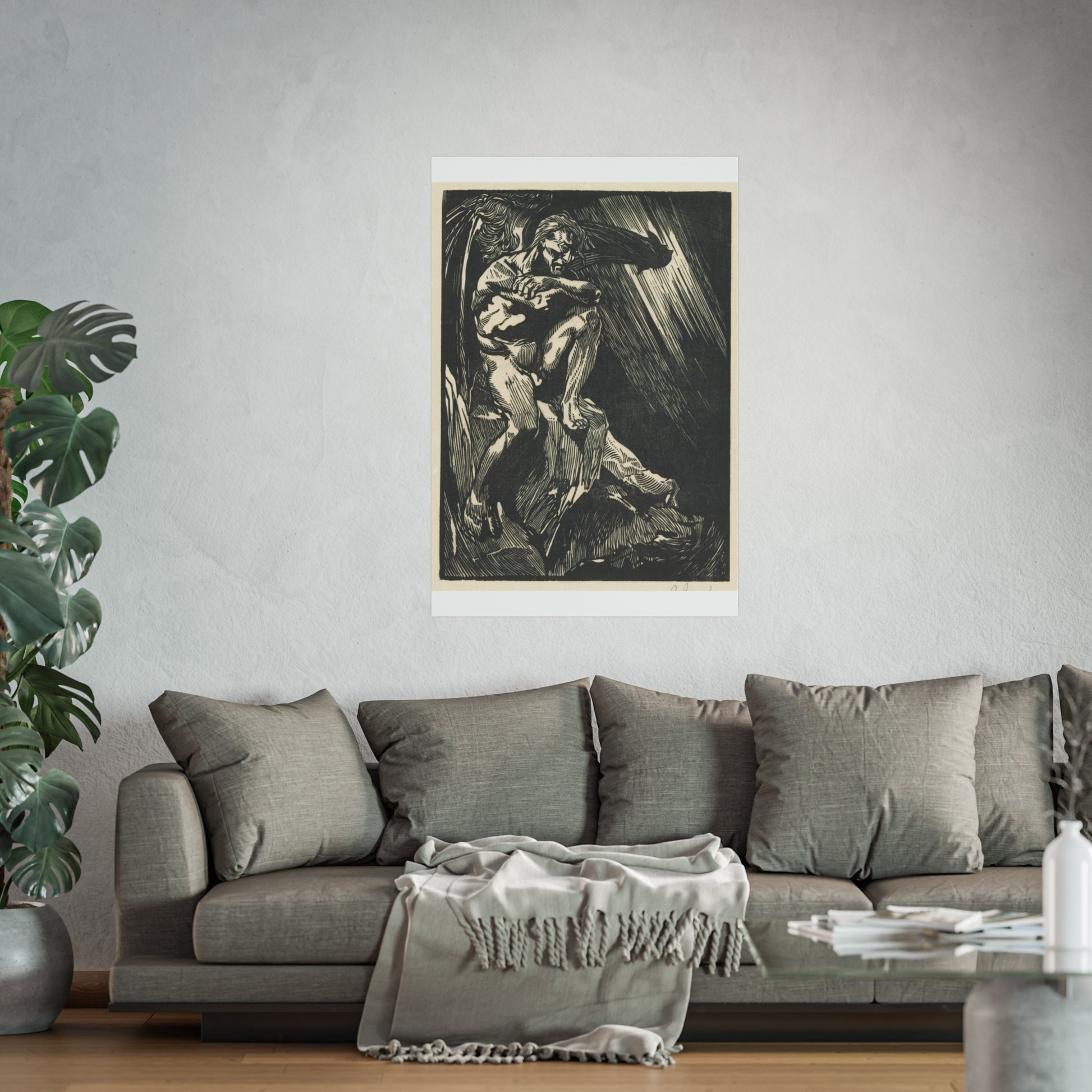A captivating portrayal of a winged, nude man poised upon a rocky terrain. His arms are gracefully rested on his elevated left knee, creating an intriguing composition.