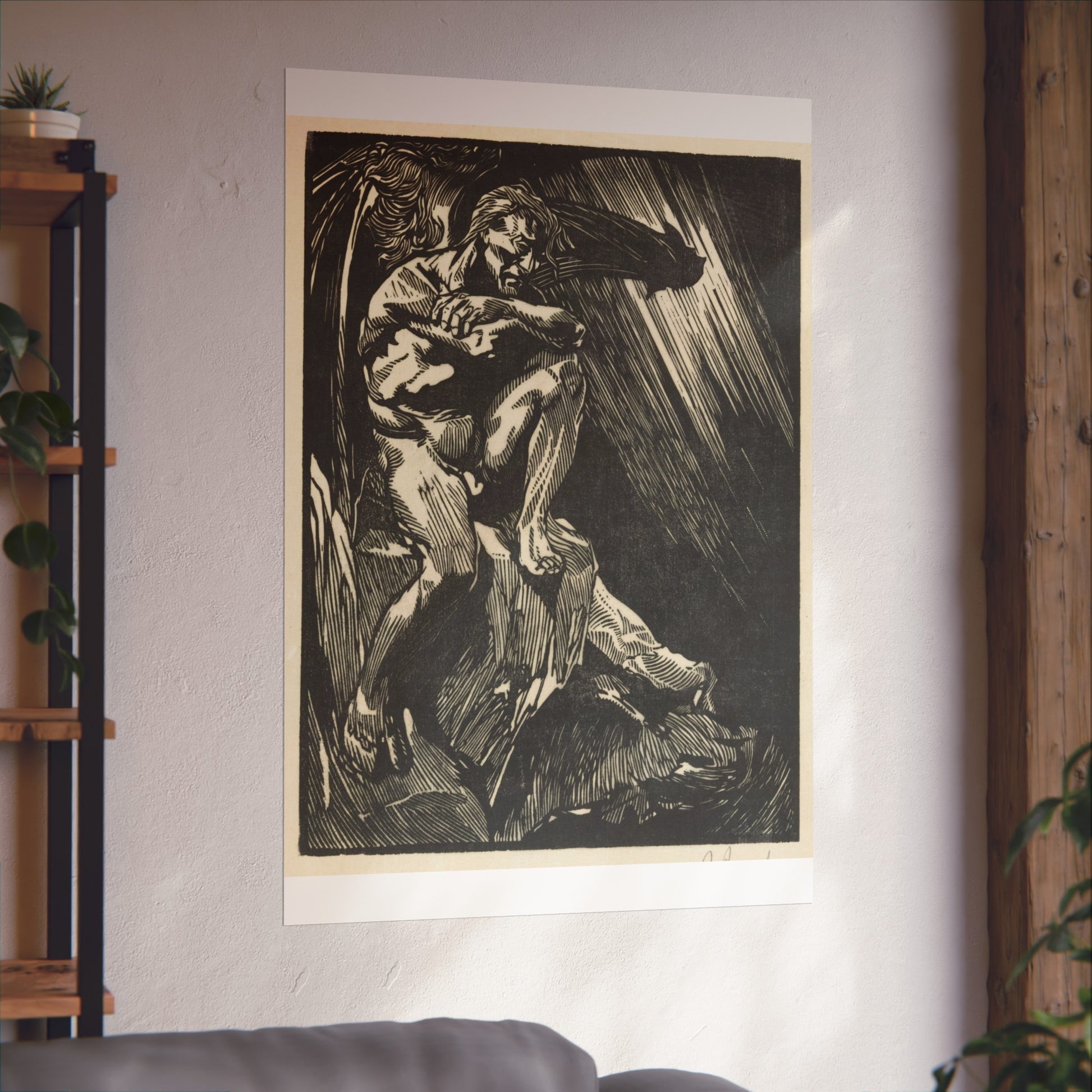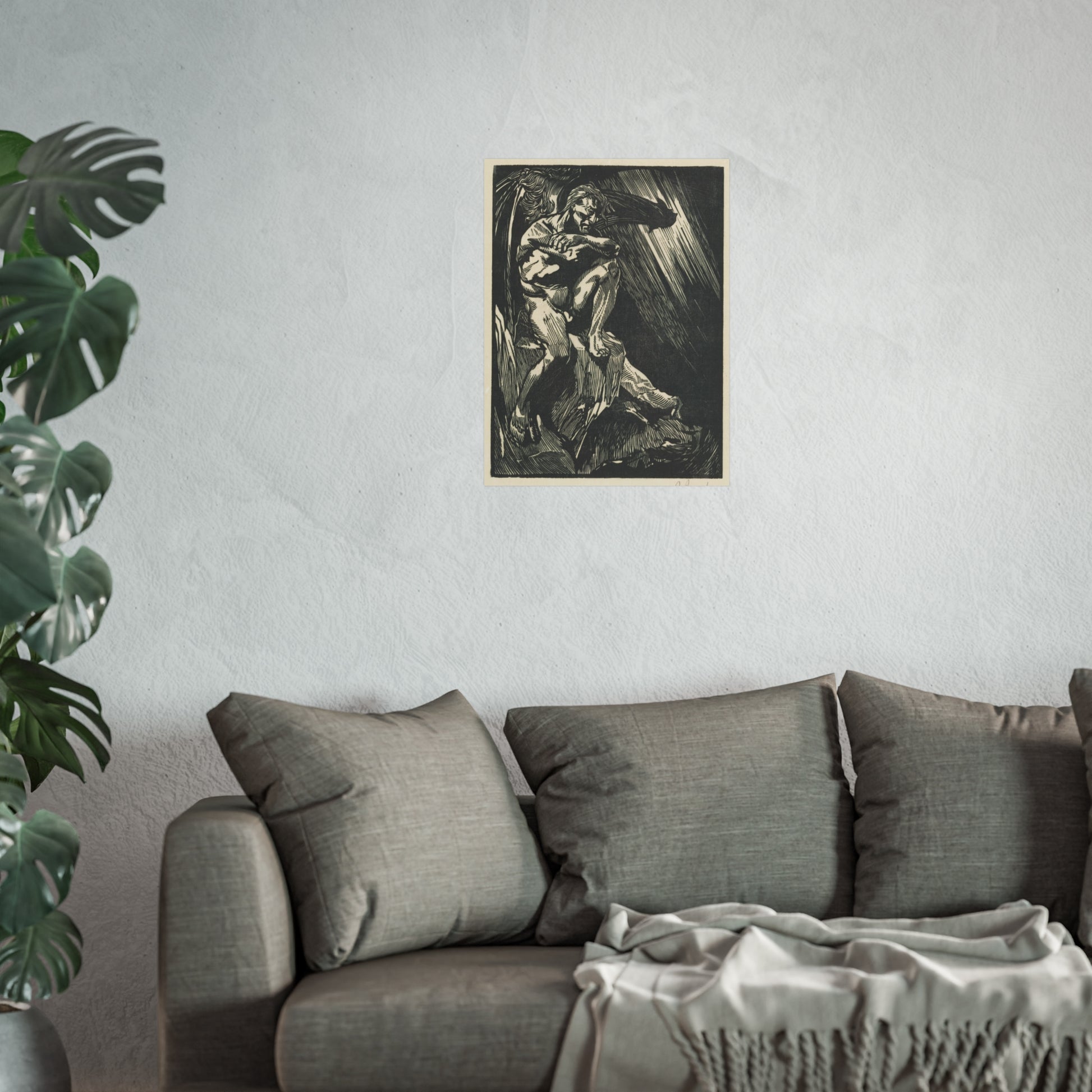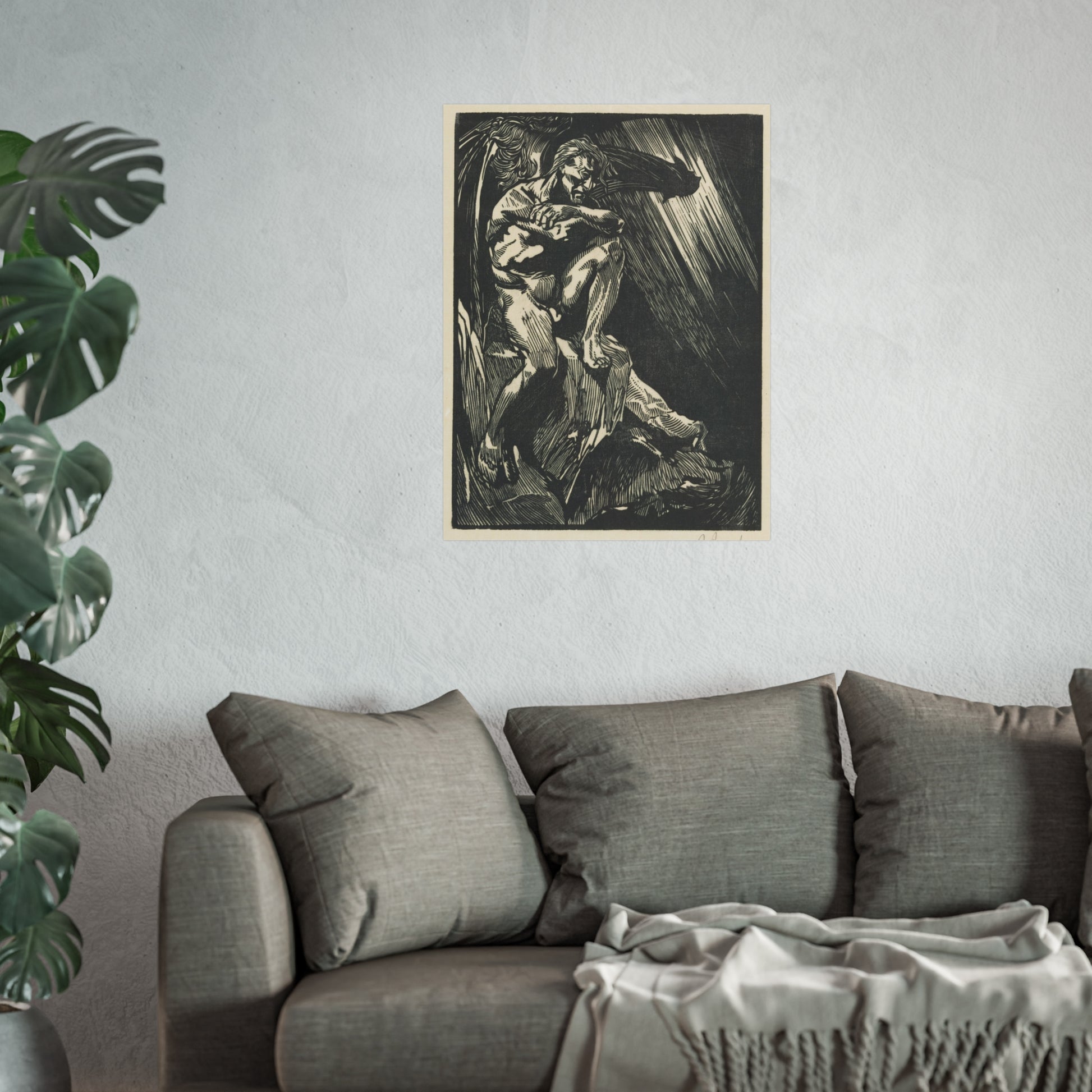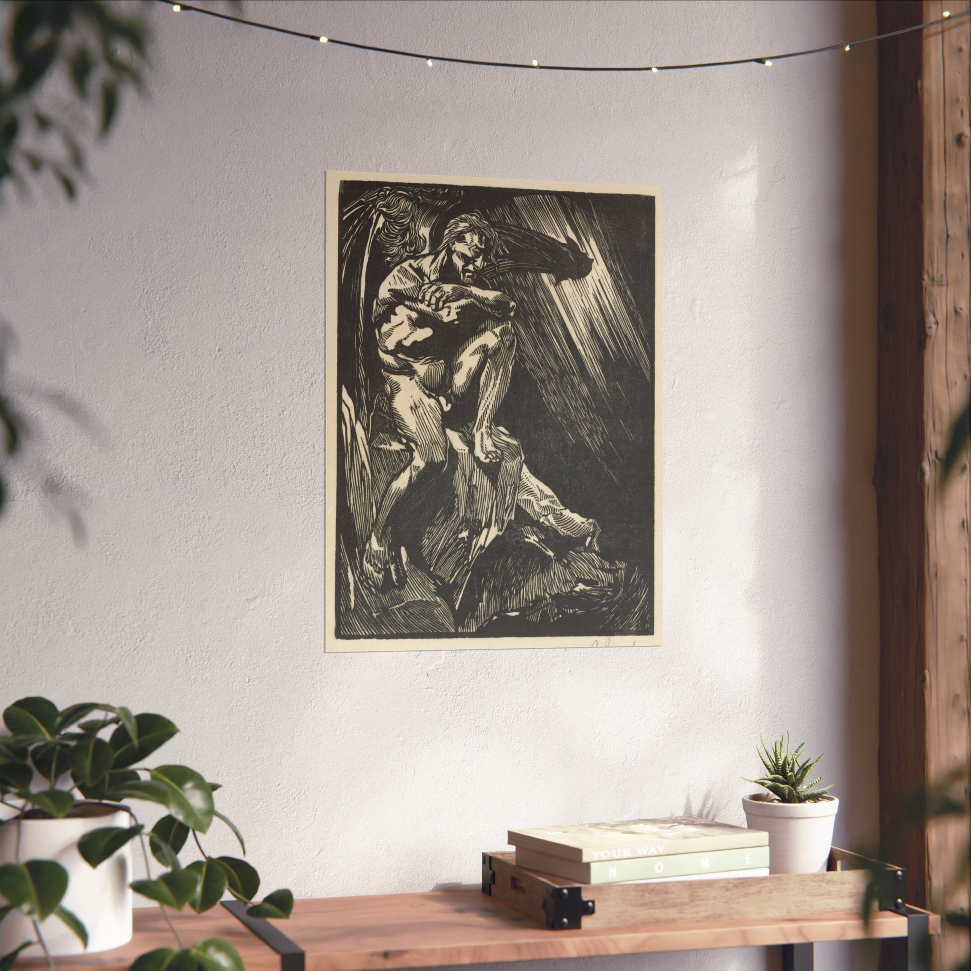 A captivating portrayal of a winged, nude man poised upon a rocky terrain. His arms are gracefully rested on his elevated left knee, creating an intriguing composition.