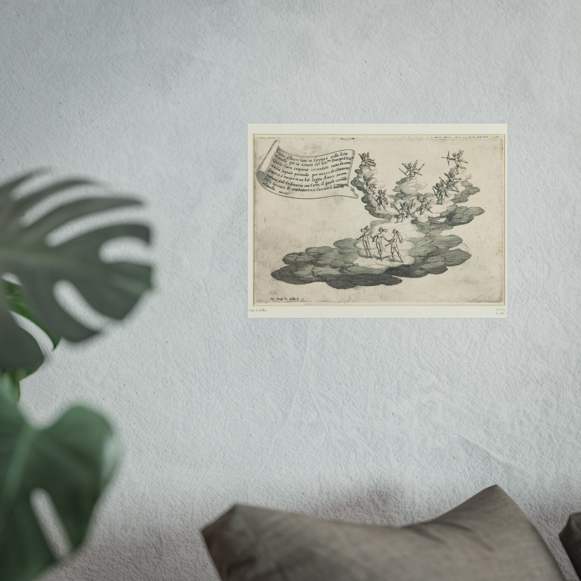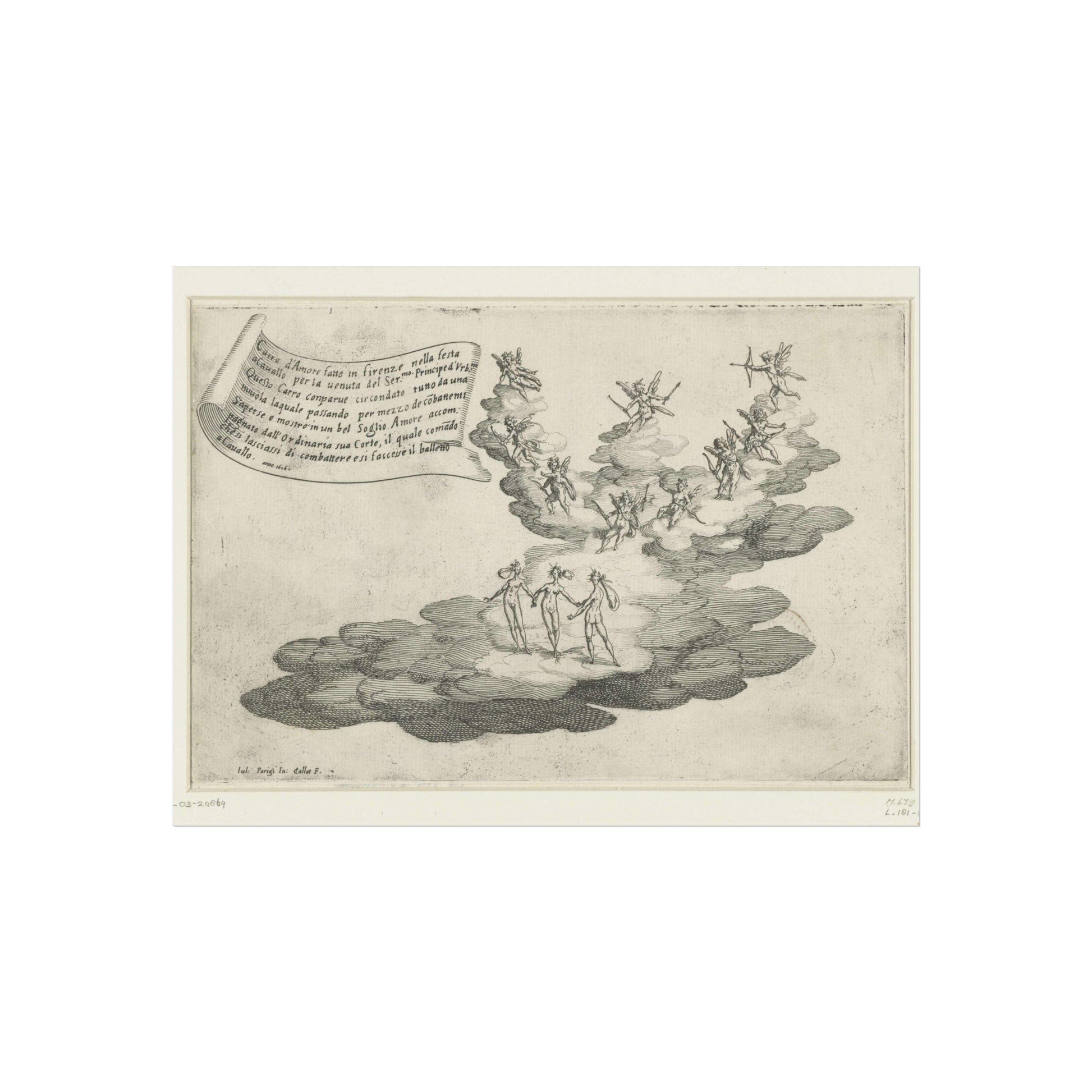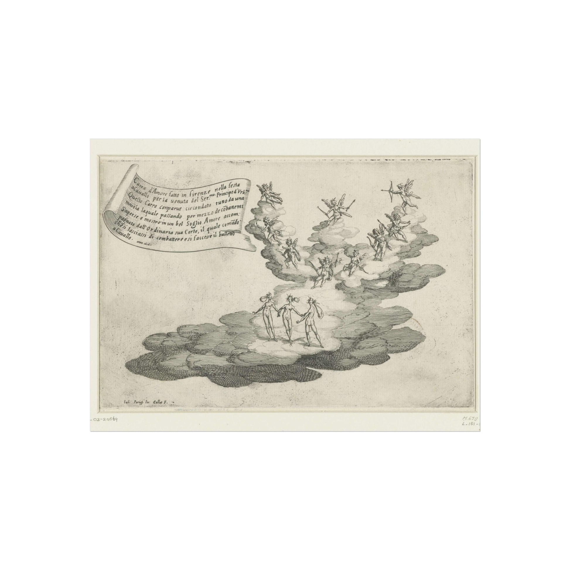 Behold a magnificent float, designed to resemble a grand cloud, at the heart of which Cupid is surrounded by a retinue of cherubs and the three Graces. This architectural marvel was crafted for the feast 'Guerra di Bellezza', hosted by Cosimo II de' Medici in 1616 in Florence. The occasion was the arrival of Federico della Rovere, the Prince of Urbino and fiancé of Cosimo's sister Claudia. Suspended above the scene is a banner inscribed with Italian text.
