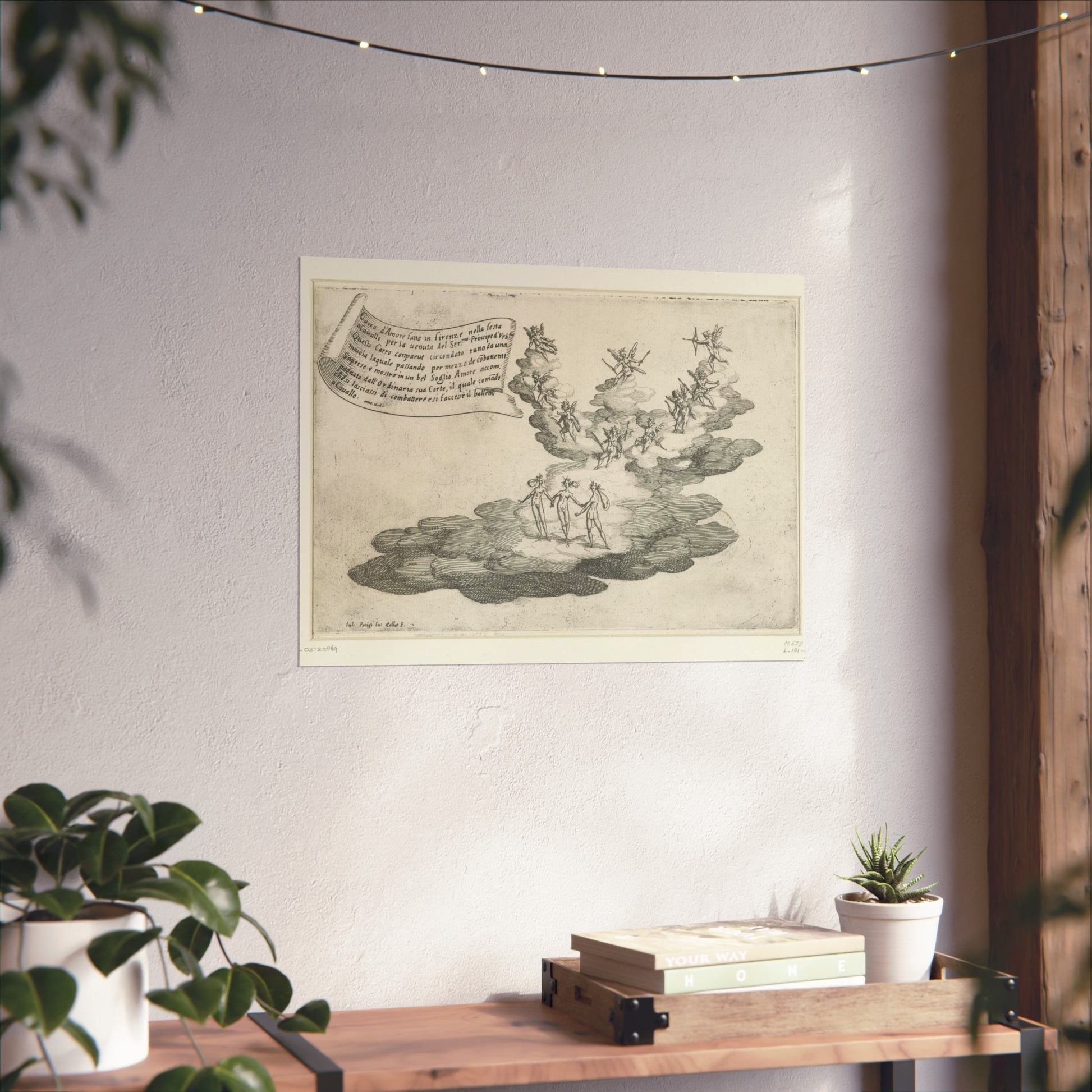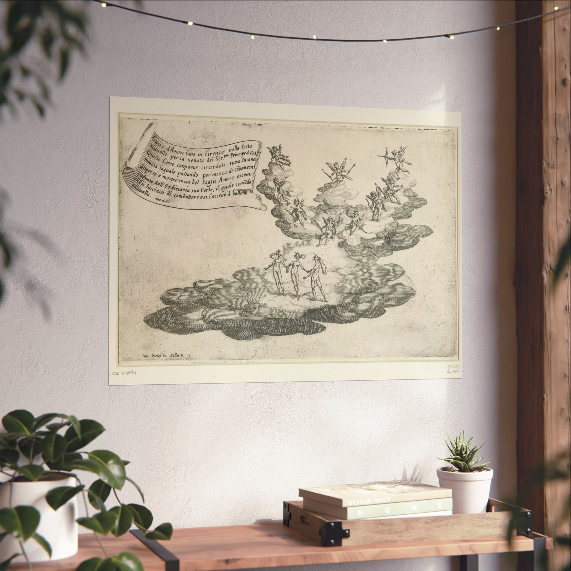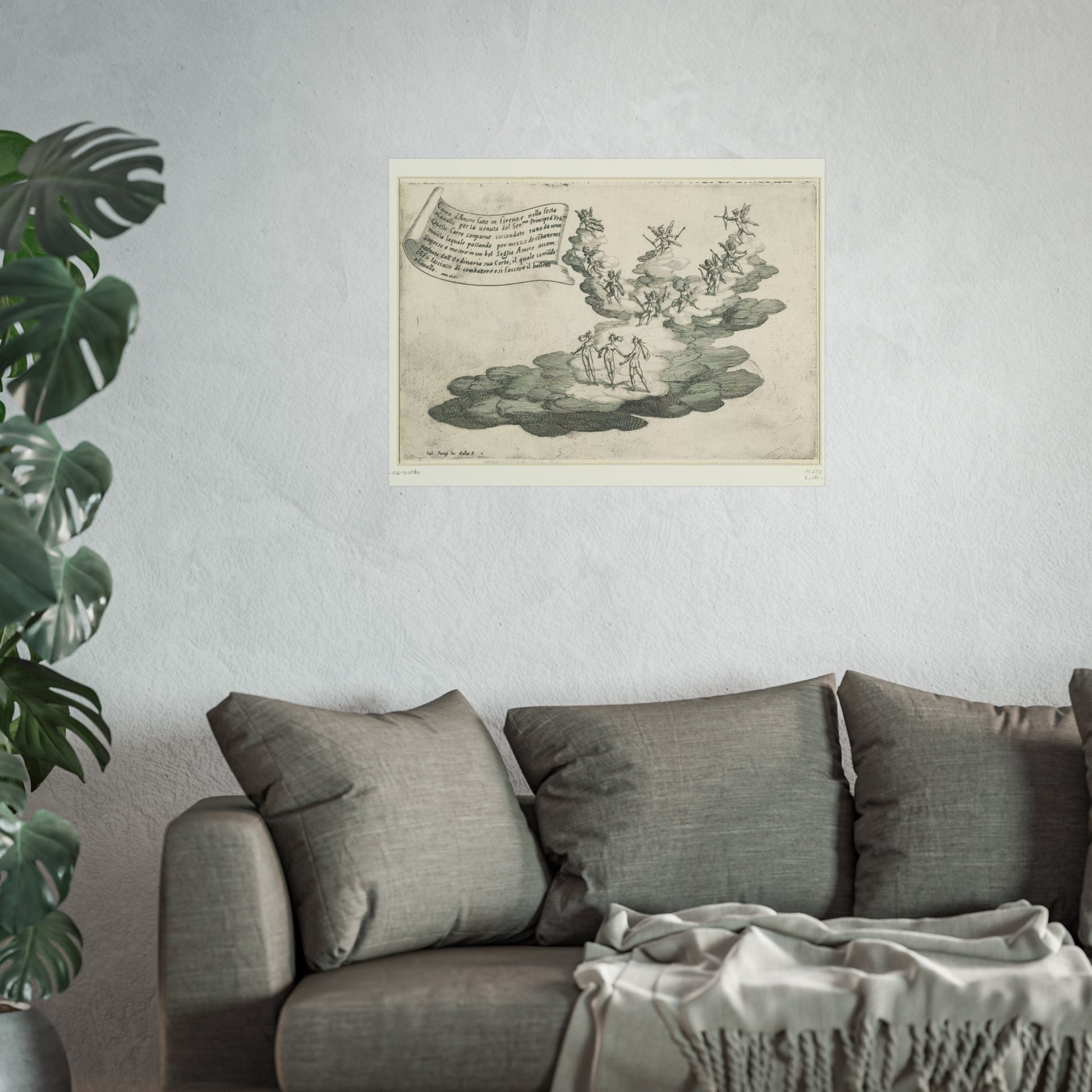 Behold a magnificent float, designed to resemble a grand cloud, at the heart of which Cupid is surrounded by a retinue of cherubs and the three Graces. This architectural marvel was crafted for the feast 'Guerra di Bellezza', hosted by Cosimo II de' Medici in 1616 in Florence. The occasion was the arrival of Federico della Rovere, the Prince of Urbino and fiancé of Cosimo's sister Claudia. Suspended above the scene is a banner inscribed with Italian text.
