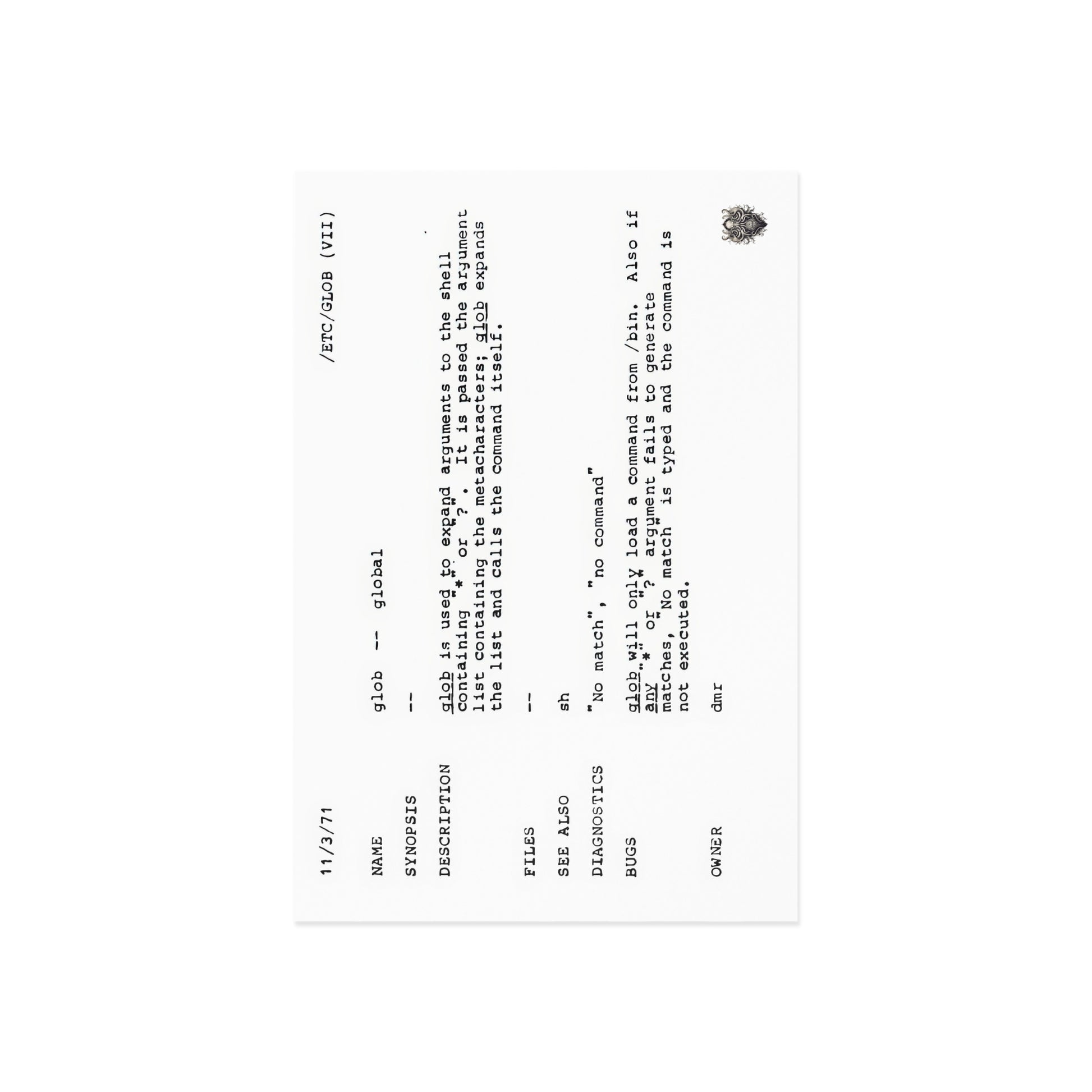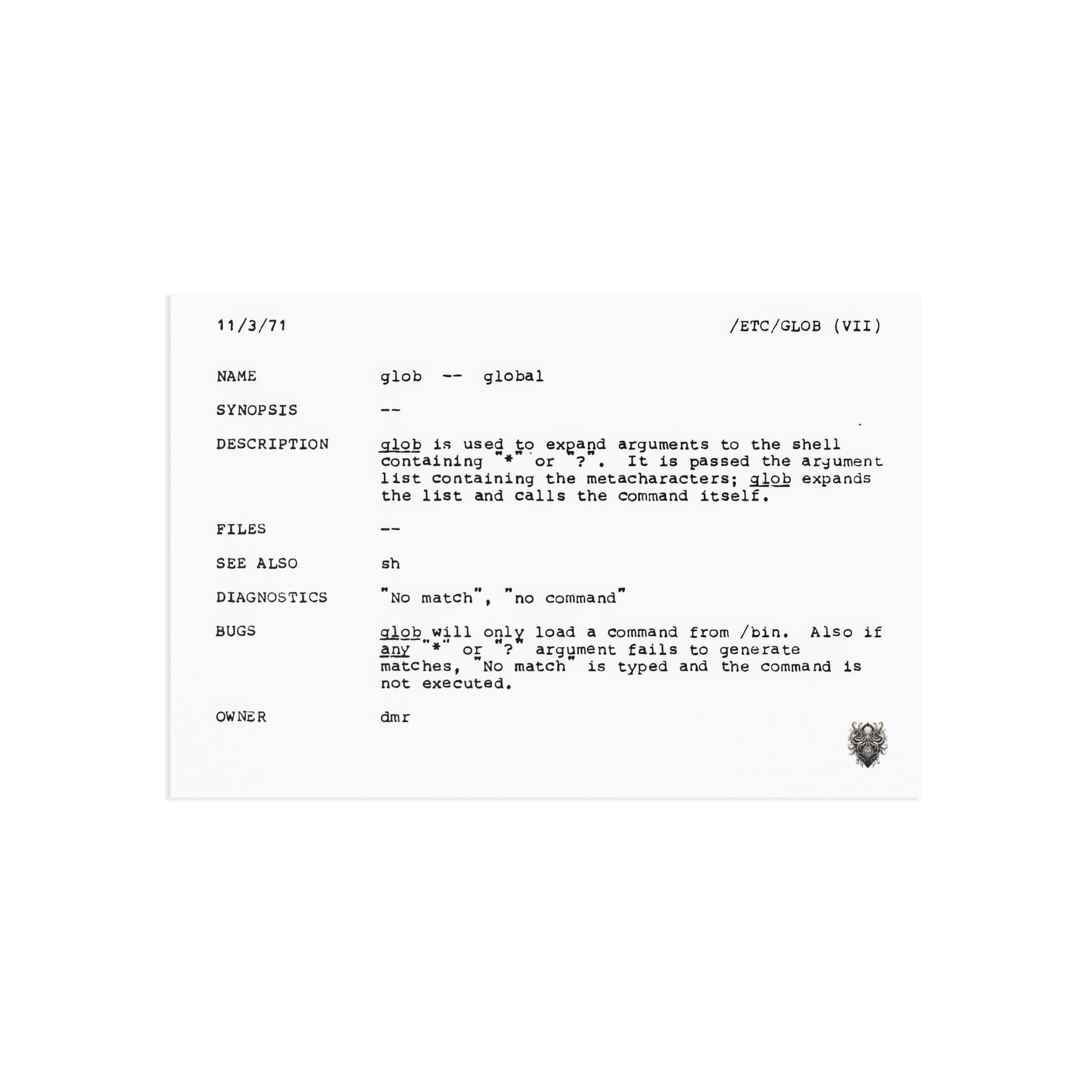 Each postcard in this set features the almighty glob command, the unsung hero of filename pattern matching. Now you can spread the joy of wildcard expansion to friends and family across the globe (pun absolutely intended).