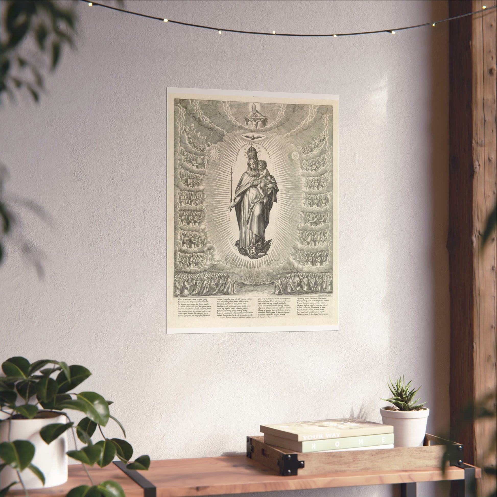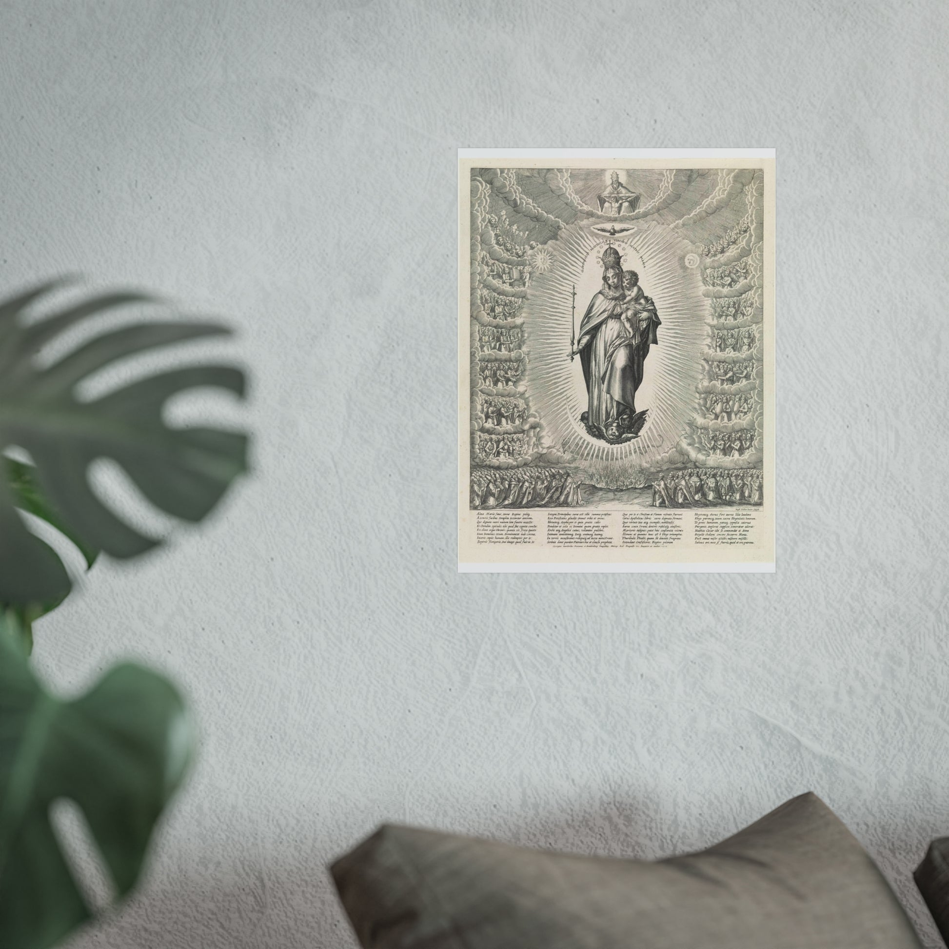 In this captivating piece, the Virgin Mary is depicted standing on a crescent moon, cradling the Christ Child in her arms. Beneath the moon, a dragon lurks. Mary is adorned with a crown of stars and holds a scepter. Above her, the Holy Spirit is represented as a dove, flanked by the sun to the left and the moon to the right. At the top center, God the Father with the crucified Christ is depicted. Surrounding Mary are angels, apostles, martyrs, and saints. At the bottom right of the print, we see spiritual power embodied by the Pope, cardinals, and bishops. To the left, worldly power is represented by an emperor, kings, and sovereigns. At the very bottom center, hellfire rages. The print is accompanied by a Latin caption.