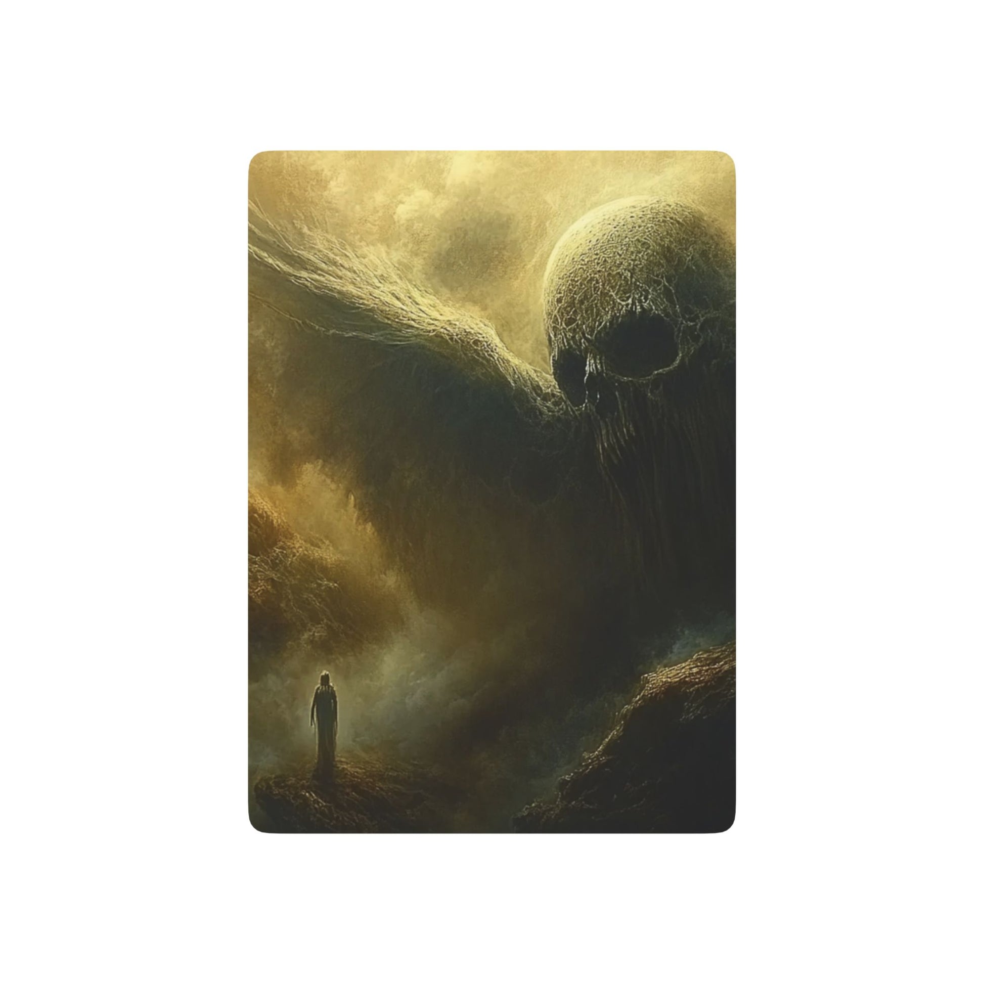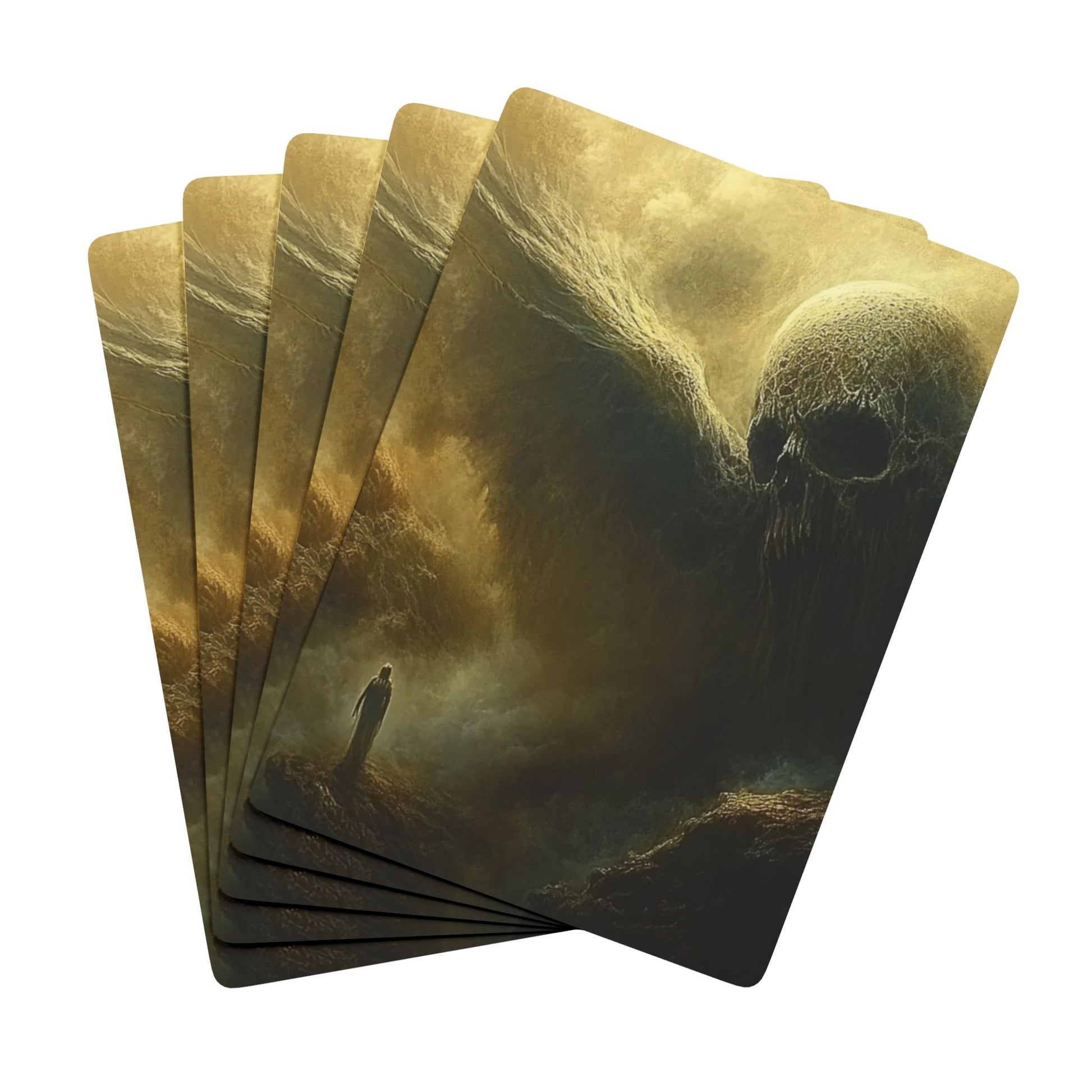 Embark on a journey into darkness with our "Road to Perdition" playing card collection. Each card features a haunting back design where a solitary wanderer treads beneath the watchful gaze of a skull manifestation emerging from storm-wreathed skies.