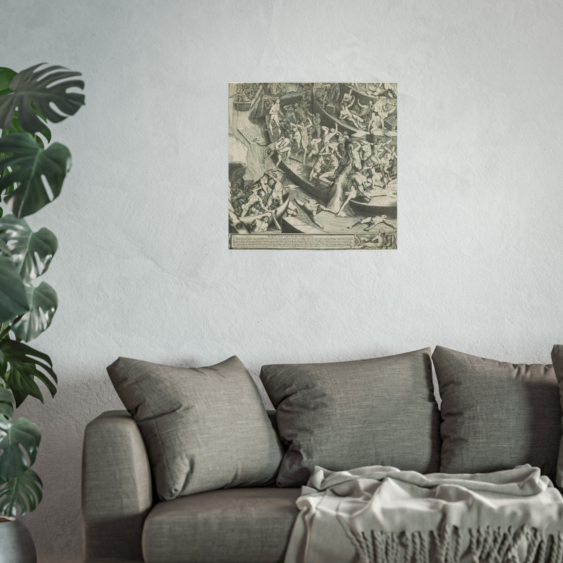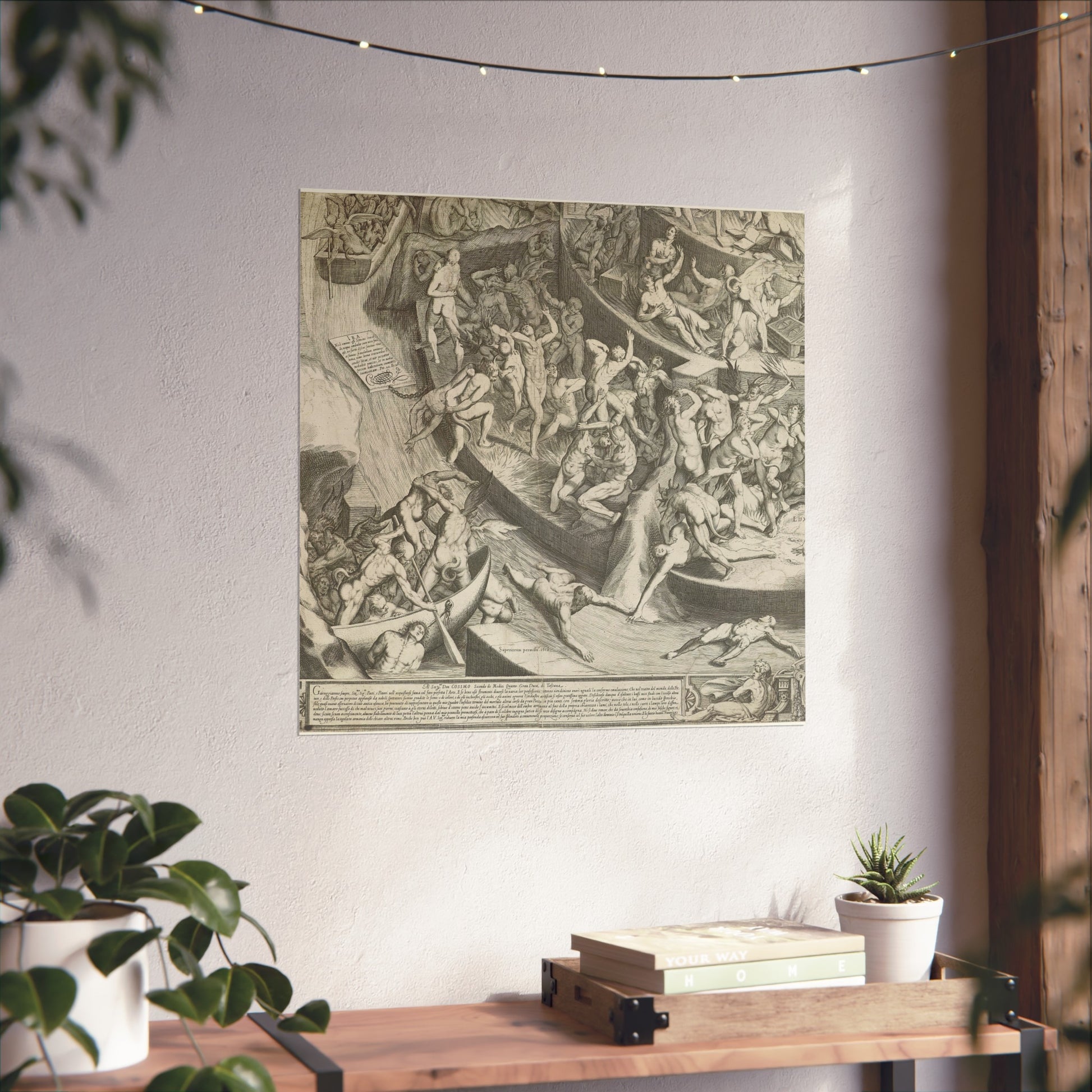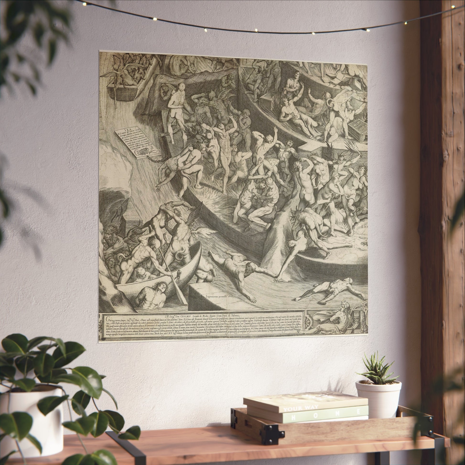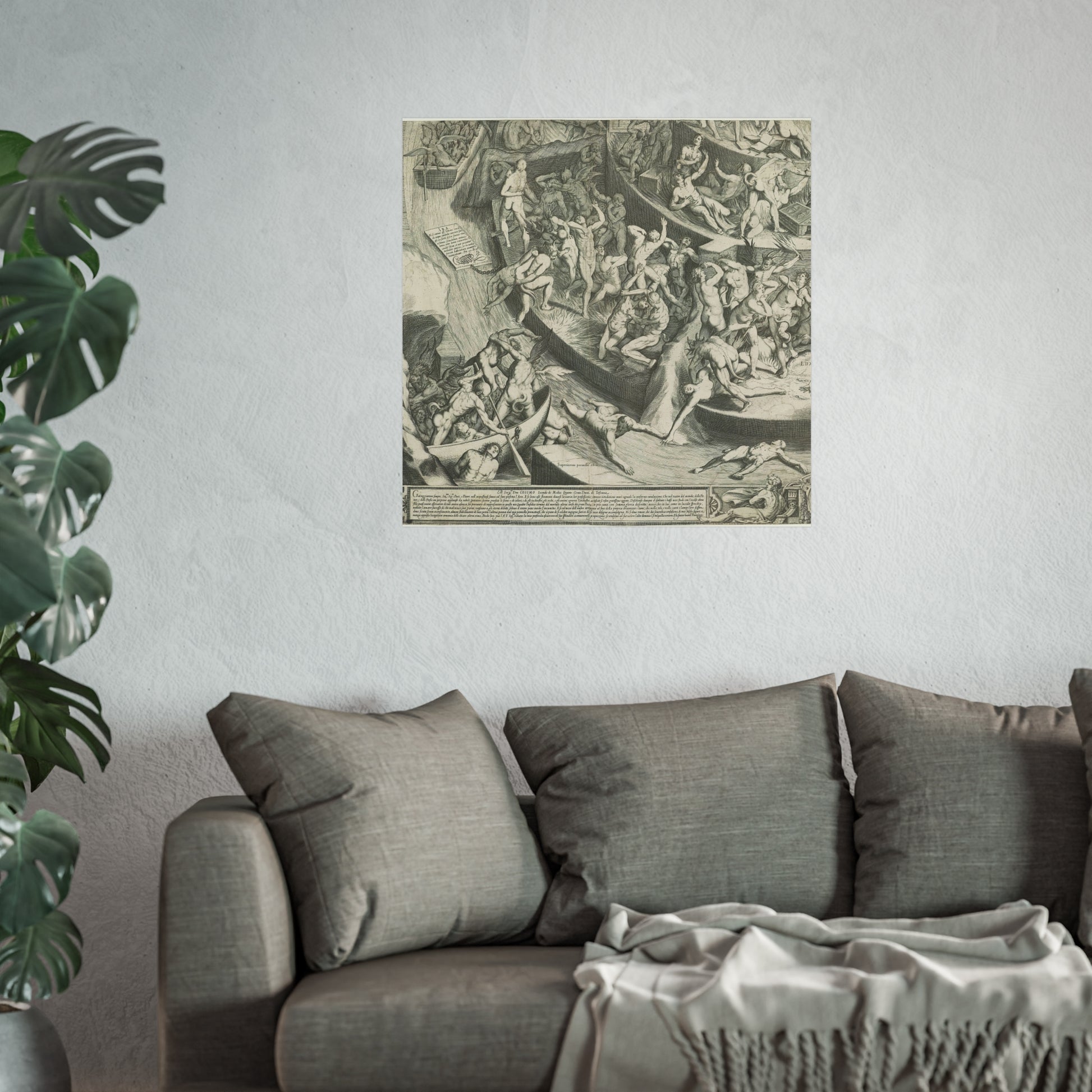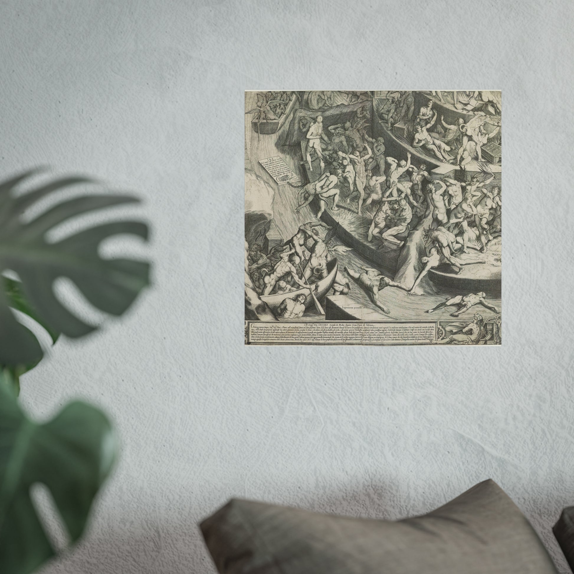 This is the fourth segment (bottom left) of a depiction of Hell as a fortified, step-like pyramid. At the very top, Satan devours the souls of sinners, while many damned souls are tormented by demonic creatures and fires on the layers beneath him. In the bottom left corner outside the pyramid, devils ferry new souls by boat. Throughout the artwork, explanatory Latin texts detail various sins. Below the scene, part of the Medici coat of arms and an enclosed Italian text can be found.