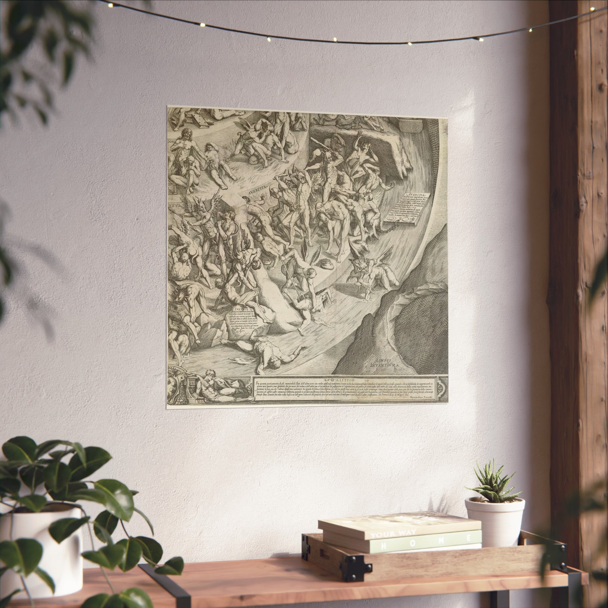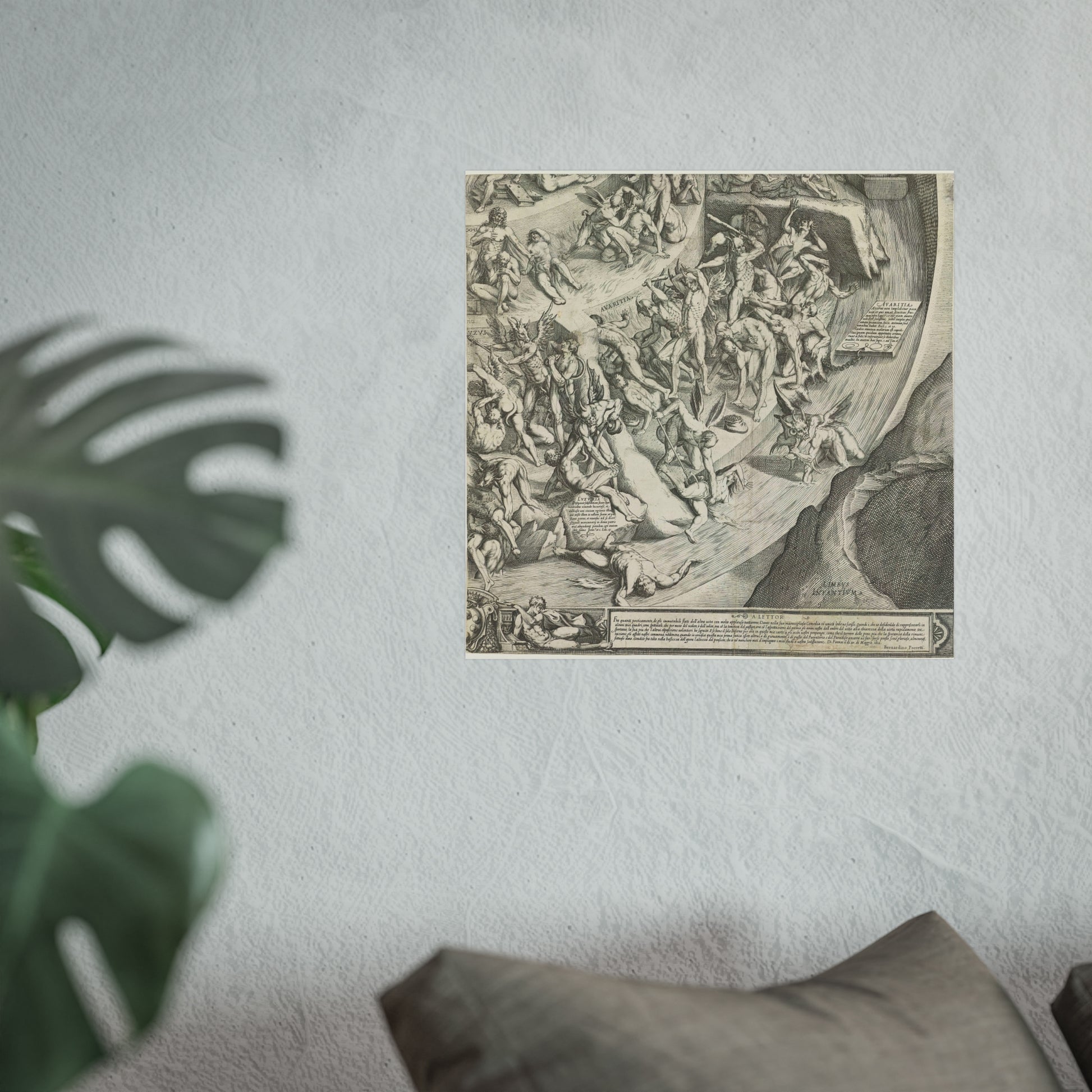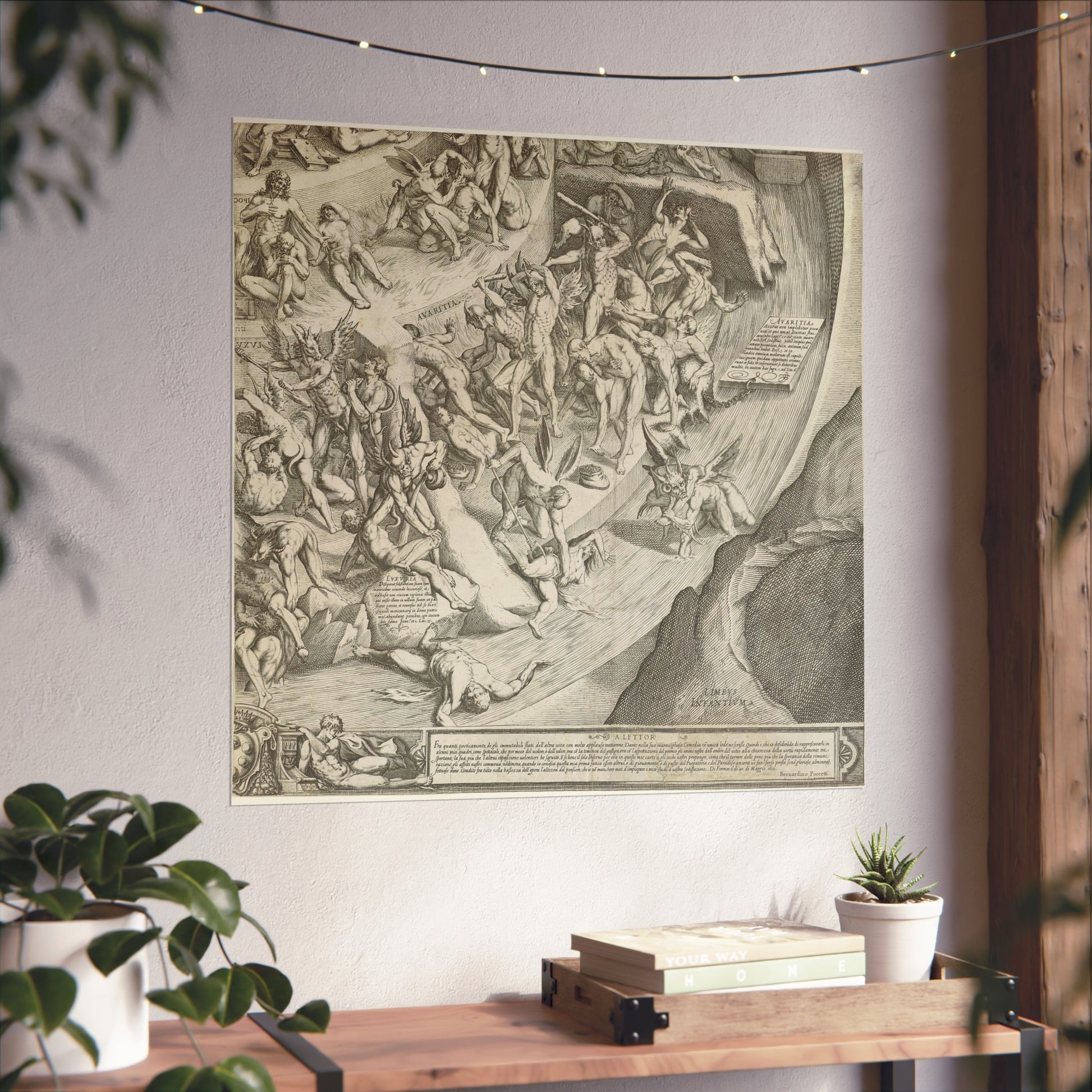 This is the fourth section (lower right) of a depiction of Hell as an enclosed, gradually constructed pyramid. At the very top, Satan devours the souls of sinners, while on the layers beneath him, countless damned souls are tormented by demonic creatures and fire pits. In the lower right corner outside the pyramid, there's a rock. Scattered throughout the scene are explanatory Latin texts, including descriptions of various sins. Below the scene lies (a part of) the Medici coat of arms and a framed text in Italian.