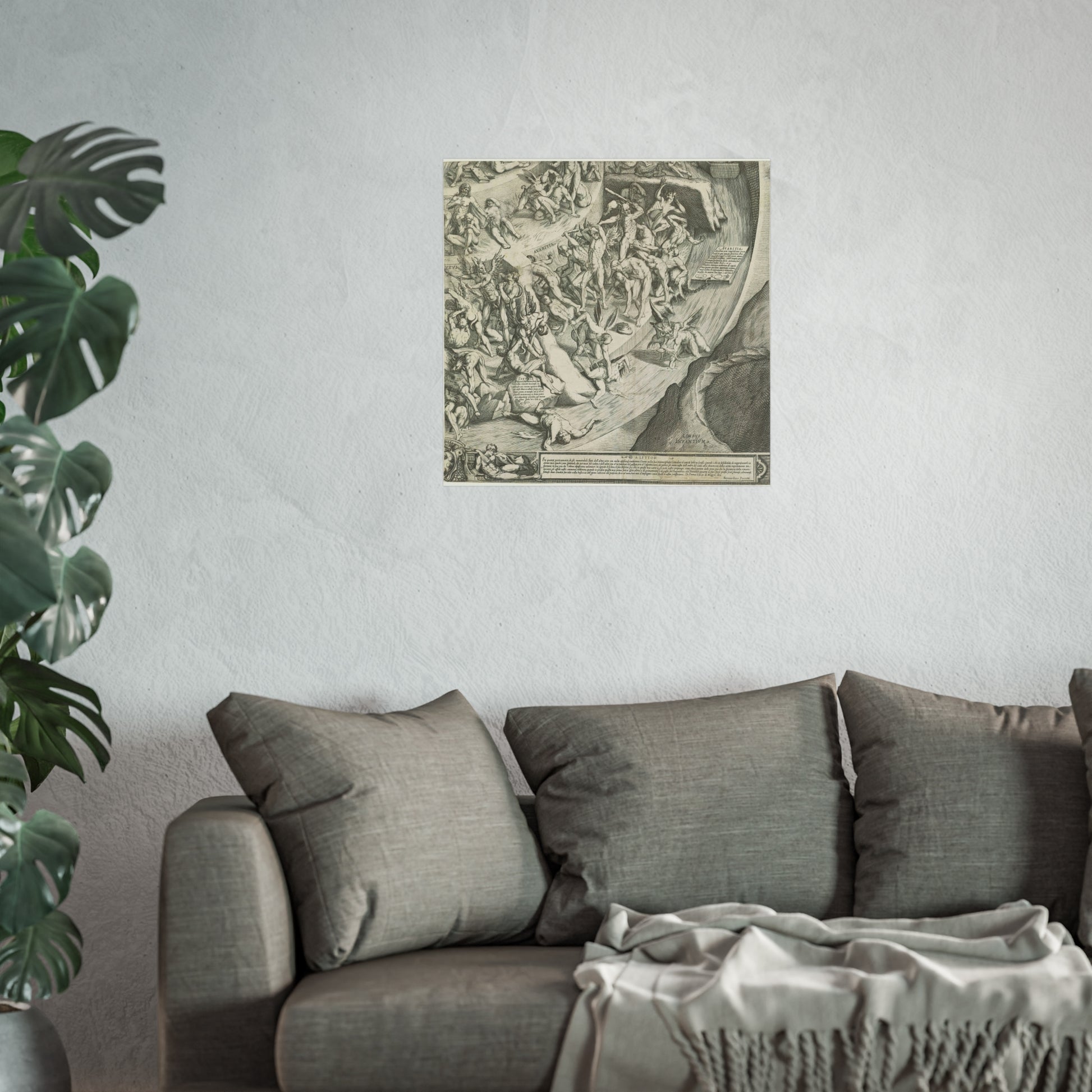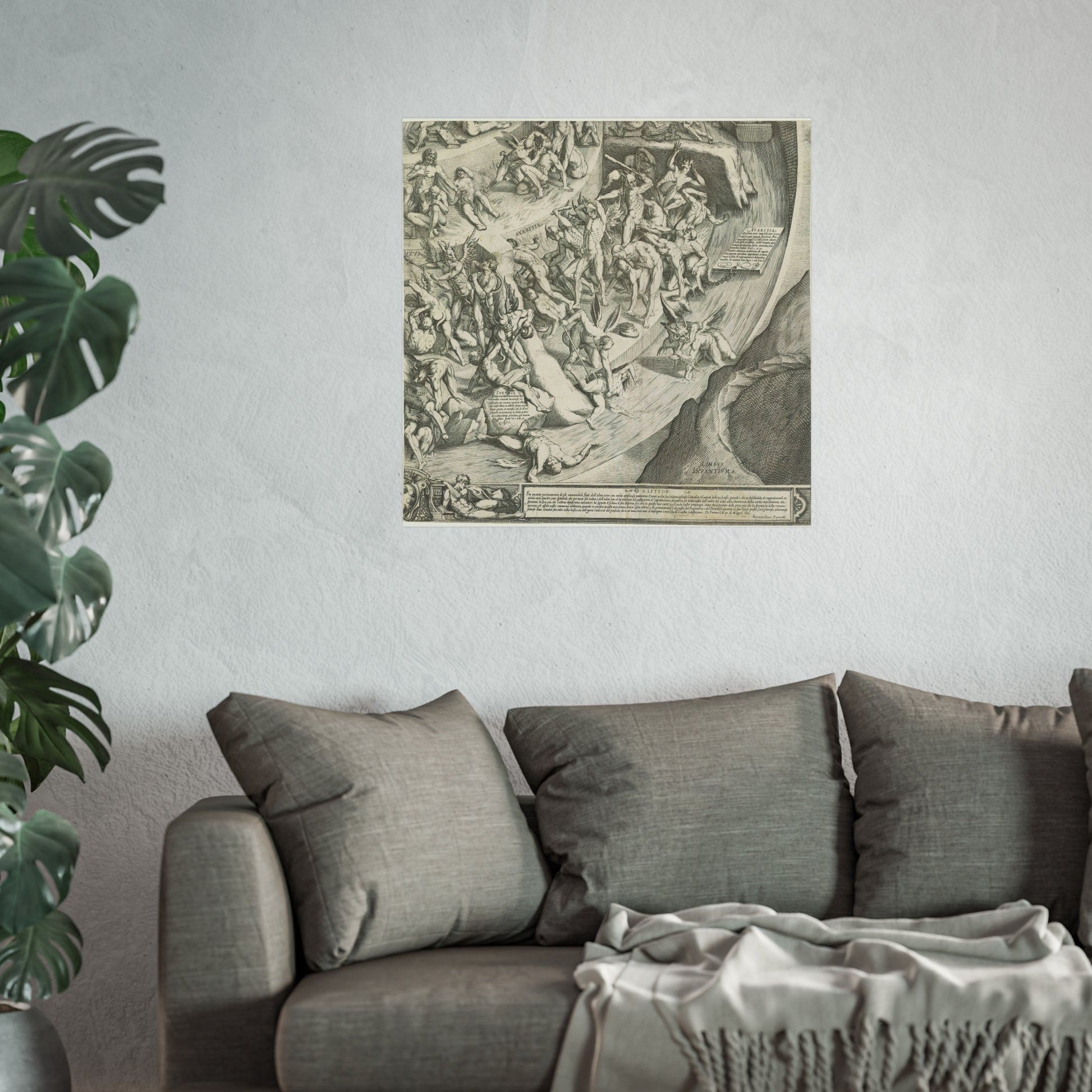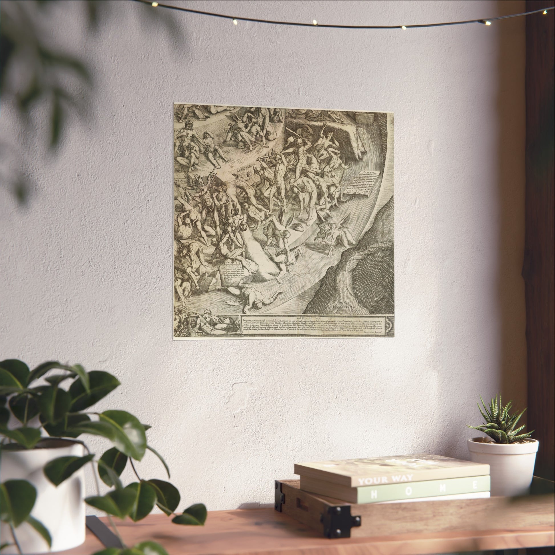 This is the fourth section (lower right) of a depiction of Hell as an enclosed, gradually constructed pyramid. At the very top, Satan devours the souls of sinners, while on the layers beneath him, countless damned souls are tormented by demonic creatures and fire pits. In the lower right corner outside the pyramid, there's a rock. Scattered throughout the scene are explanatory Latin texts, including descriptions of various sins. Below the scene lies (a part of) the Medici coat of arms and a framed text in Italian.