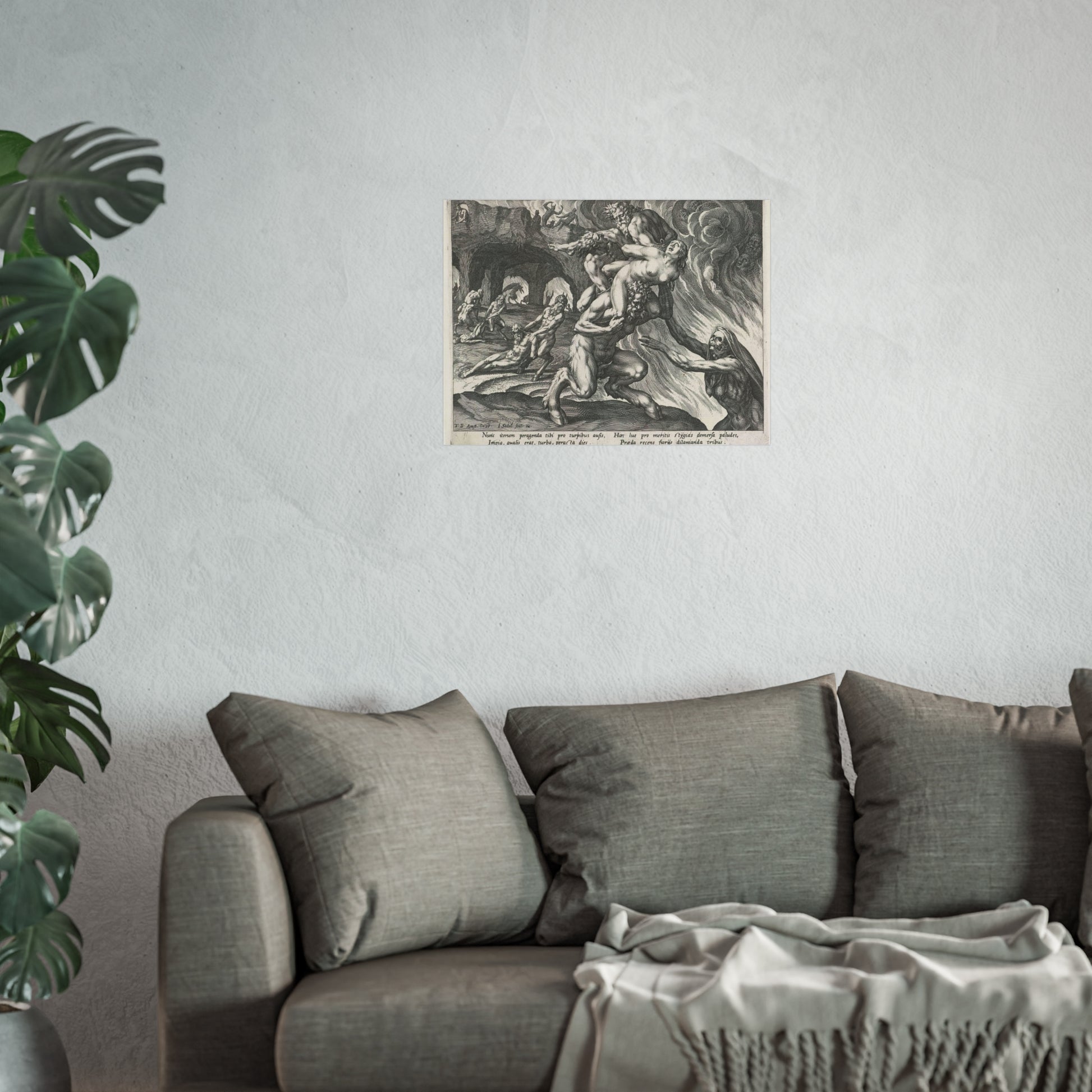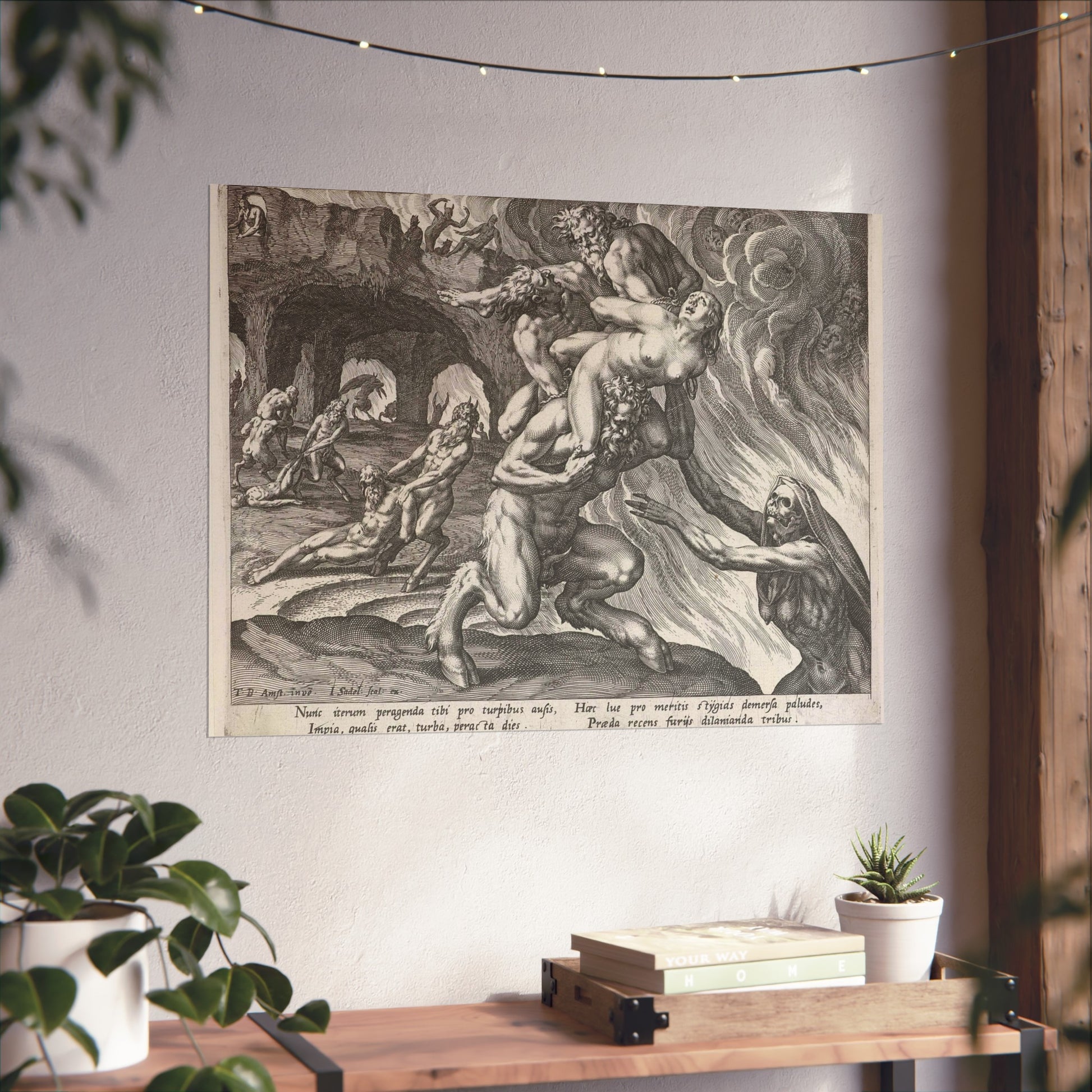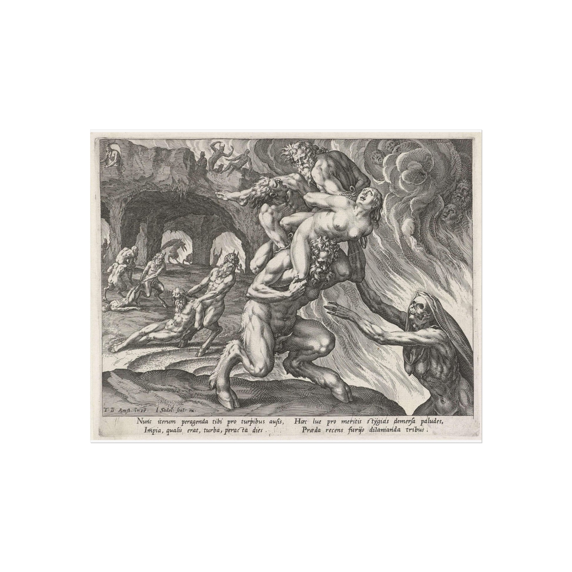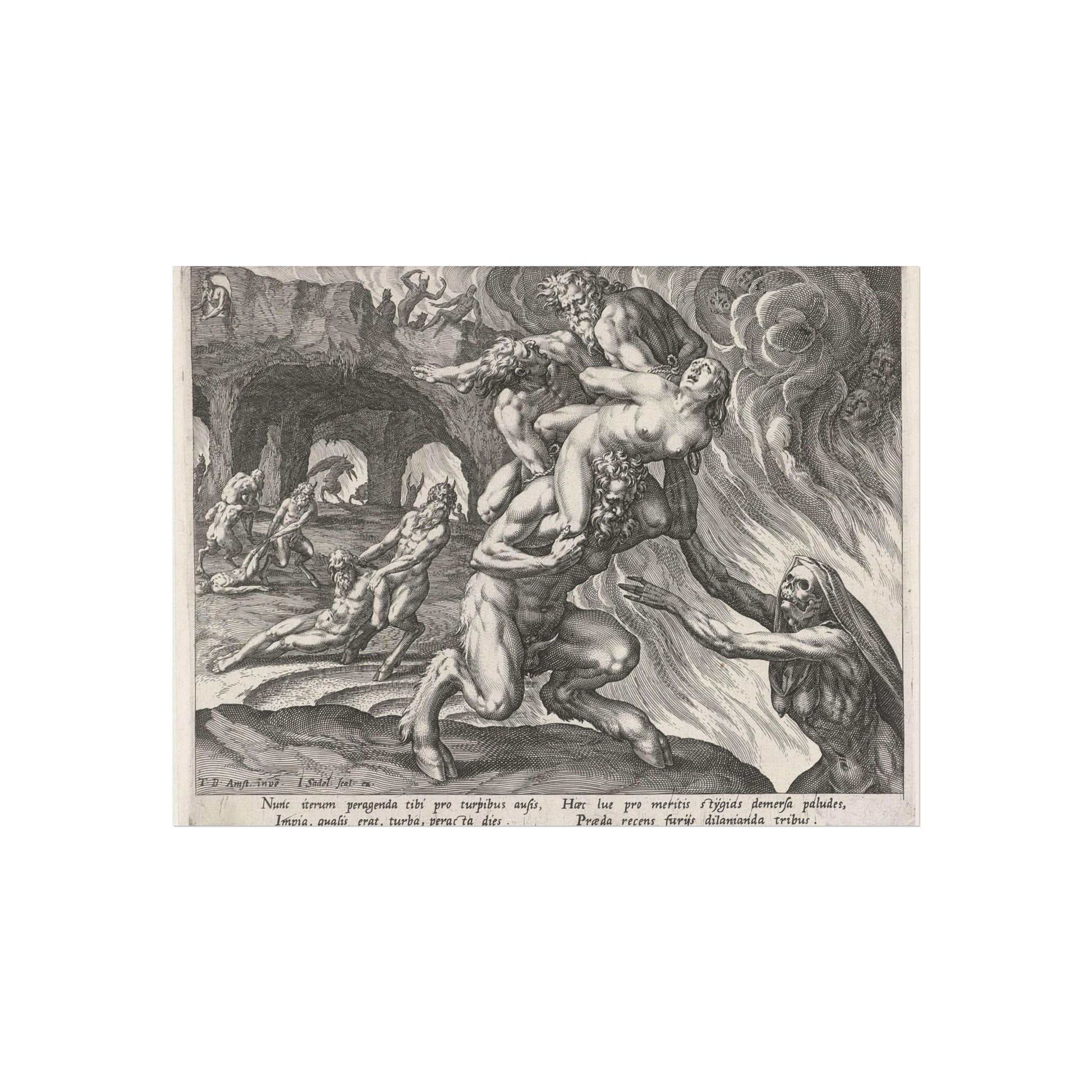 In this gripping scene, devils with cloven hooves drag or carry naked men and women towards the blazing fires of hell. This print comes with a Latin caption and is part of a compelling four-part series depicting the four last things.
