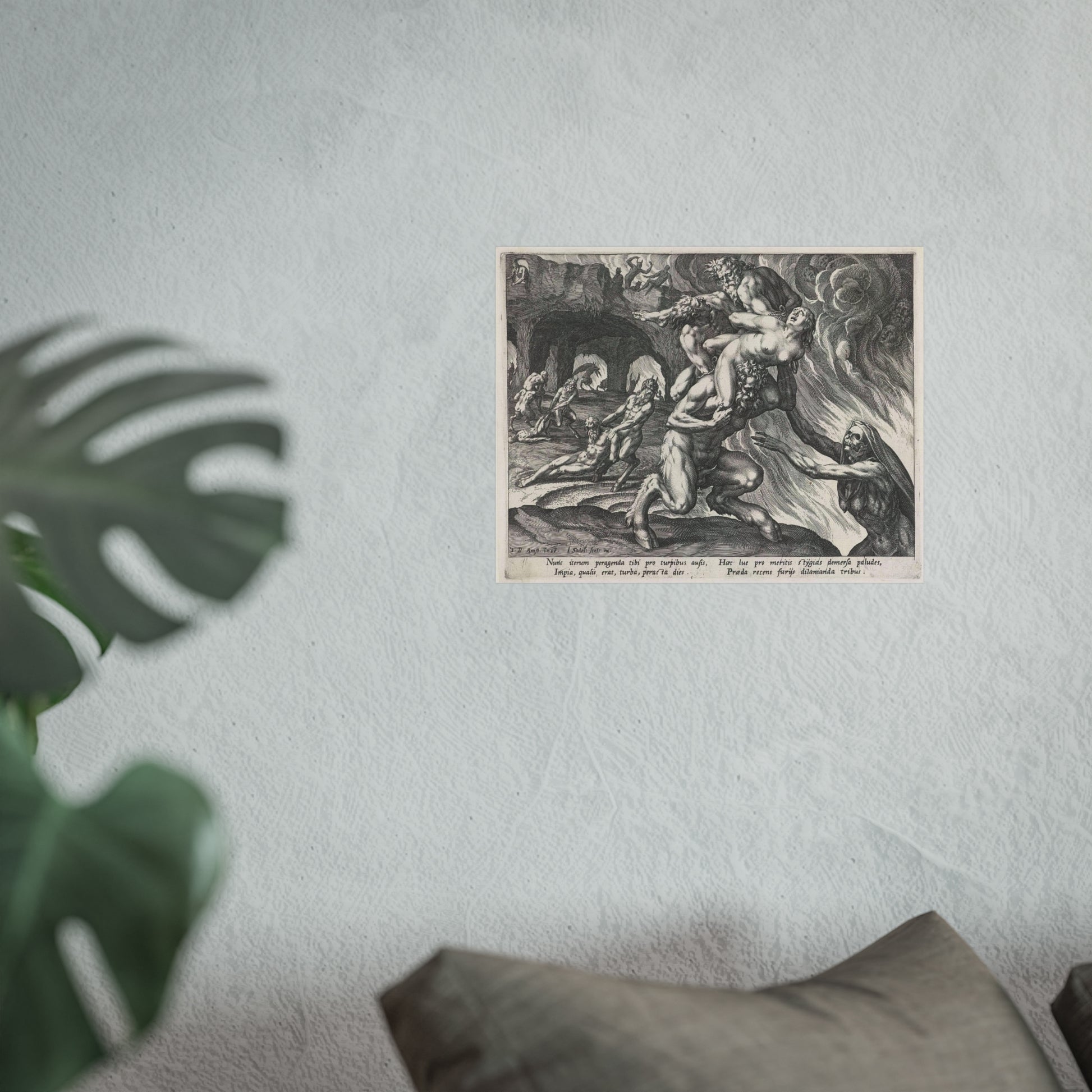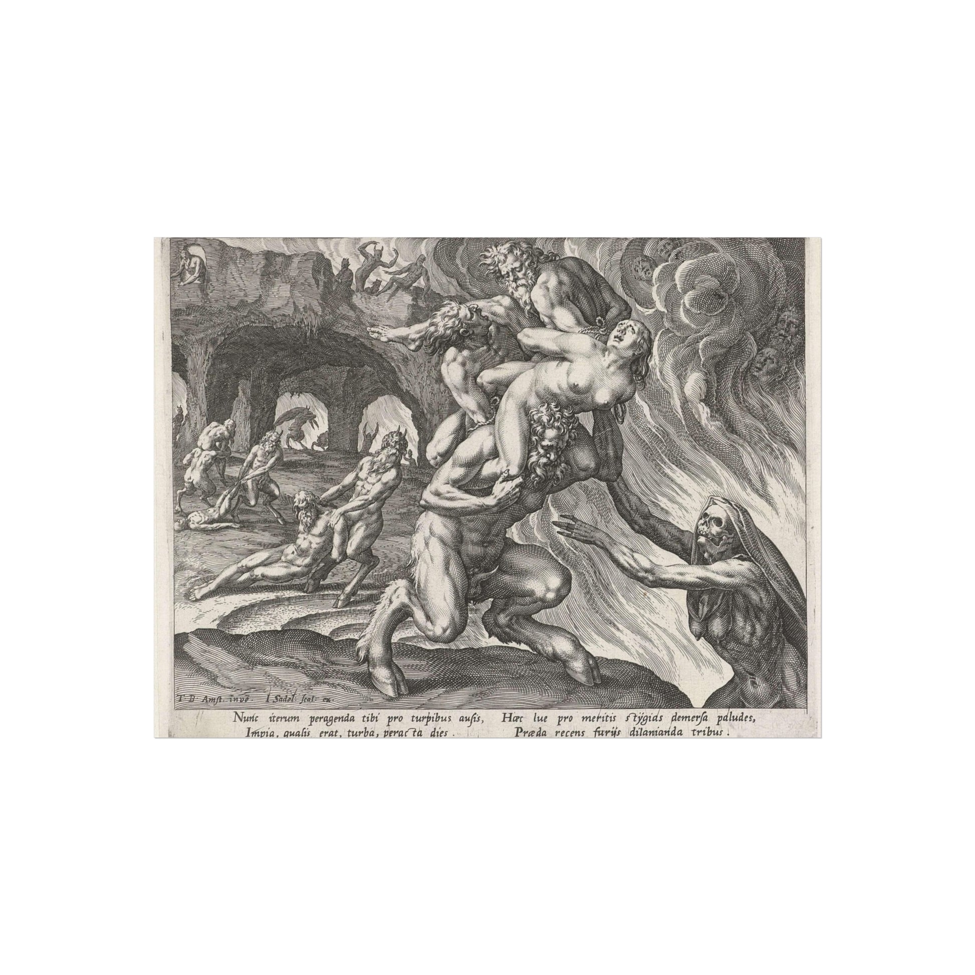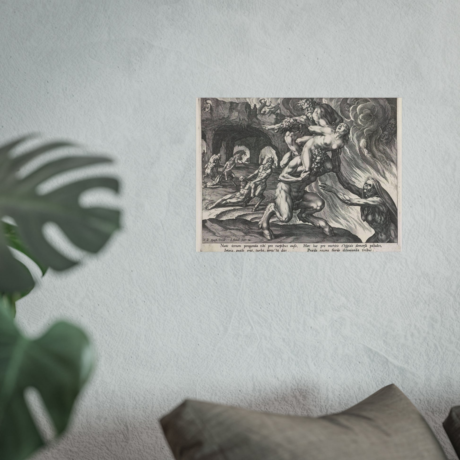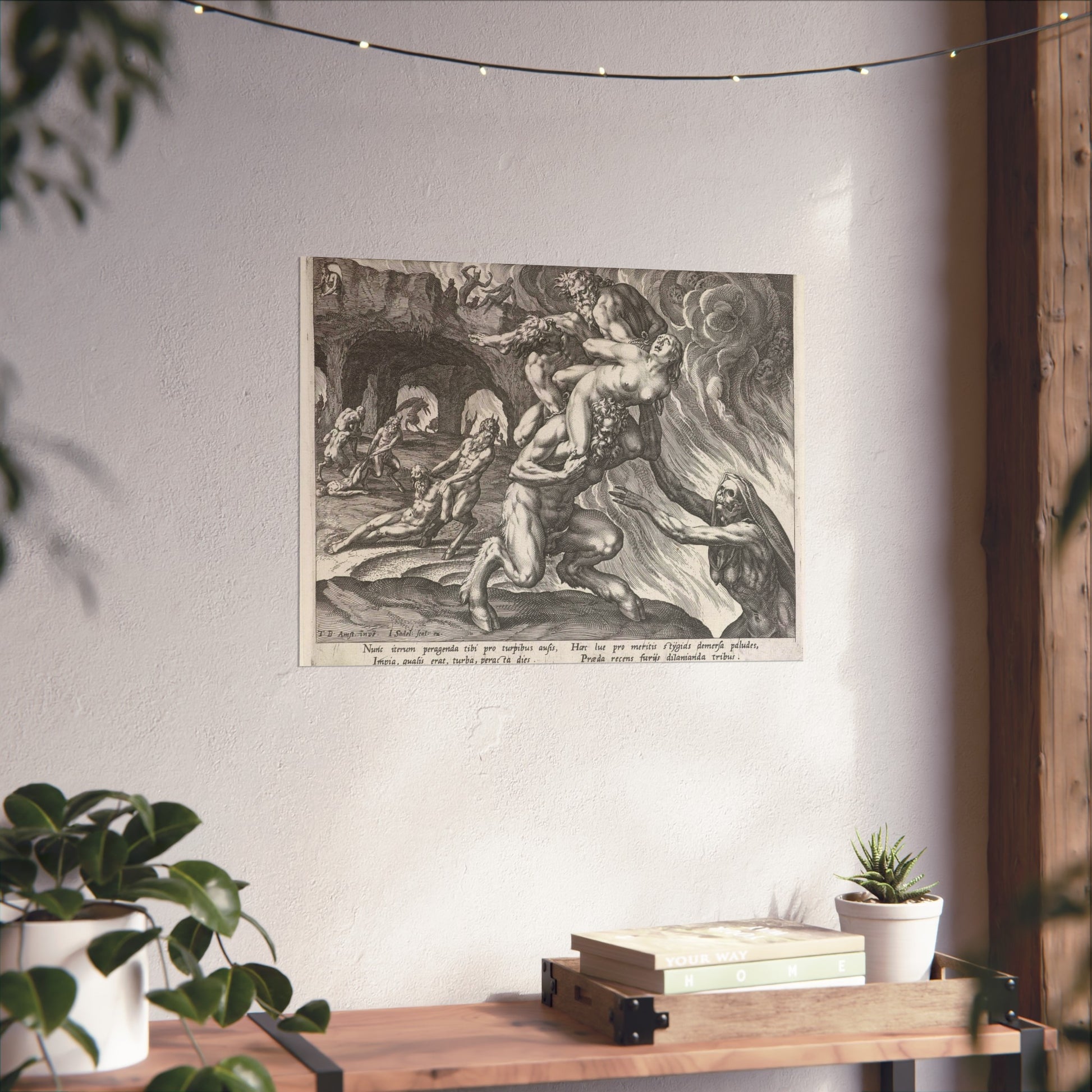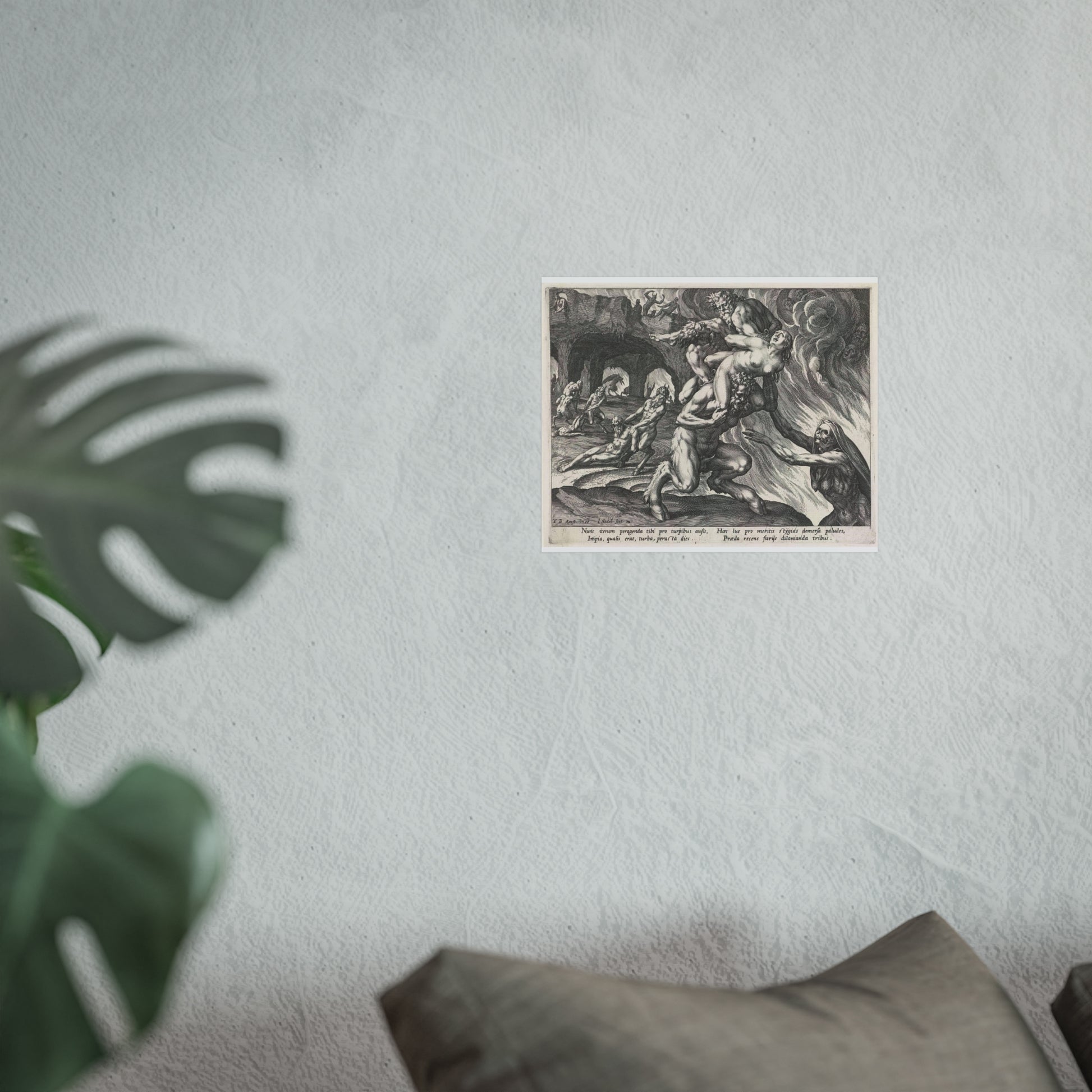 In this gripping scene, devils with cloven hooves drag or carry naked men and women towards the blazing fires of hell. This print comes with a Latin caption and is part of a compelling four-part series depicting the four last things.