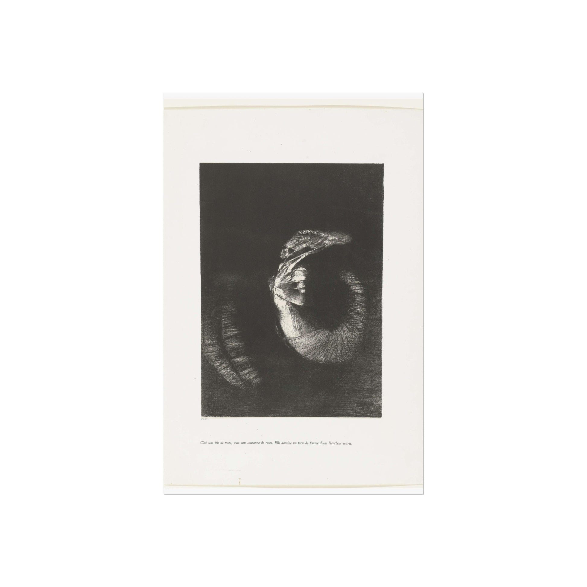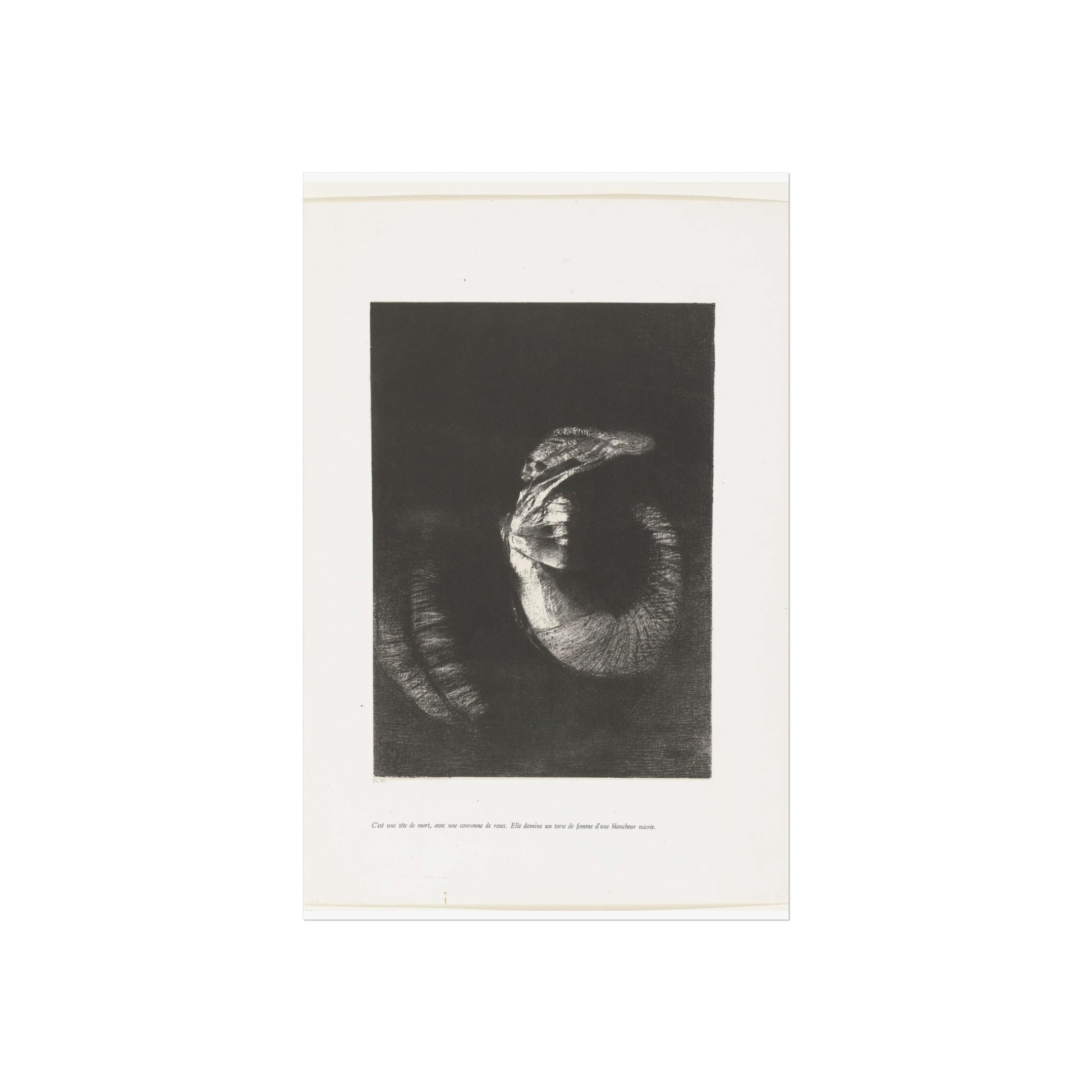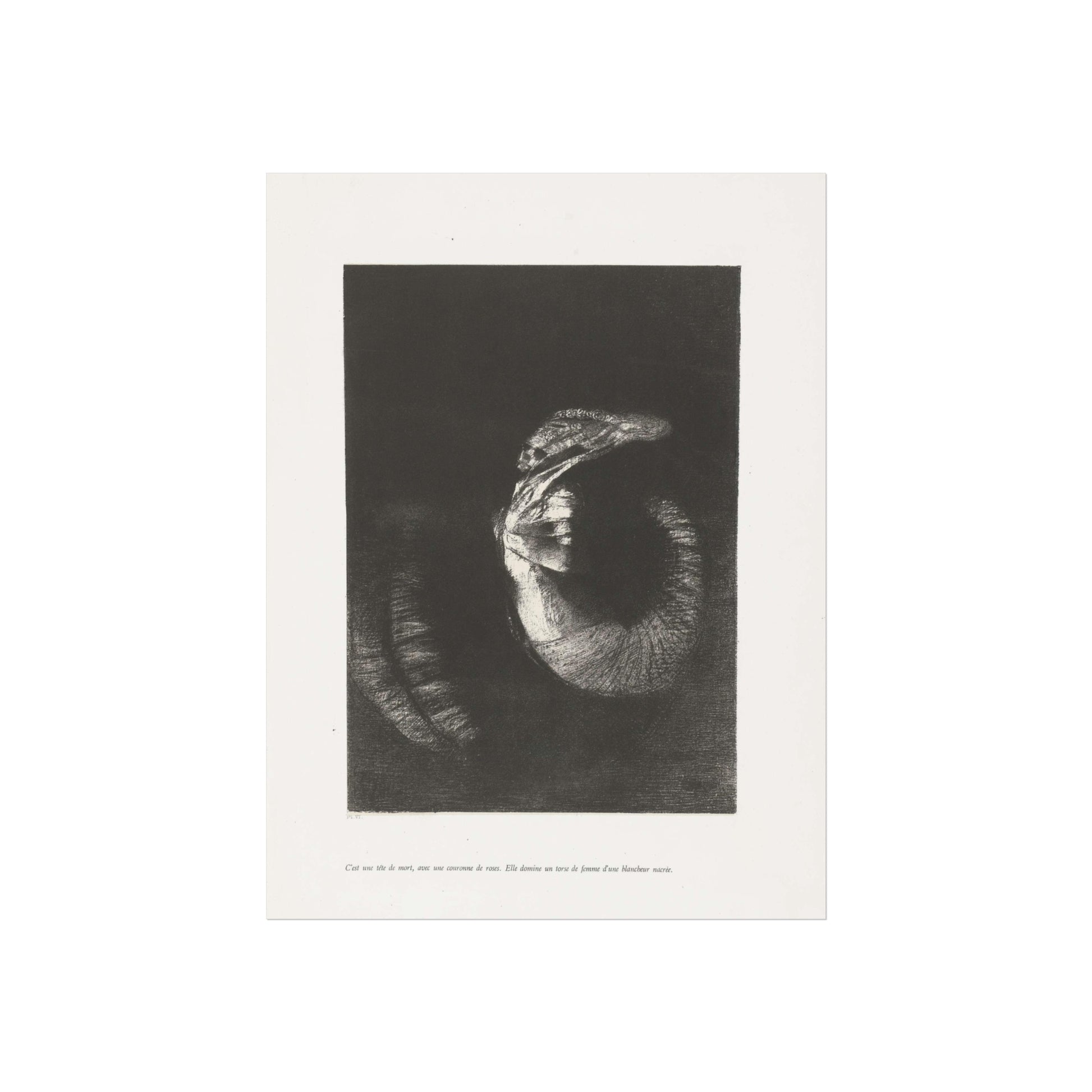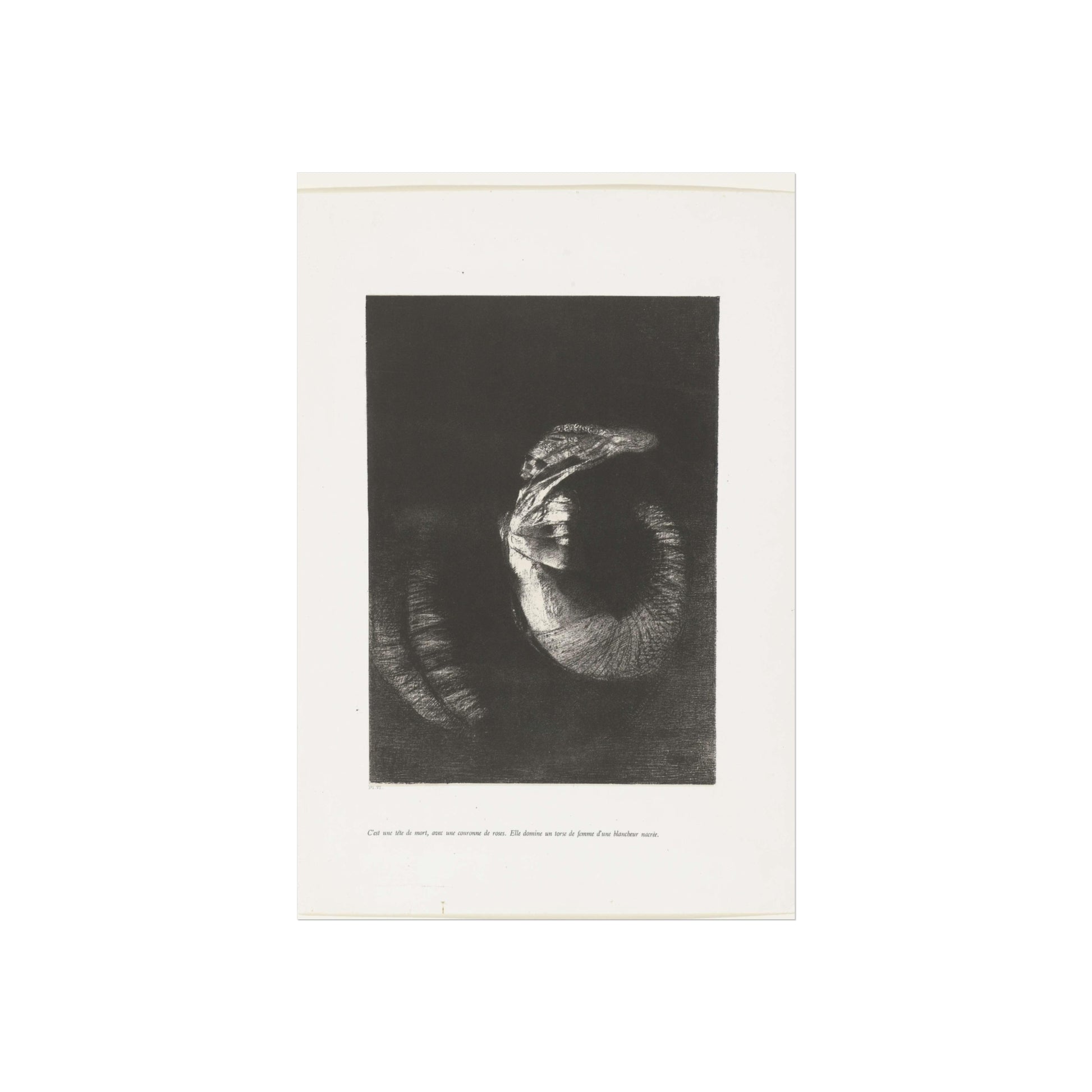 An arresting image of a skull combined with a female torso and a snake-like tail set against a dark backdrop. The inscription beneath the artwork reads: "It's a skull adorned with a garland of roses. She possesses the body of a woman, pearlescent in her pallor." This is the sixth print from the first series of ten illustrations for Gustave Flaubert's 'The Temptation of Saint Anthony'.
