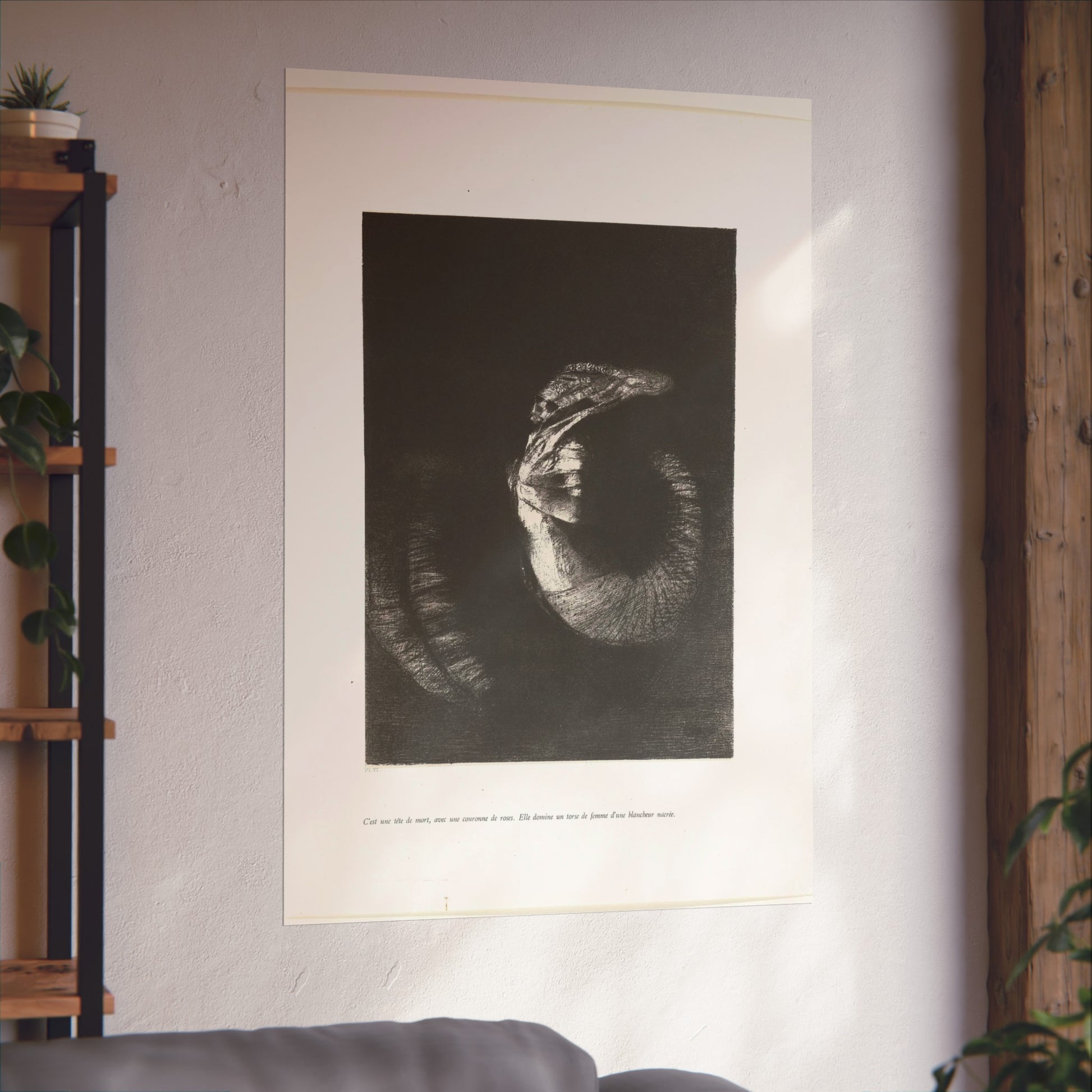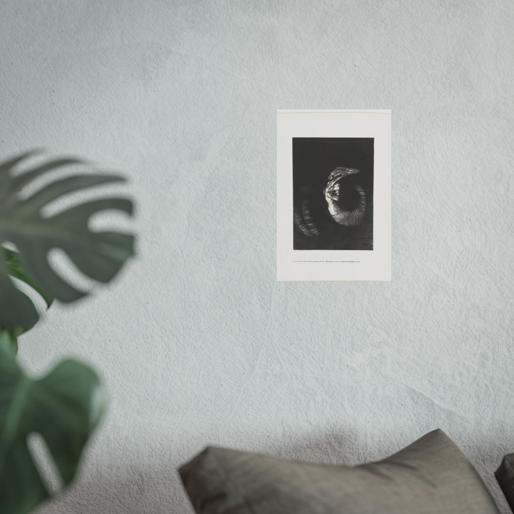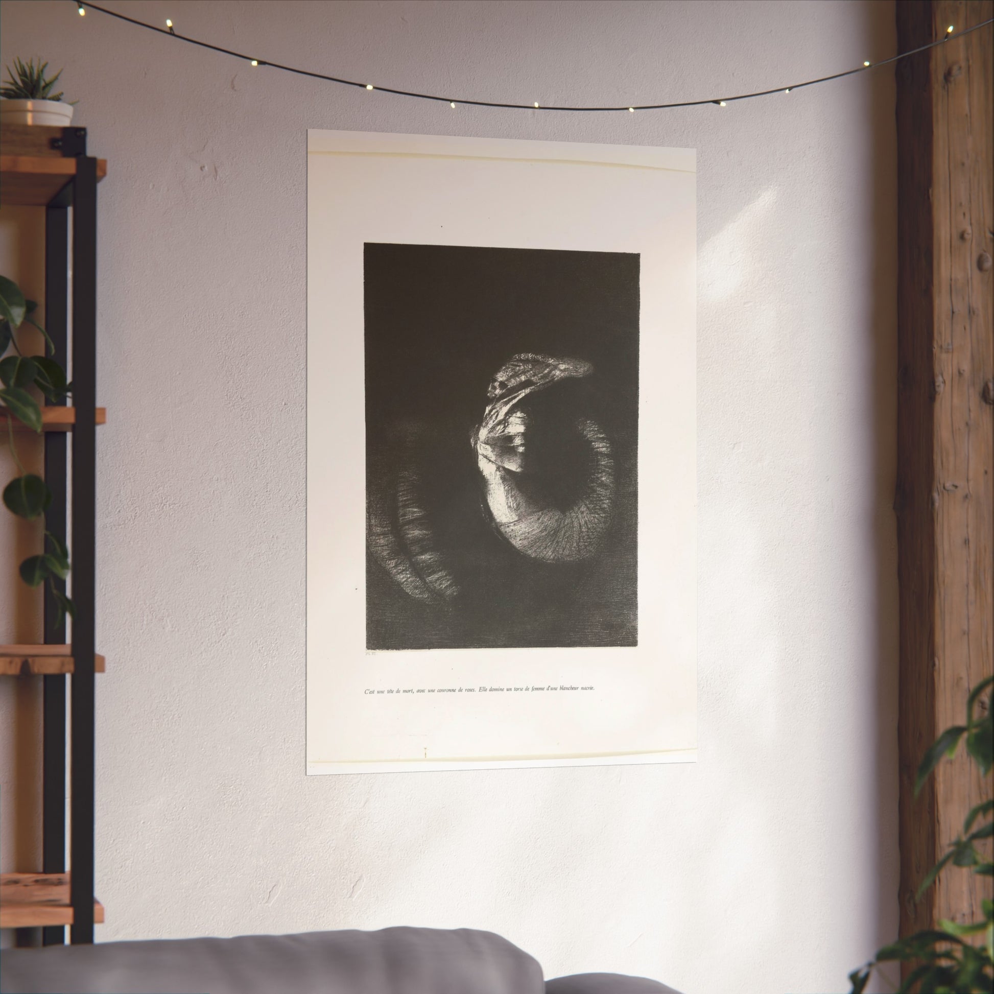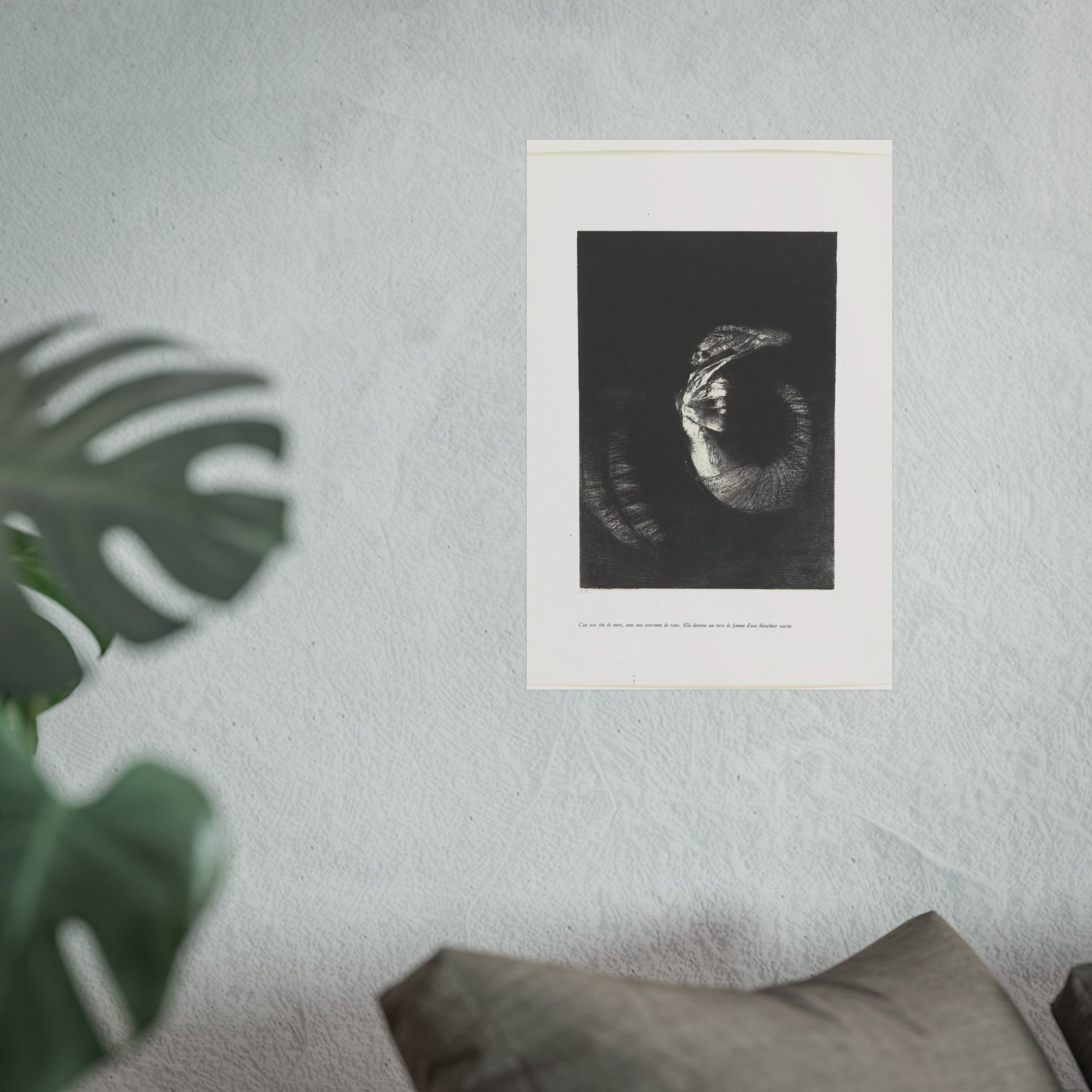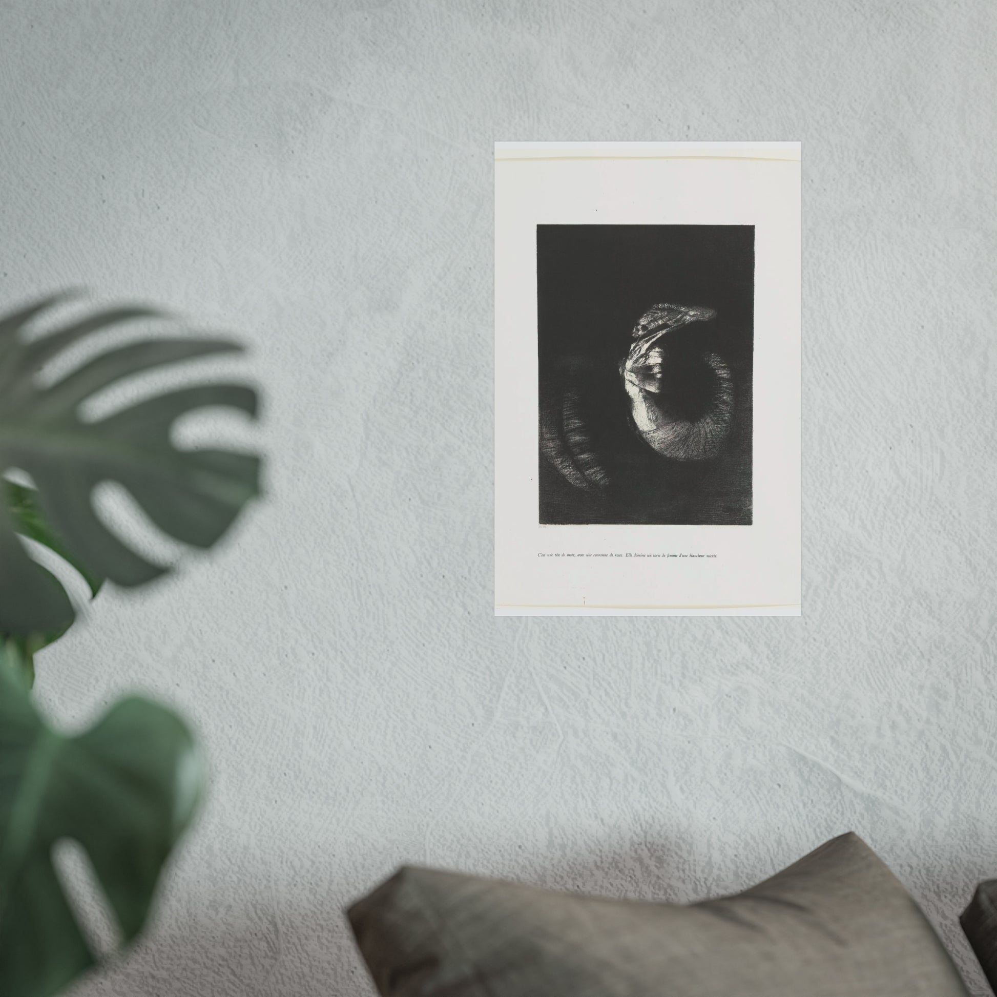 An arresting image of a skull combined with a female torso and a snake-like tail set against a dark backdrop. The inscription beneath the artwork reads: "It's a skull adorned with a garland of roses. She possesses the body of a woman, pearlescent in her pallor." This is the sixth print from the first series of ten illustrations for Gustave Flaubert's 'The Temptation of Saint Anthony'.