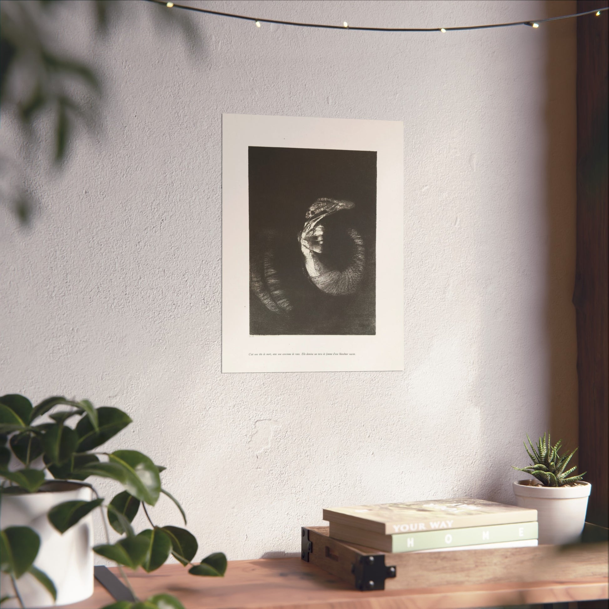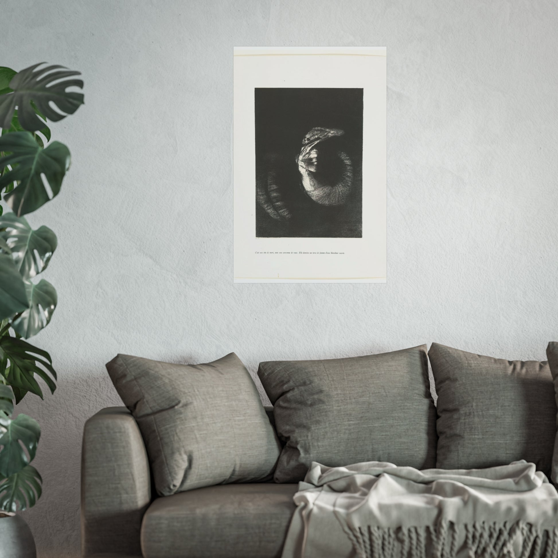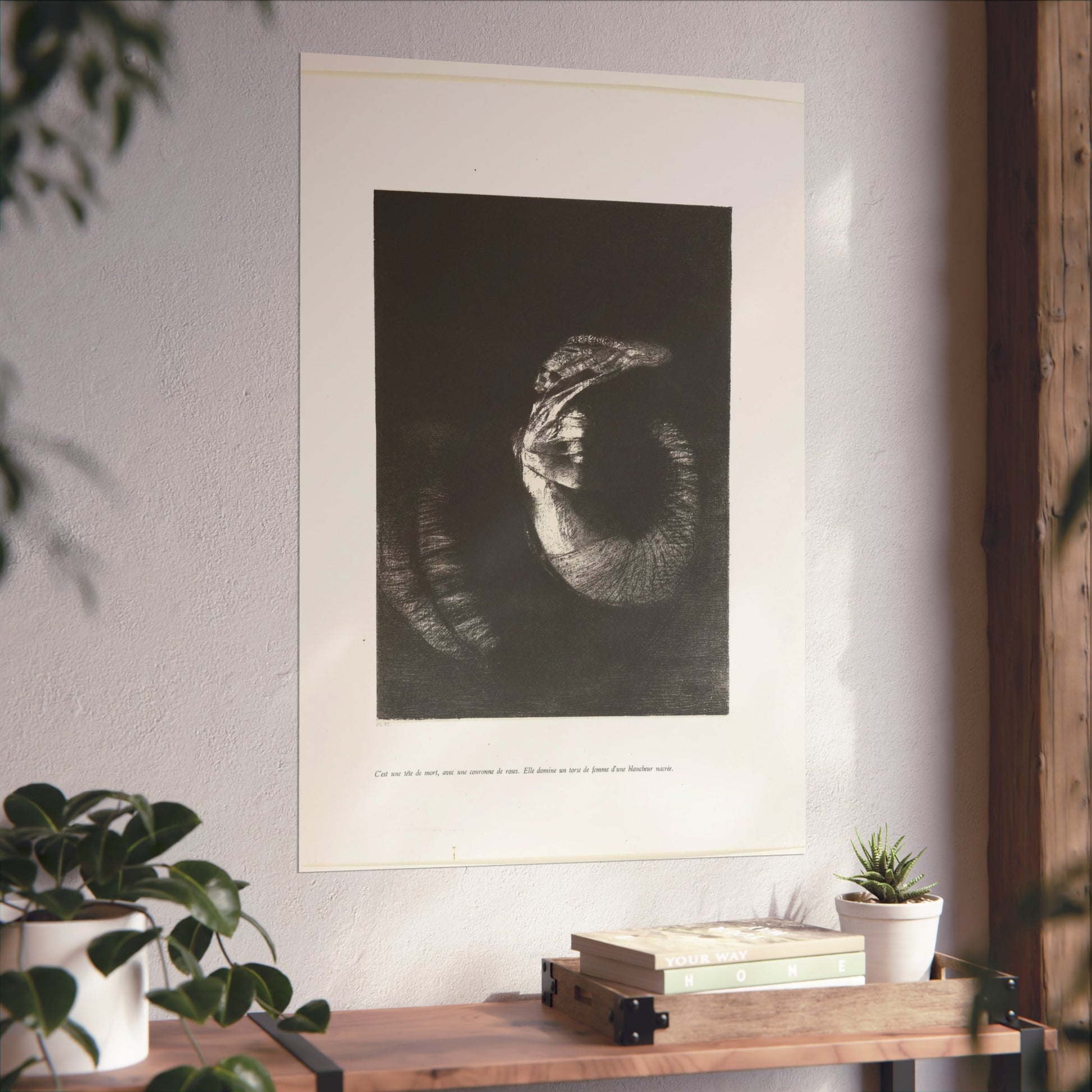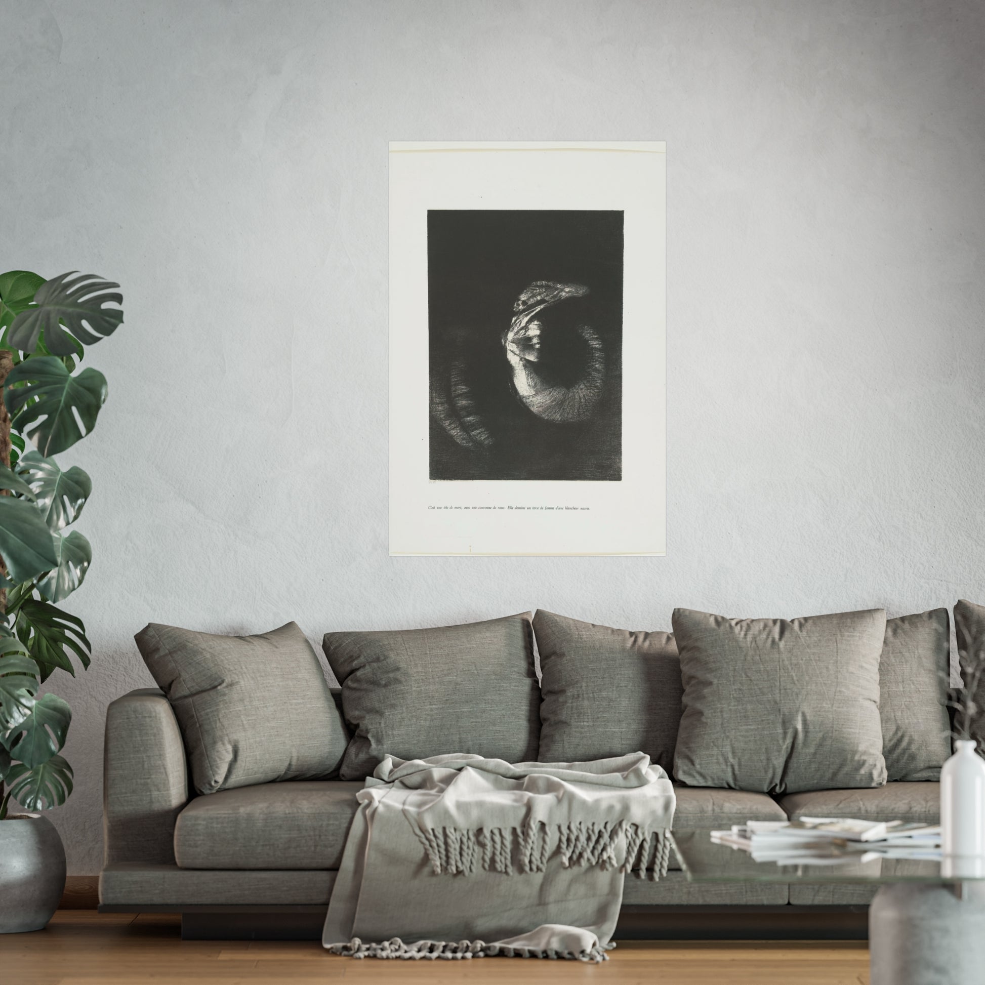 An arresting image of a skull combined with a female torso and a snake-like tail set against a dark backdrop. The inscription beneath the artwork reads: "It's a skull adorned with a garland of roses. She possesses the body of a woman, pearlescent in her pallor." This is the sixth print from the first series of ten illustrations for Gustave Flaubert's 'The Temptation of Saint Anthony'.