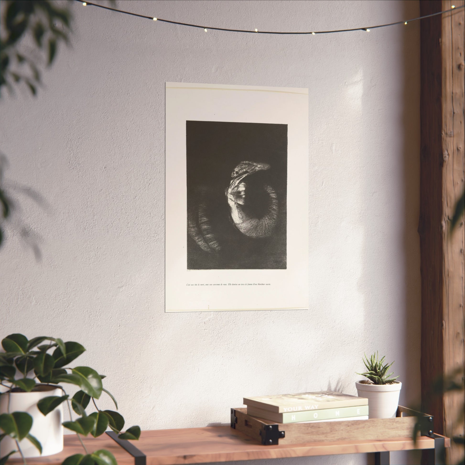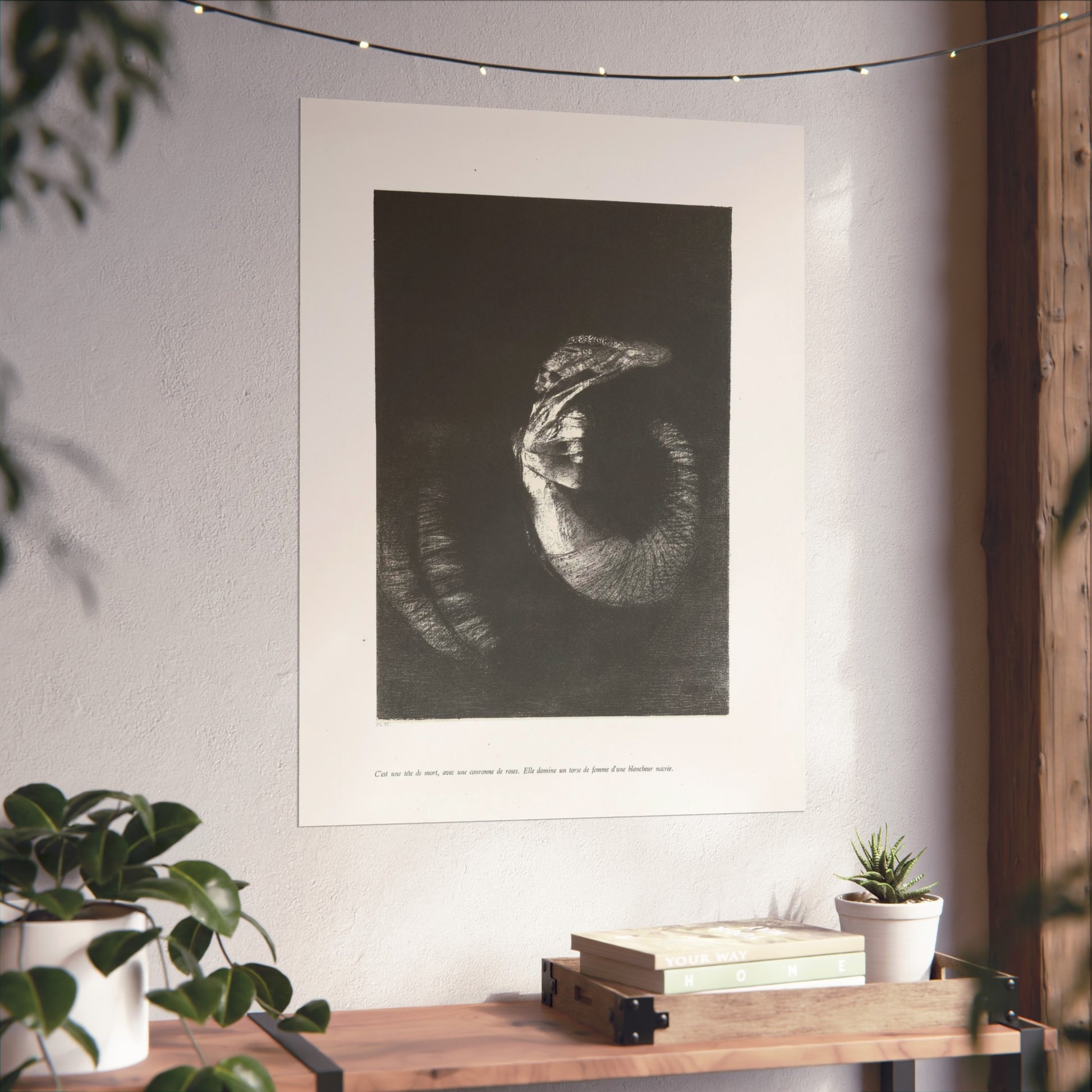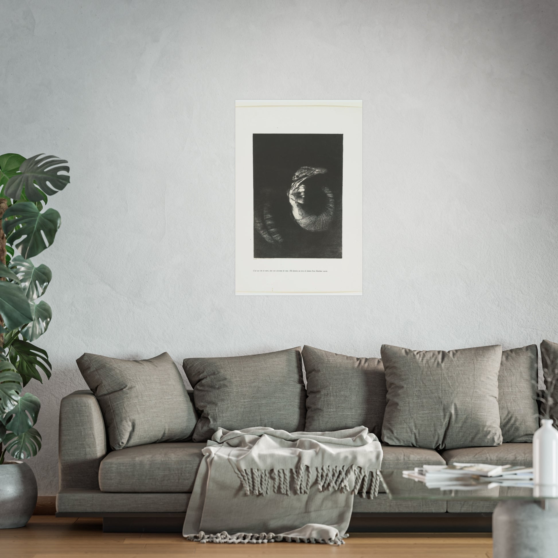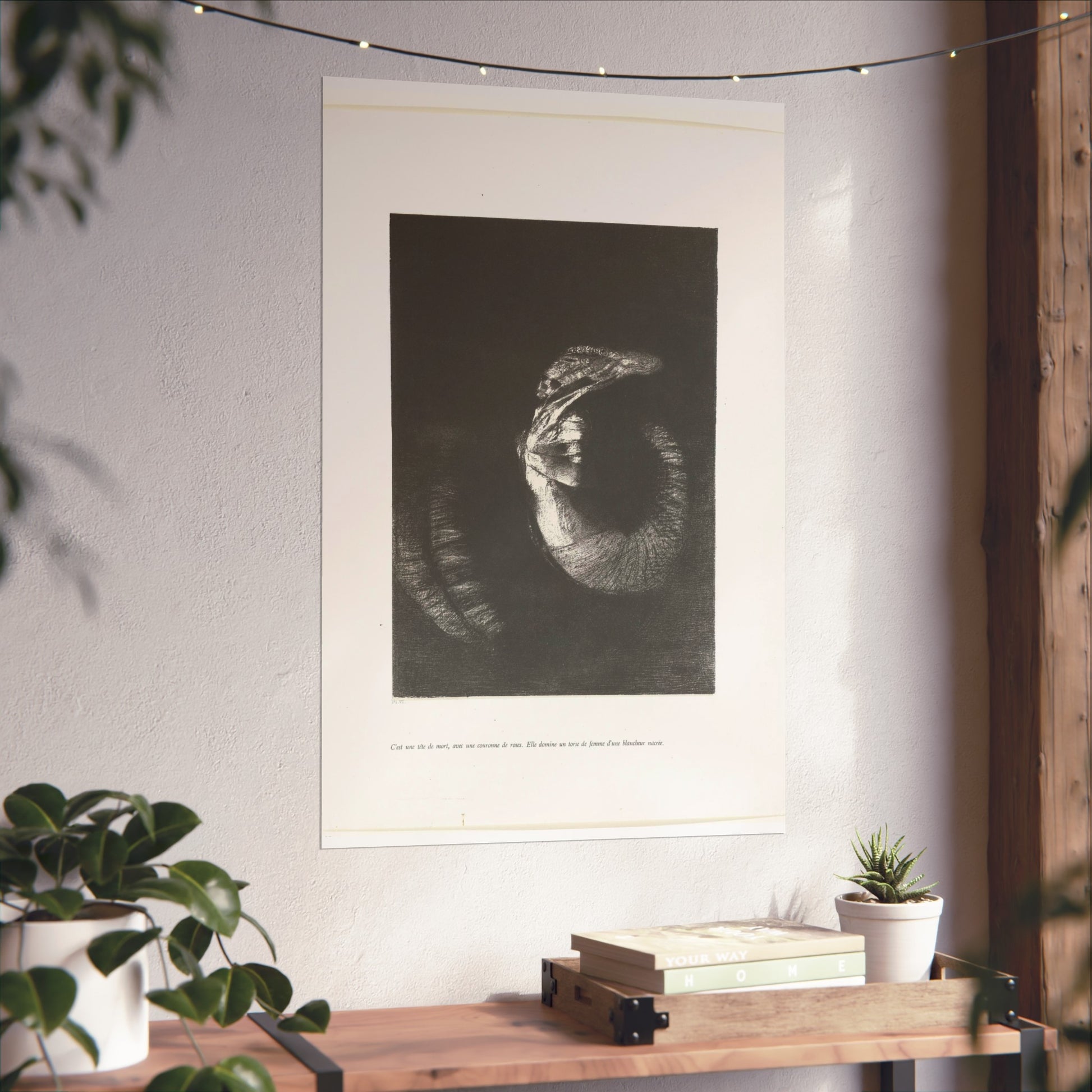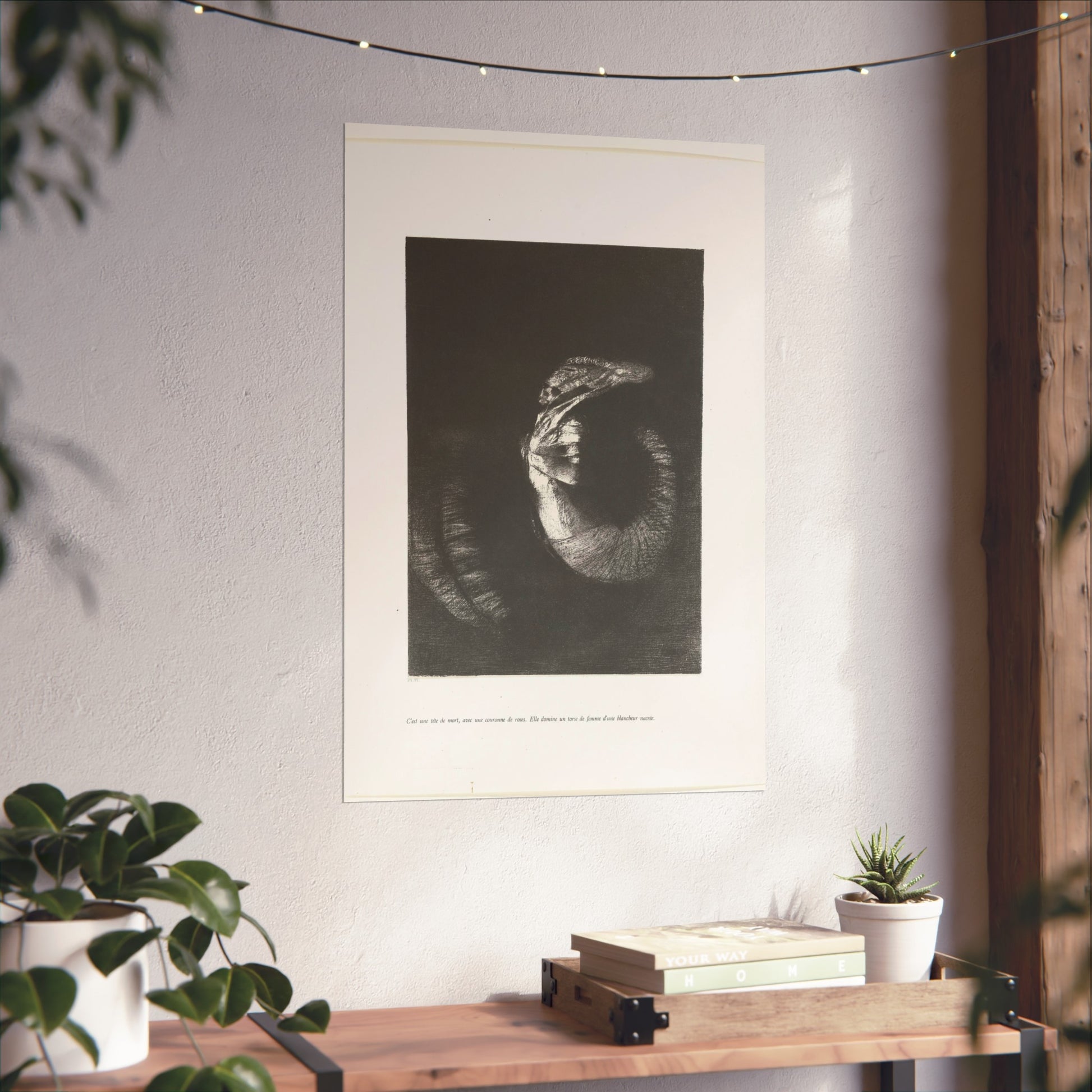 An arresting image of a skull combined with a female torso and a snake-like tail set against a dark backdrop. The inscription beneath the artwork reads: "It's a skull adorned with a garland of roses. She possesses the body of a woman, pearlescent in her pallor." This is the sixth print from the first series of ten illustrations for Gustave Flaubert's 'The Temptation of Saint Anthony'.