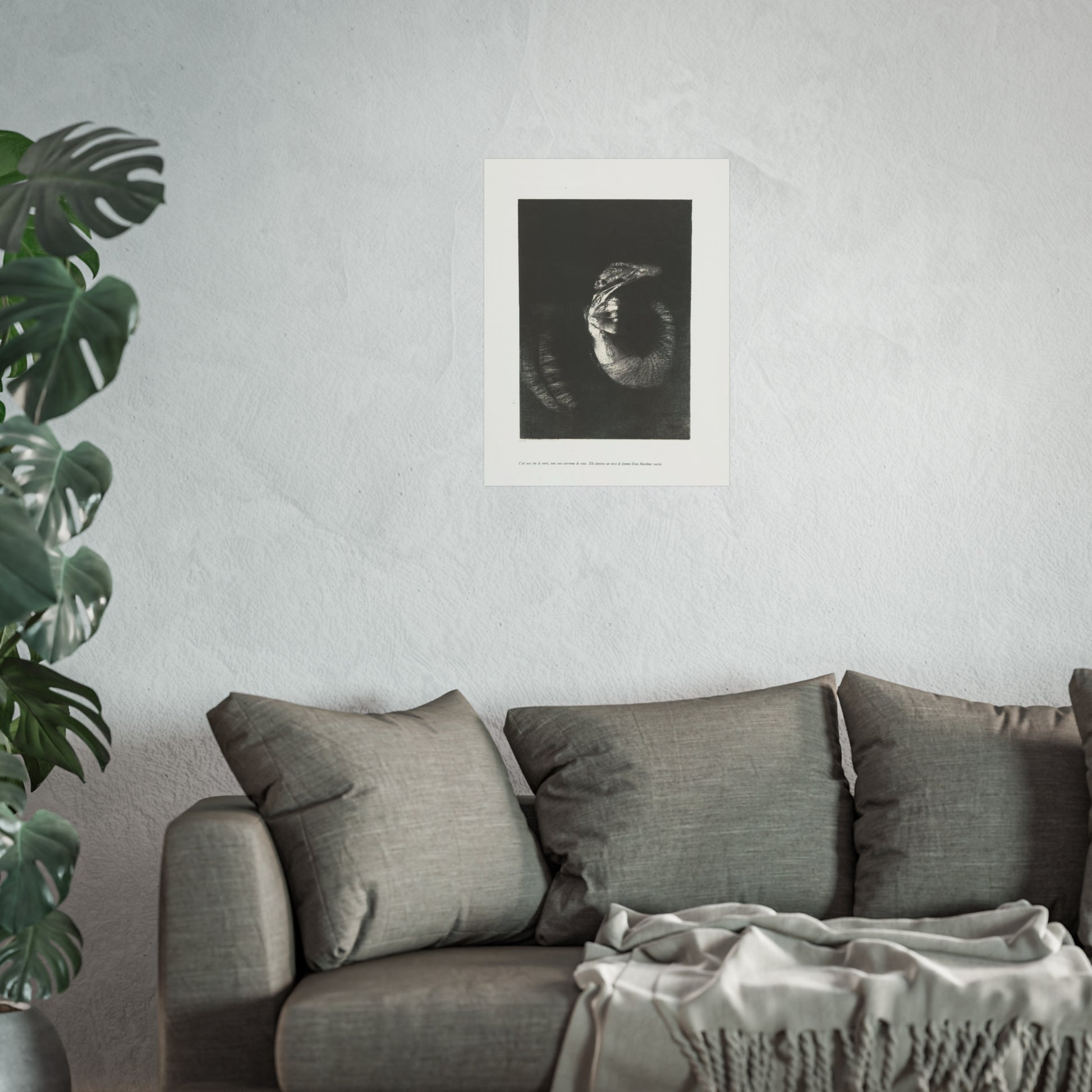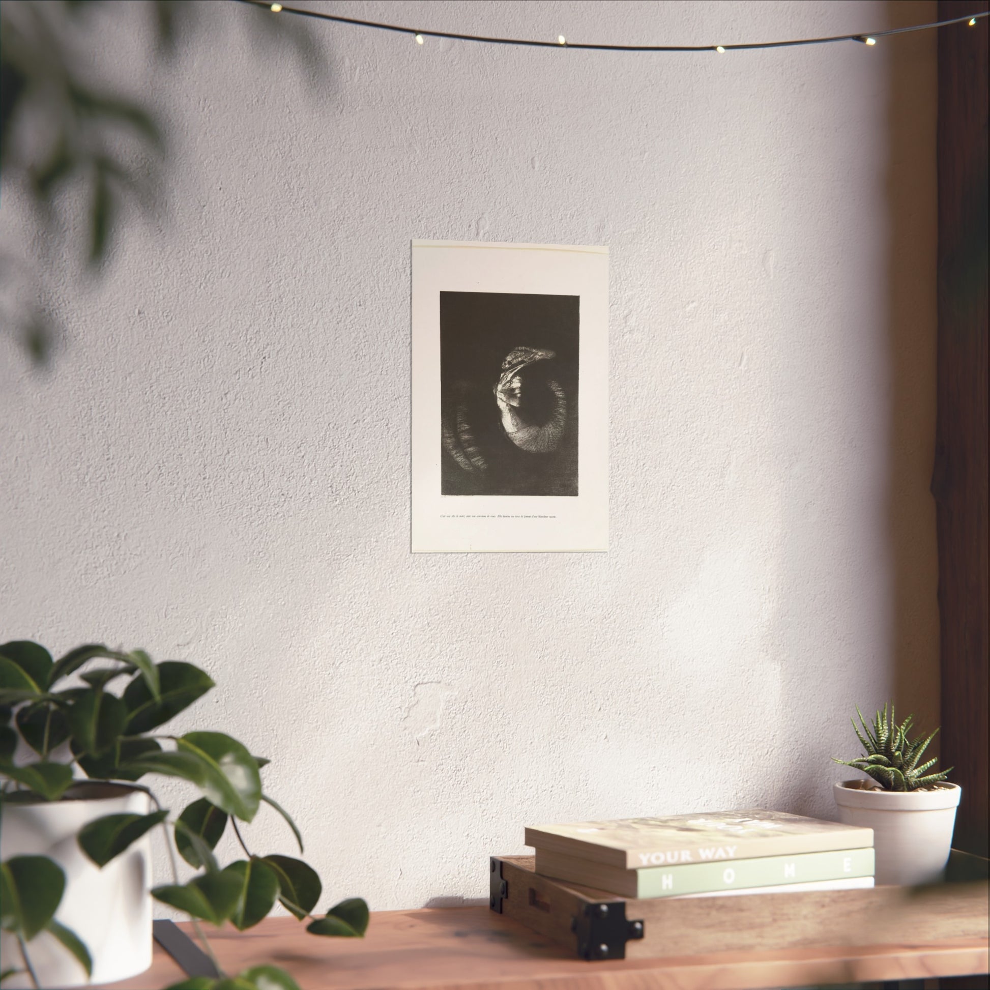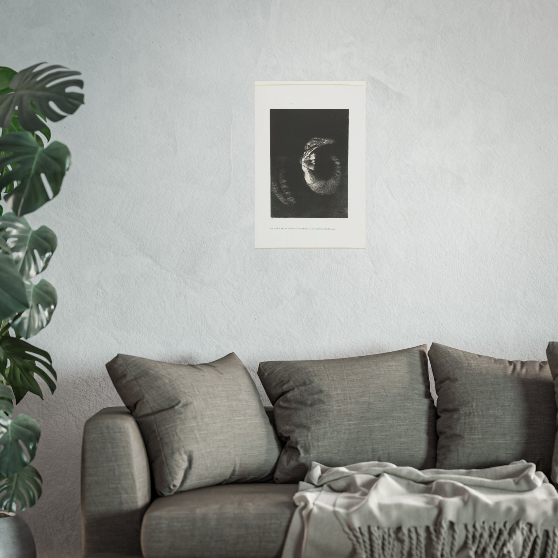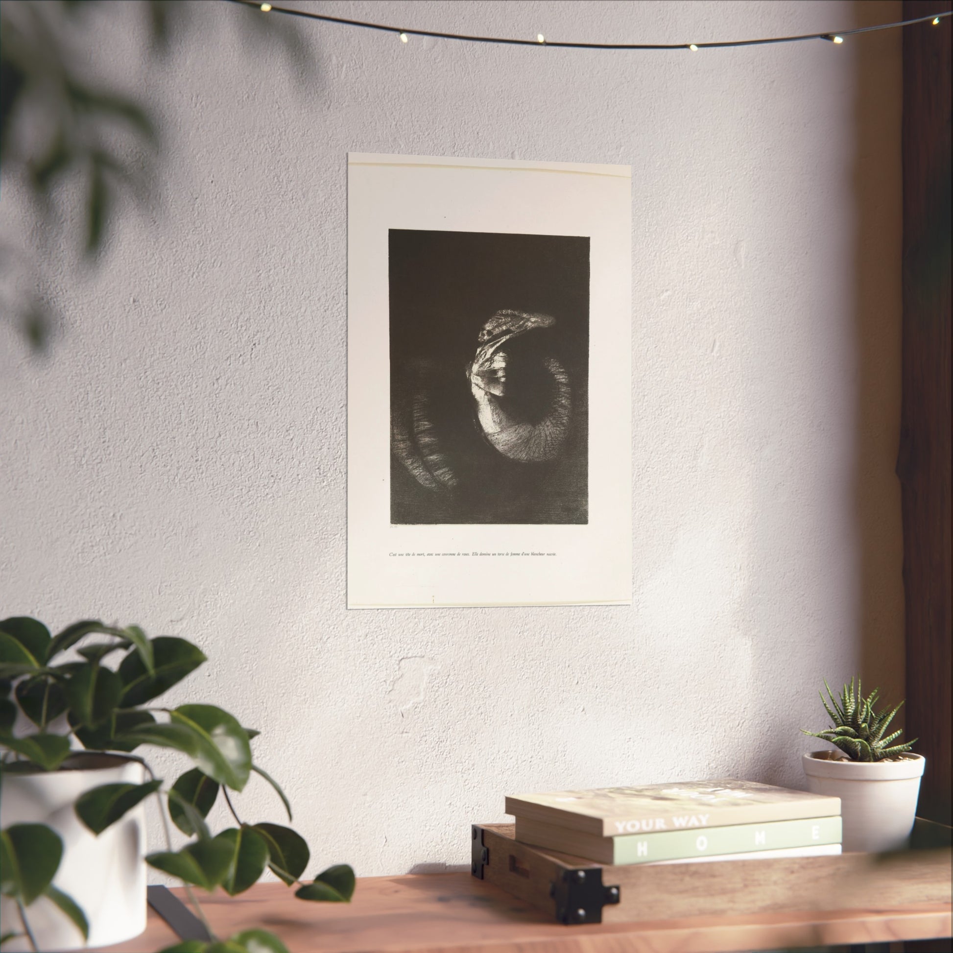 An arresting image of a skull combined with a female torso and a snake-like tail set against a dark backdrop. The inscription beneath the artwork reads: "It's a skull adorned with a garland of roses. She possesses the body of a woman, pearlescent in her pallor." This is the sixth print from the first series of ten illustrations for Gustave Flaubert's 'The Temptation of Saint Anthony'.