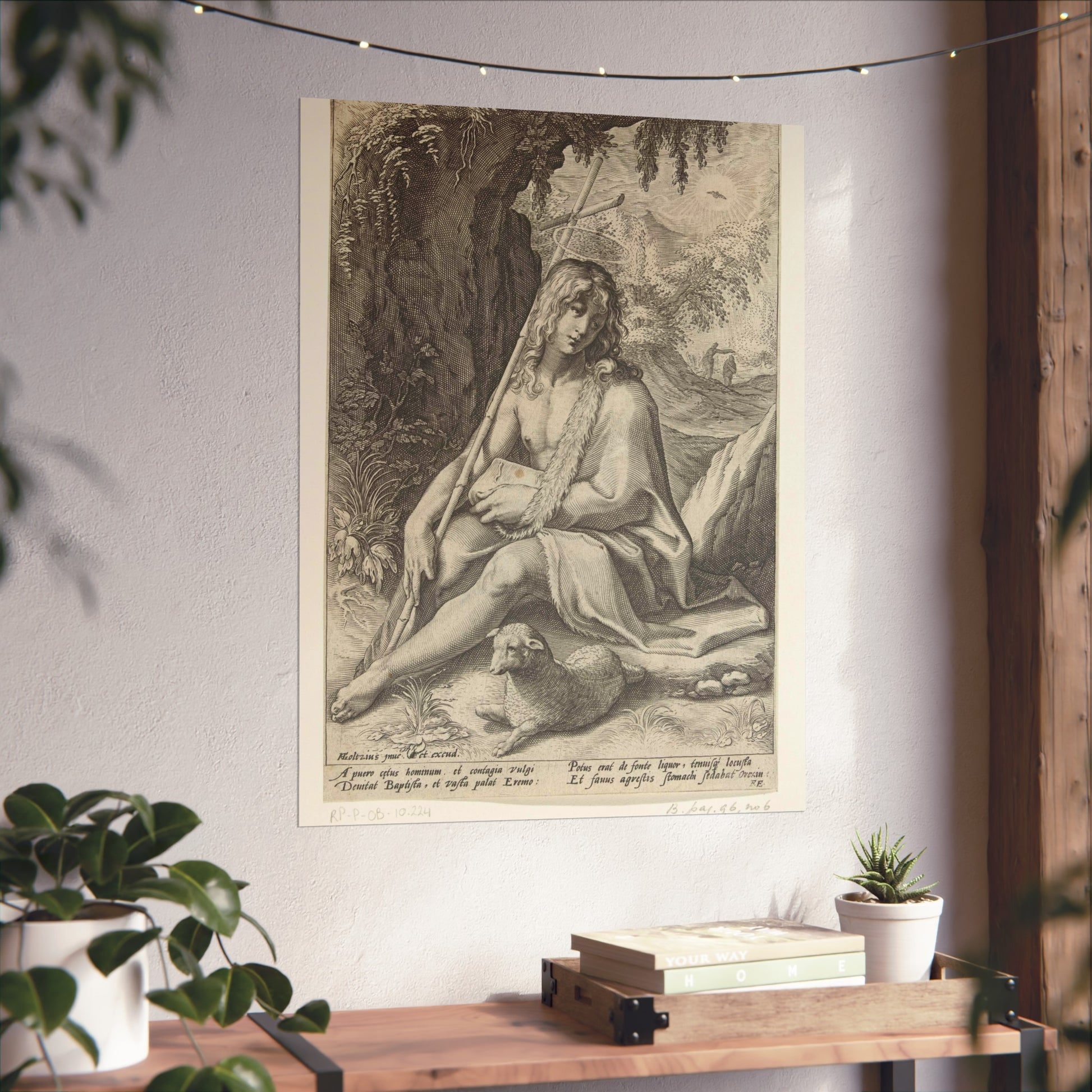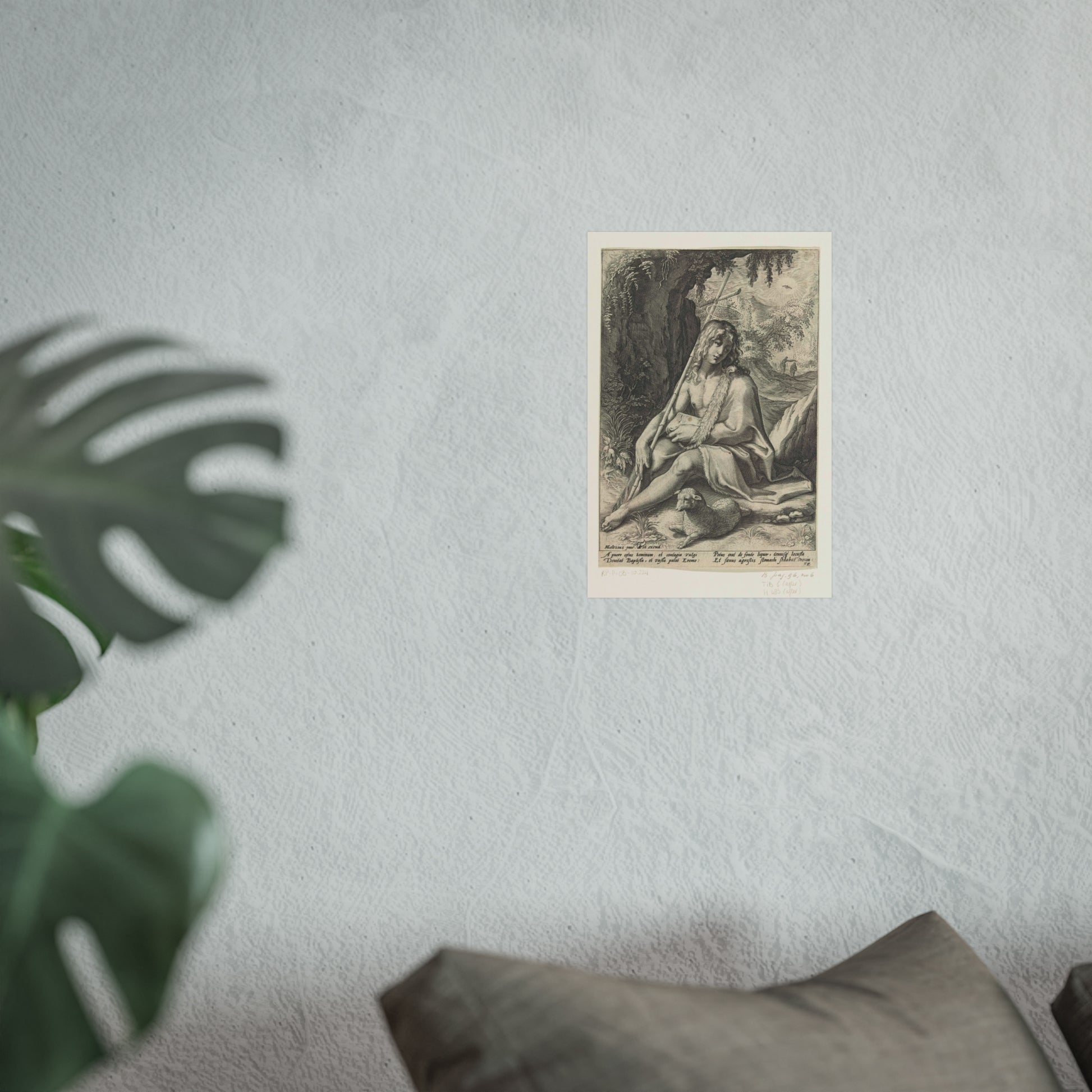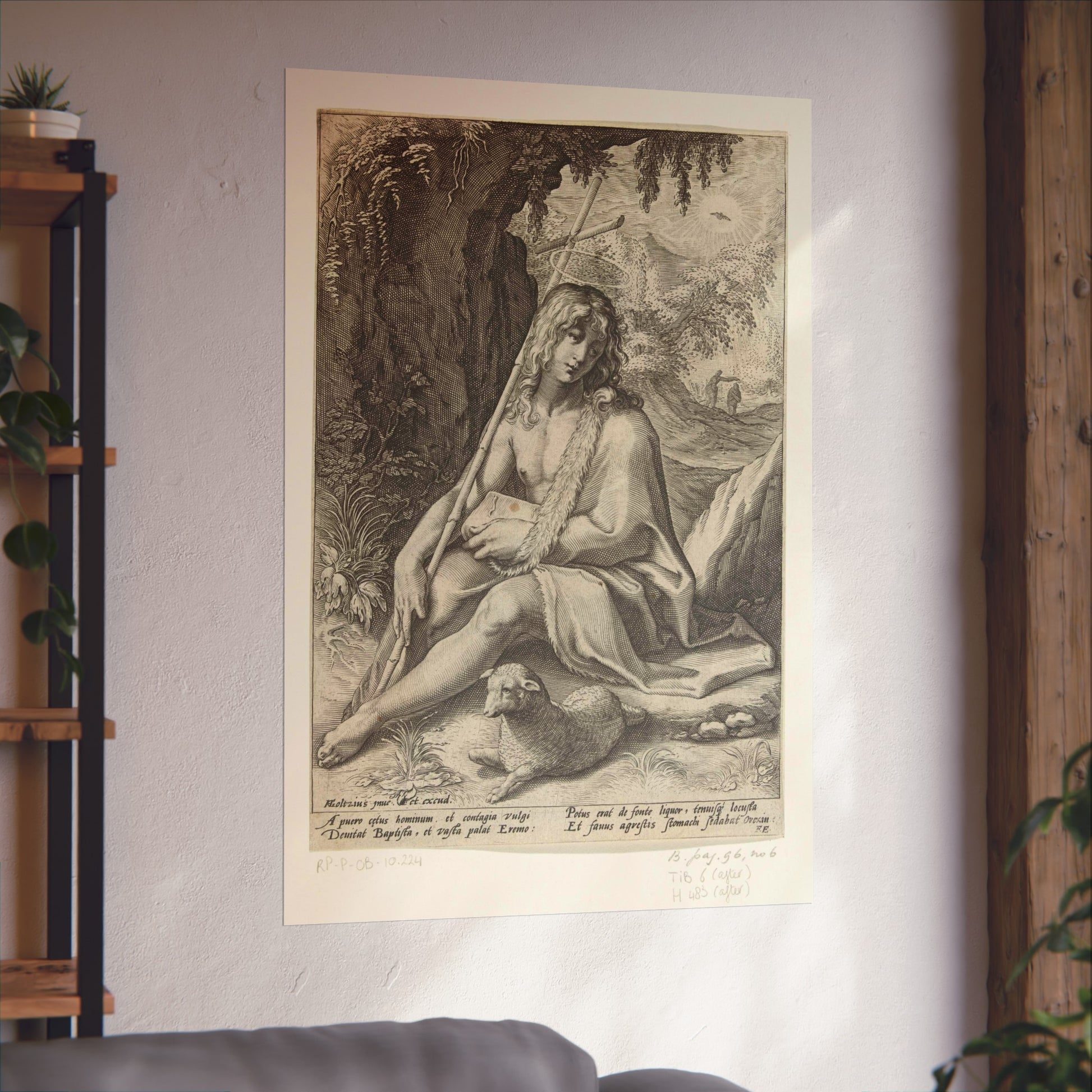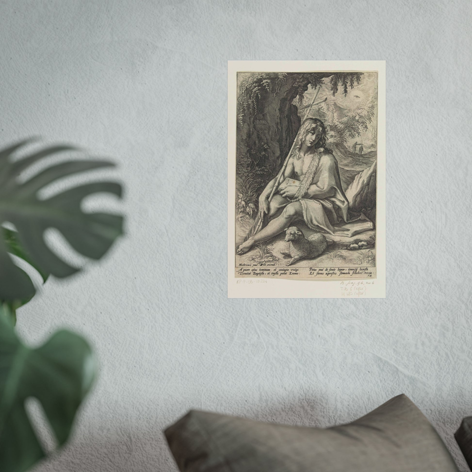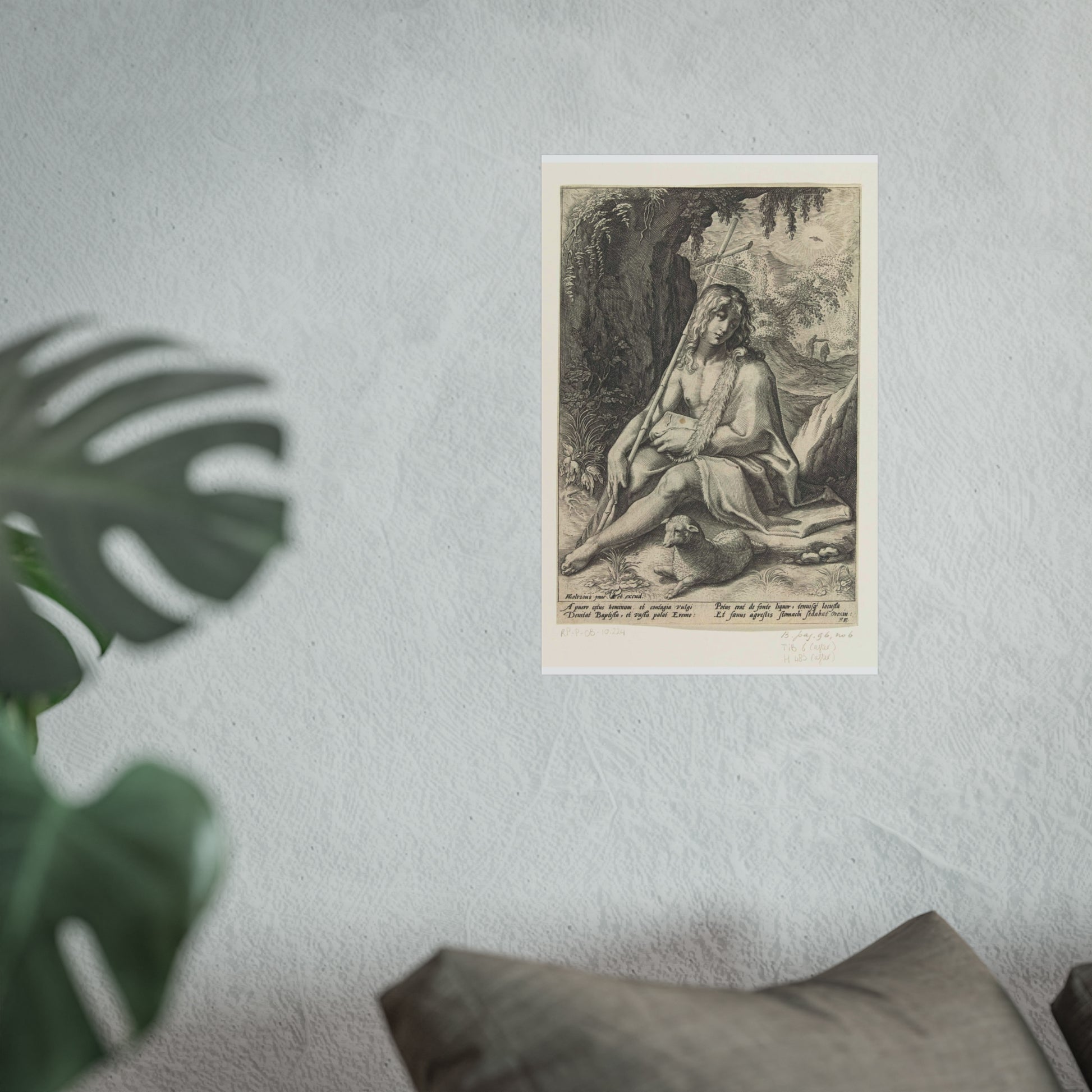 The painting depicts John the Baptist, seated in a rugged mountainous landscape. He rests a staff, culminating in a cross, against his shoulder while a lamb lounges at his feet. Below the image, four lines of Latin text provide further context to this profound scene.