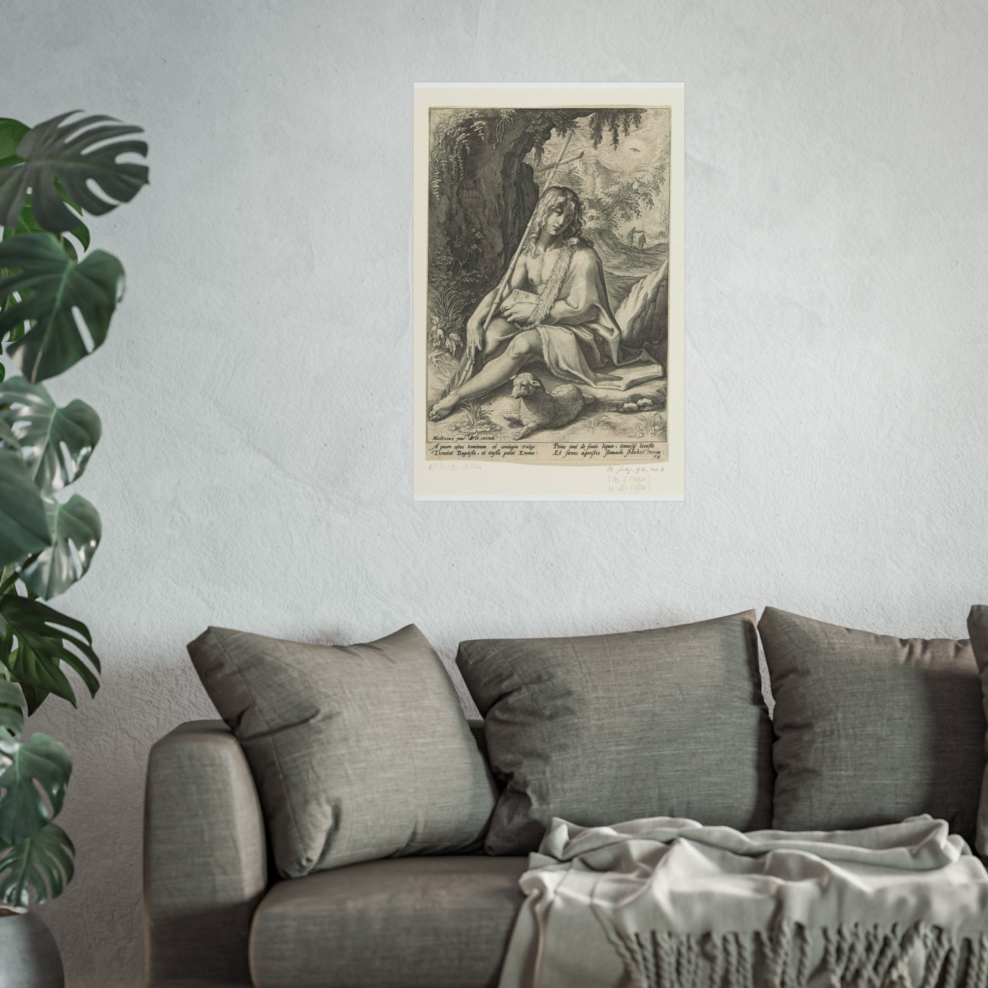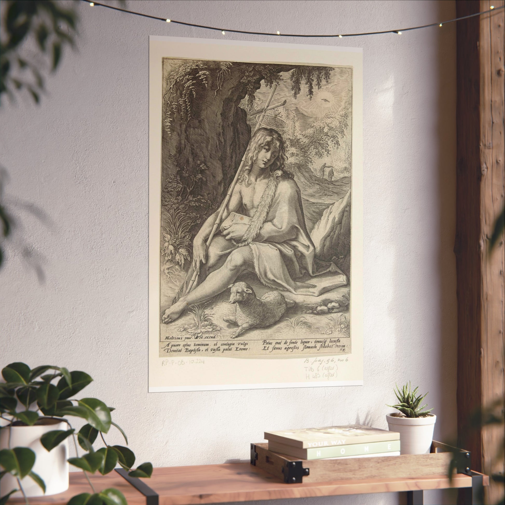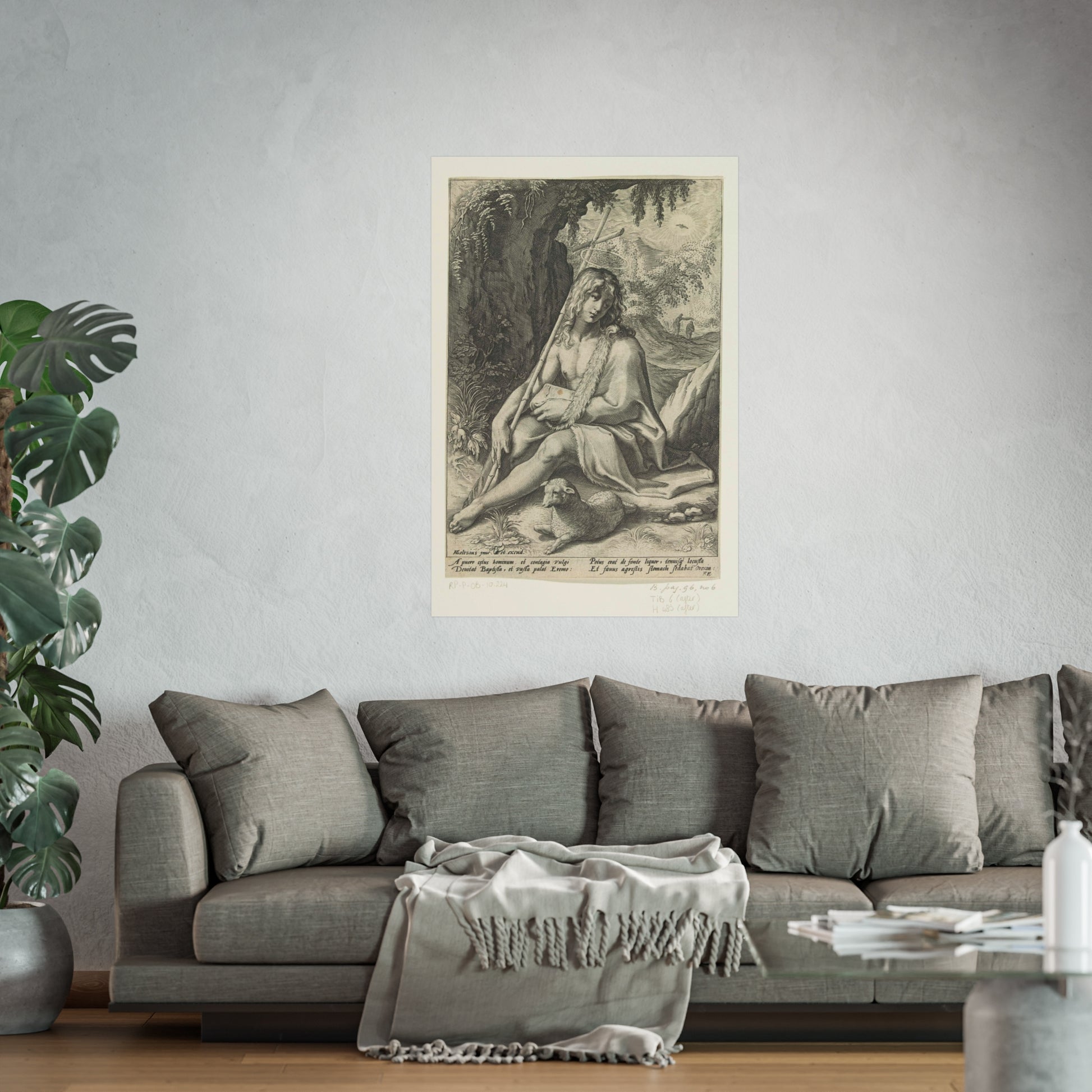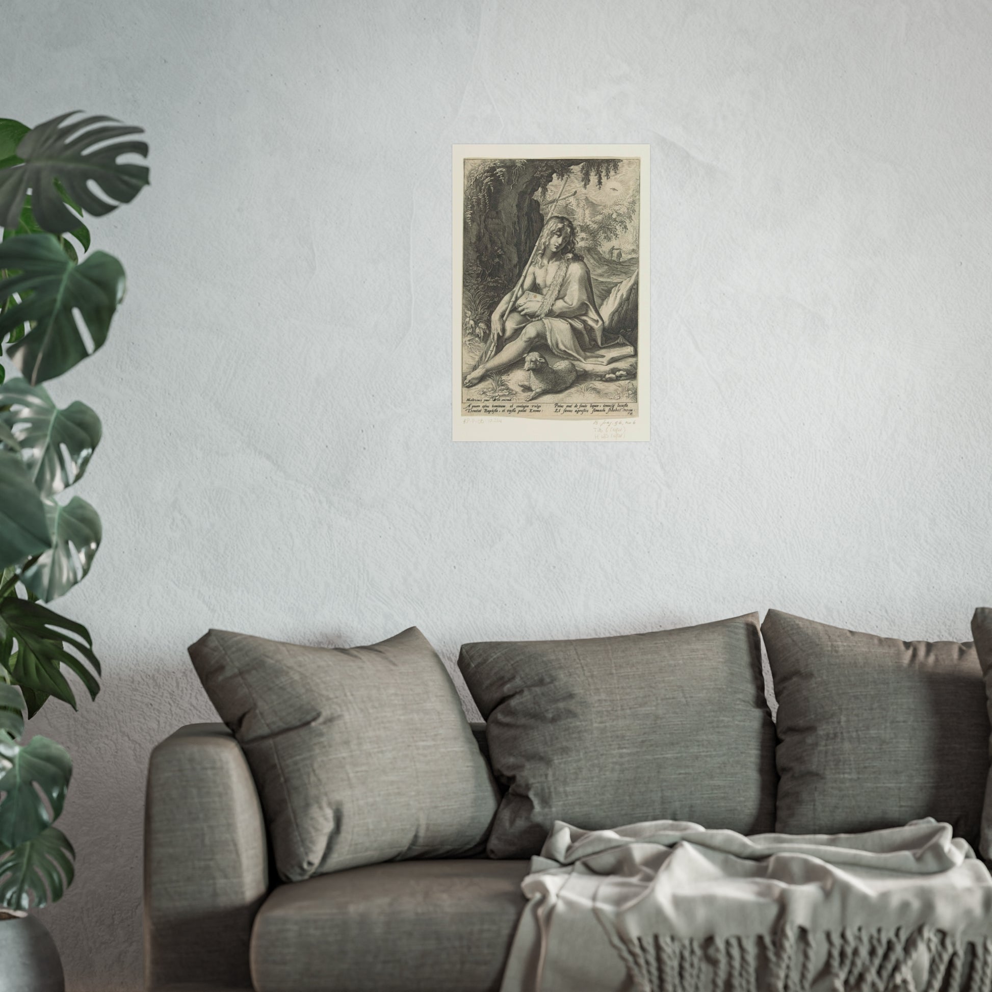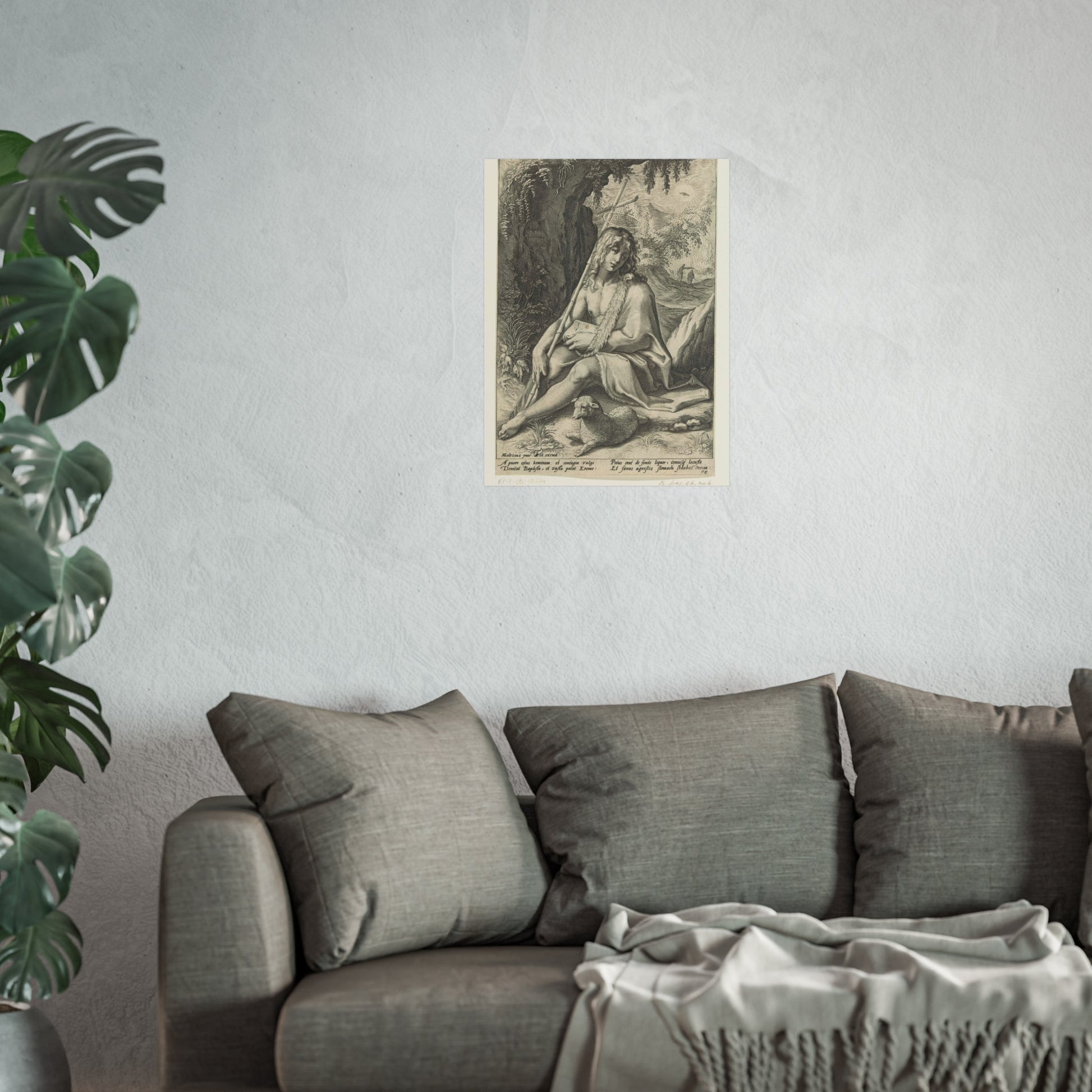 The painting depicts John the Baptist, seated in a rugged mountainous landscape. He rests a staff, culminating in a cross, against his shoulder while a lamb lounges at his feet. Below the image, four lines of Latin text provide further context to this profound scene.