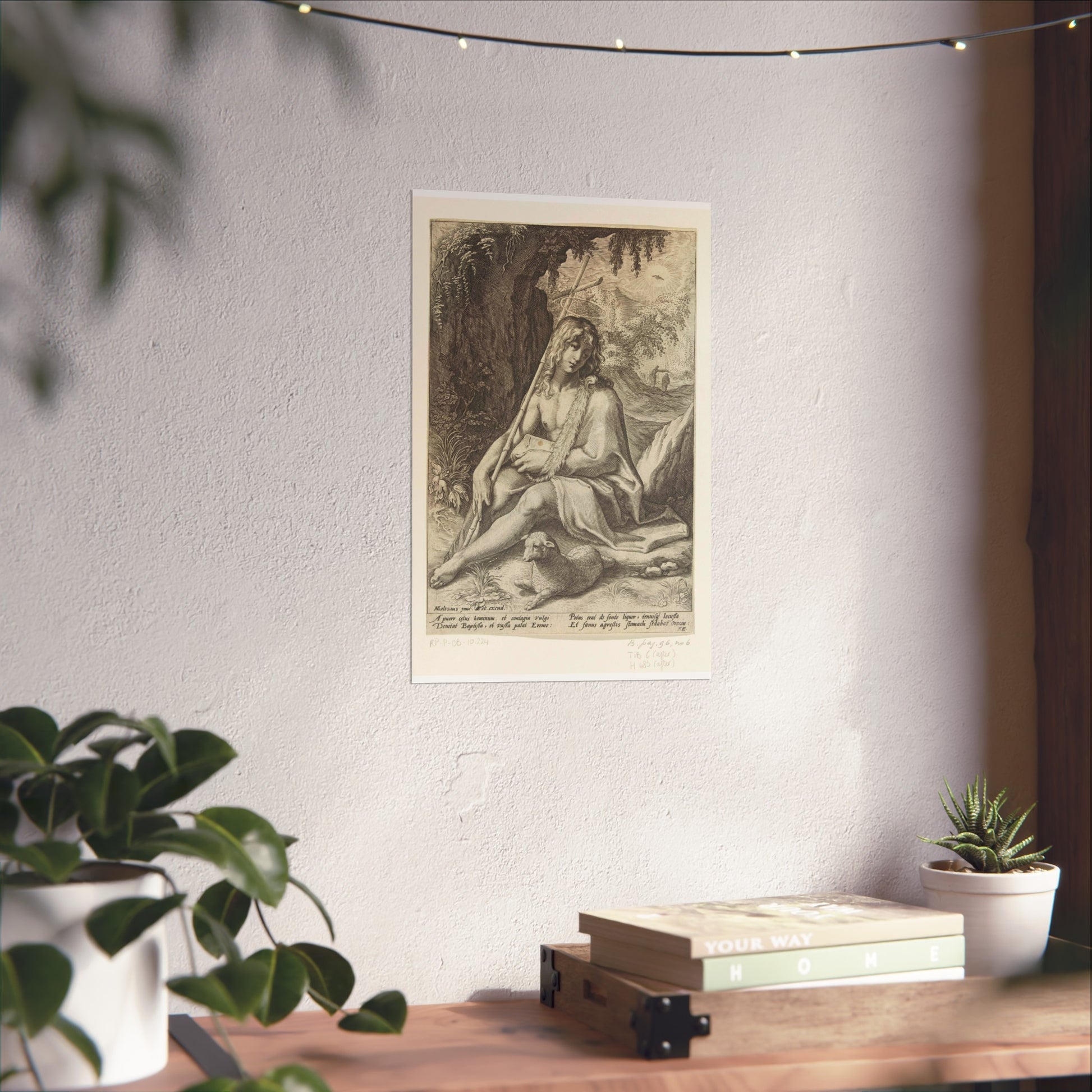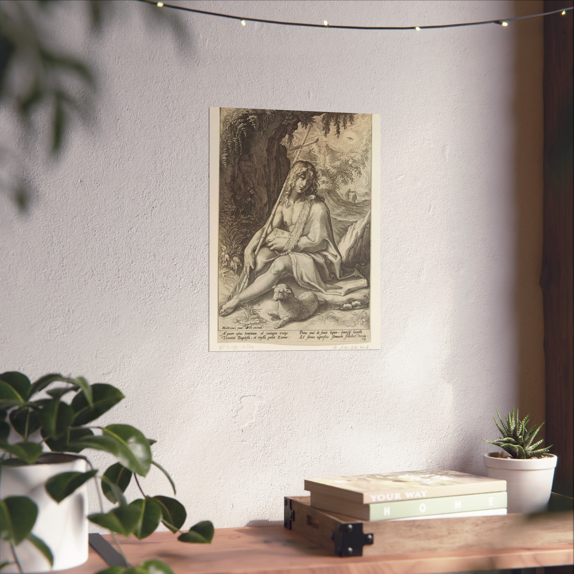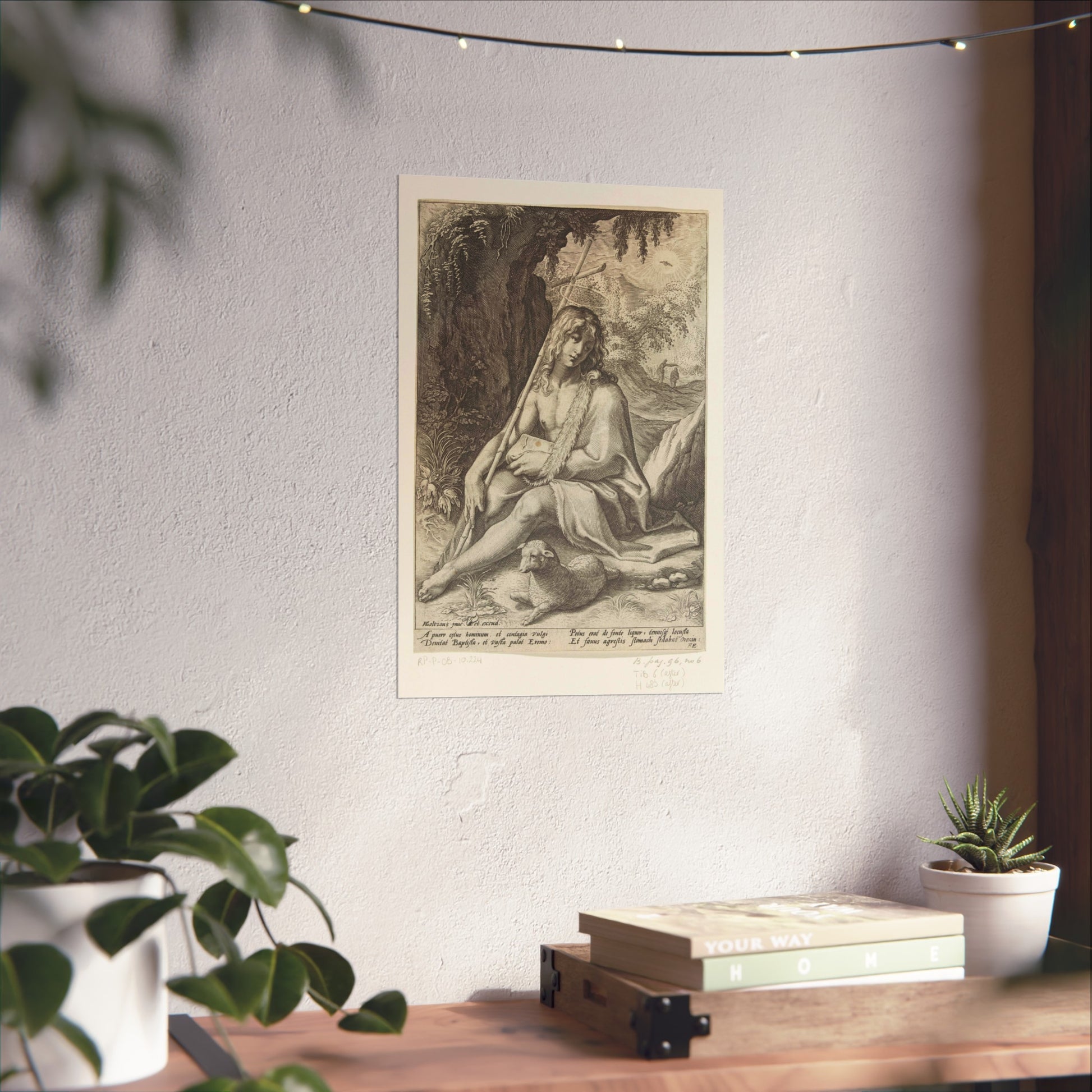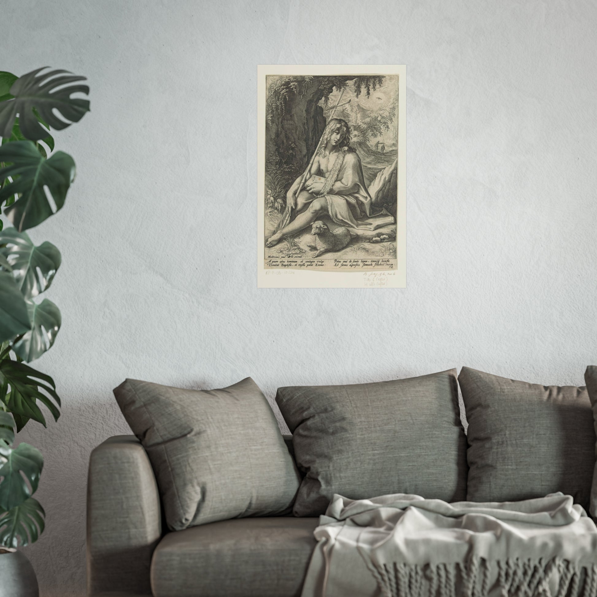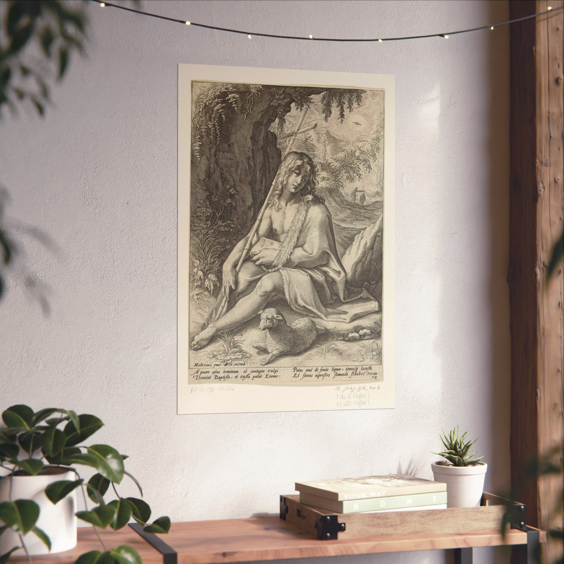 The painting depicts John the Baptist, seated in a rugged mountainous landscape. He rests a staff, culminating in a cross, against his shoulder while a lamb lounges at his feet. Below the image, four lines of Latin text provide further context to this profound scene.