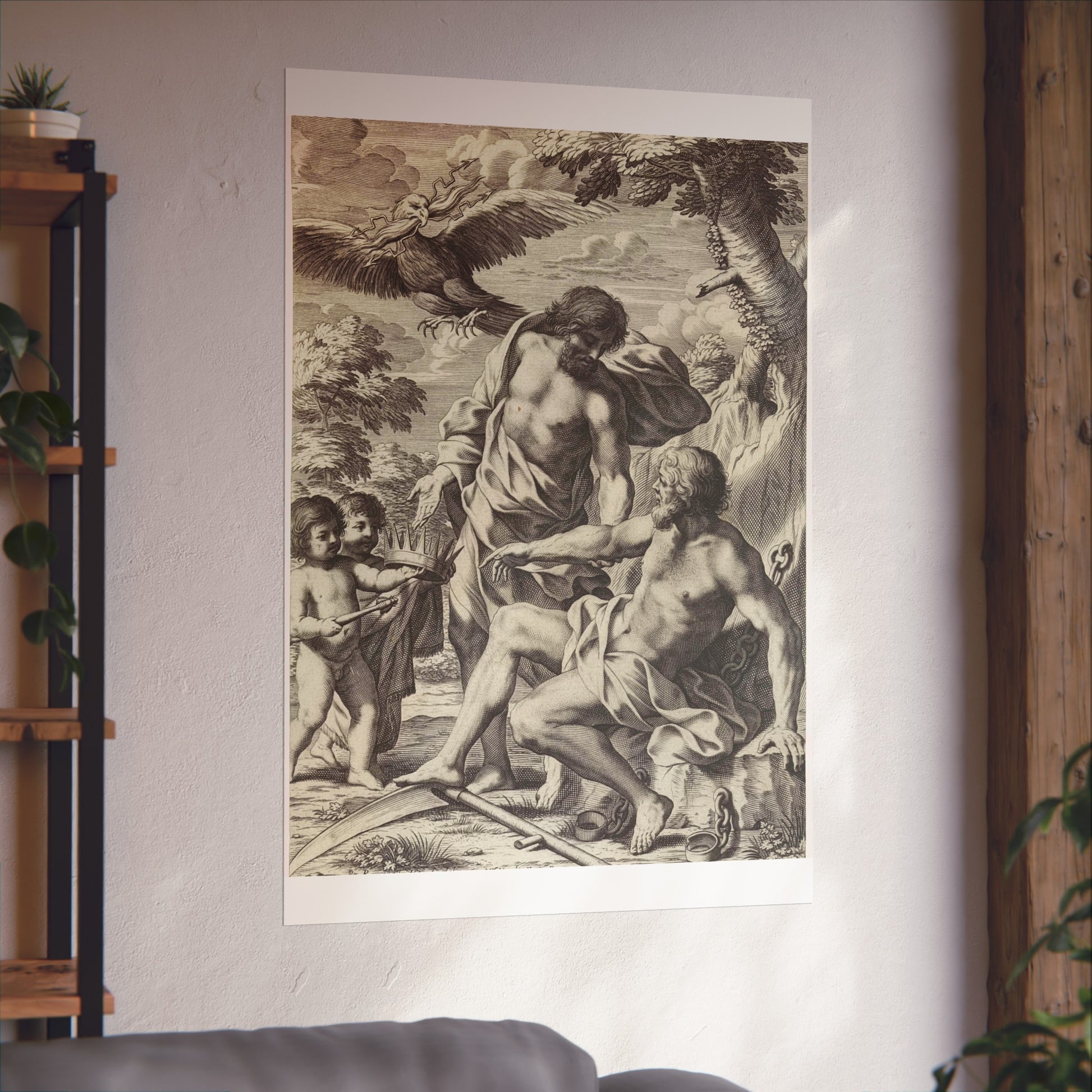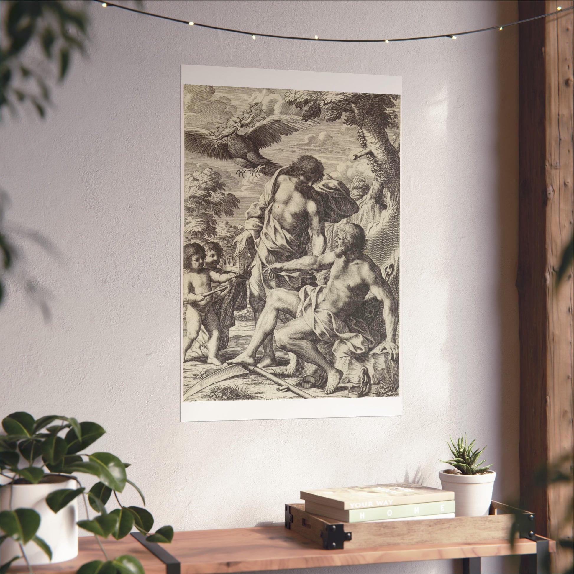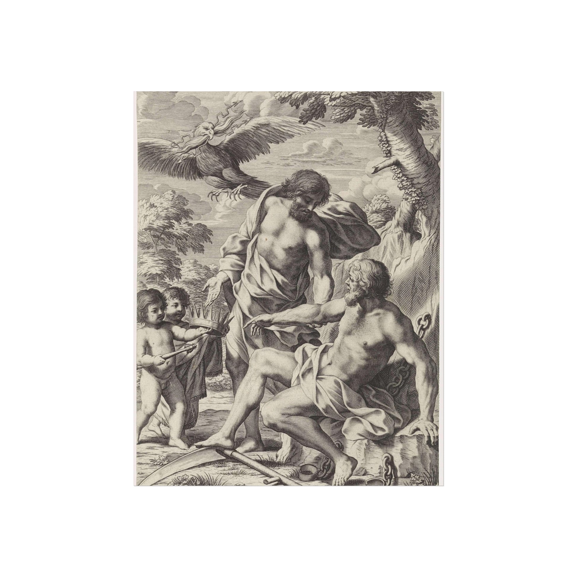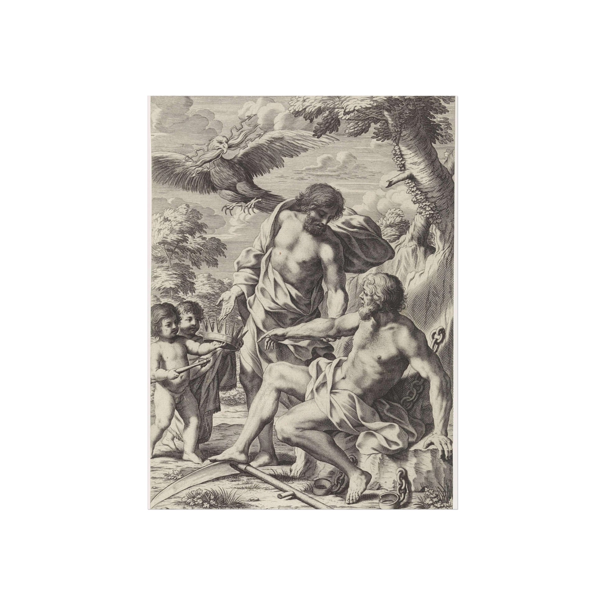 Saturn, his scythe beneath his feet, sits in front of a rock adorned with shackles. Beside him stands Jupiter, pointing out two cherubs offering Saturn a crown and scepter. Next to Jupiter, his attribute, an eagle clutching lightning bolts in its beak, soars. The bee on the scepter signifies the influential Roman Barbarini family and the papacy of Urban VIII, who hailed from this lineage.