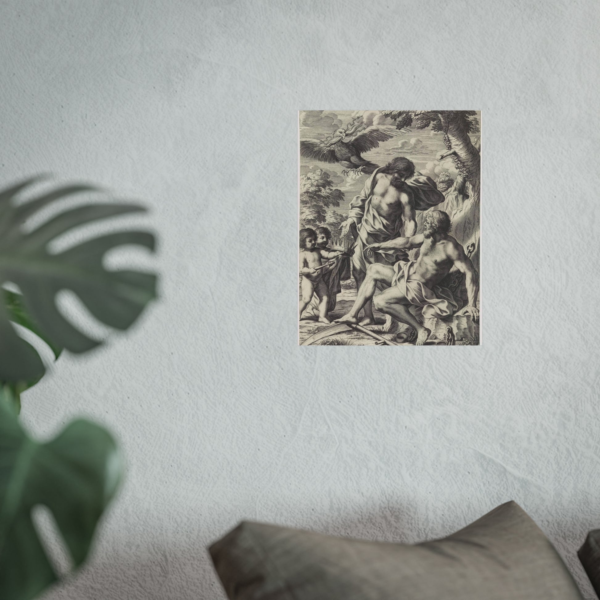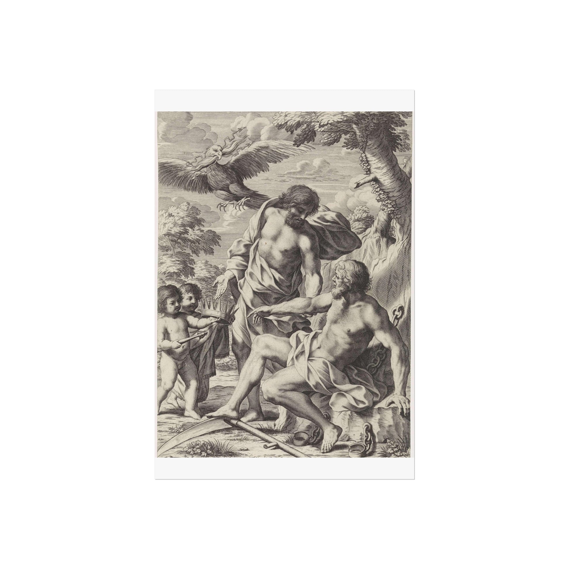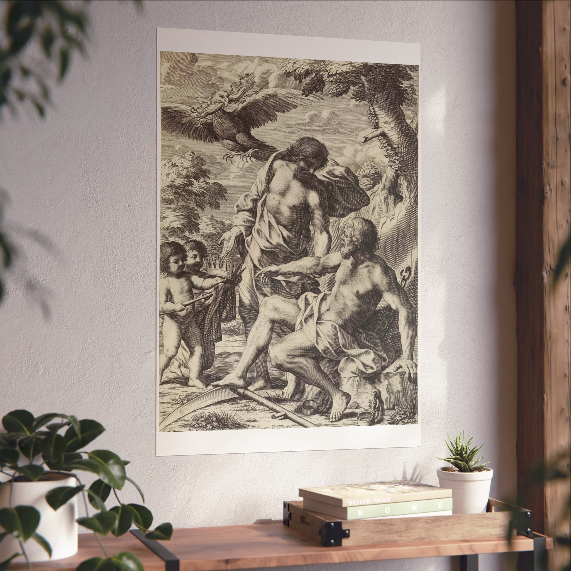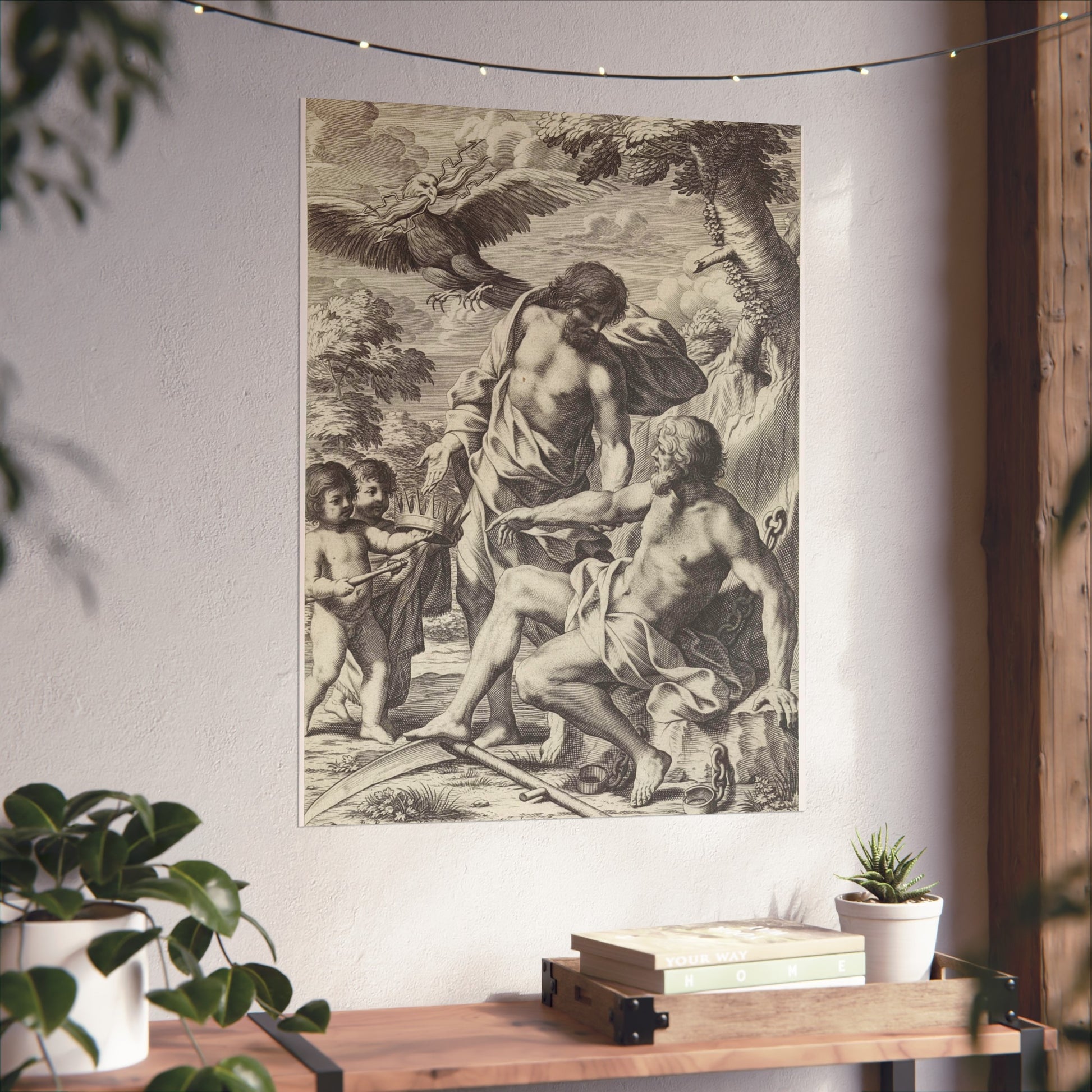 Saturn, his scythe beneath his feet, sits in front of a rock adorned with shackles. Beside him stands Jupiter, pointing out two cherubs offering Saturn a crown and scepter. Next to Jupiter, his attribute, an eagle clutching lightning bolts in its beak, soars. The bee on the scepter signifies the influential Roman Barbarini family and the papacy of Urban VIII, who hailed from this lineage.