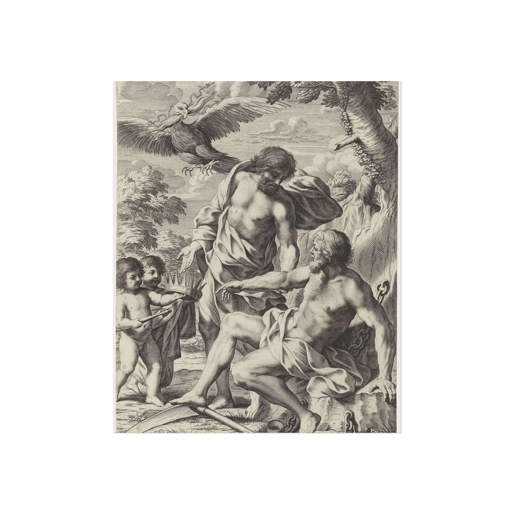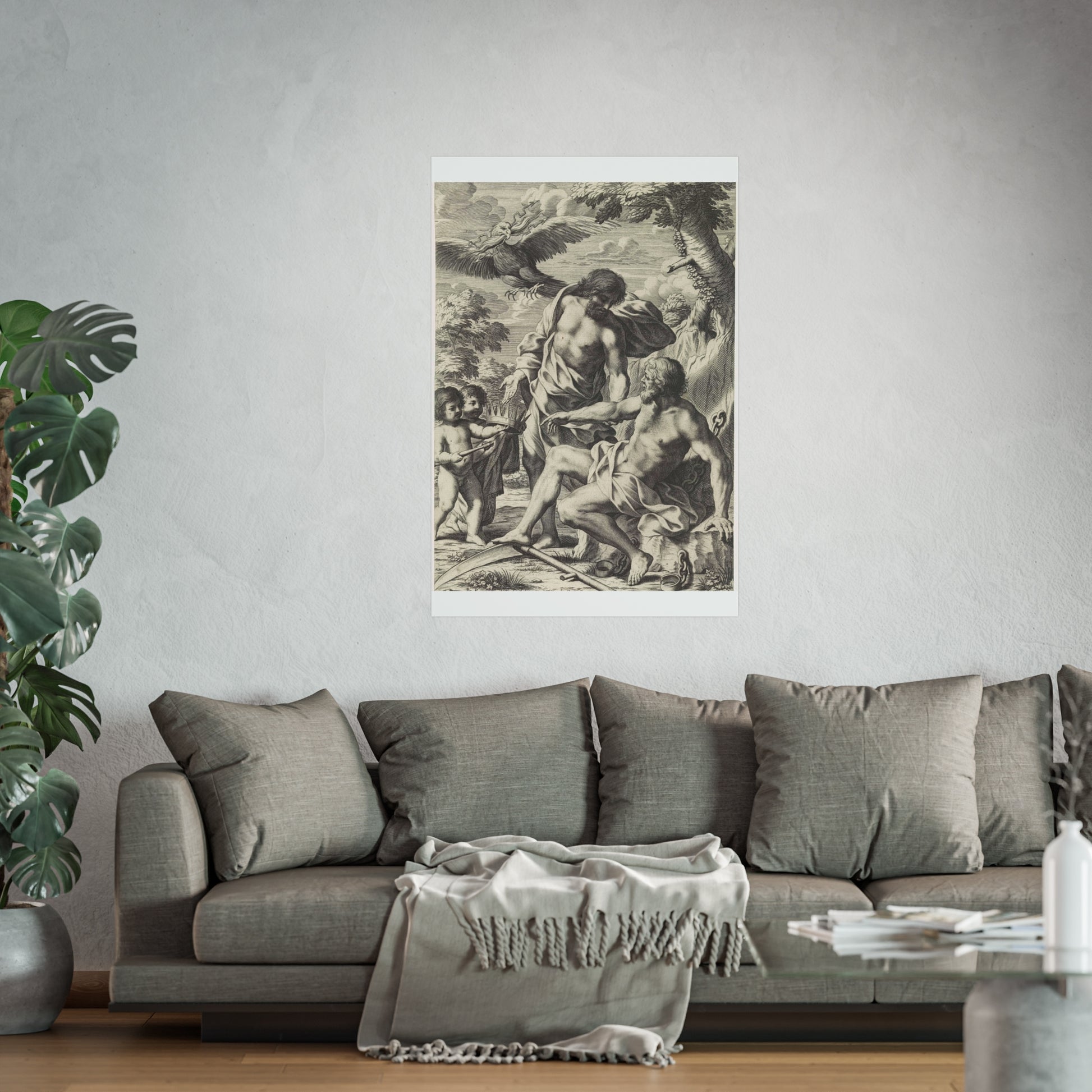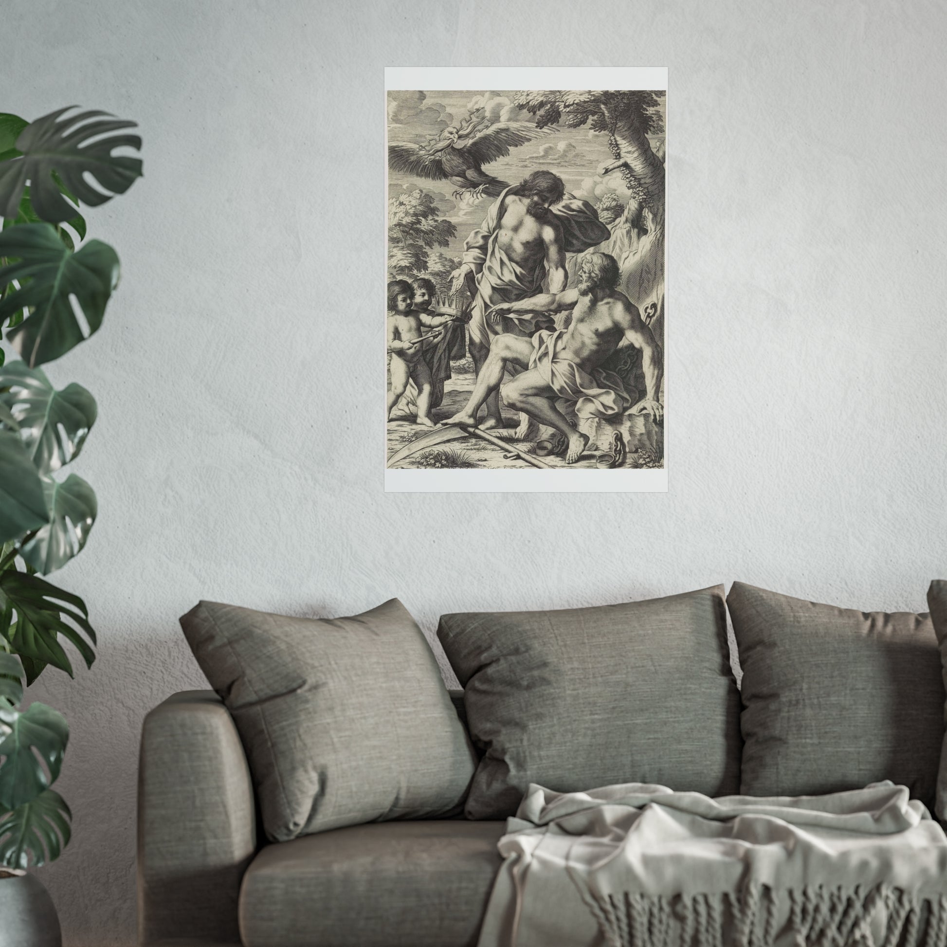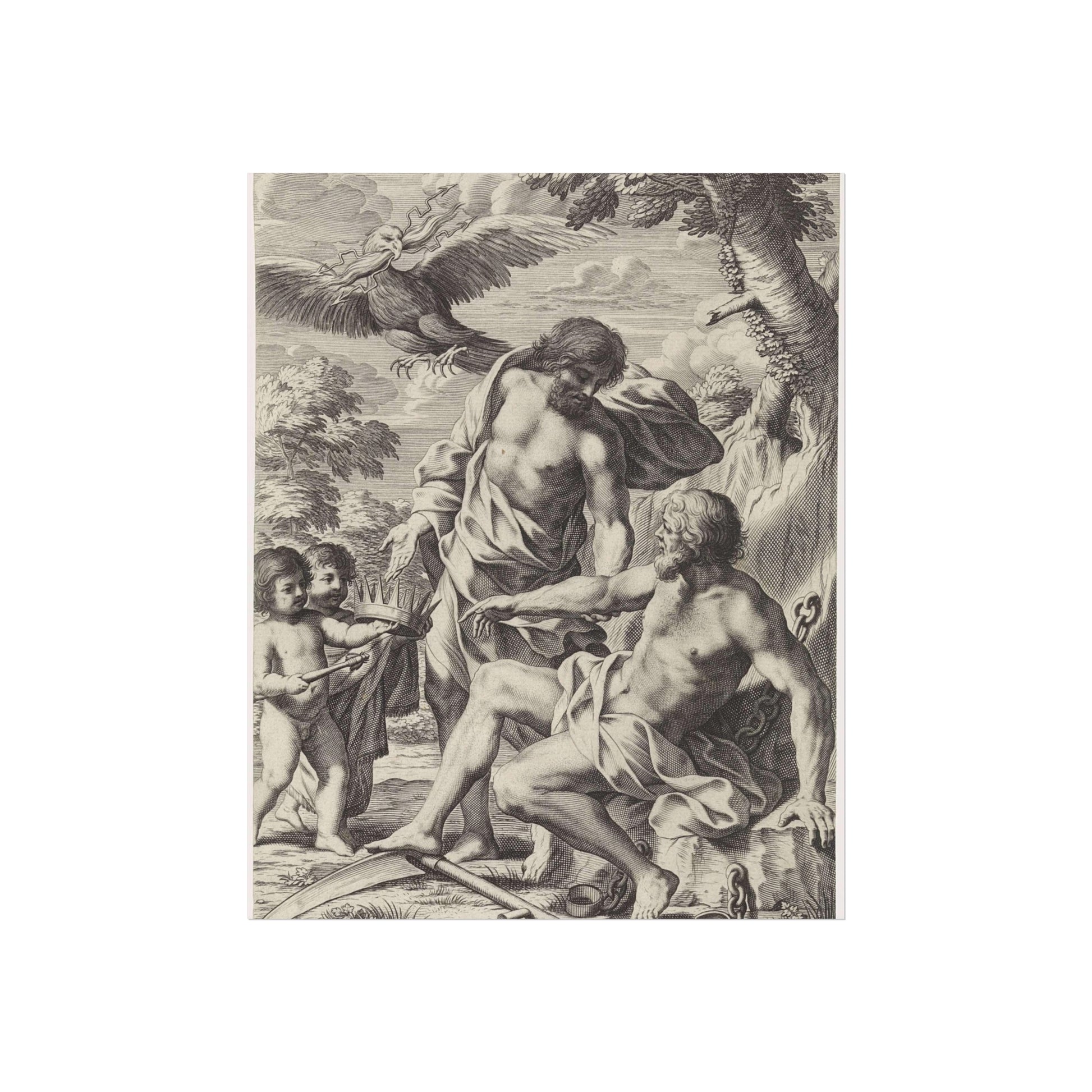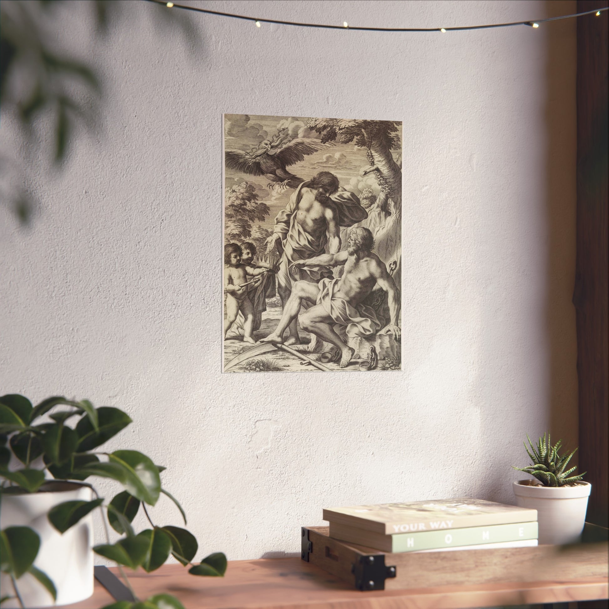Saturn, his scythe beneath his feet, sits in front of a rock adorned with shackles. Beside him stands Jupiter, pointing out two cherubs offering Saturn a crown and scepter. Next to Jupiter, his attribute, an eagle clutching lightning bolts in its beak, soars. The bee on the scepter signifies the influential Roman Barbarini family and the papacy of Urban VIII, who hailed from this lineage.