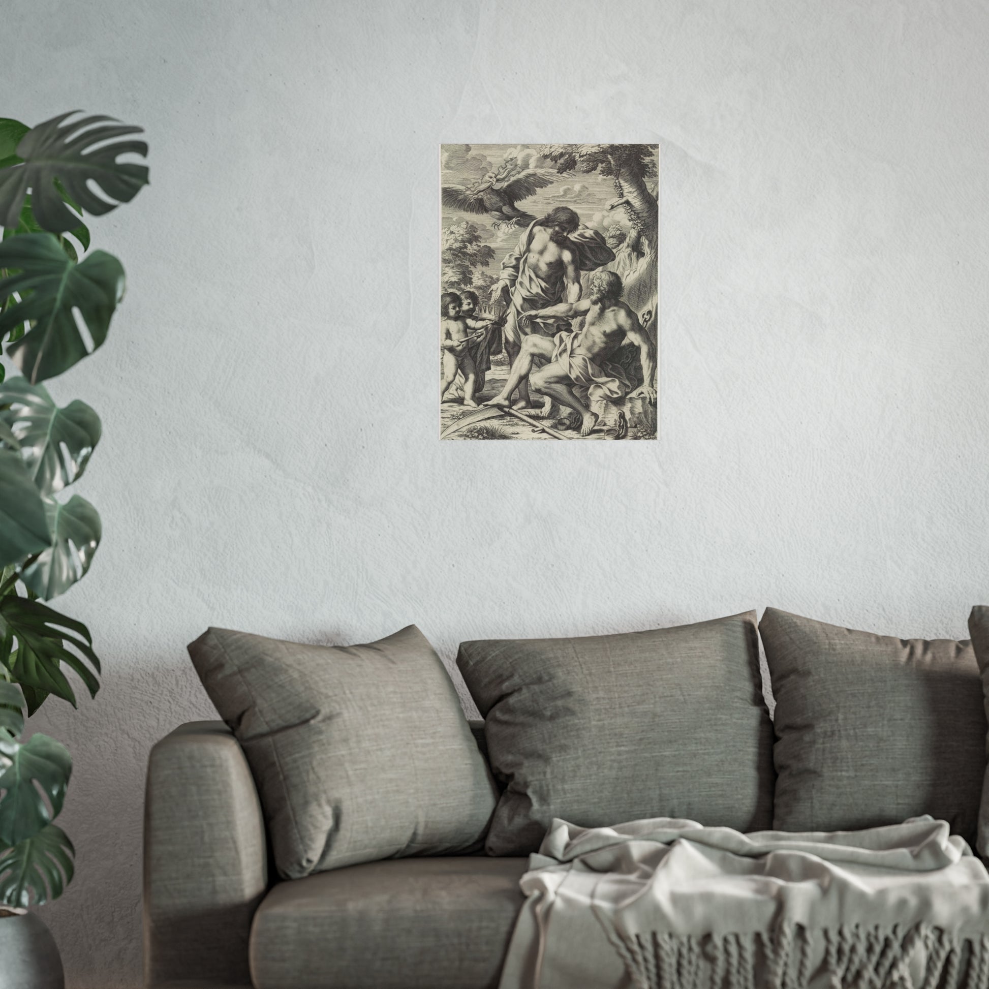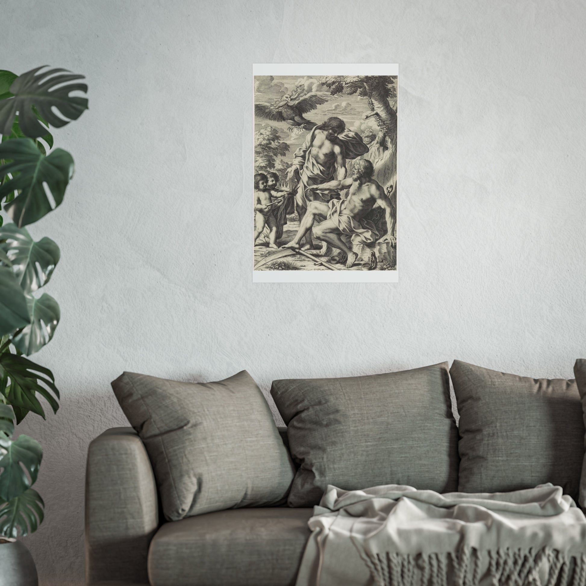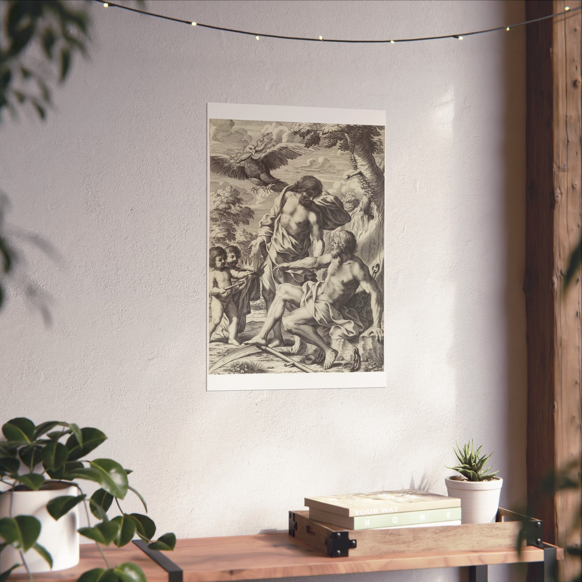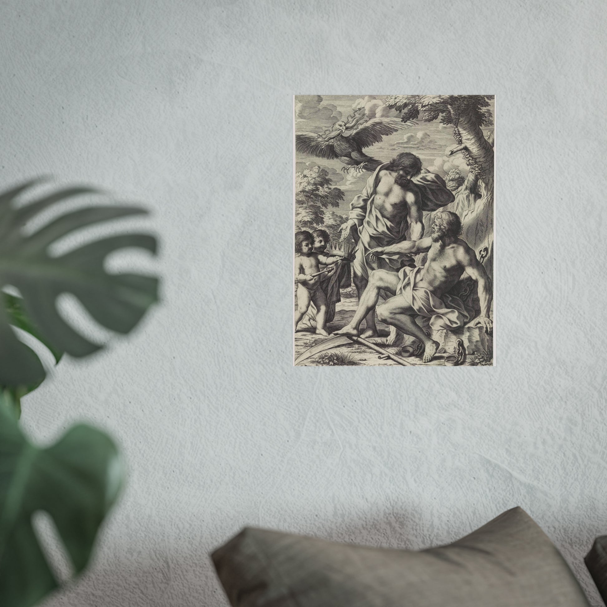 Saturn, his scythe beneath his feet, sits in front of a rock adorned with shackles. Beside him stands Jupiter, pointing out two cherubs offering Saturn a crown and scepter. Next to Jupiter, his attribute, an eagle clutching lightning bolts in its beak, soars. The bee on the scepter signifies the influential Roman Barbarini family and the papacy of Urban VIII, who hailed from this lineage.