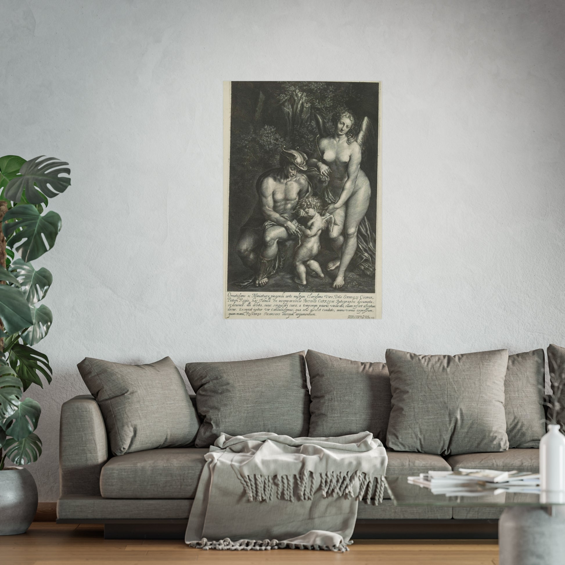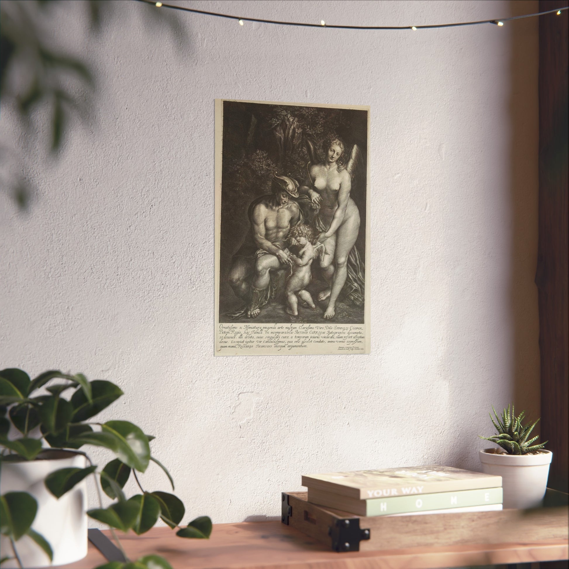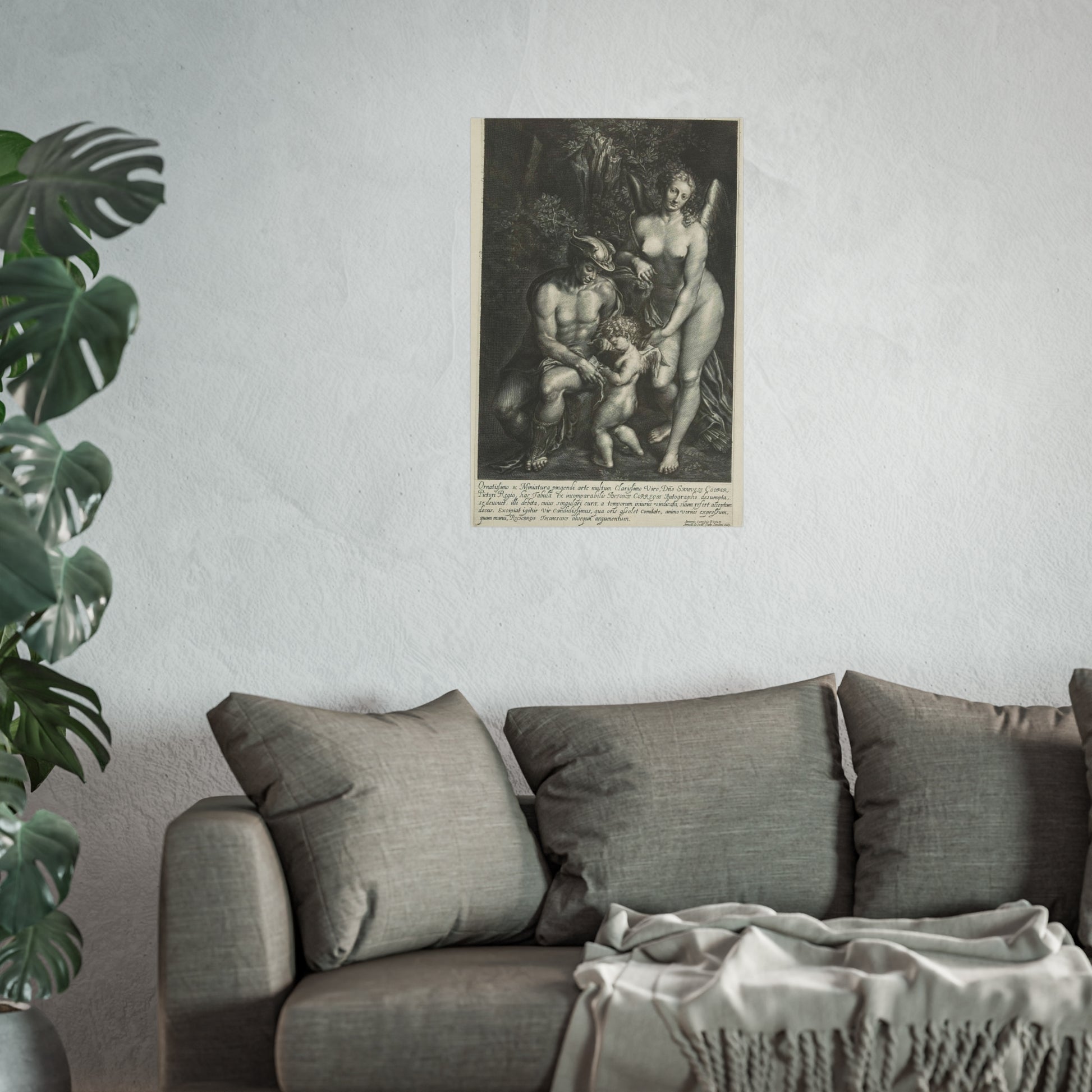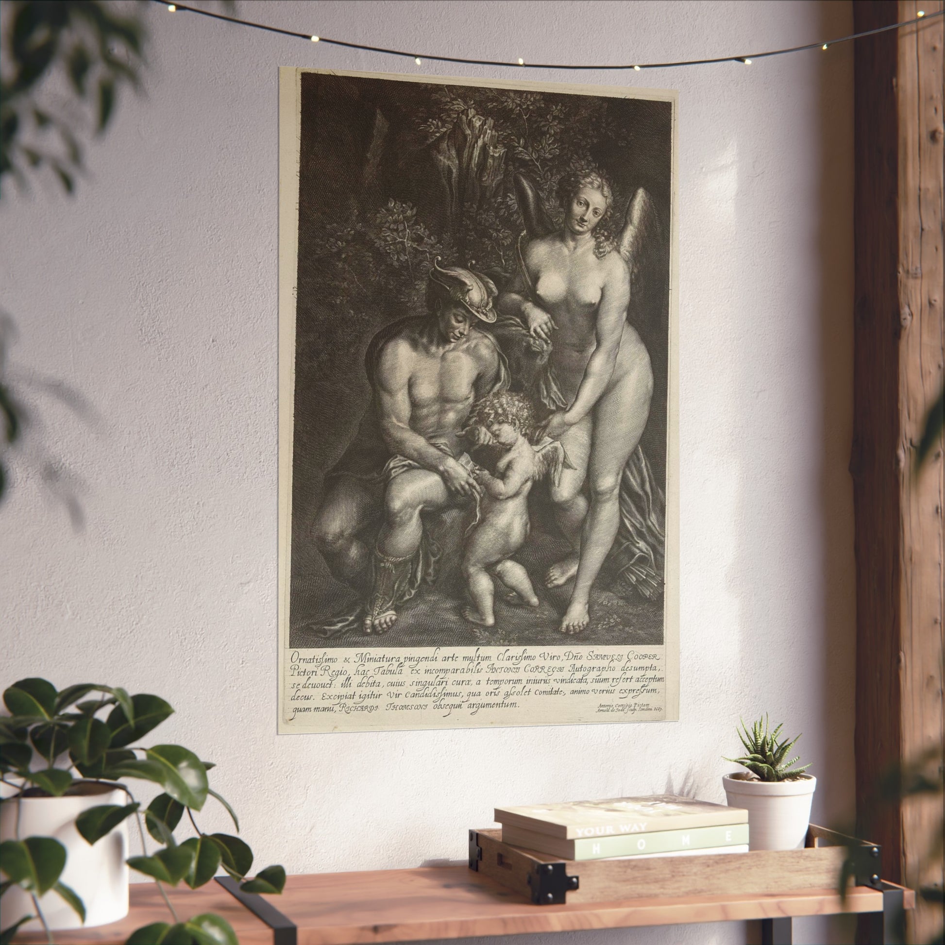In this captivating scene, Cupid, the god of love, stands between Mercury and Venus, engrossed in reading a piece of paper. The divine interaction creates an atmosphere of intrigue and fascination.