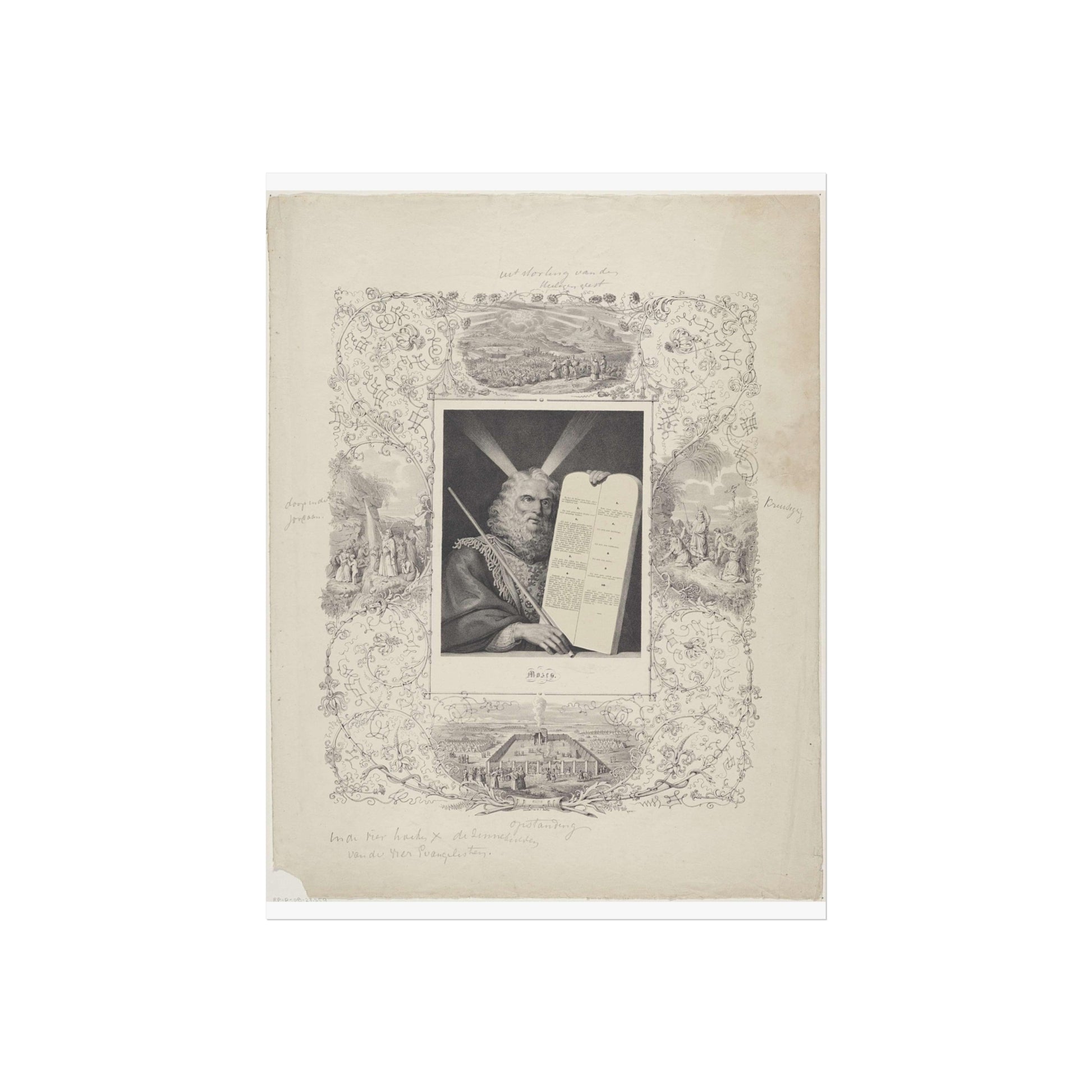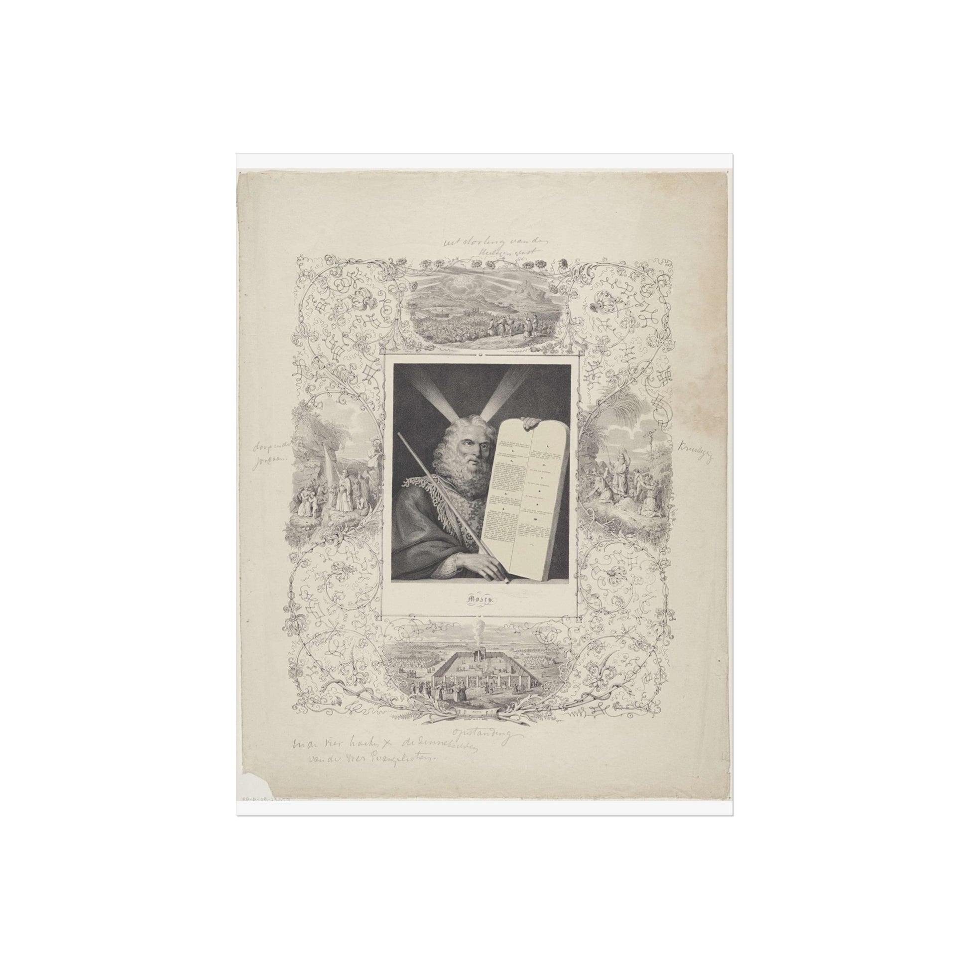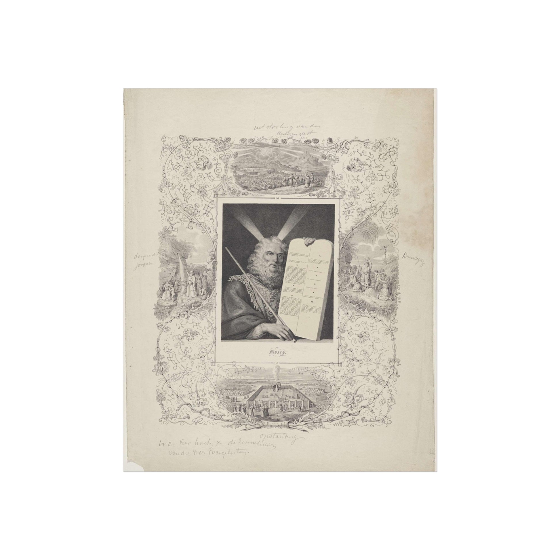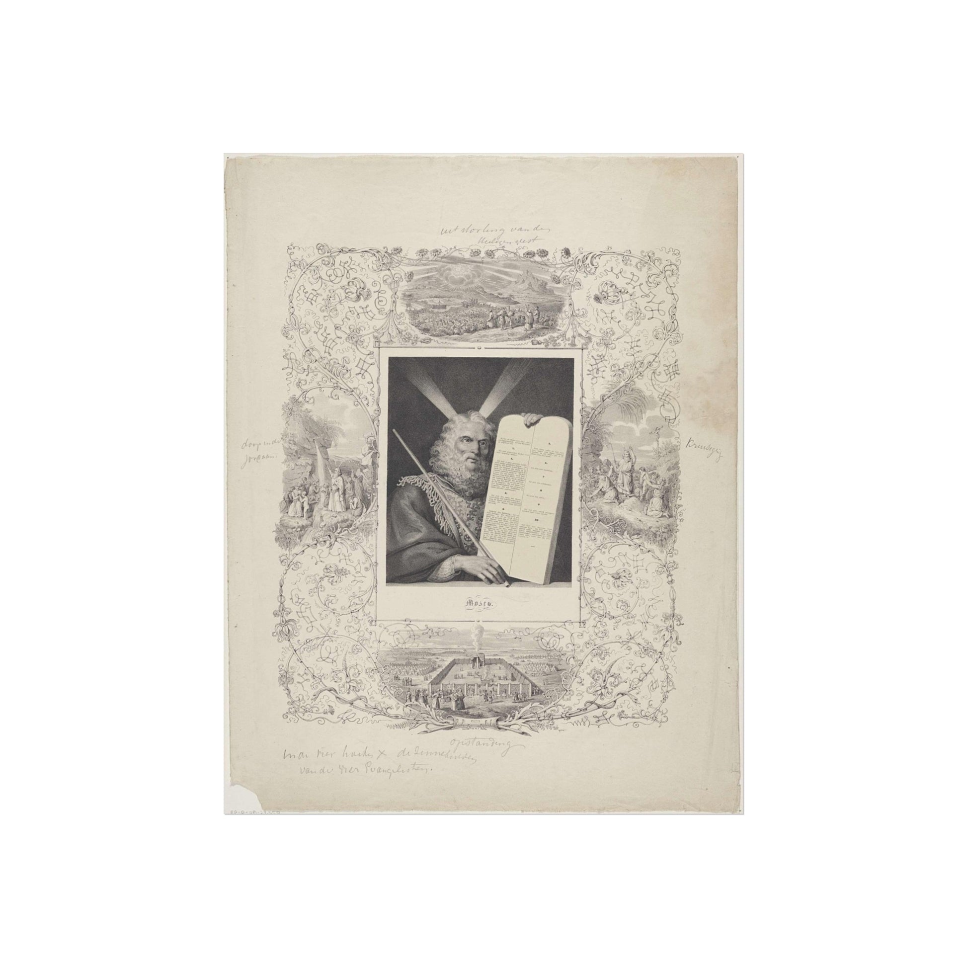 Moses is depicted holding a stone tablet inscribed with the Ten Commandments, using a pointer in his right hand. The portrait is surrounded by a decorative pattern of flowers and plants, within which four scenes are embedded. At the top, the people of Israel are receiving the Mosaic laws. To the right, we see Moses and the bronze serpent. In the center below, the tabernacle is depicted, and to the left, Moses is striking water from a rock.