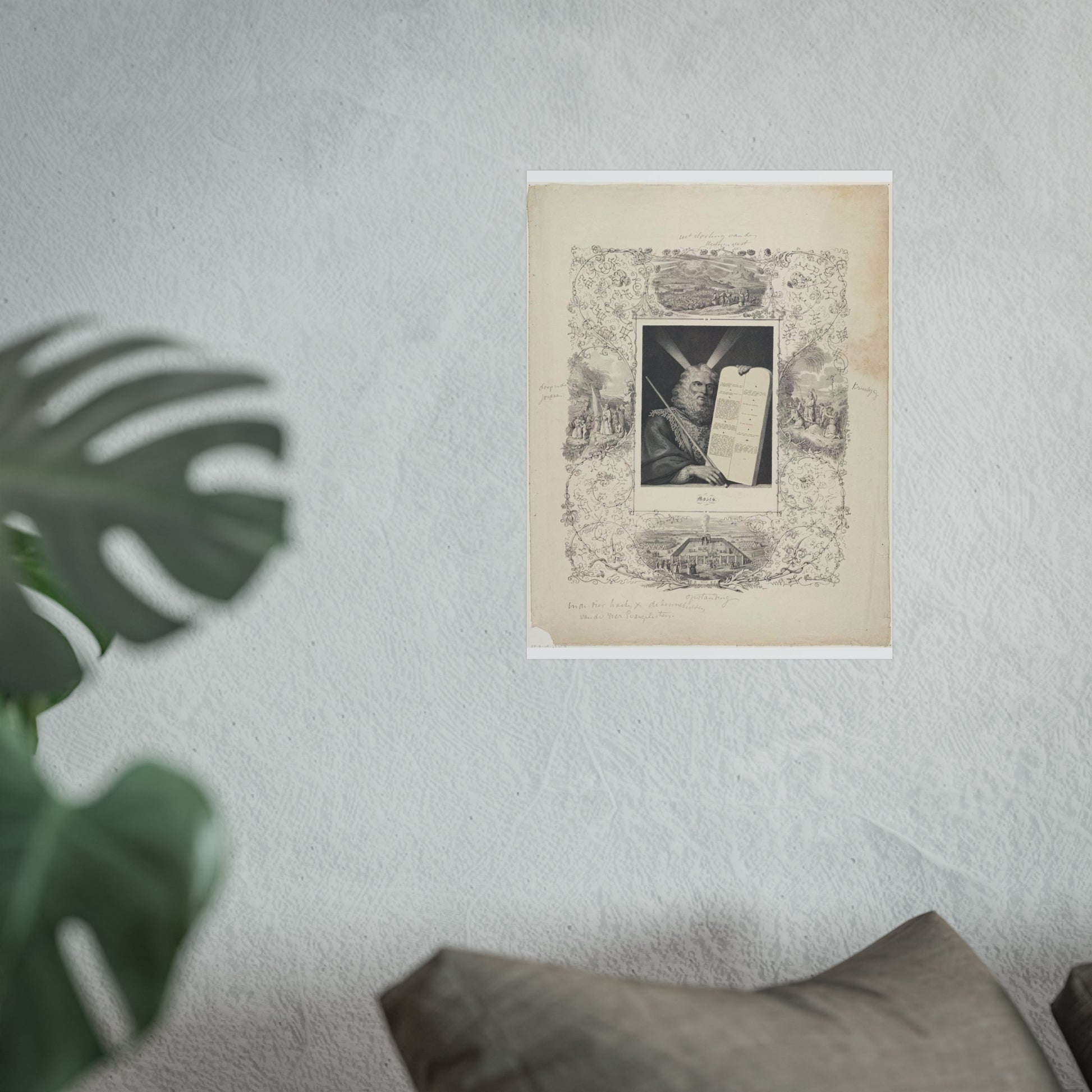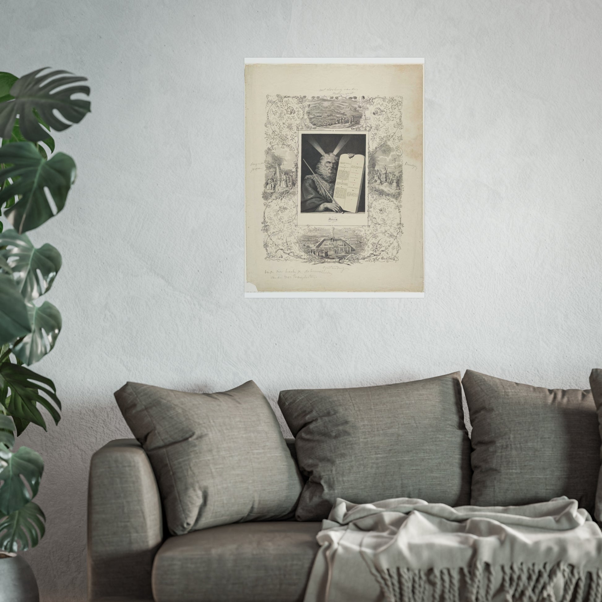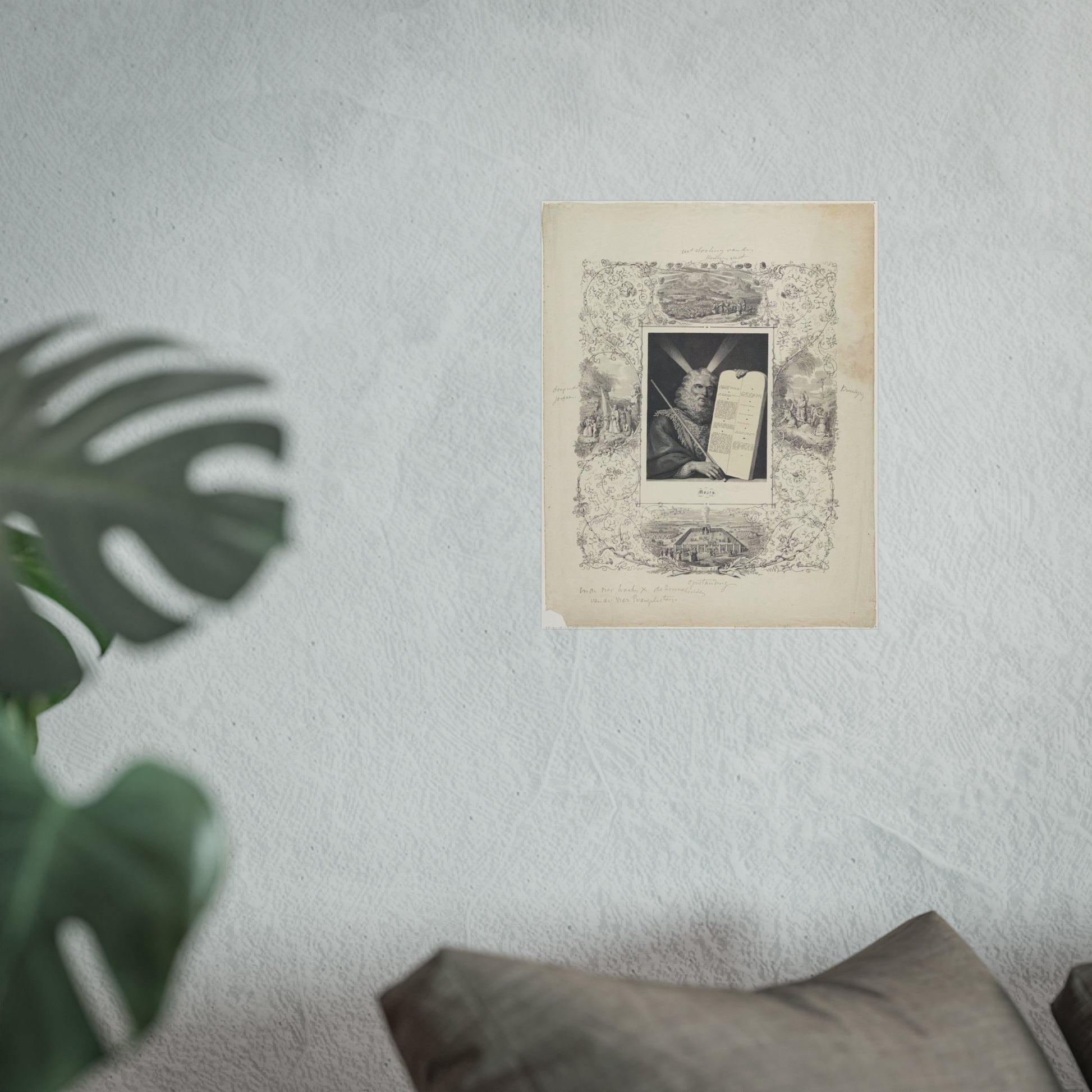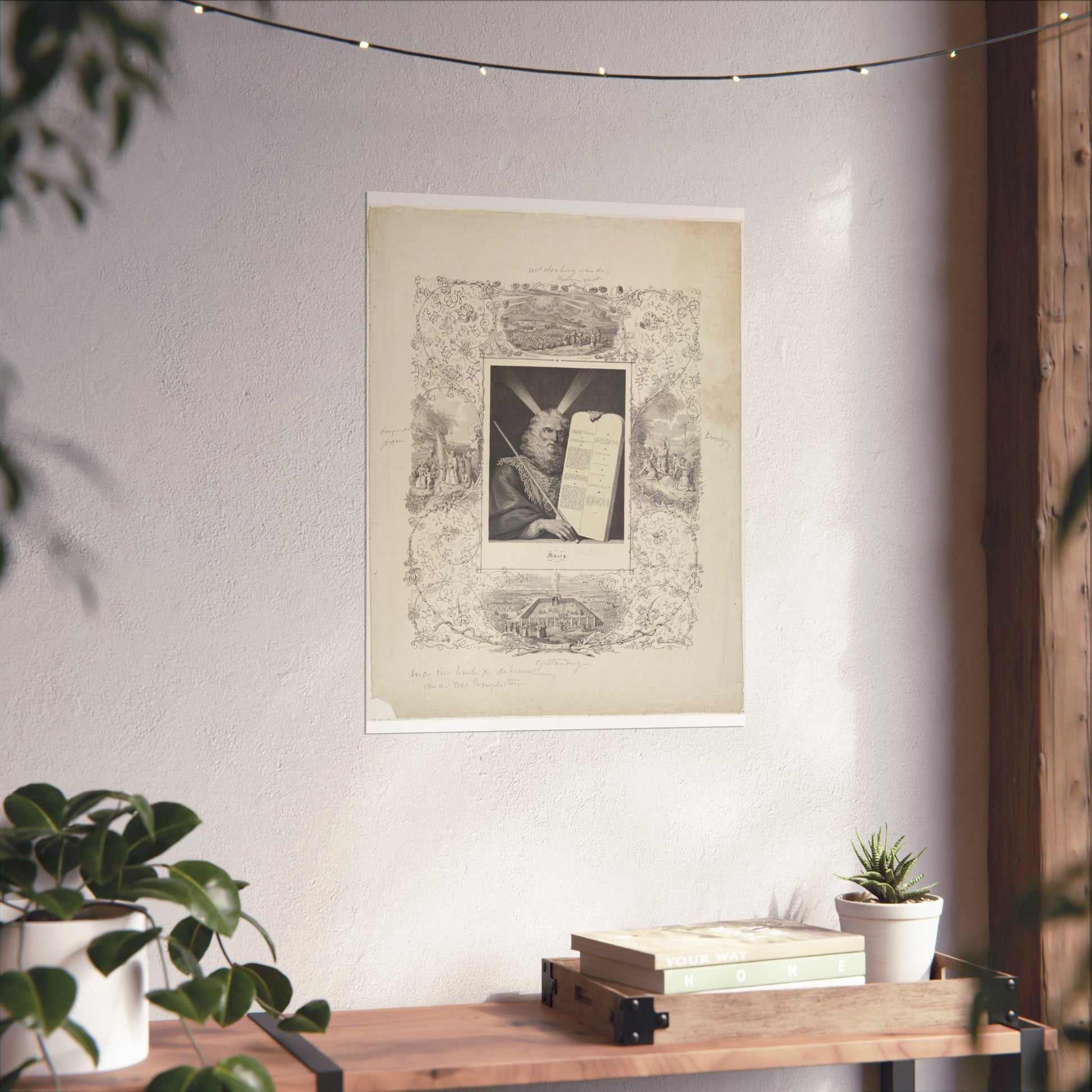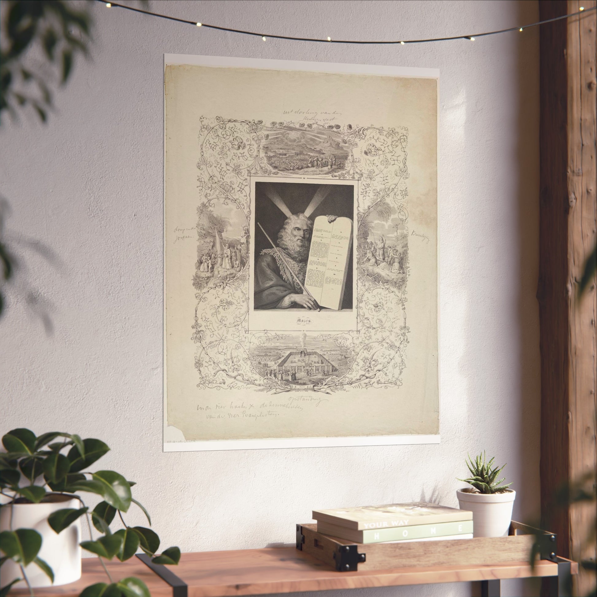 Moses is depicted holding a stone tablet inscribed with the Ten Commandments, using a pointer in his right hand. The portrait is surrounded by a decorative pattern of flowers and plants, within which four scenes are embedded. At the top, the people of Israel are receiving the Mosaic laws. To the right, we see Moses and the bronze serpent. In the center below, the tabernacle is depicted, and to the left, Moses is striking water from a rock.