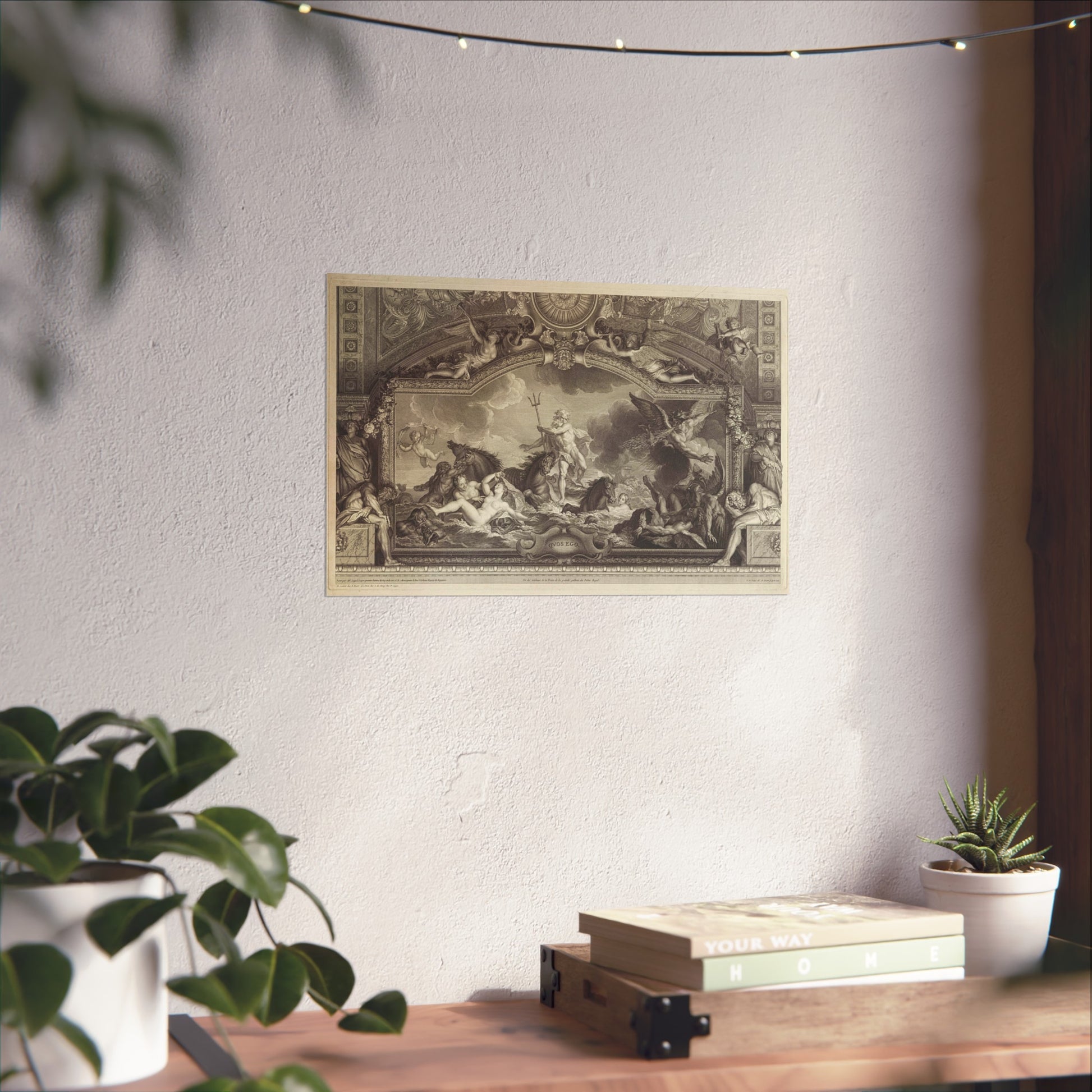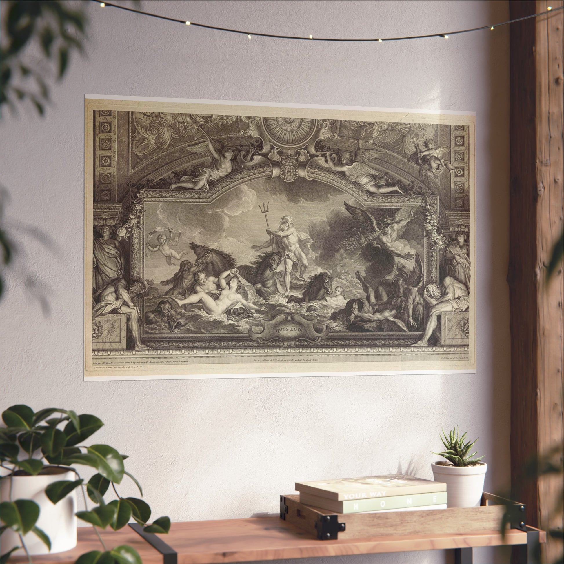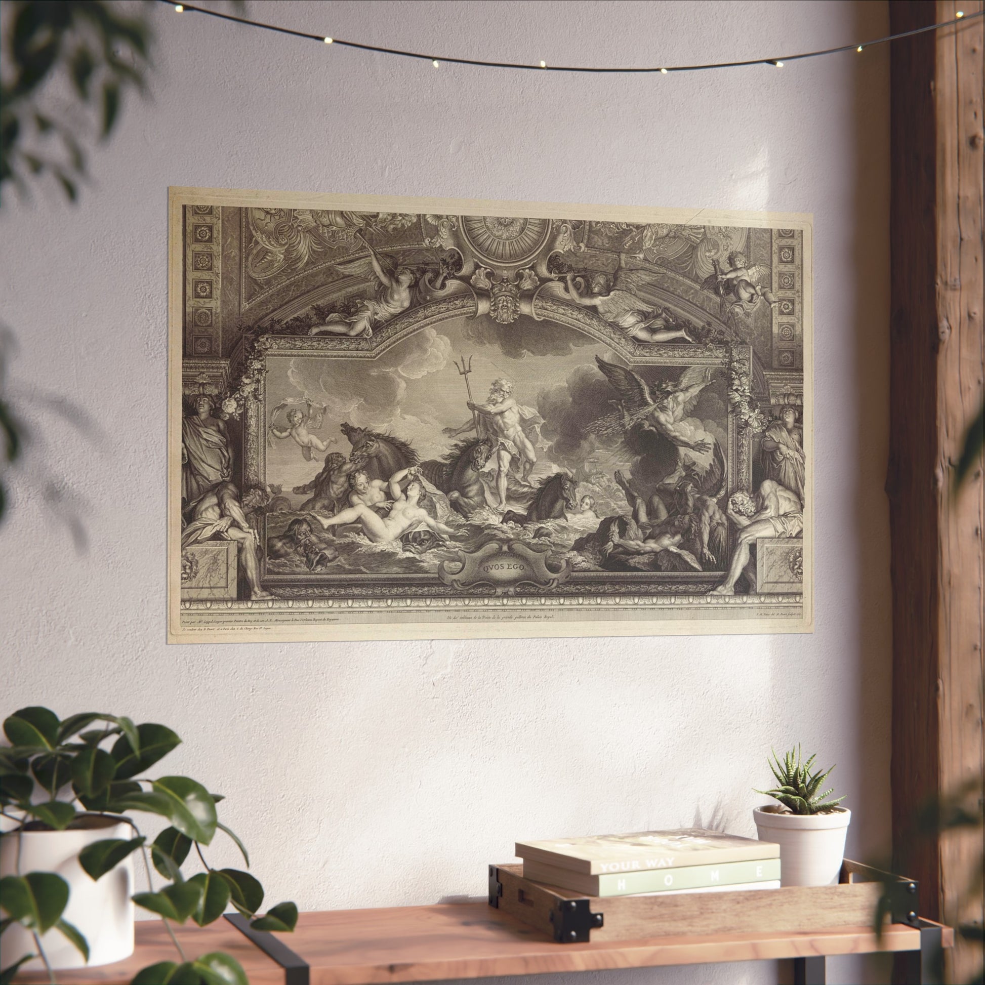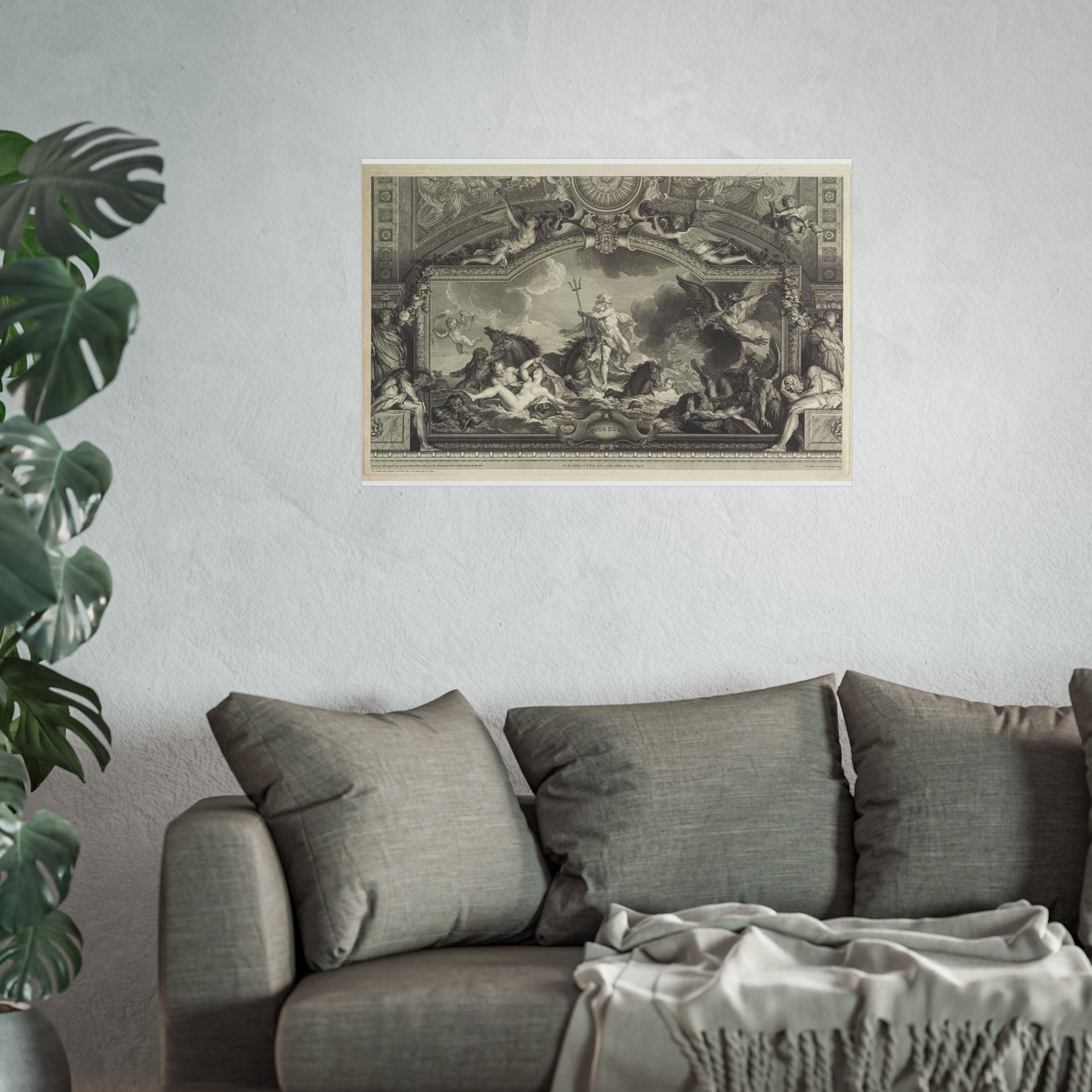 The painting depicts a wrathful Neptune, god of the sea, standing amidst tumultuous waves. He menacingly brandishes his trident at the winds, asserting his dominion over the sea. In the background, a Trojan ship succumbs to the sea's fury. The scene is framed by an ornate border, topped with two figures representing Fame. In the upper right corner, Cupid playfully scatters his arrows, adding an element of love and whimsy to this intense scenario.