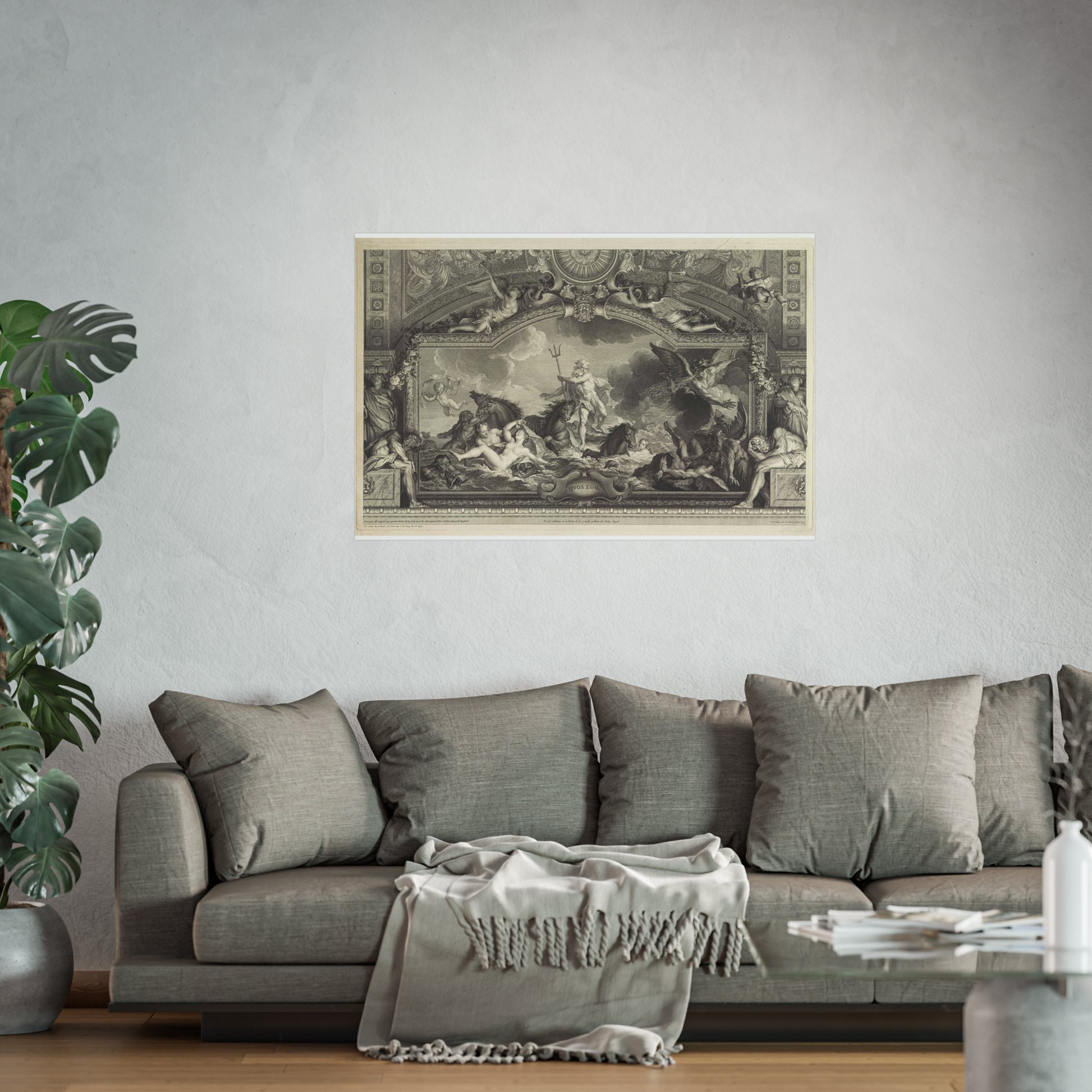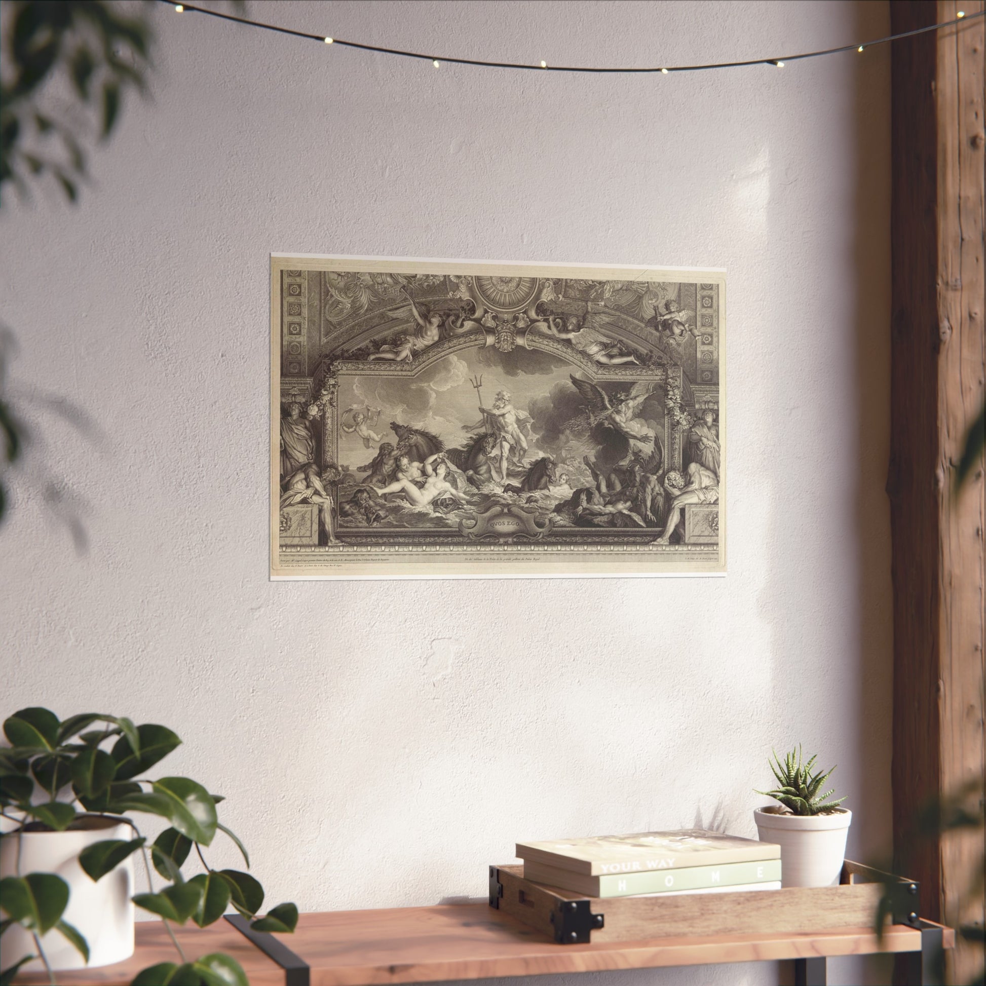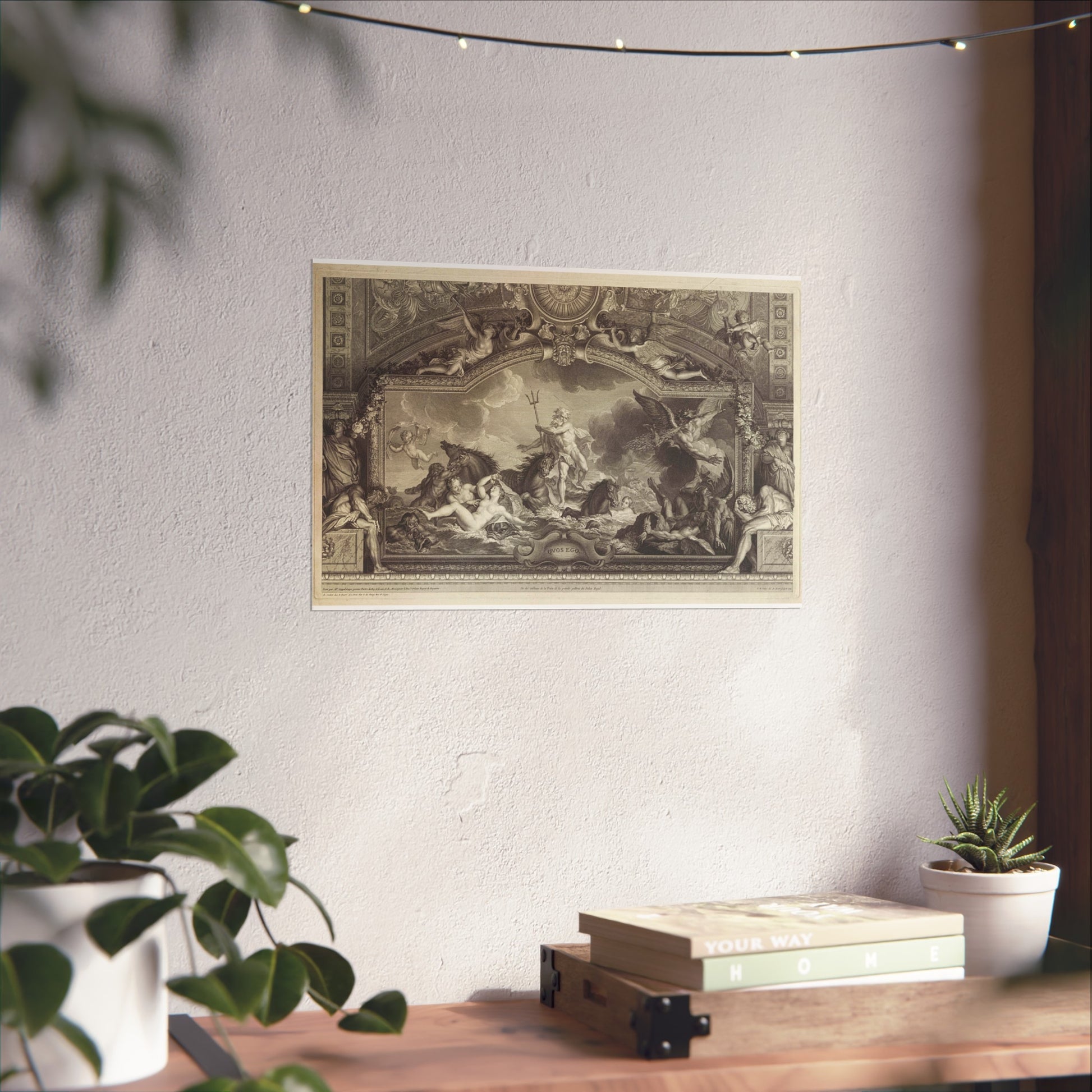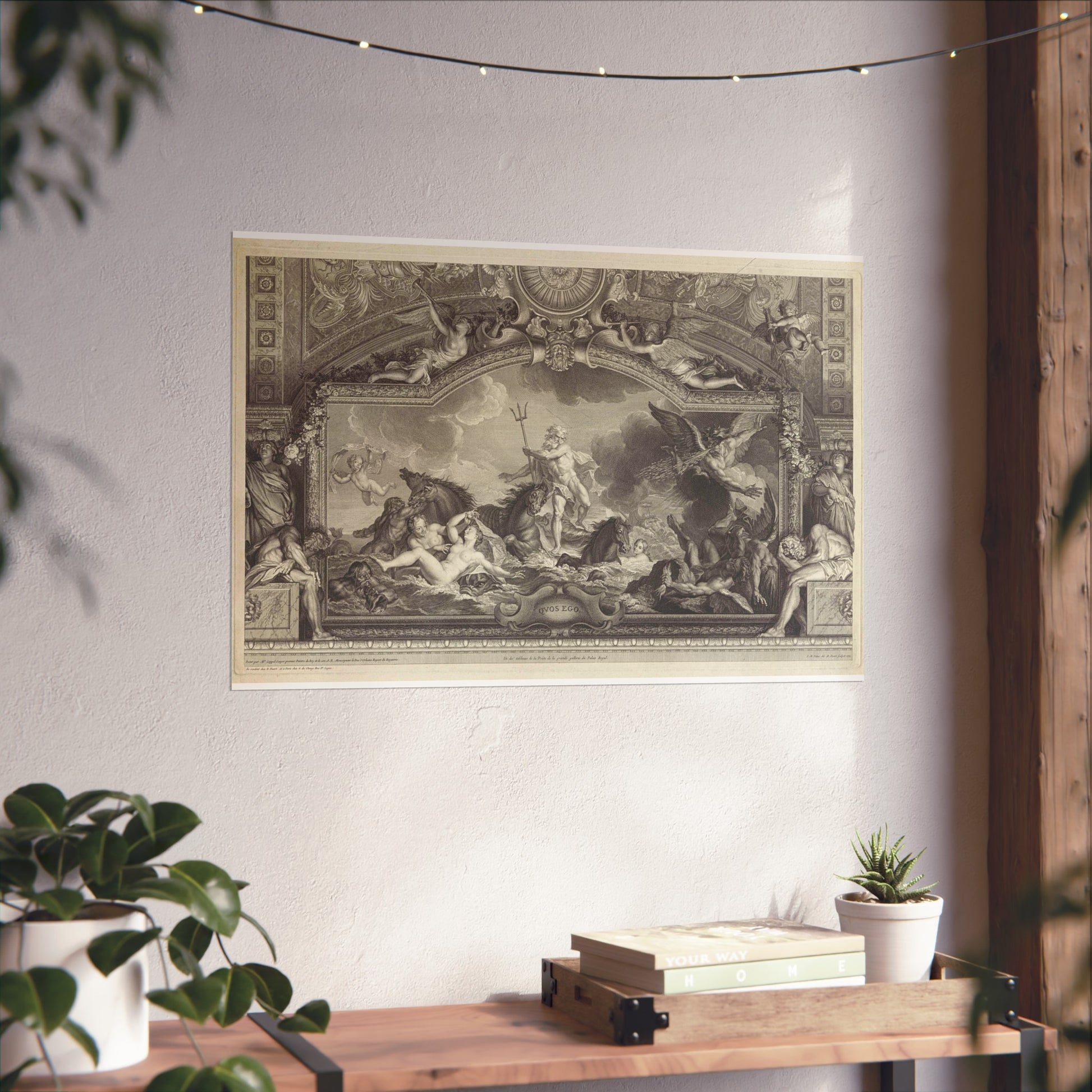The painting depicts a wrathful Neptune, god of the sea, standing amidst tumultuous waves. He menacingly brandishes his trident at the winds, asserting his dominion over the sea. In the background, a Trojan ship succumbs to the sea's fury. The scene is framed by an ornate border, topped with two figures representing Fame. In the upper right corner, Cupid playfully scatters his arrows, adding an element of love and whimsy to this intense scenario.