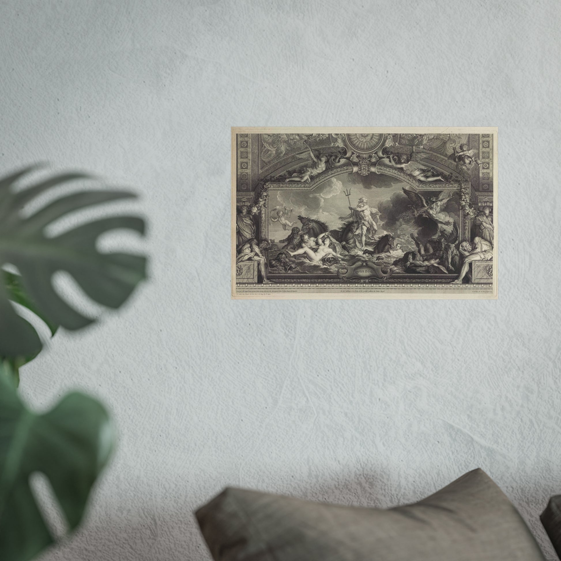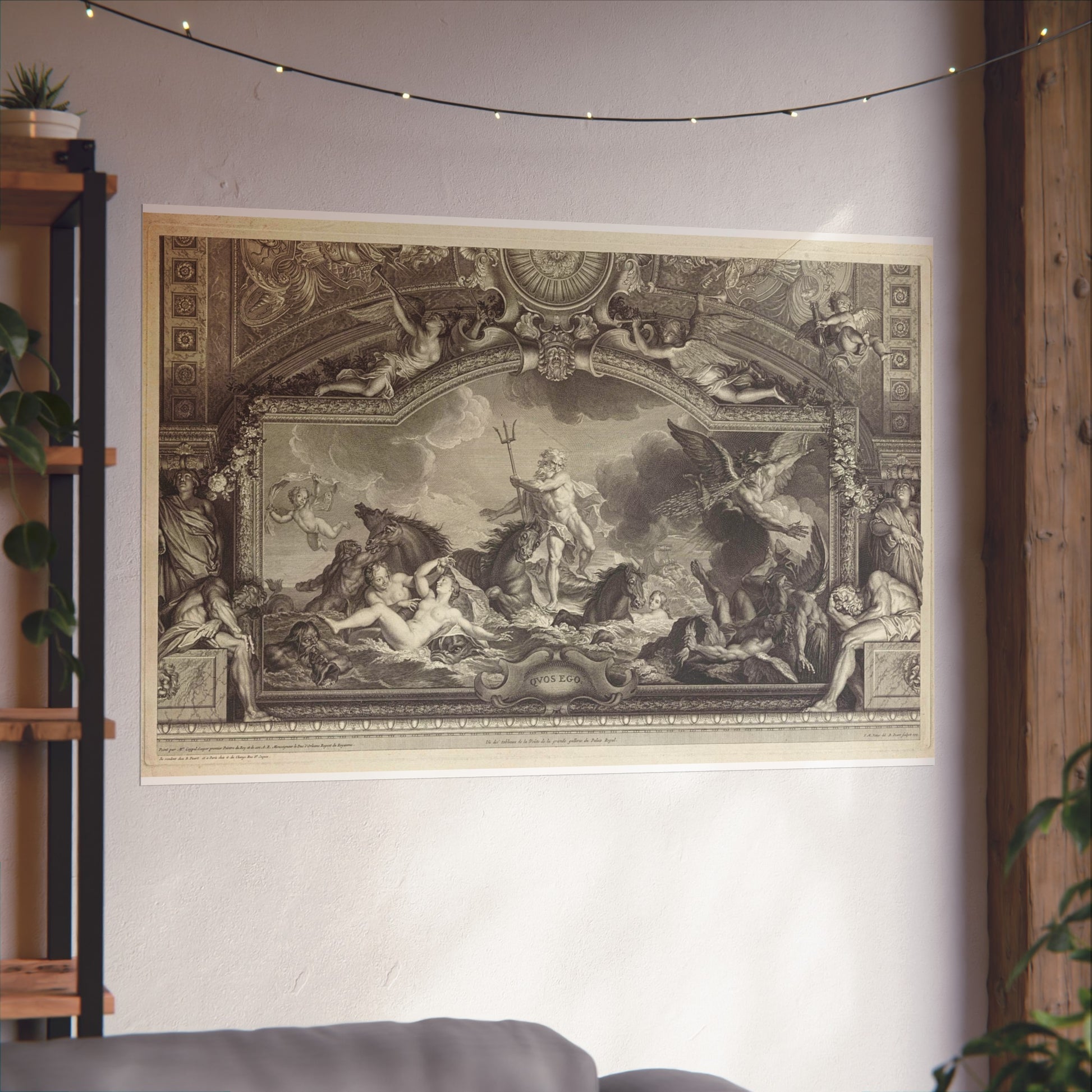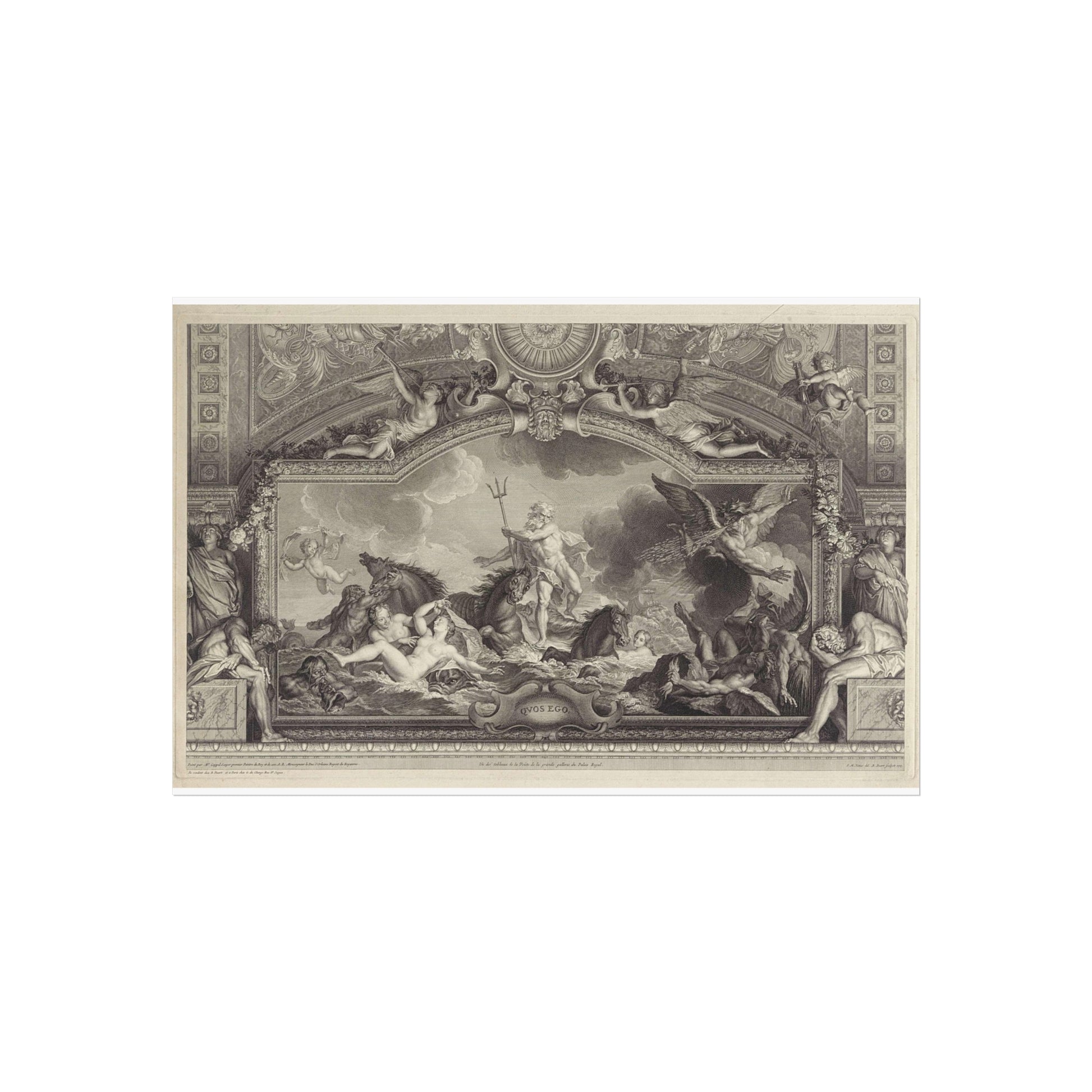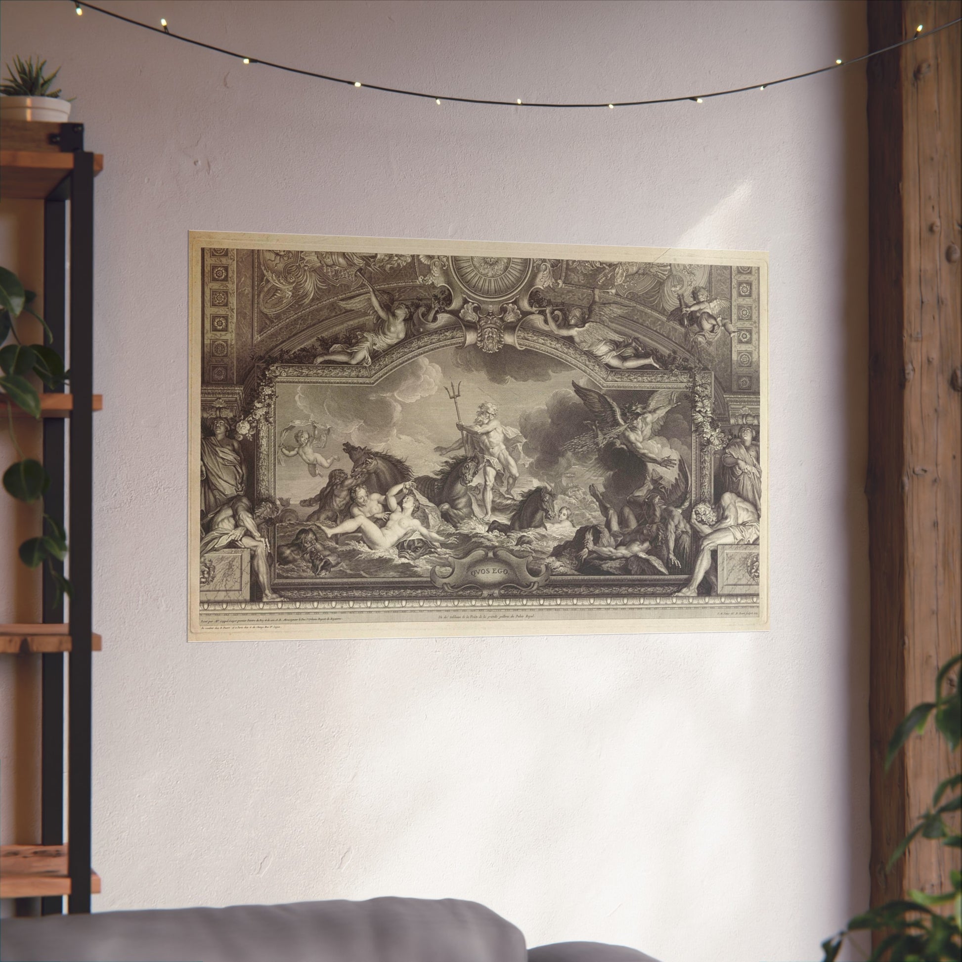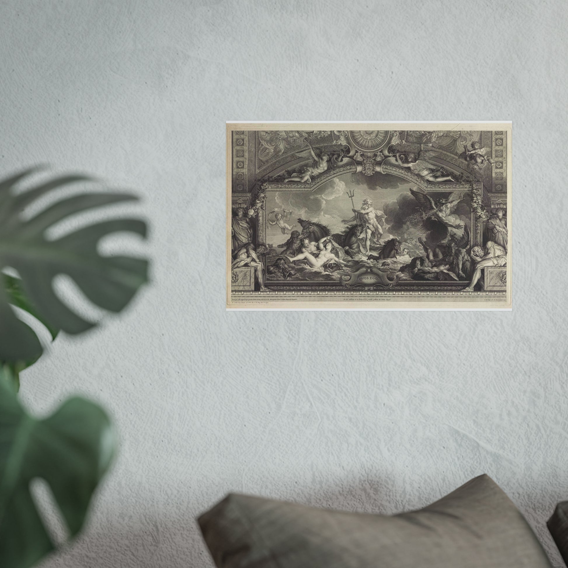 The painting depicts a wrathful Neptune, god of the sea, standing amidst tumultuous waves. He menacingly brandishes his trident at the winds, asserting his dominion over the sea. In the background, a Trojan ship succumbs to the sea's fury. The scene is framed by an ornate border, topped with two figures representing Fame. In the upper right corner, Cupid playfully scatters his arrows, adding an element of love and whimsy to this intense scenario.