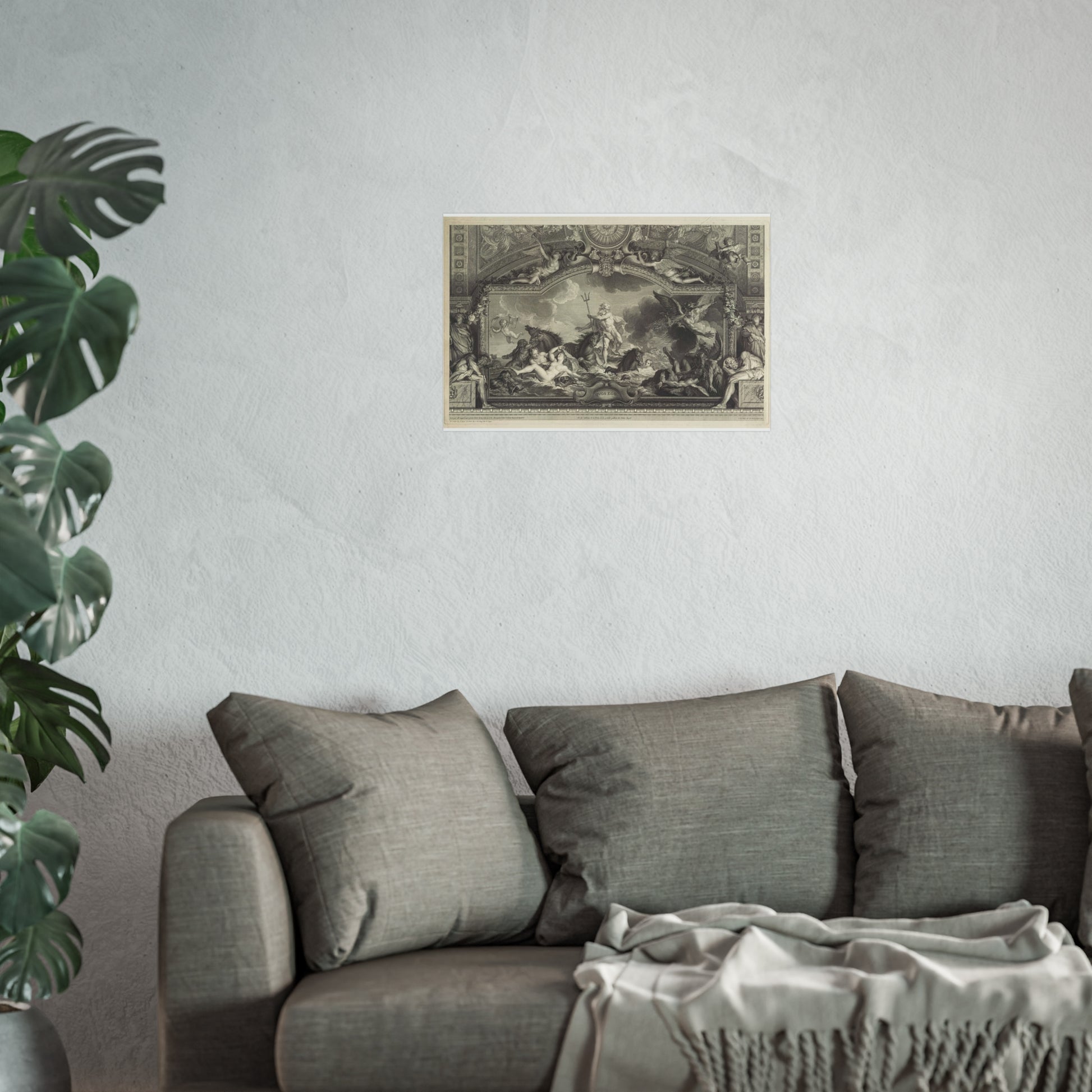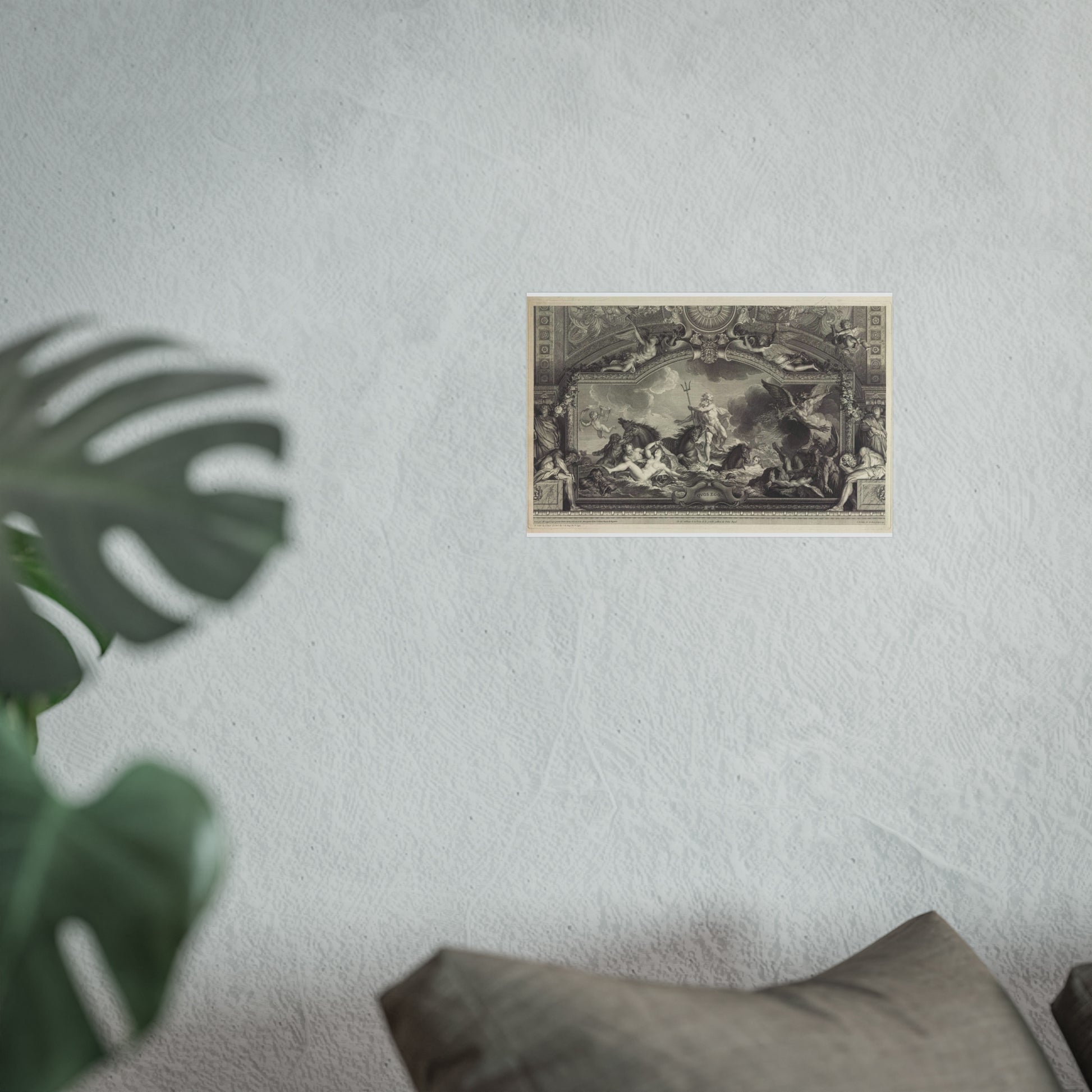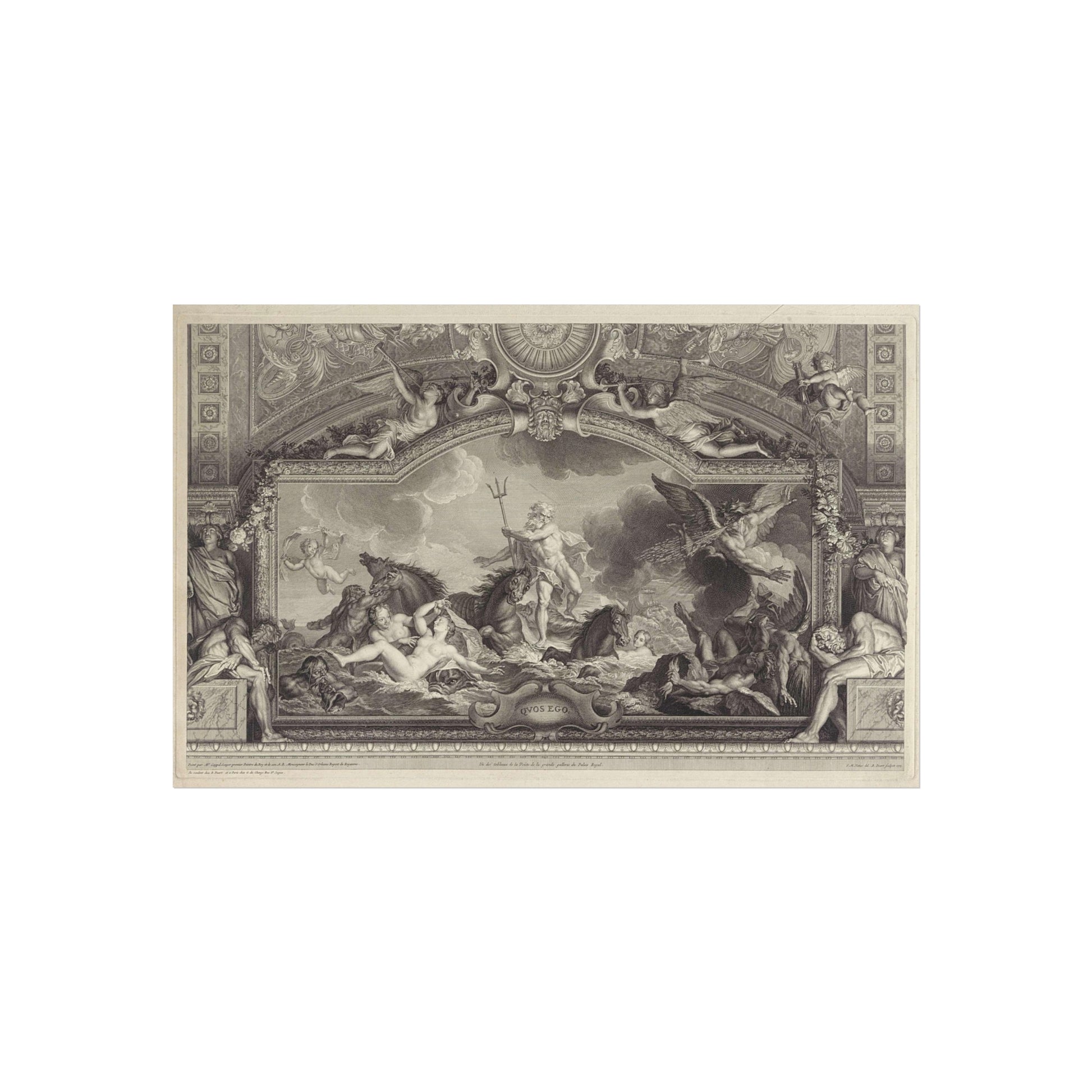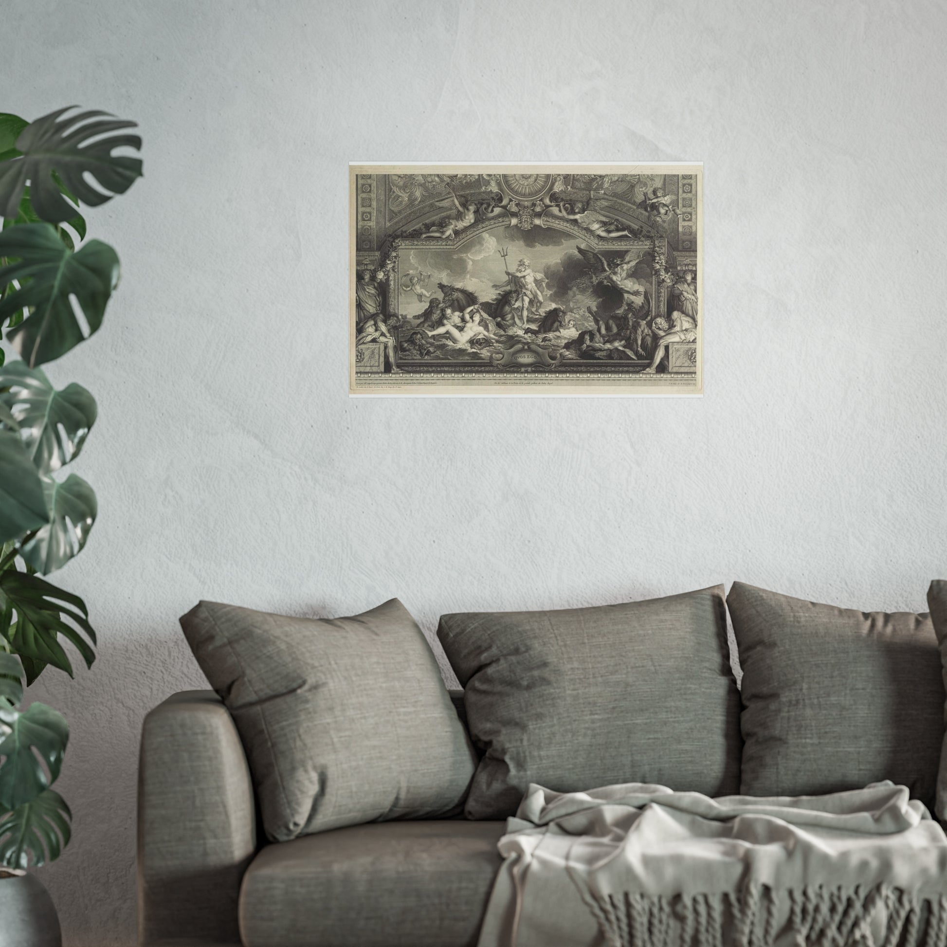 The painting depicts a wrathful Neptune, god of the sea, standing amidst tumultuous waves. He menacingly brandishes his trident at the winds, asserting his dominion over the sea. In the background, a Trojan ship succumbs to the sea's fury. The scene is framed by an ornate border, topped with two figures representing Fame. In the upper right corner, Cupid playfully scatters his arrows, adding an element of love and whimsy to this intense scenario.
