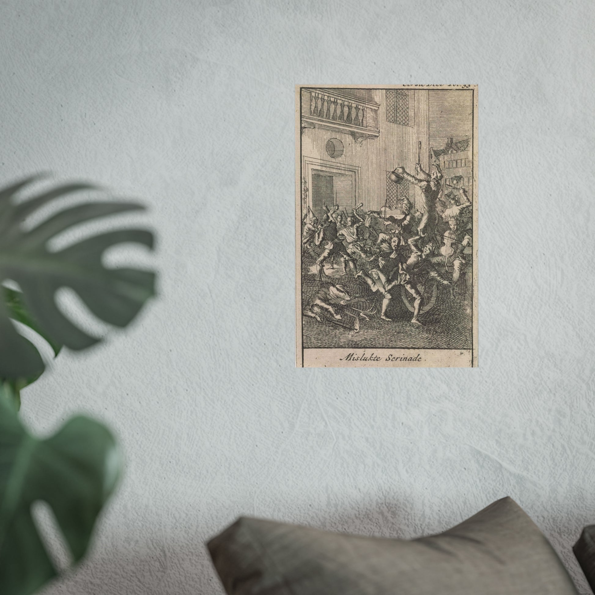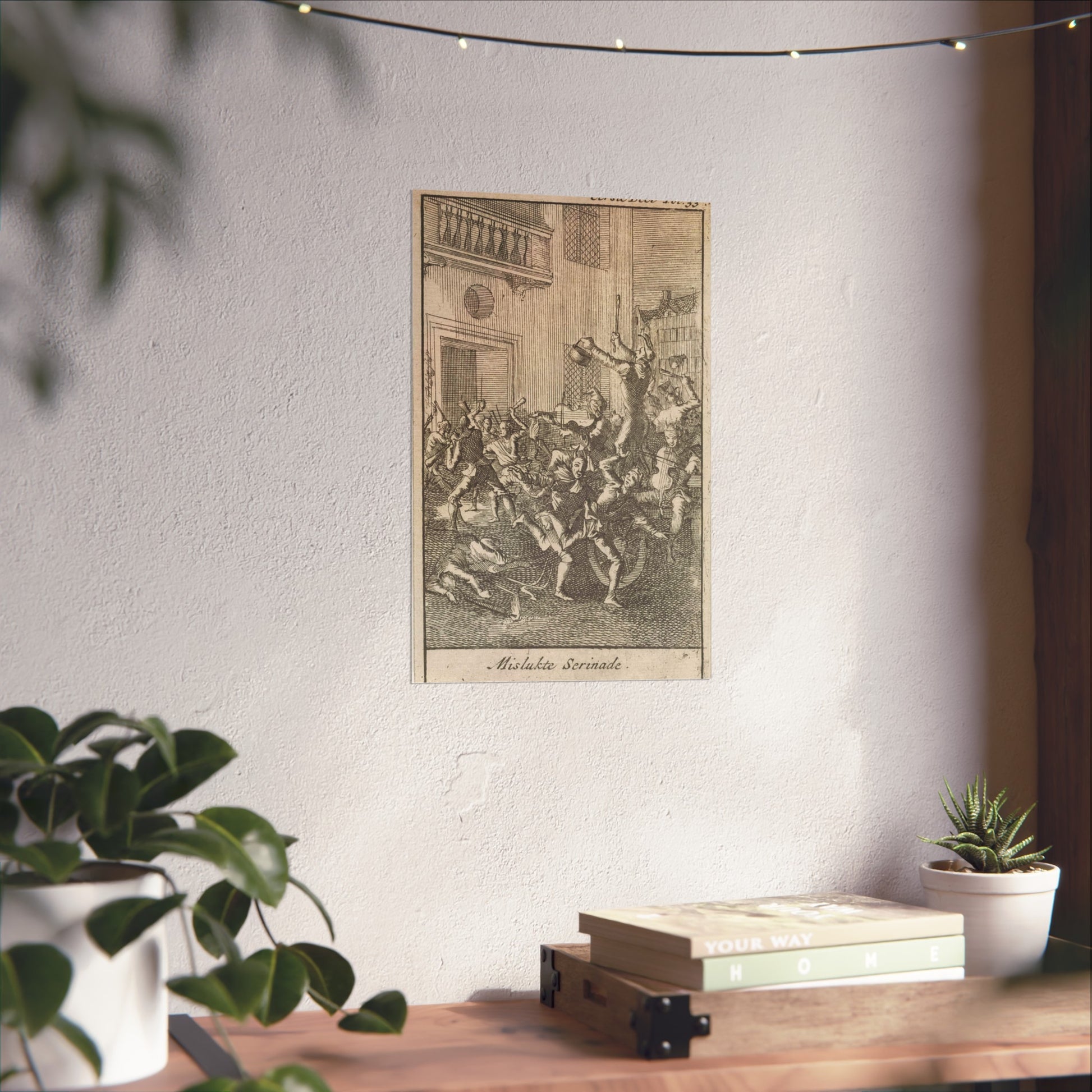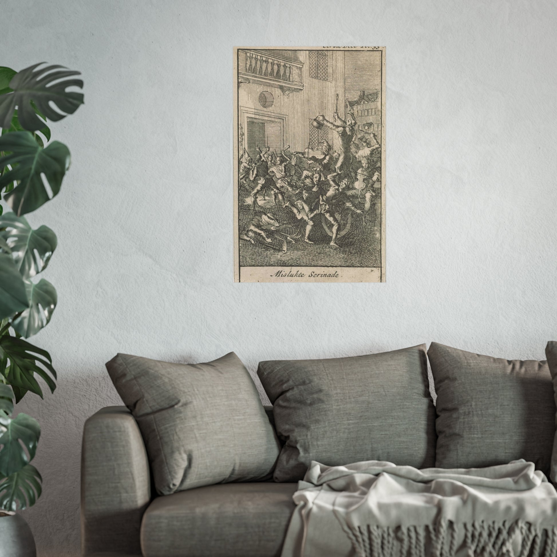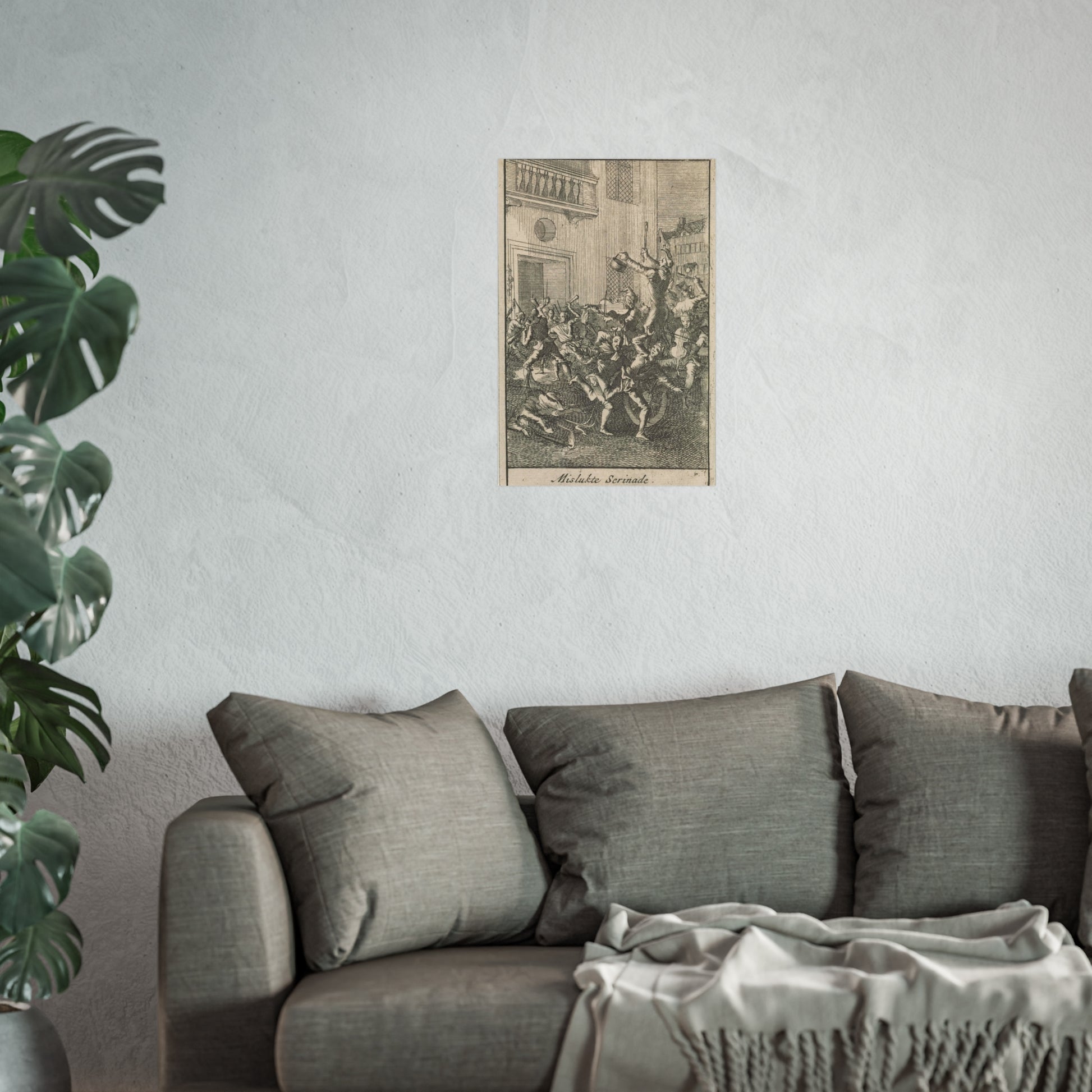 In the foreground, two masked figures are seen fleeing a skirmish. Behind them, a cart filled with musicians dressed as devils and jesters creates a cacophony of sound. These musicians are serenading Faustina, in this captivating scene from Francisco de Quevedo's 'The Night Runner'.