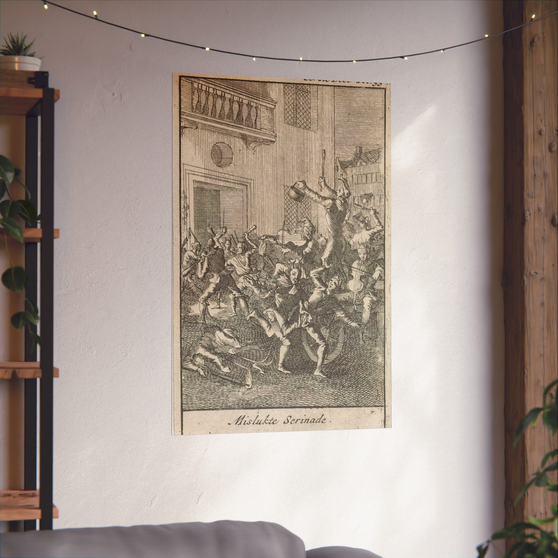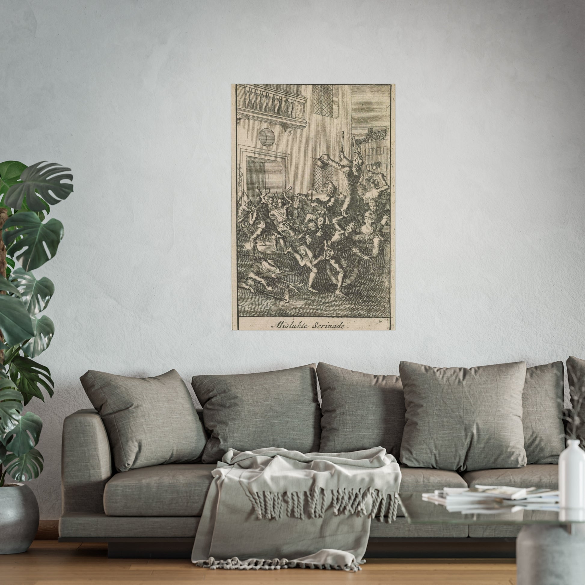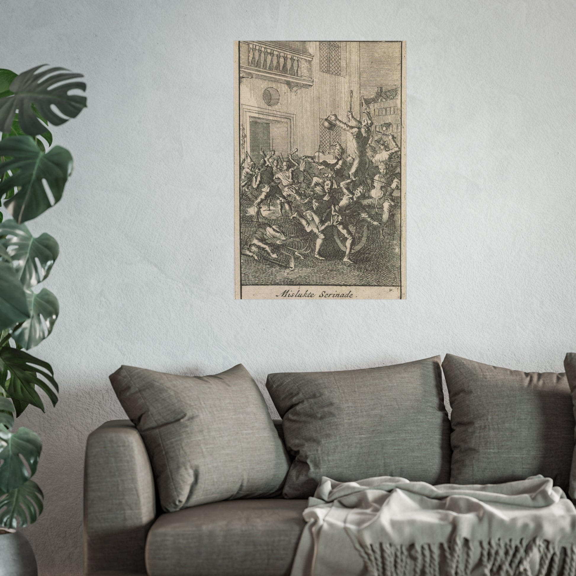 In the foreground, two masked figures are seen fleeing a skirmish. Behind them, a cart filled with musicians dressed as devils and jesters creates a cacophony of sound. These musicians are serenading Faustina, in this captivating scene from Francisco de Quevedo's 'The Night Runner'.