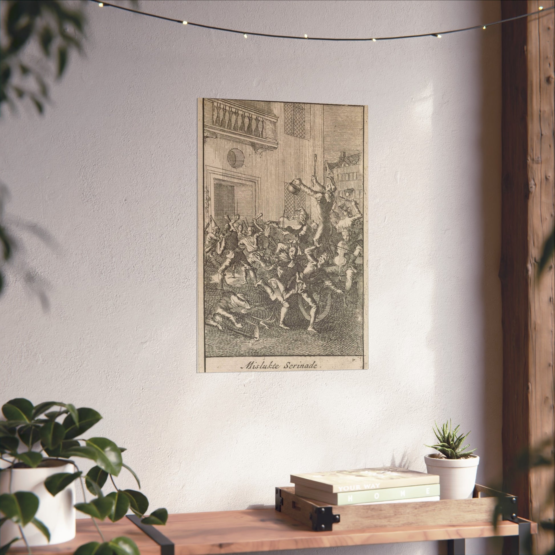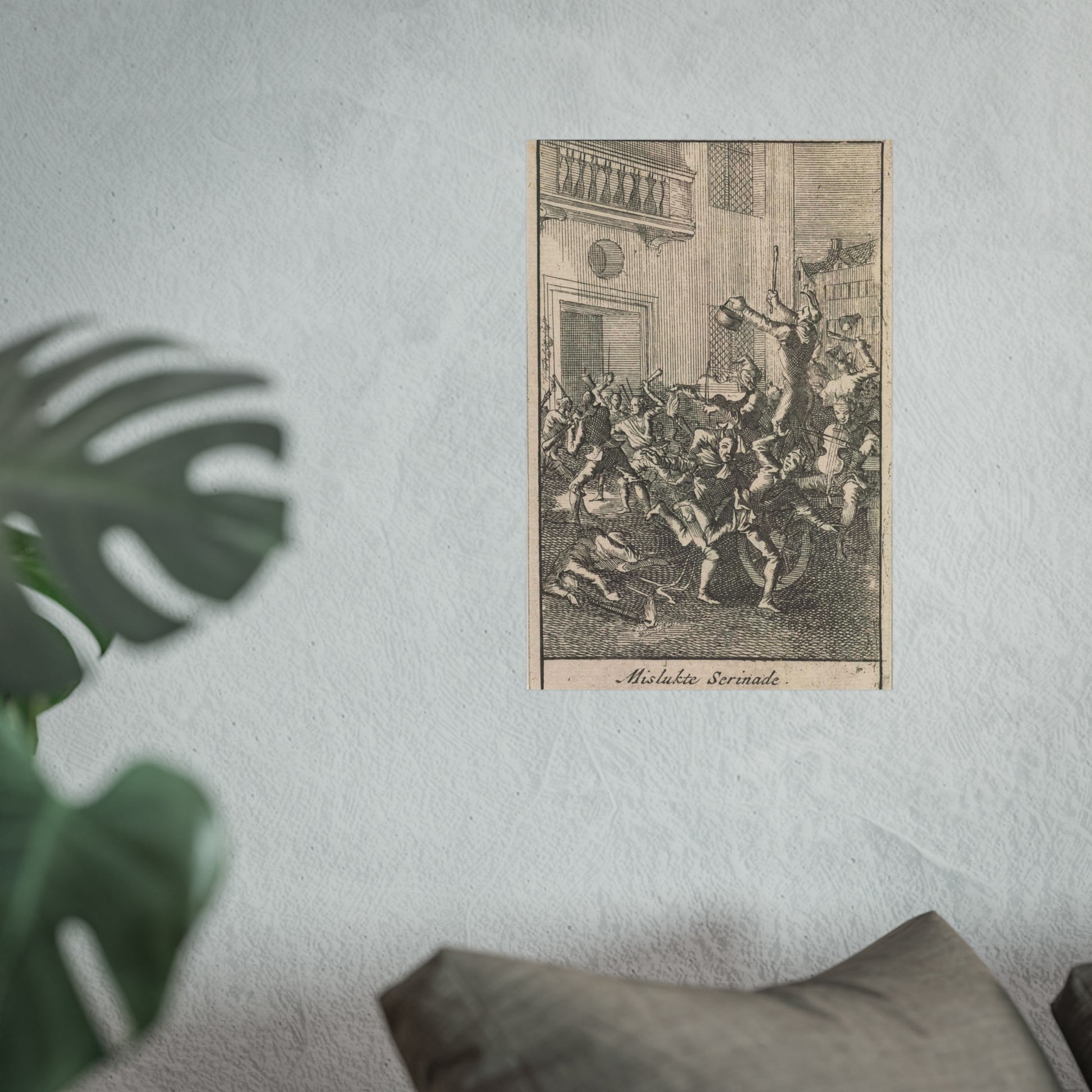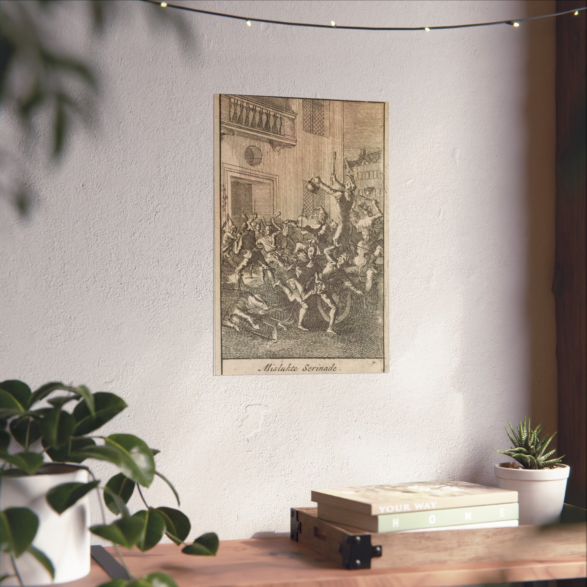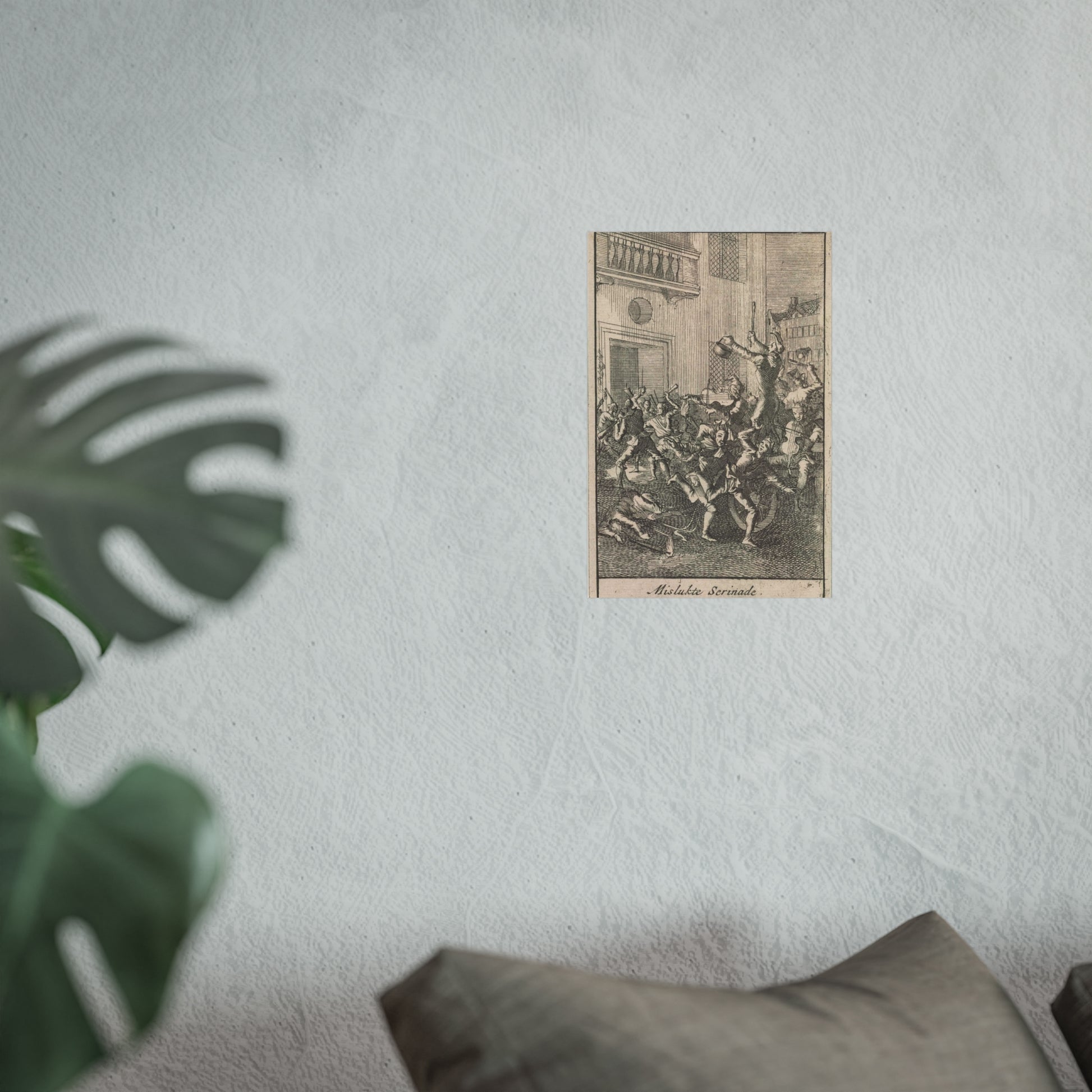 In the foreground, two masked figures are seen fleeing a skirmish. Behind them, a cart filled with musicians dressed as devils and jesters creates a cacophony of sound. These musicians are serenading Faustina, in this captivating scene from Francisco de Quevedo's 'The Night Runner'.