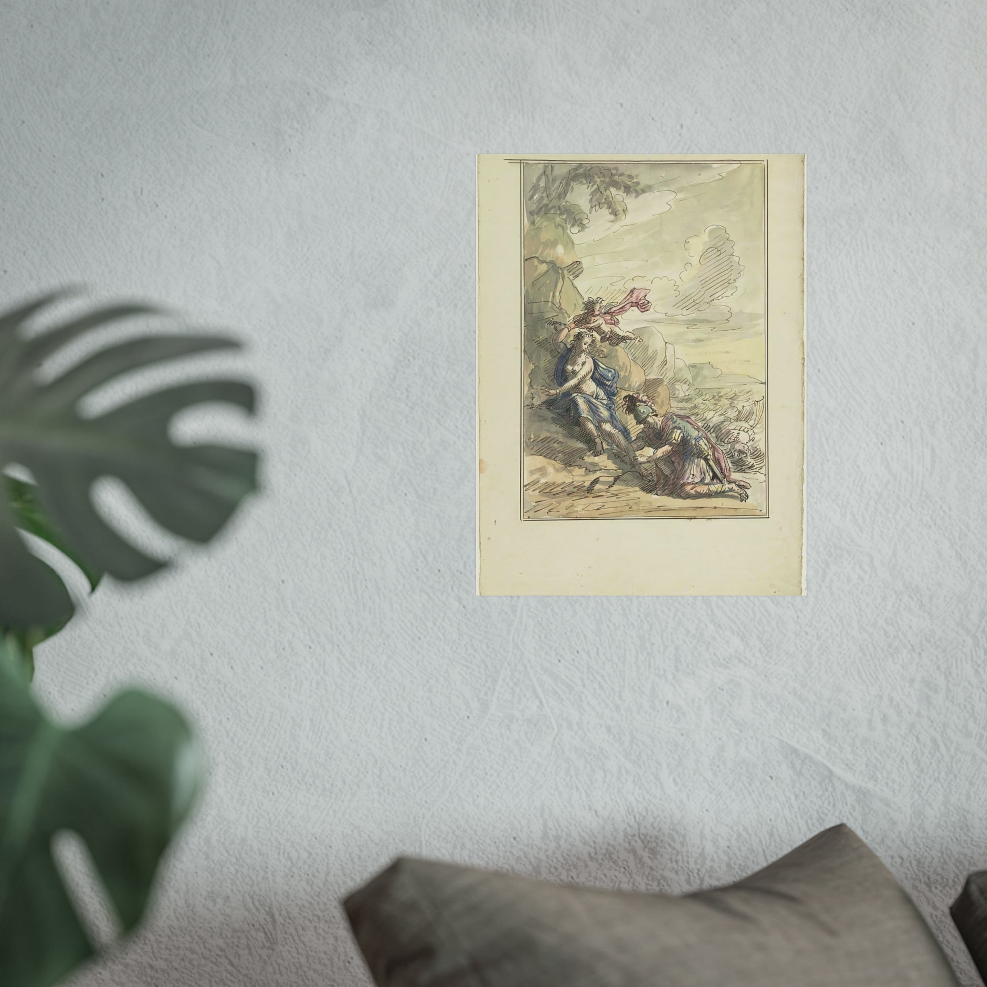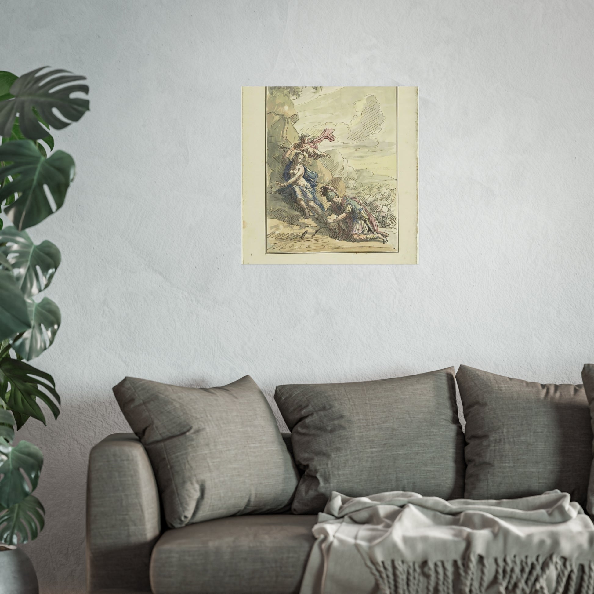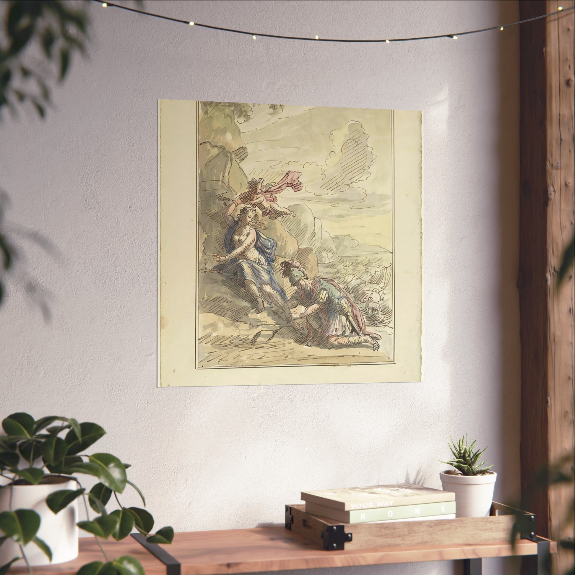 This captivating painting, titled 'Perseus Rescues Andromeda,' is a masterful work by Elias van Nijmegen. It vividly brings to life the mythological tale of Perseus, the heroic figure who saves Andromeda from a fearsome sea monster. The artist's use of bold colors and dynamic composition captures the drama and intensity of the moment, making it a truly mesmerizing piece. Van Nijmegen's attention to detail and ability to convey emotion through his brushstrokes make this painting a standout in any collection.
