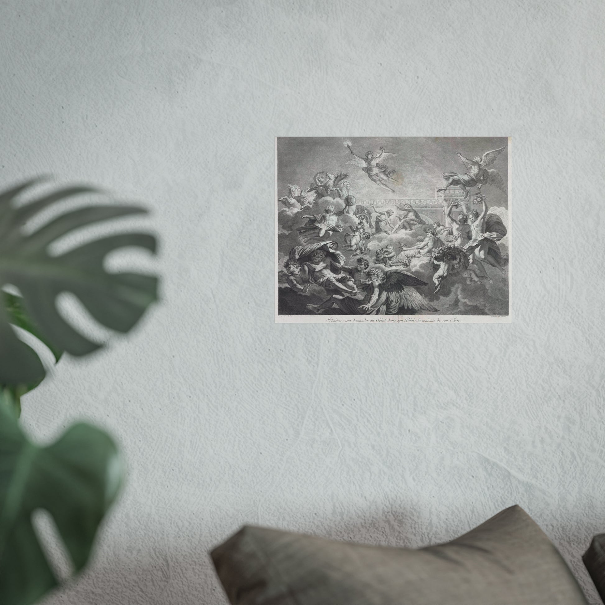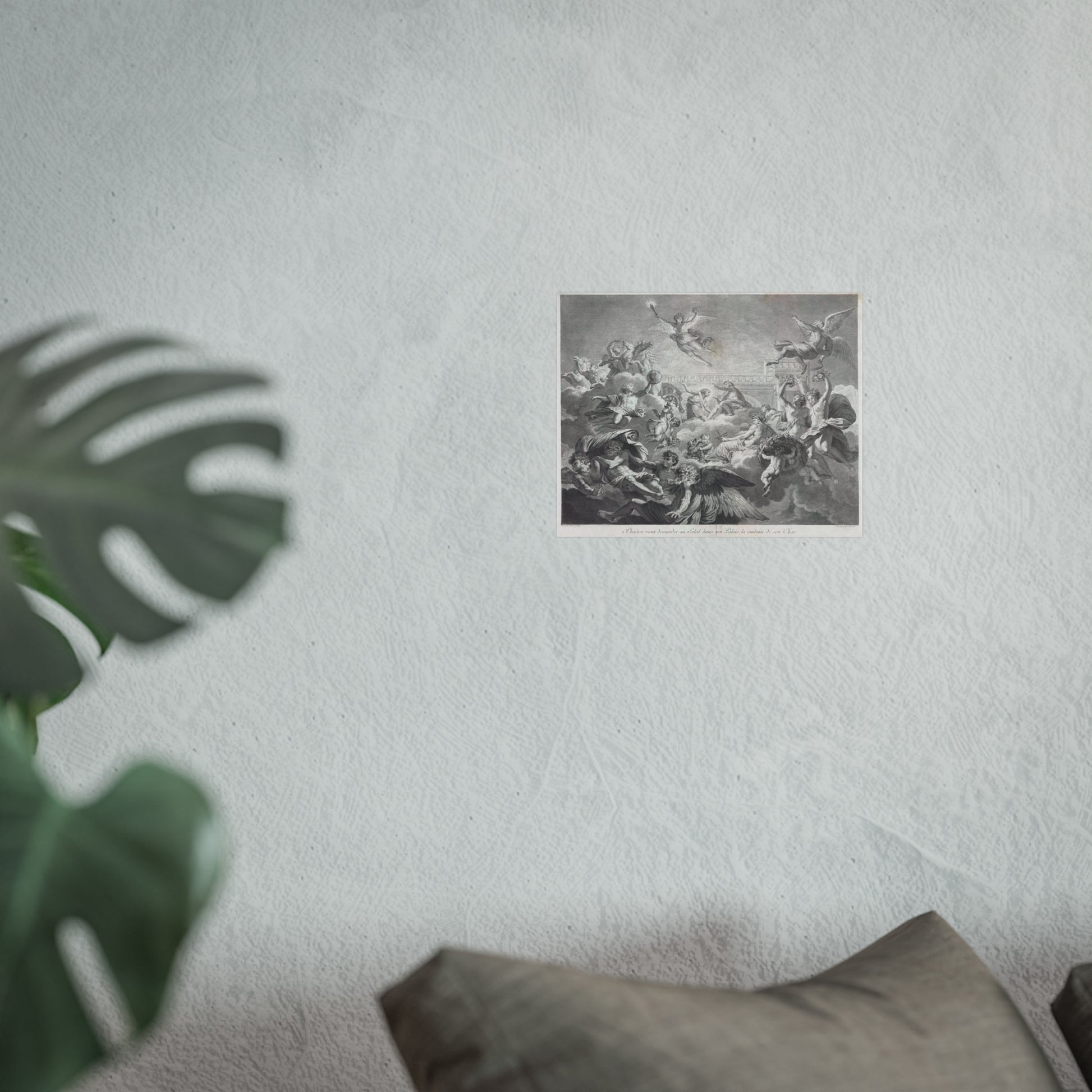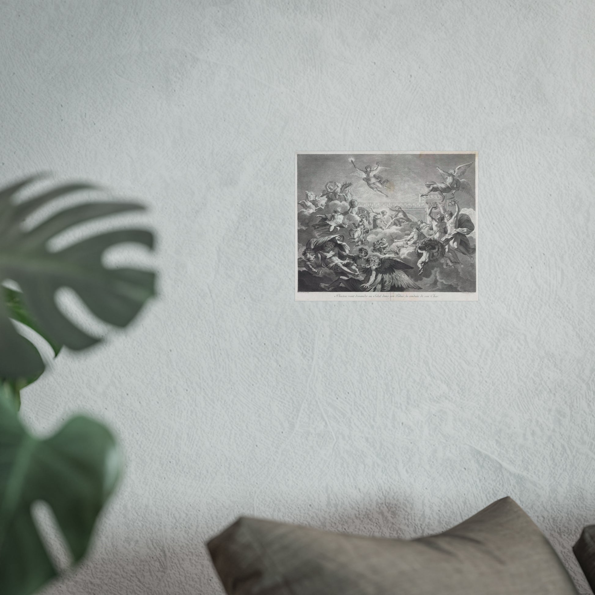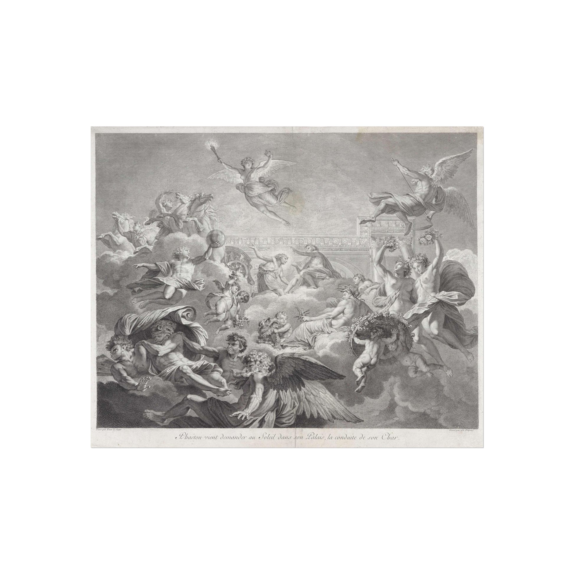 In this dynamic scene, Phaëton pleads with the sun god Apollo for the chance to drive the sun chariot for a day. Apollo, his father, extends his hands above Phaëton's head in a grand gesture. To the left, men are struggling to control the horses that pull the sun chariot. Above them, Aurora, the goddess of dawn, soars with her torch. On the right, Father Time wields his scythe alongside Ceres with her wheat sheaves and the Hours bearing flowers. The Four Winds make their presence known at the bottom left. This print is part of a series inspired by paintings found in the Chambre des Muses in Paris' Hôtel Lambert.