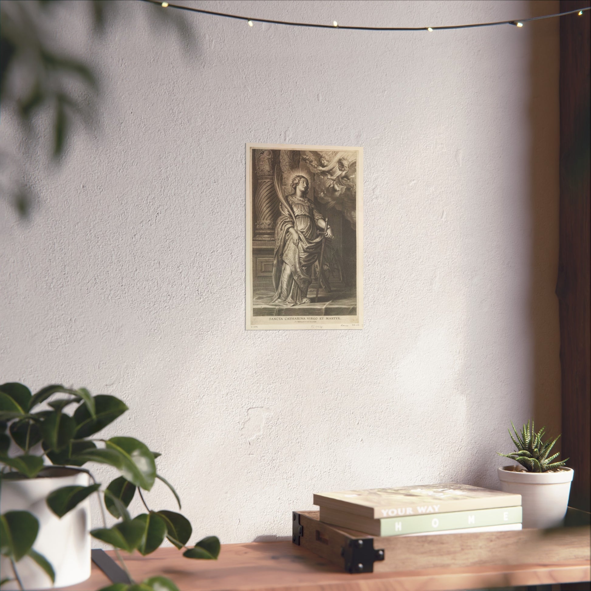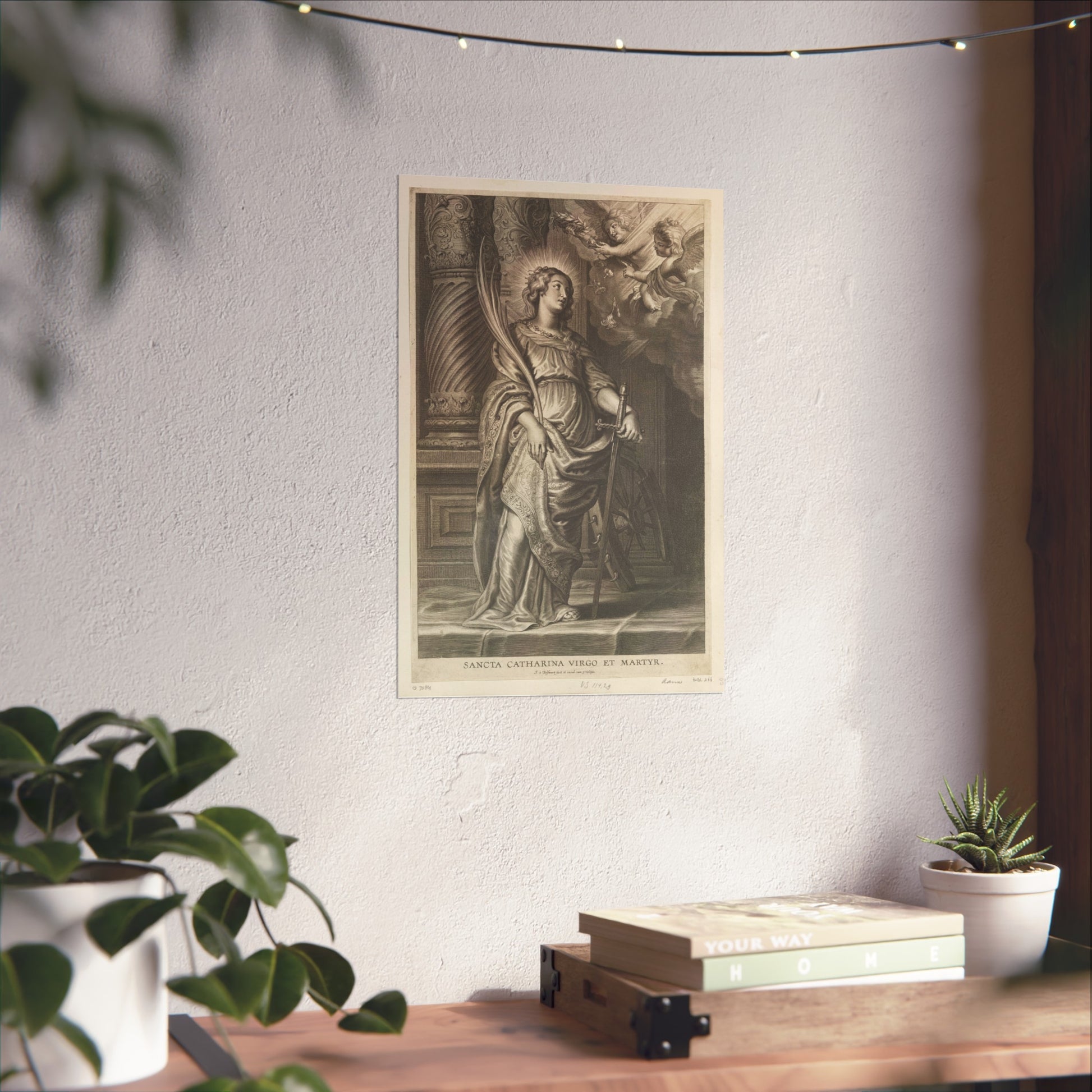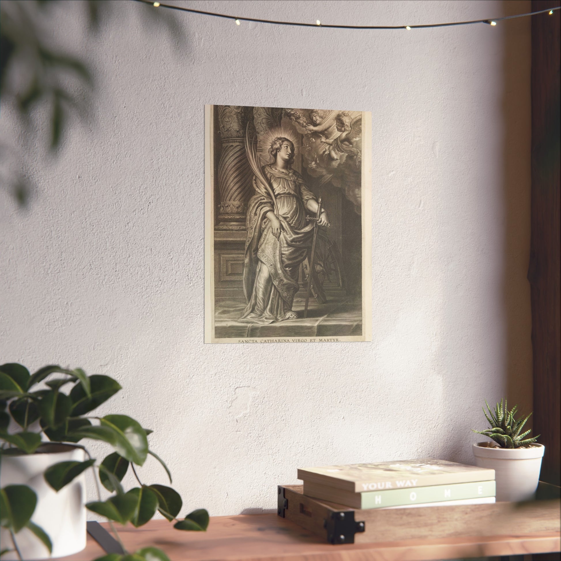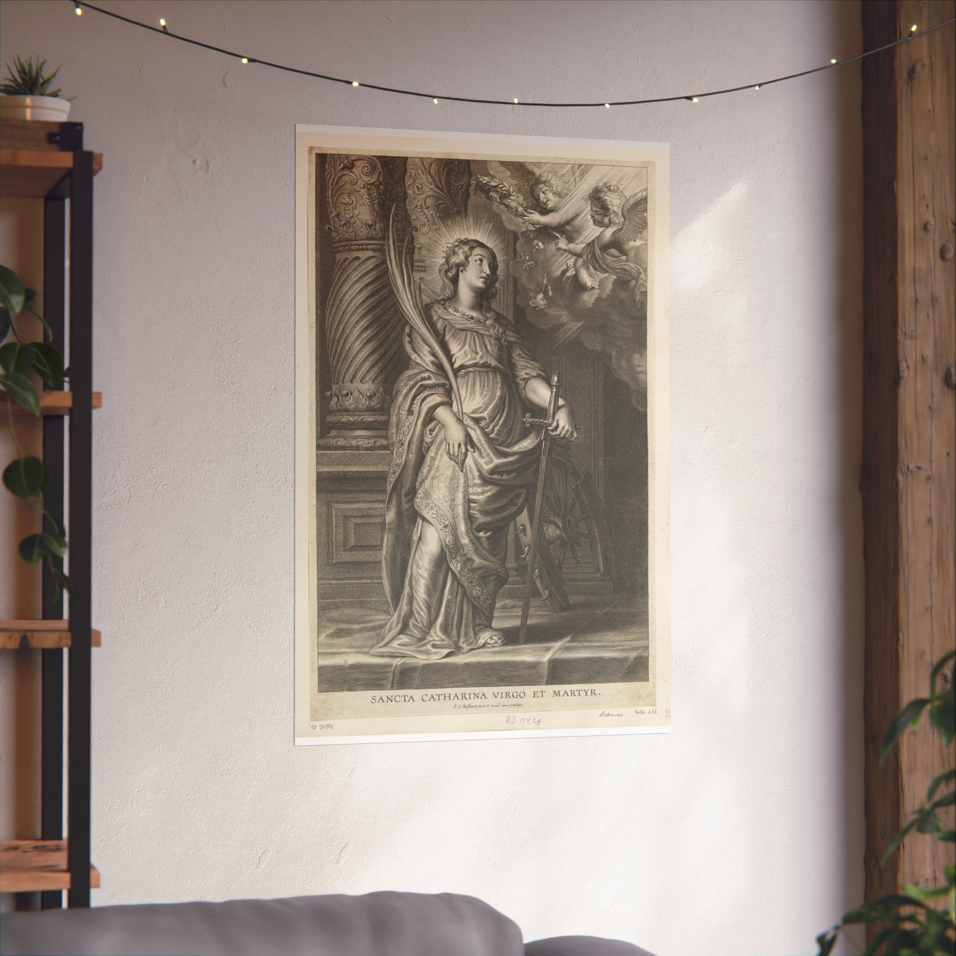 This captivating artwork portrays Saint Catherine of Alexandria, depicted as a martyr with a broken wheel. This print is part of an album, adding a sense of narrative and historical context to the piece.