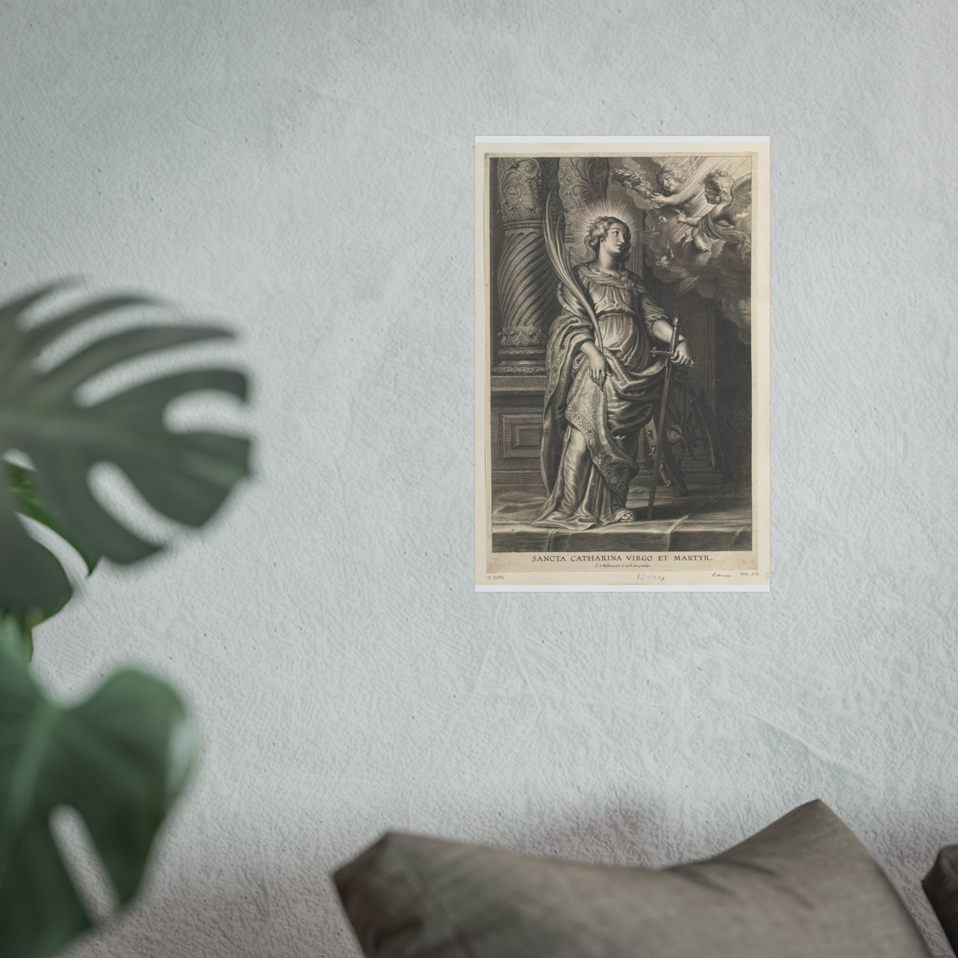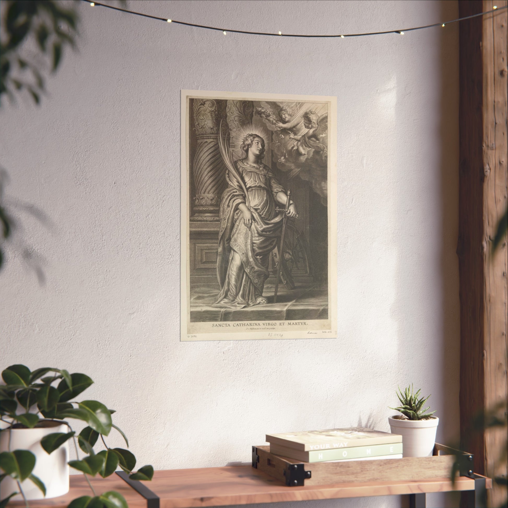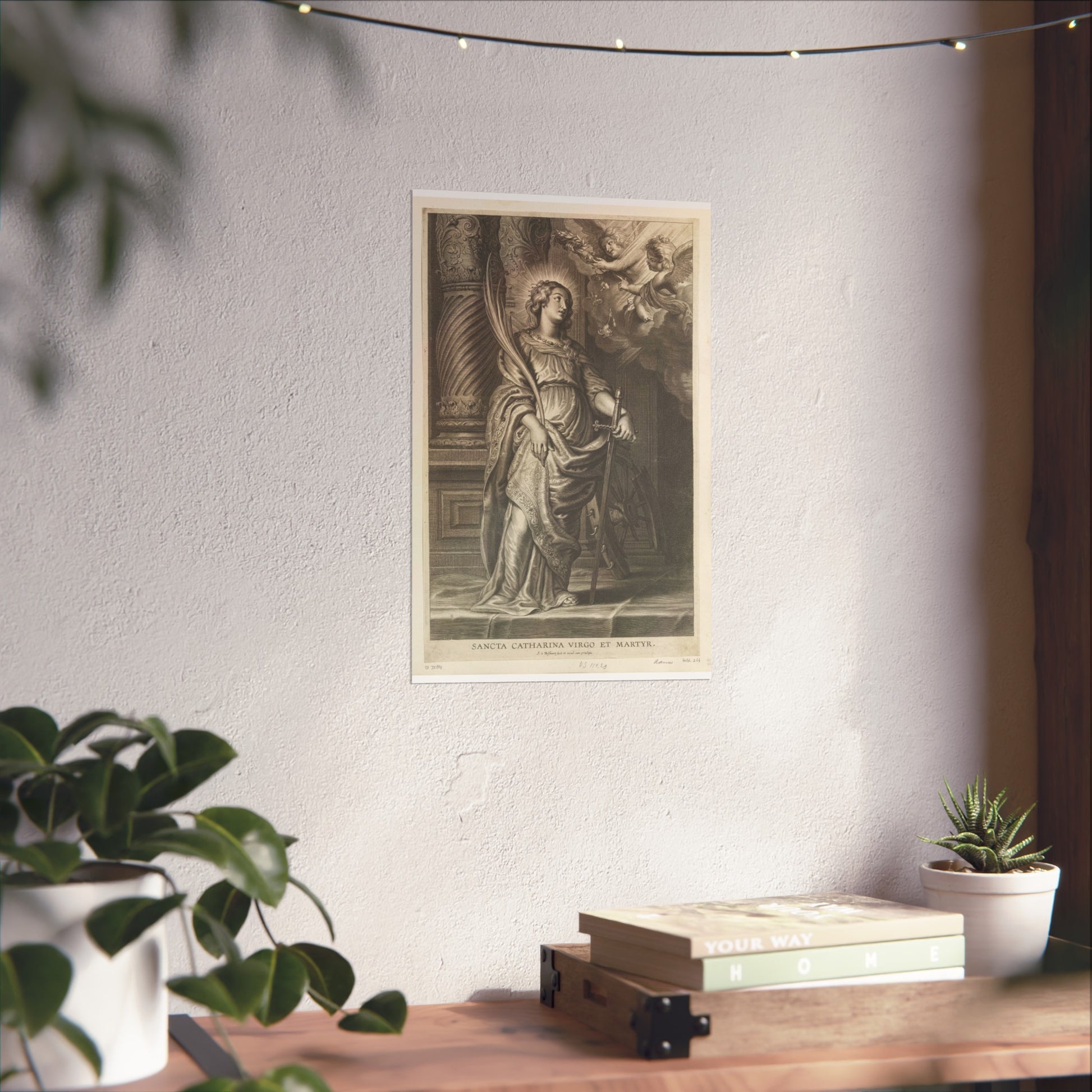 This captivating artwork portrays Saint Catherine of Alexandria, depicted as a martyr with a broken wheel. This print is part of an album, adding a sense of narrative and historical context to the piece.