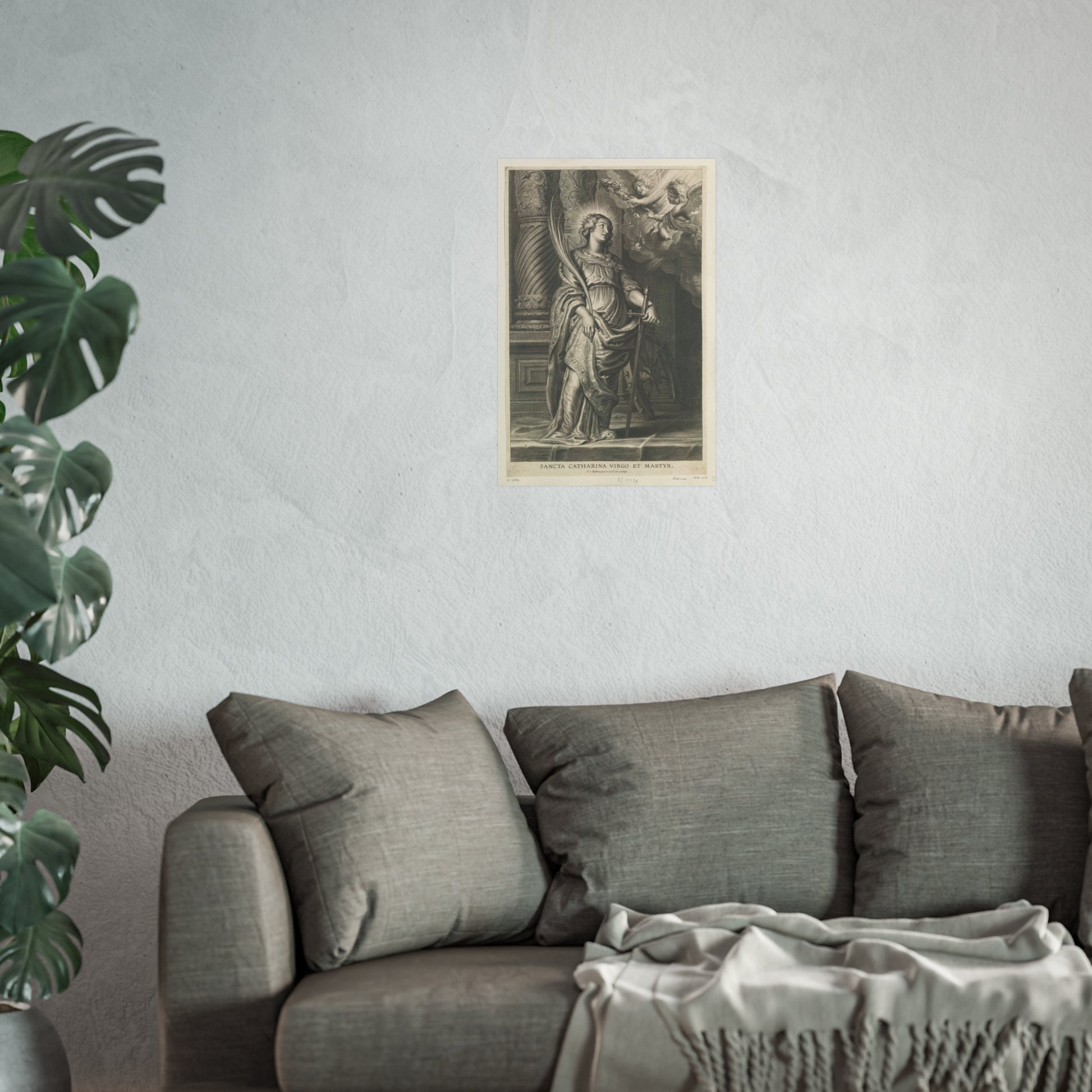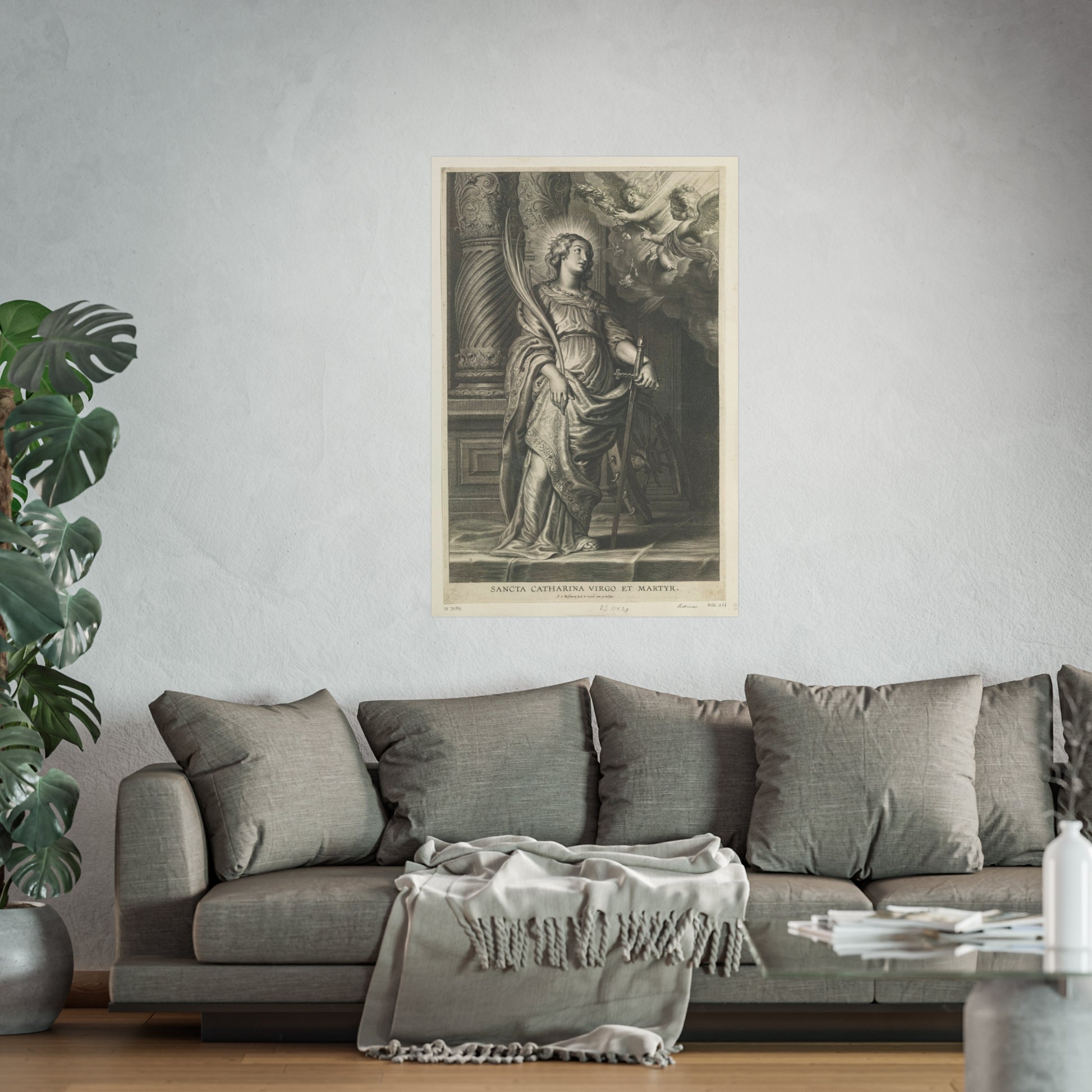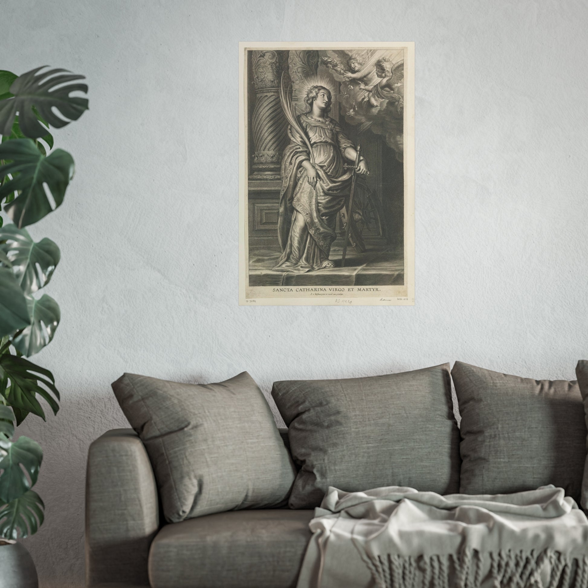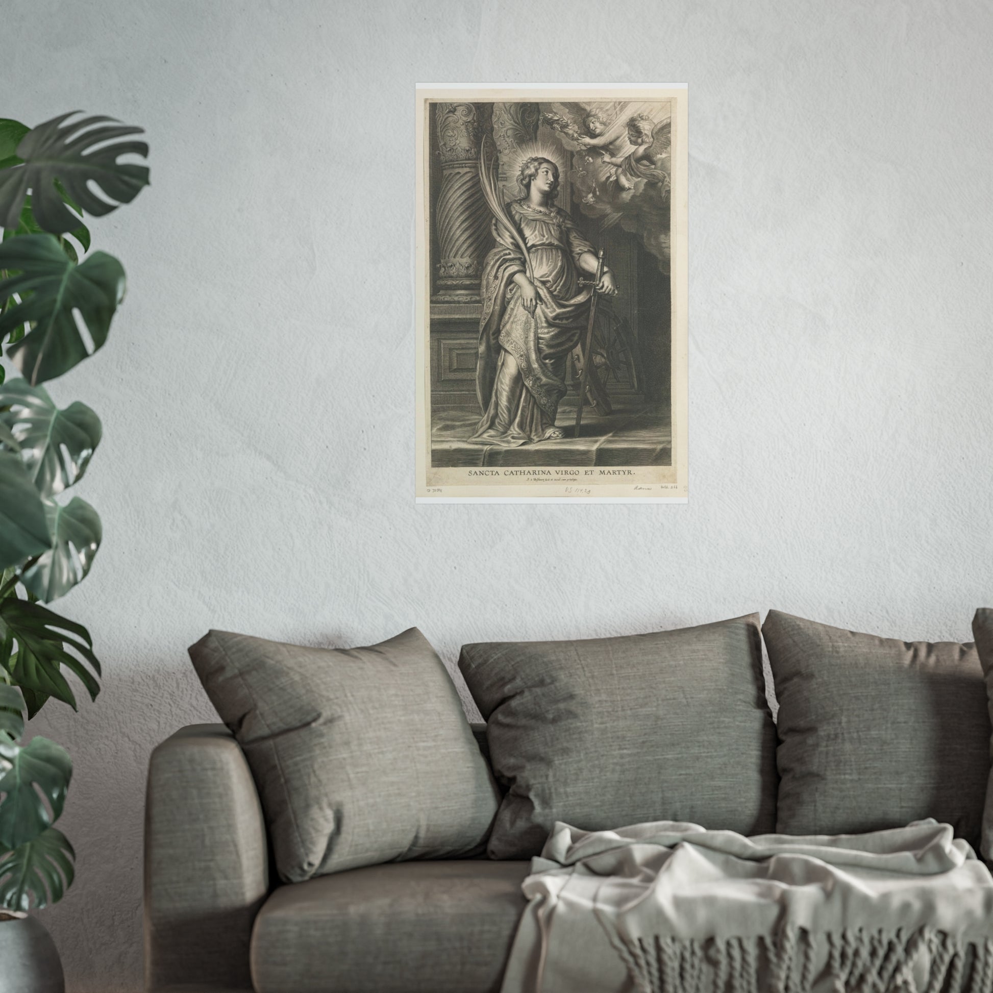 This captivating artwork portrays Saint Catherine of Alexandria, depicted as a martyr with a broken wheel. This print is part of an album, adding a sense of narrative and historical context to the piece.