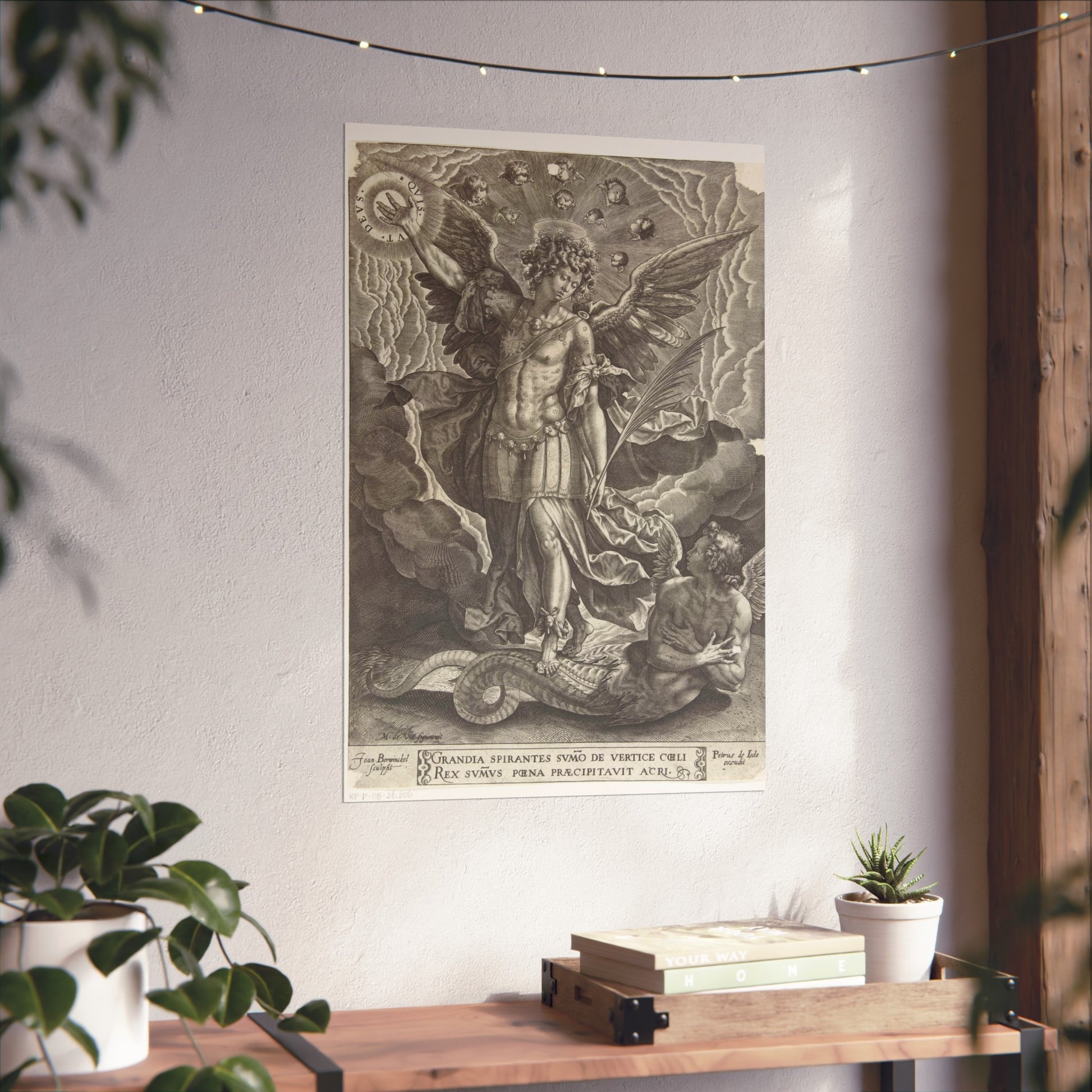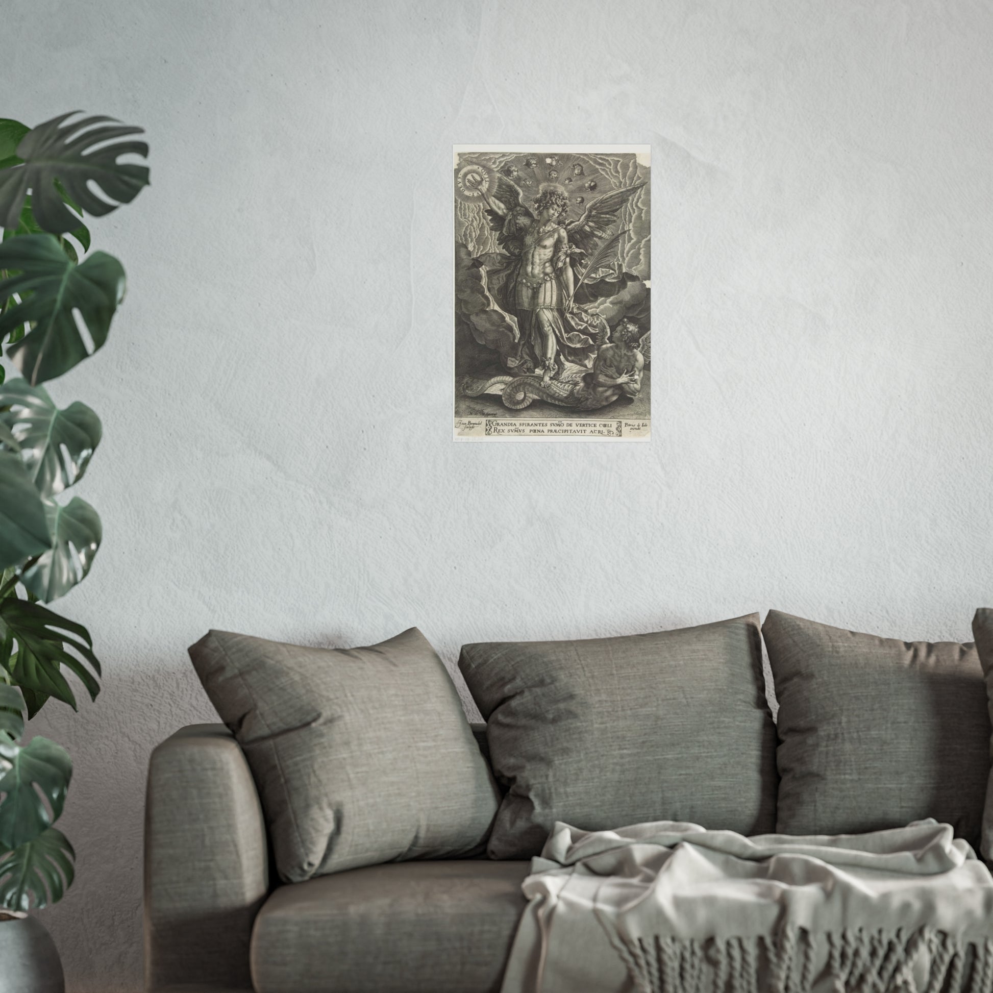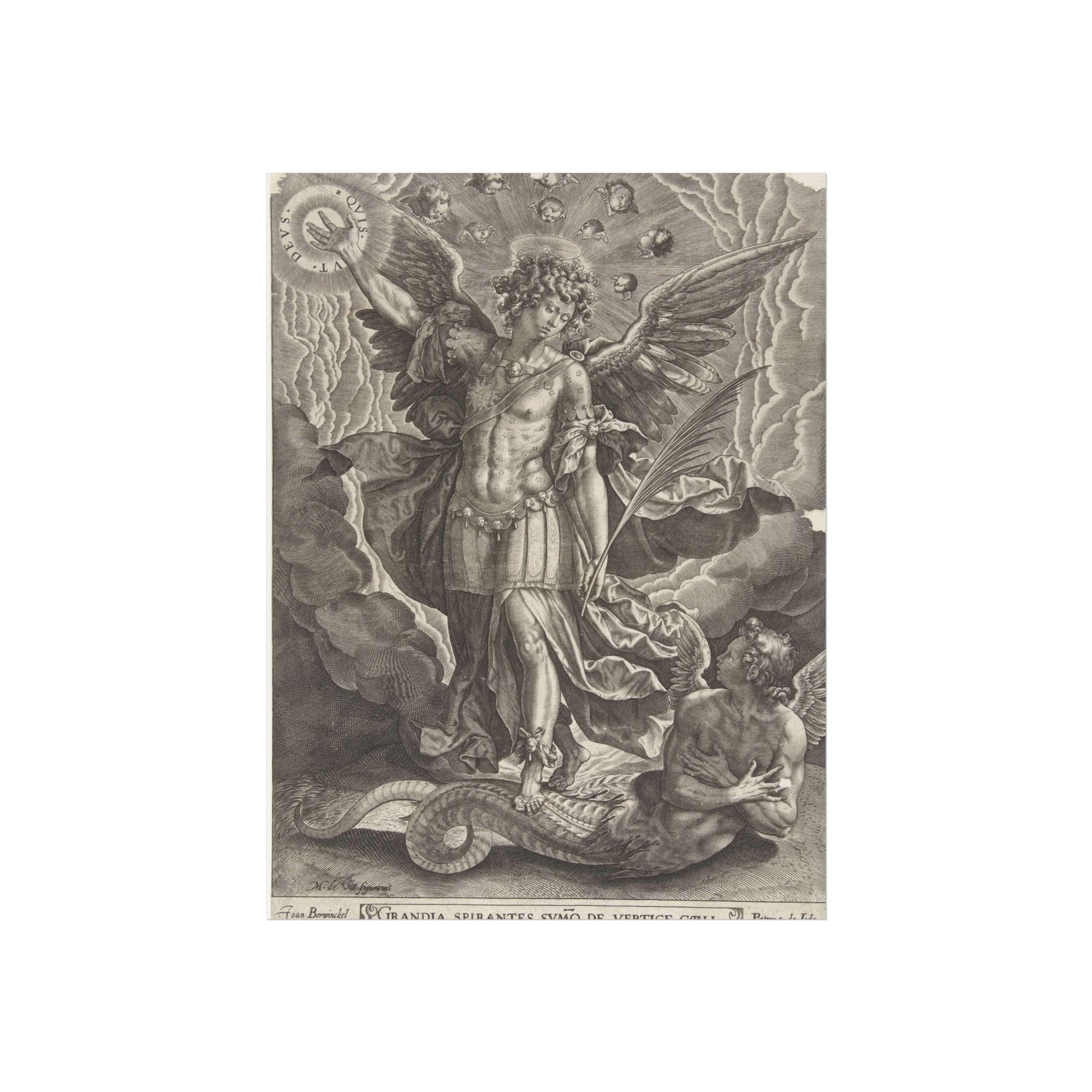 This captivating artwork depicts the pivotal biblical moment where the archangel Michael banishes a rebellious angel from heaven. The artist, Joan Berwinckel, masterfully portrays the dramatic intensity of the scene, capturing the divine power and celestial conflict in vivid detail.
