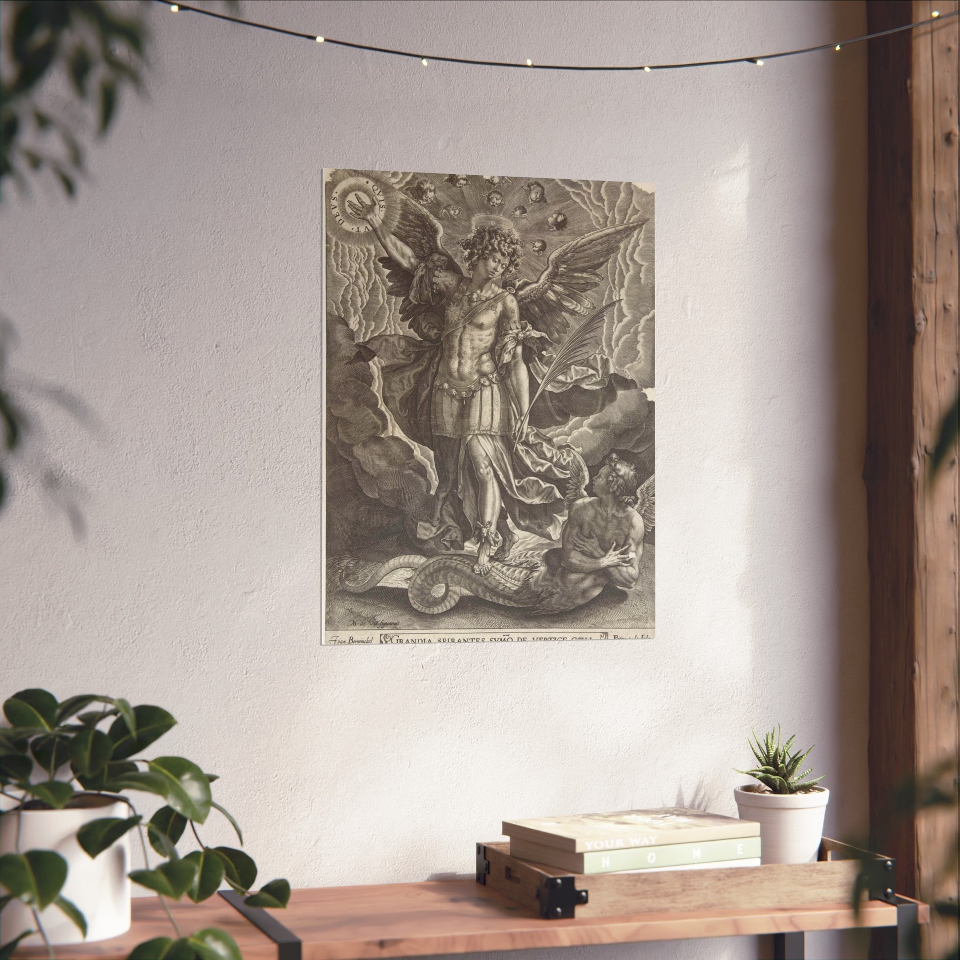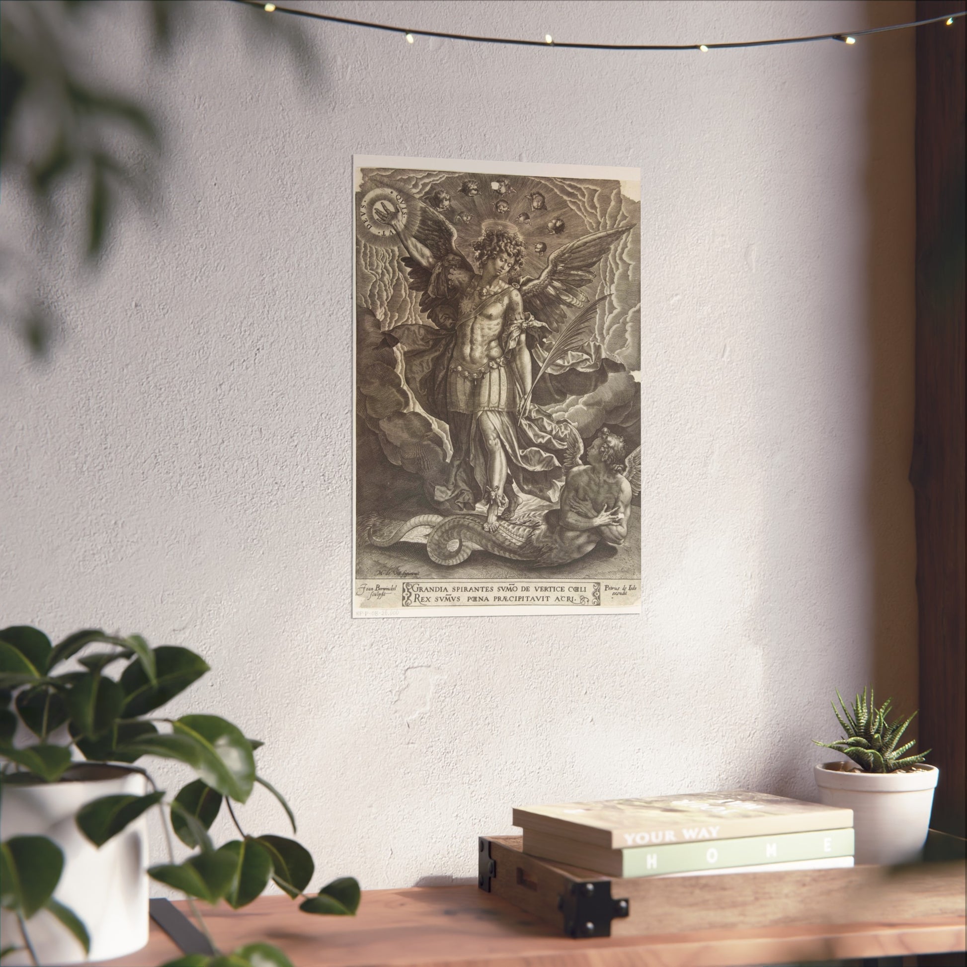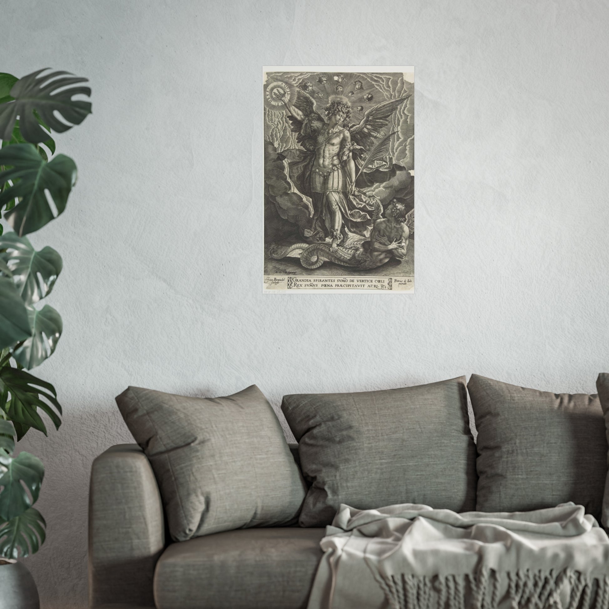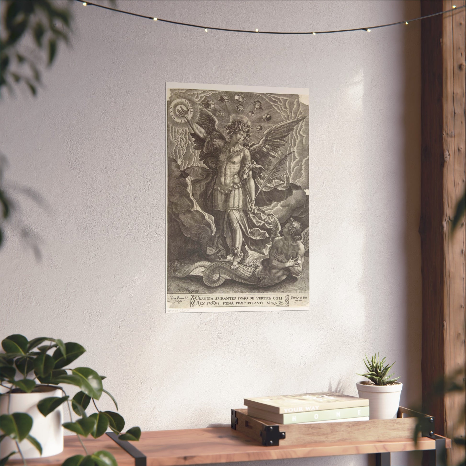 This captivating artwork depicts the pivotal biblical moment where the archangel Michael banishes a rebellious angel from heaven. The artist, Joan Berwinckel, masterfully portrays the dramatic intensity of the scene, capturing the divine power and celestial conflict in vivid detail.