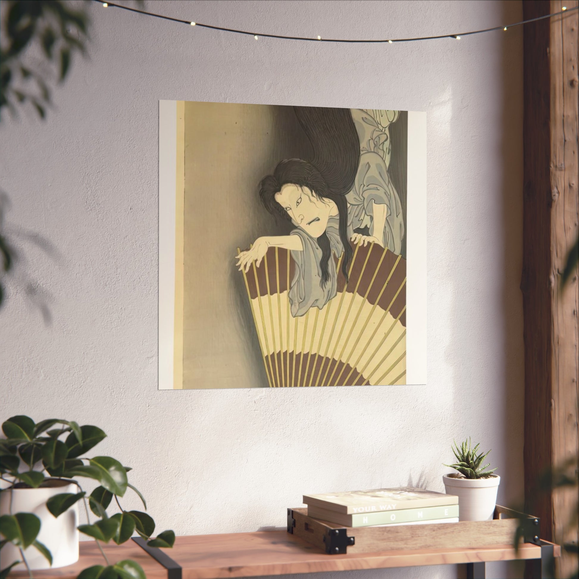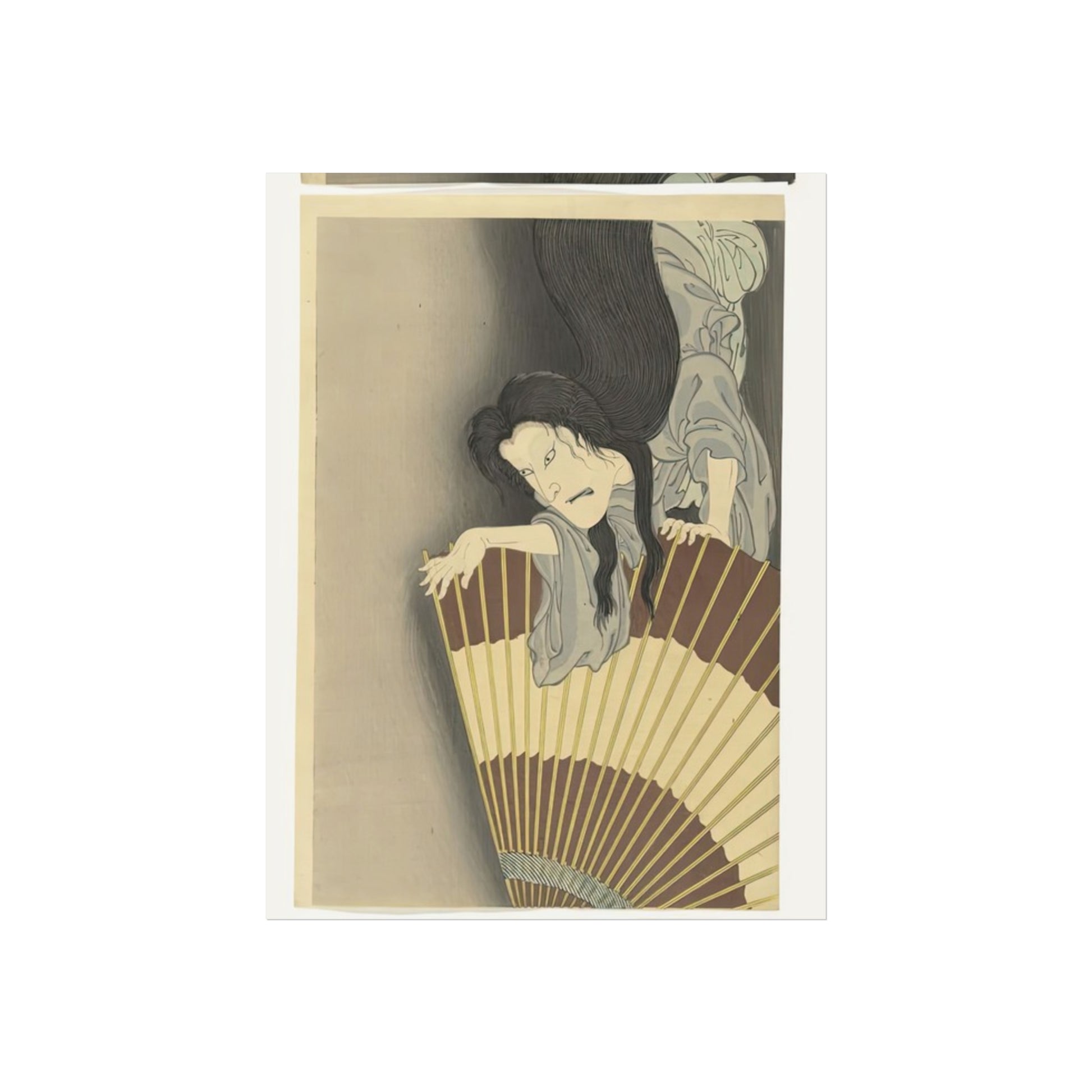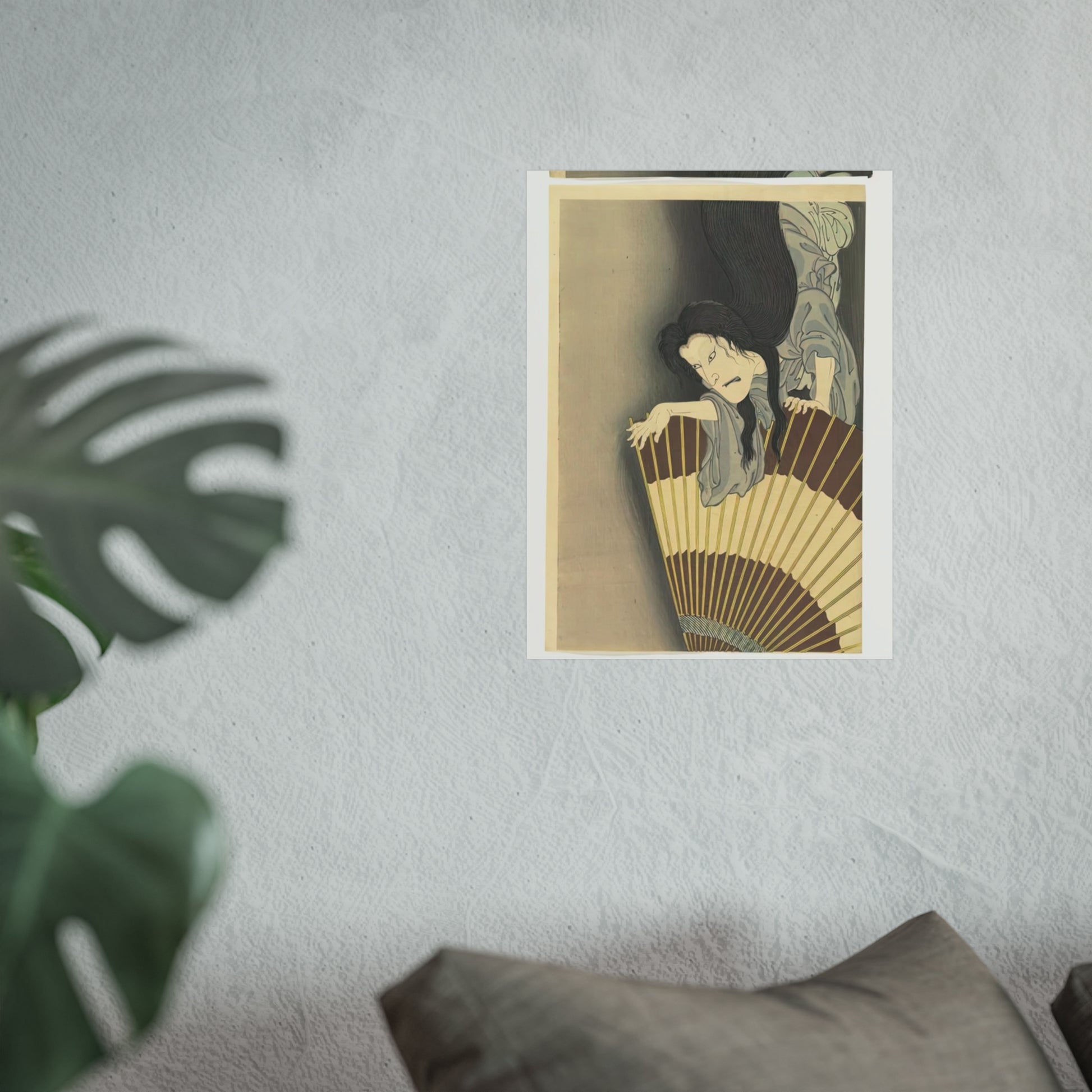 The top panel of a triptych, showcasing the long, flowing hair of the ghost Okiku. This haunting yet captivating scene captures the essence of Japanese folklore, as Okiku's spectral presence is both eerie and mesmerizing. The intricate details in her hair and the ethereal atmosphere highlight Toyohara Kunichika's masterful artistry., Samurai Aoyama and the ghost Okiku are central figures in this painting. The story tells of Okiku, a maid who was wrongfully accused of losing valuable plates and was subsequently killed by Aoyama. Her spirit returns to haunt him, leading to a tale of revenge and supernatural occurrences.