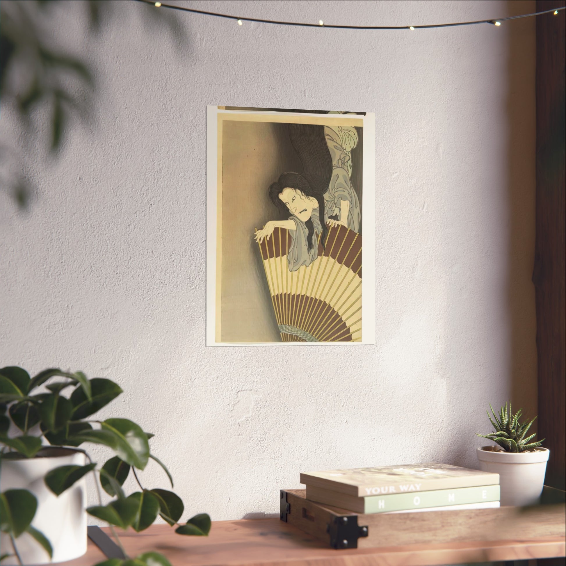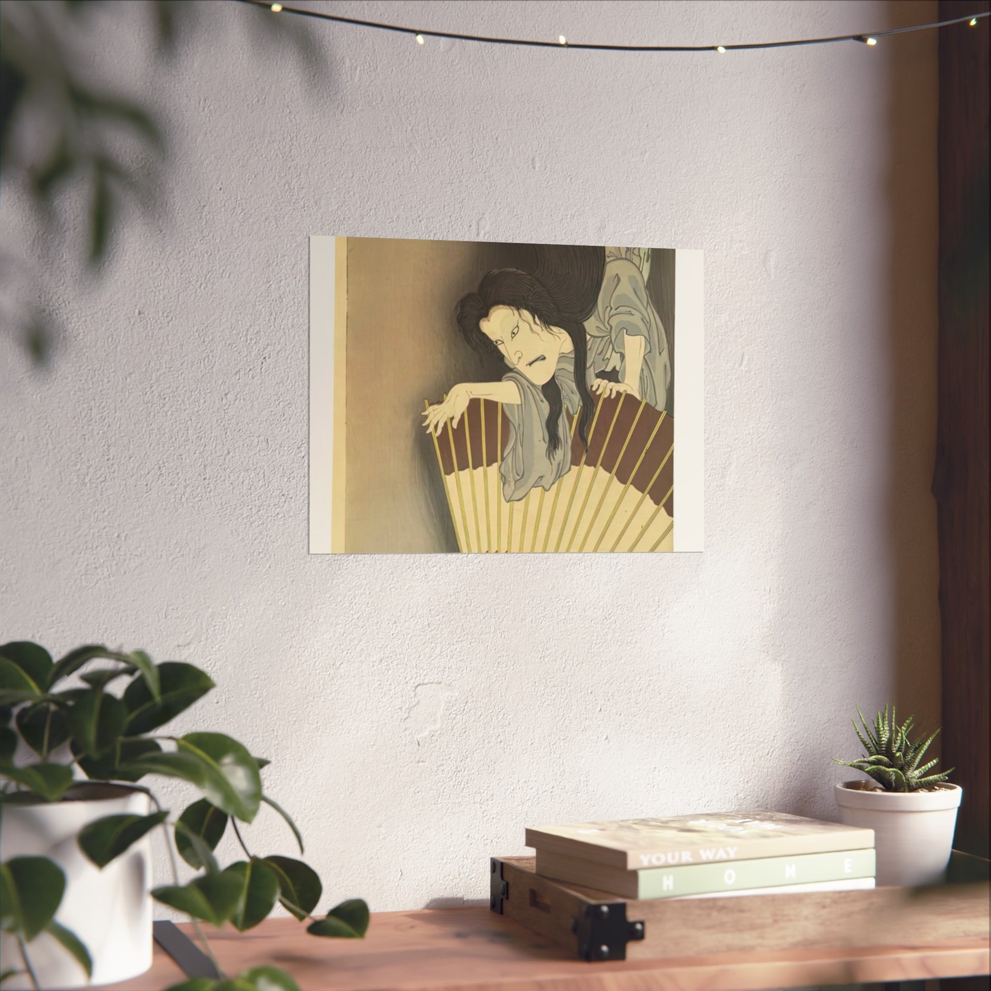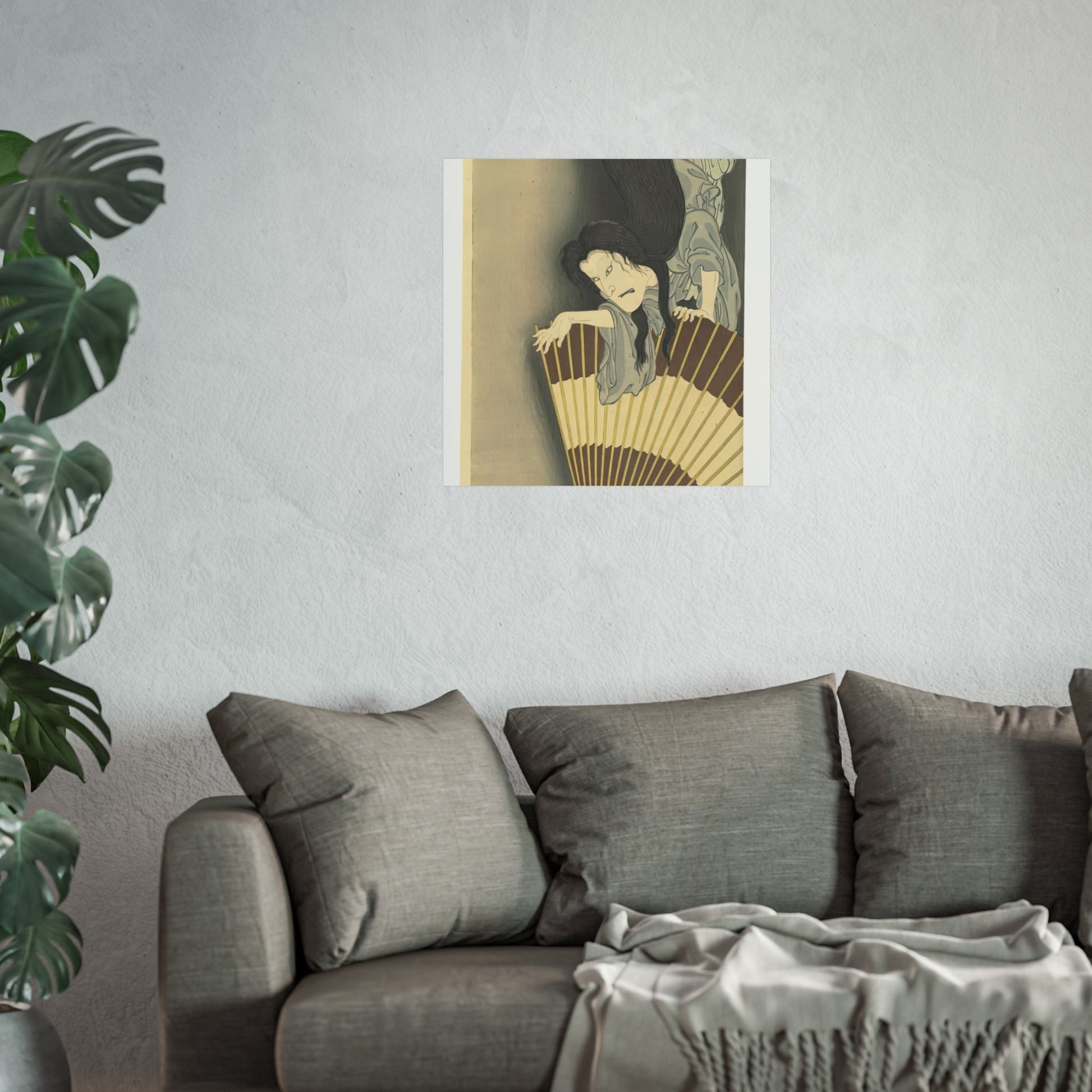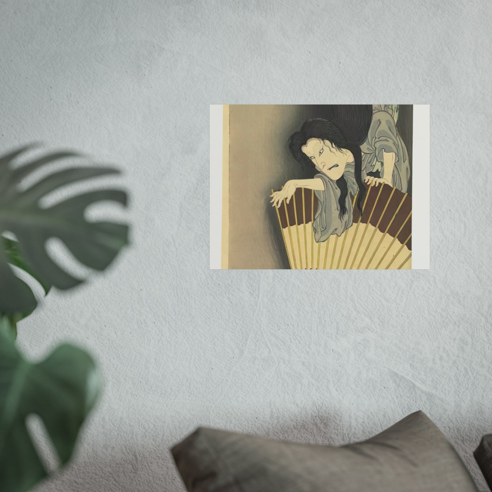 The top panel of a triptych, showcasing the long, flowing hair of the ghost Okiku. This haunting yet captivating scene captures the essence of Japanese folklore, as Okiku's spectral presence is both eerie and mesmerizing. The intricate details in her hair and the ethereal atmosphere highlight Toyohara Kunichika's masterful artistry., Samurai Aoyama and the ghost Okiku are central figures in this painting. The story tells of Okiku, a maid who was wrongfully accused of losing valuable plates and was subsequently killed by Aoyama. Her spirit returns to haunt him, leading to a tale of revenge and supernatural occurrences.