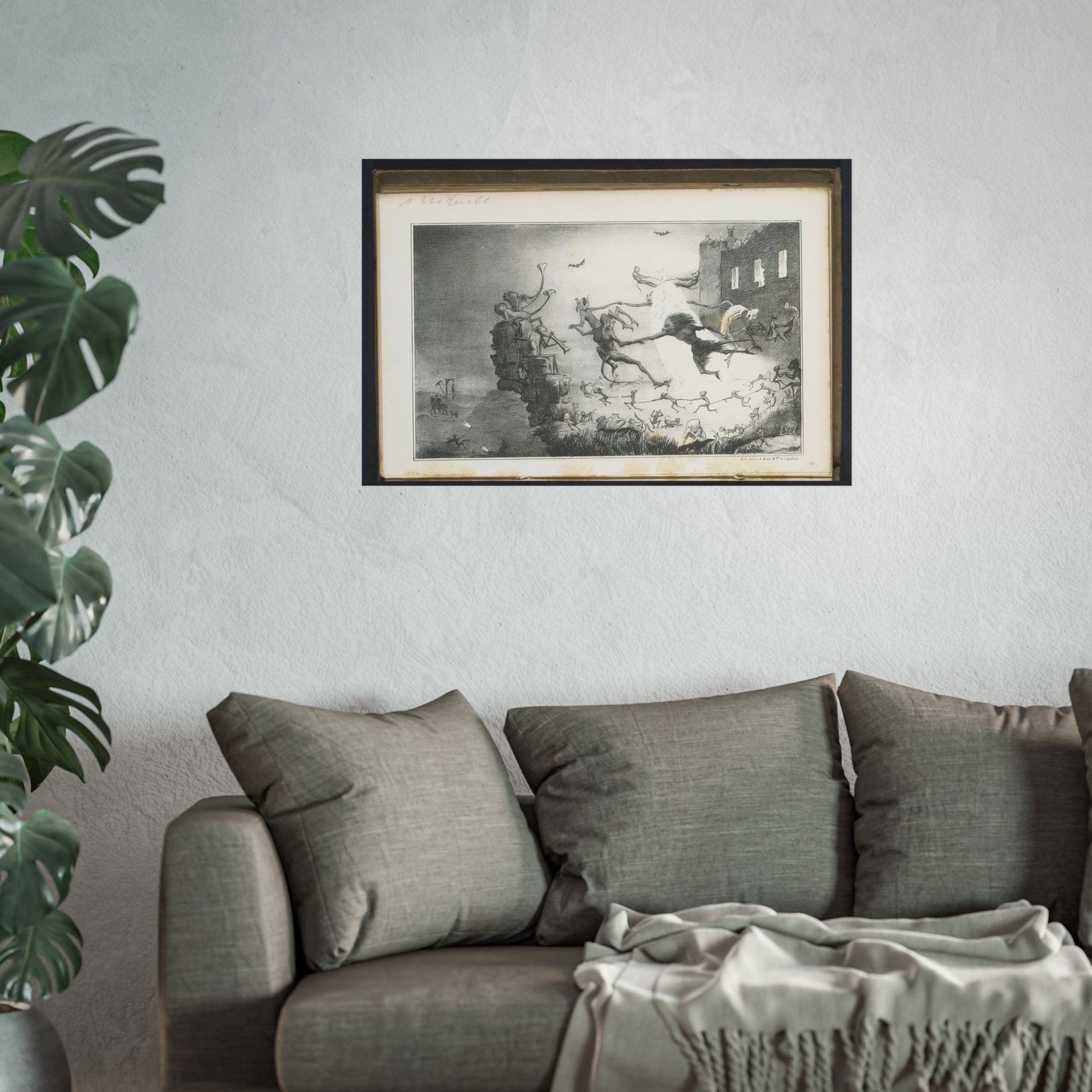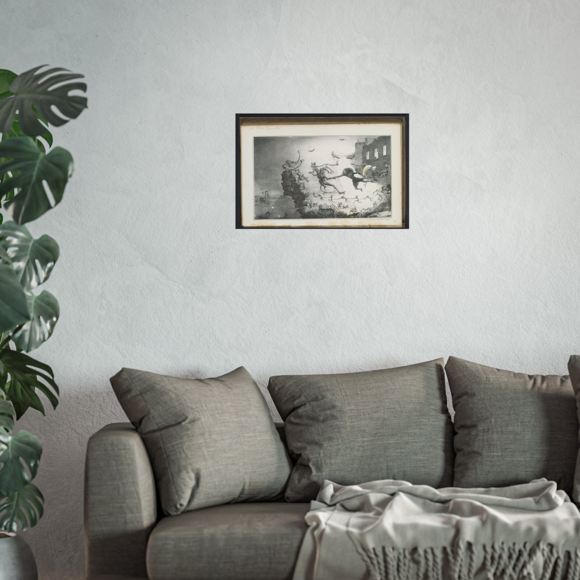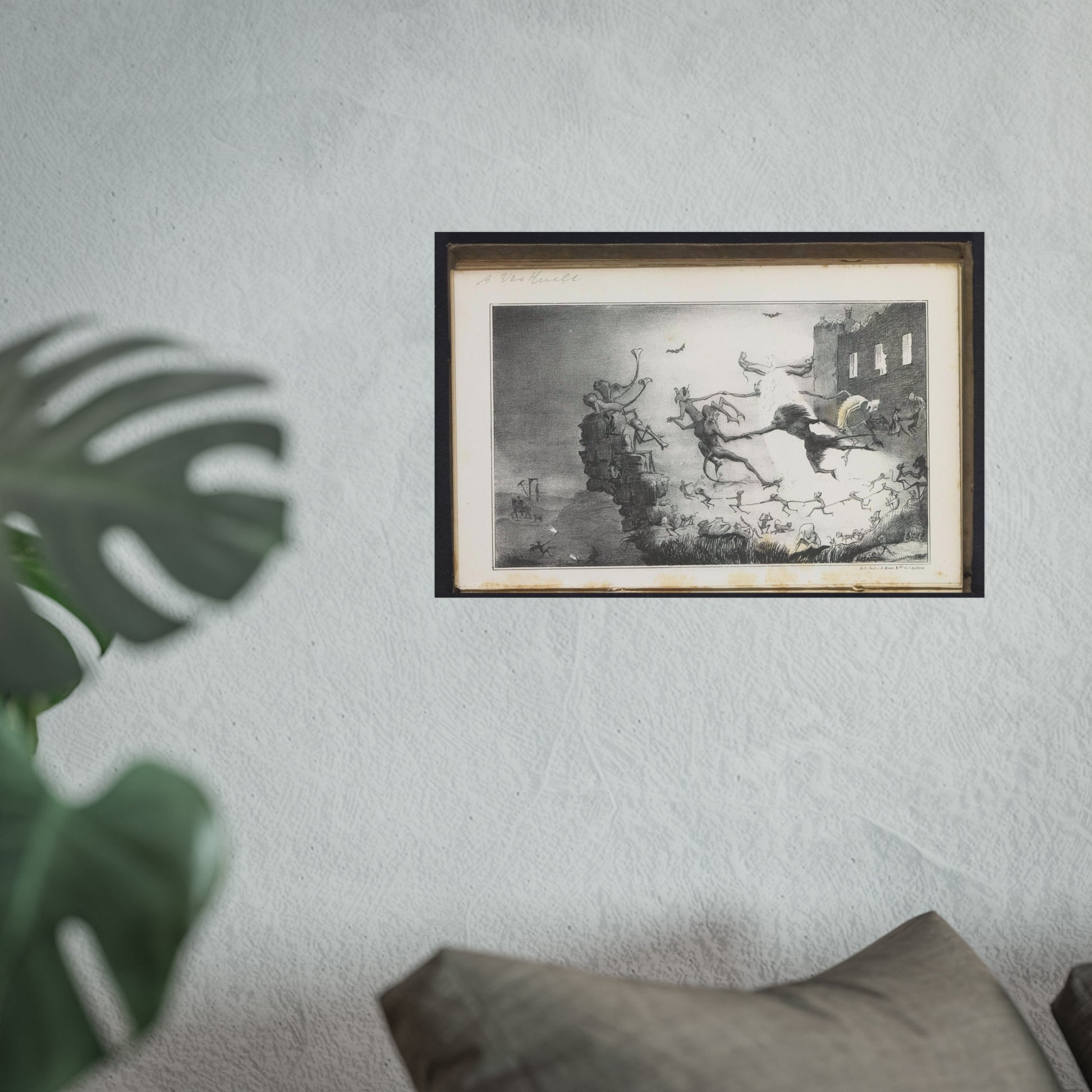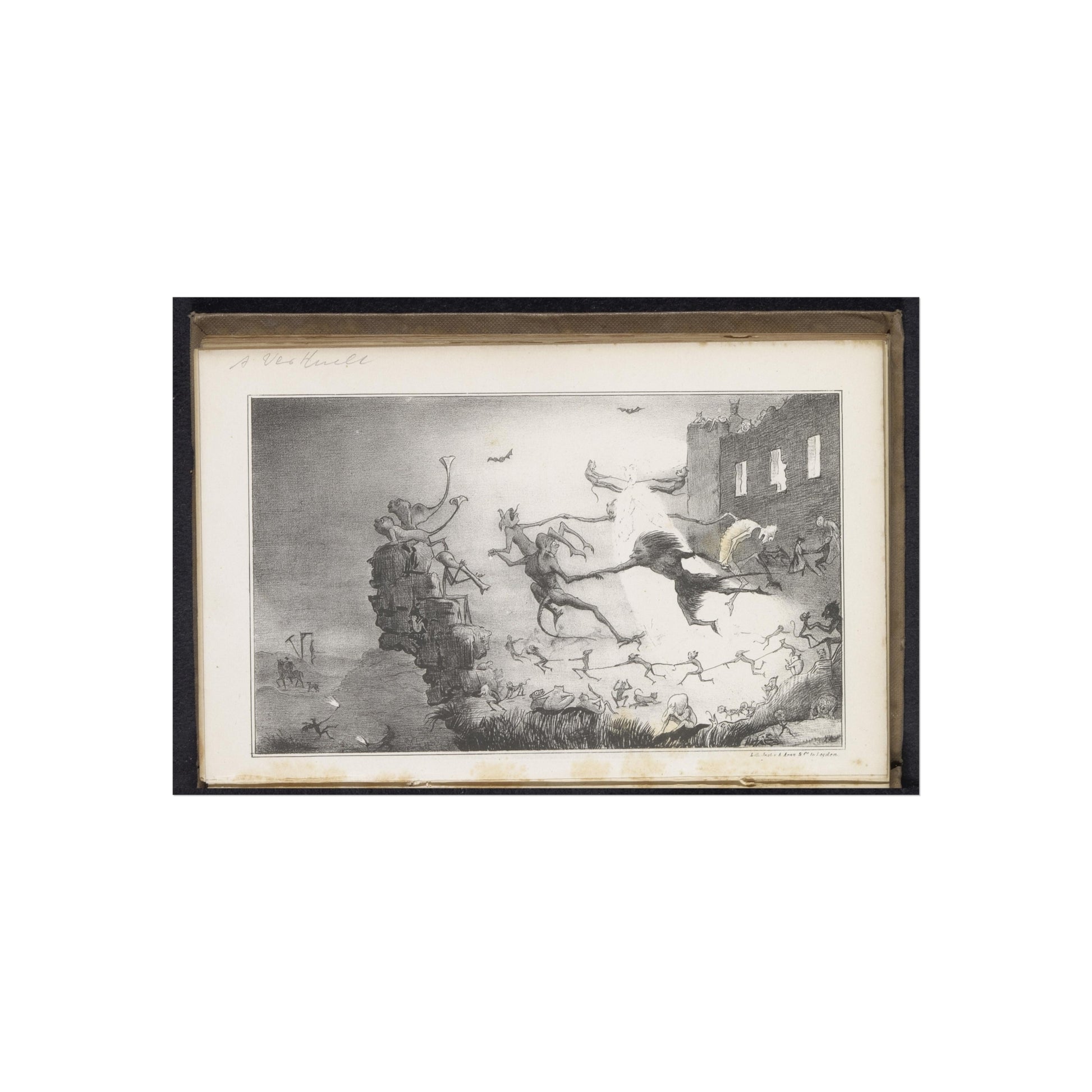 Depicted in this captivating illustration are devils dancing upon a ruin. This piece serves as a visual representation of the poem 'To a Passerby' by Victor Hugo. It was featured as a satirical cartoon in the student almanac of Leiden University in the year 1843.