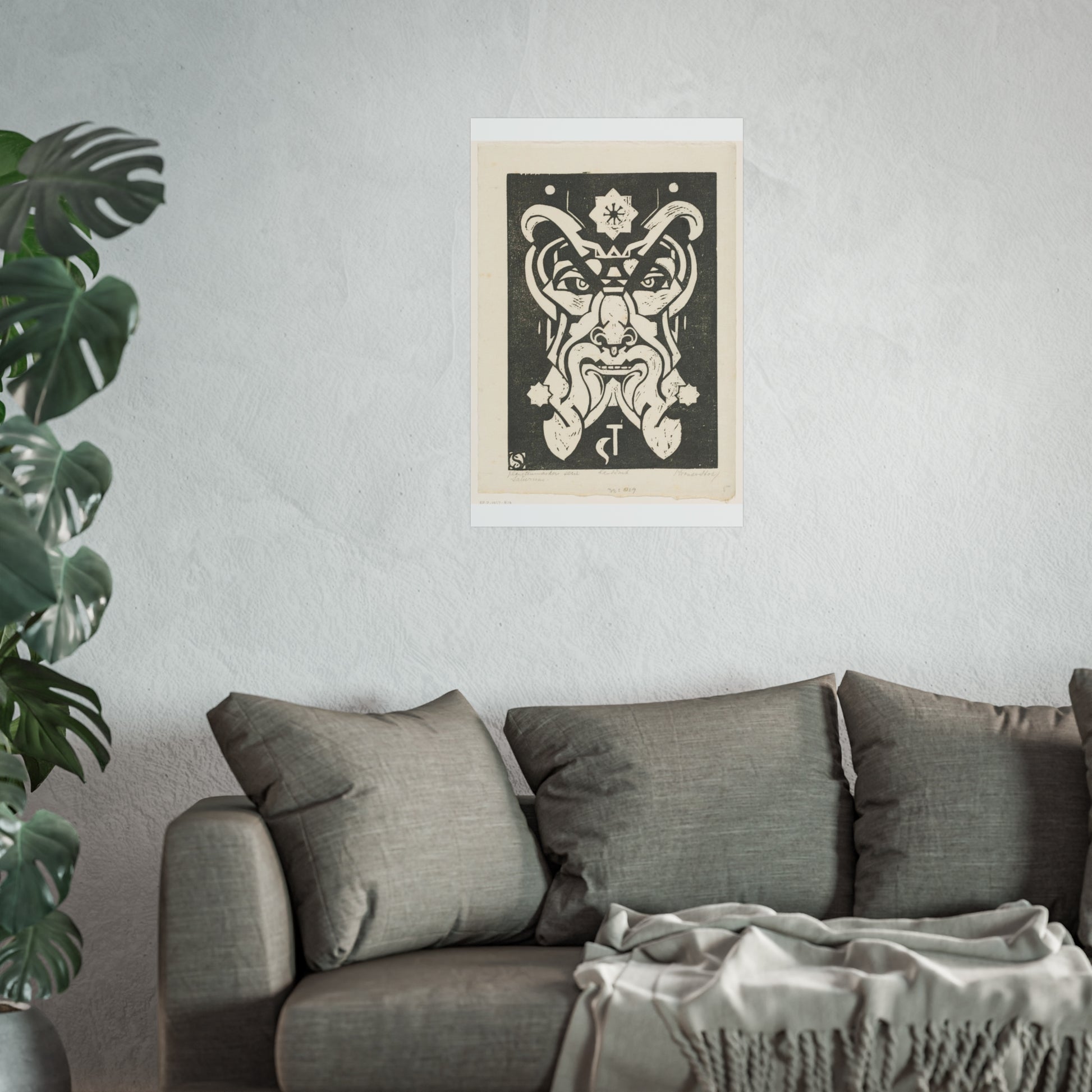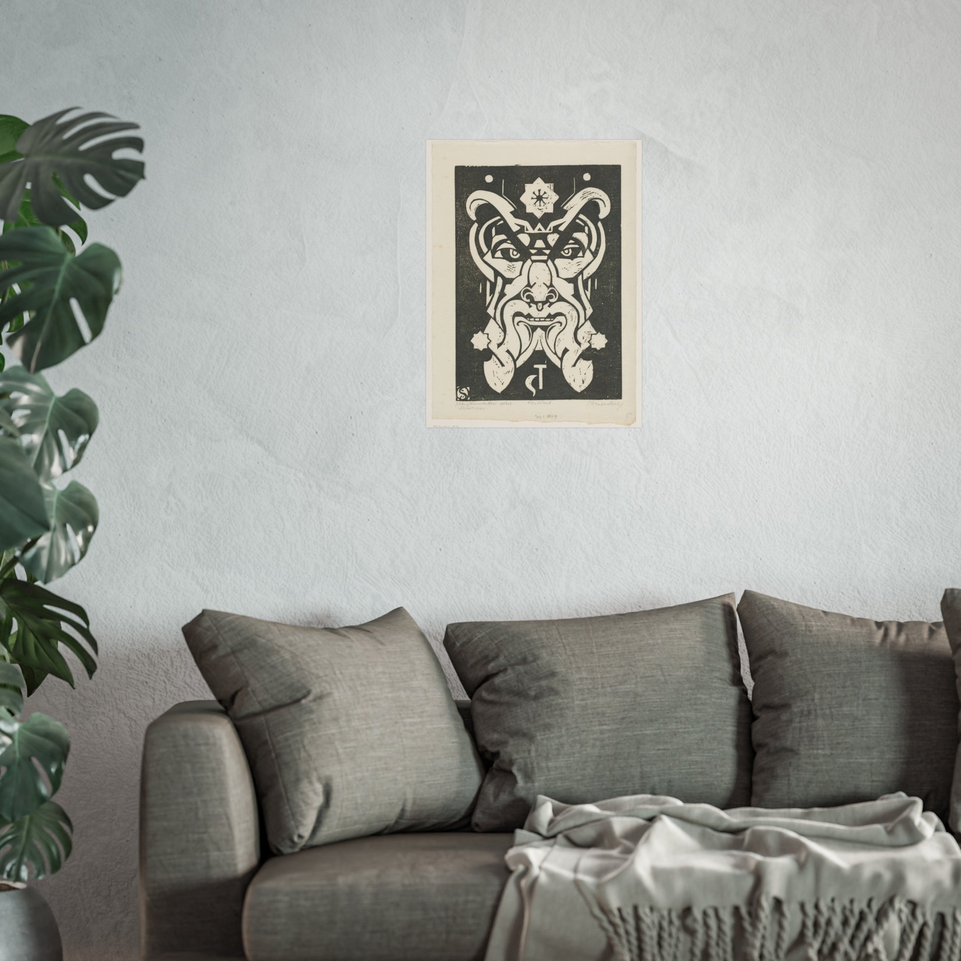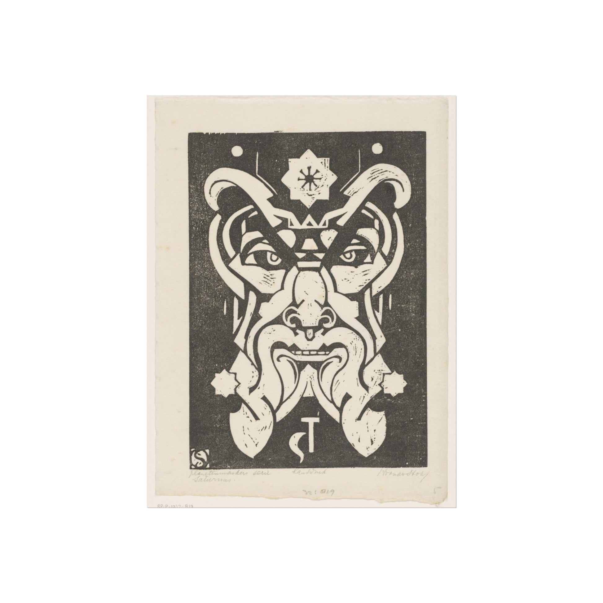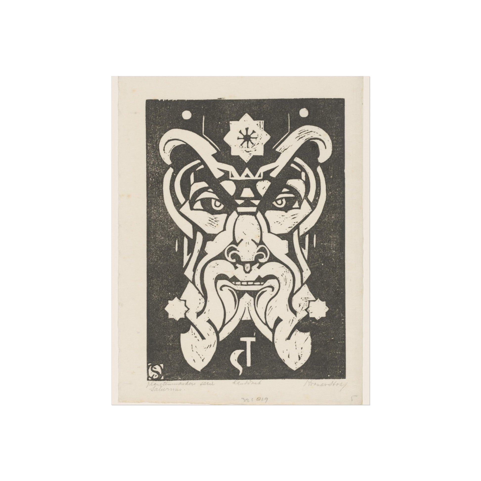 Behold a captivating mask, adorned with a beard, which serves as a symbol of strength and wisdom. At the bottom, you will find the emblem of Saturn, the Roman god of wealth and time, adding an air of mystery and intrigue.
