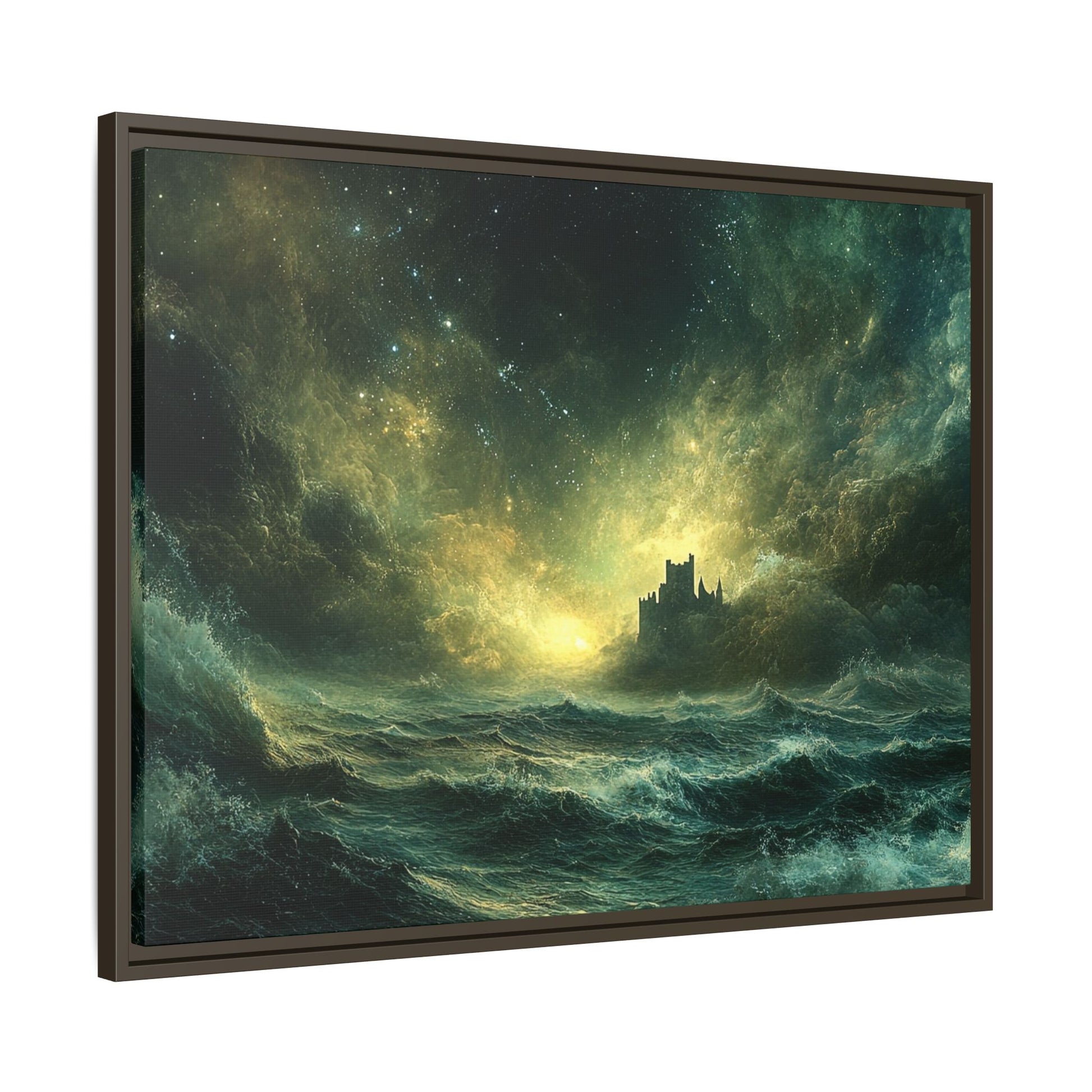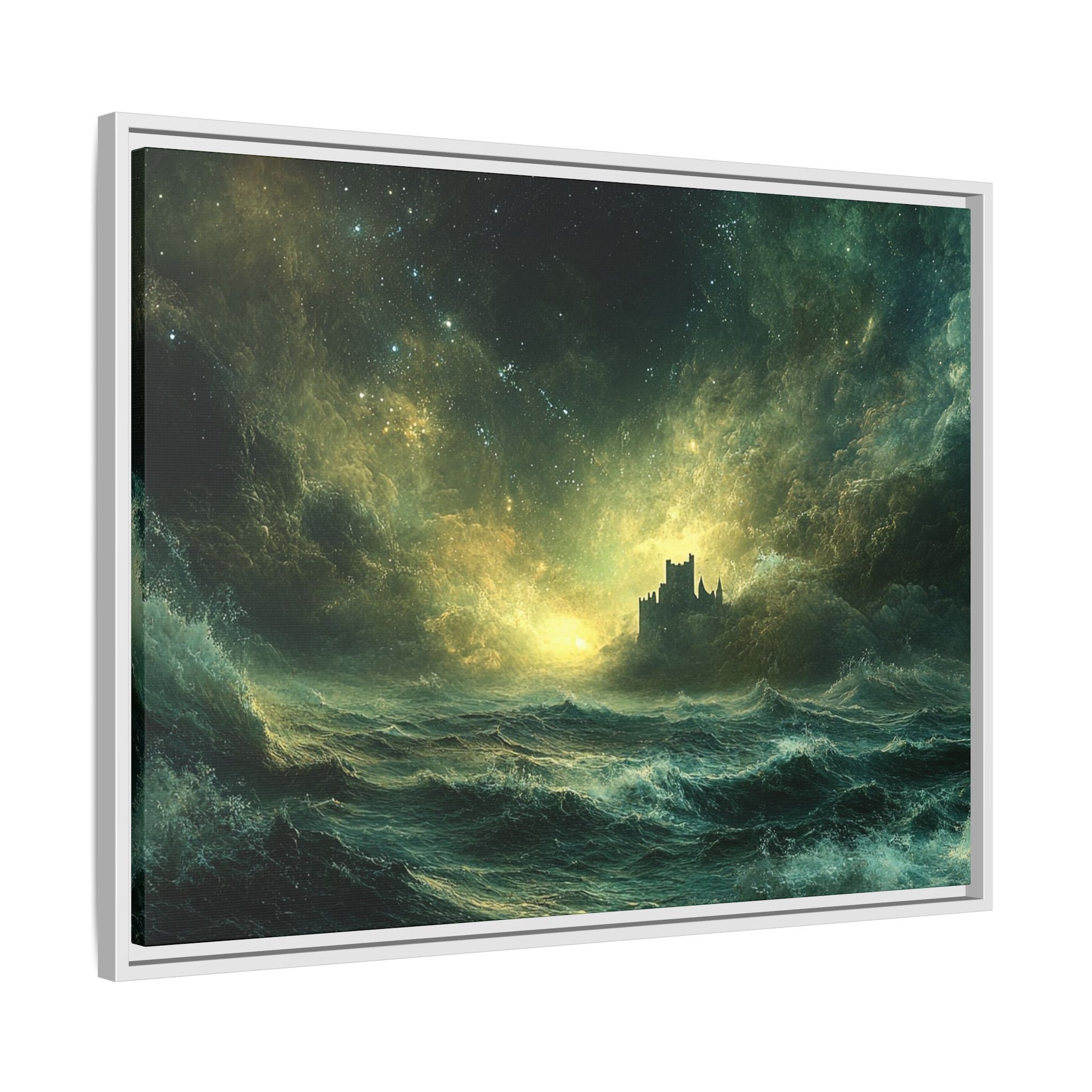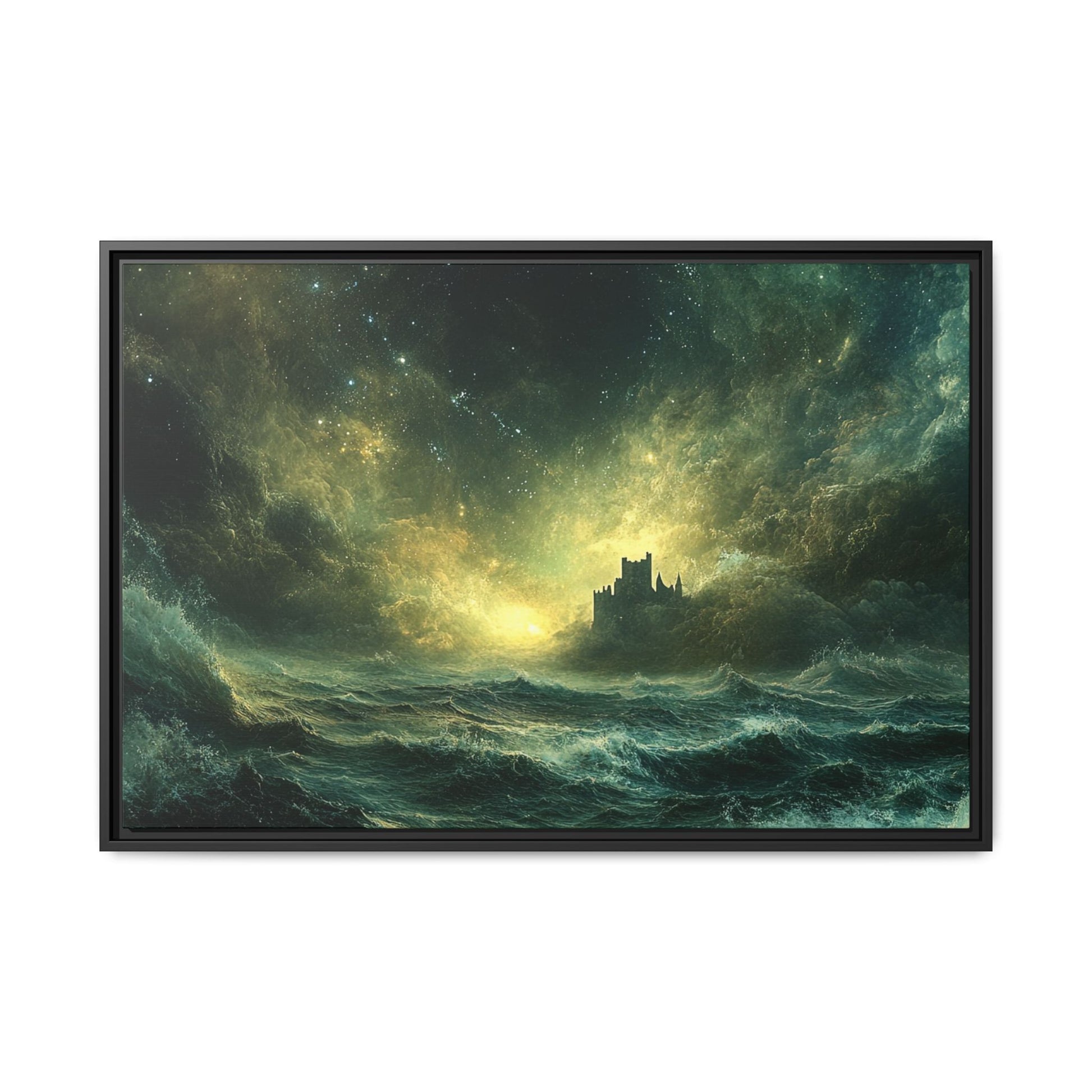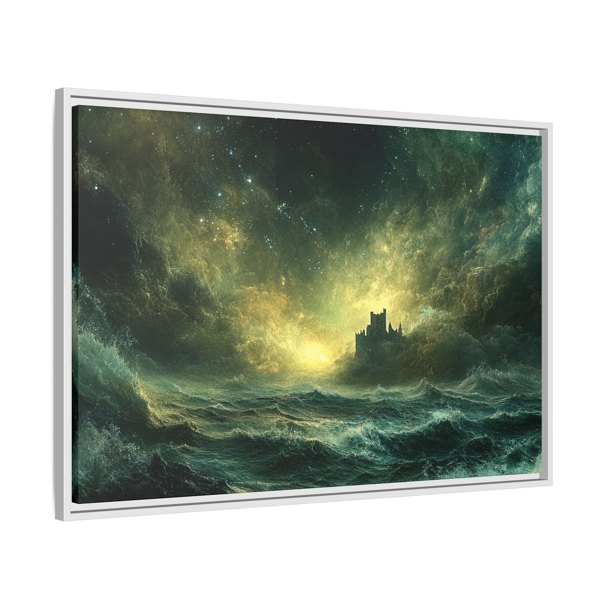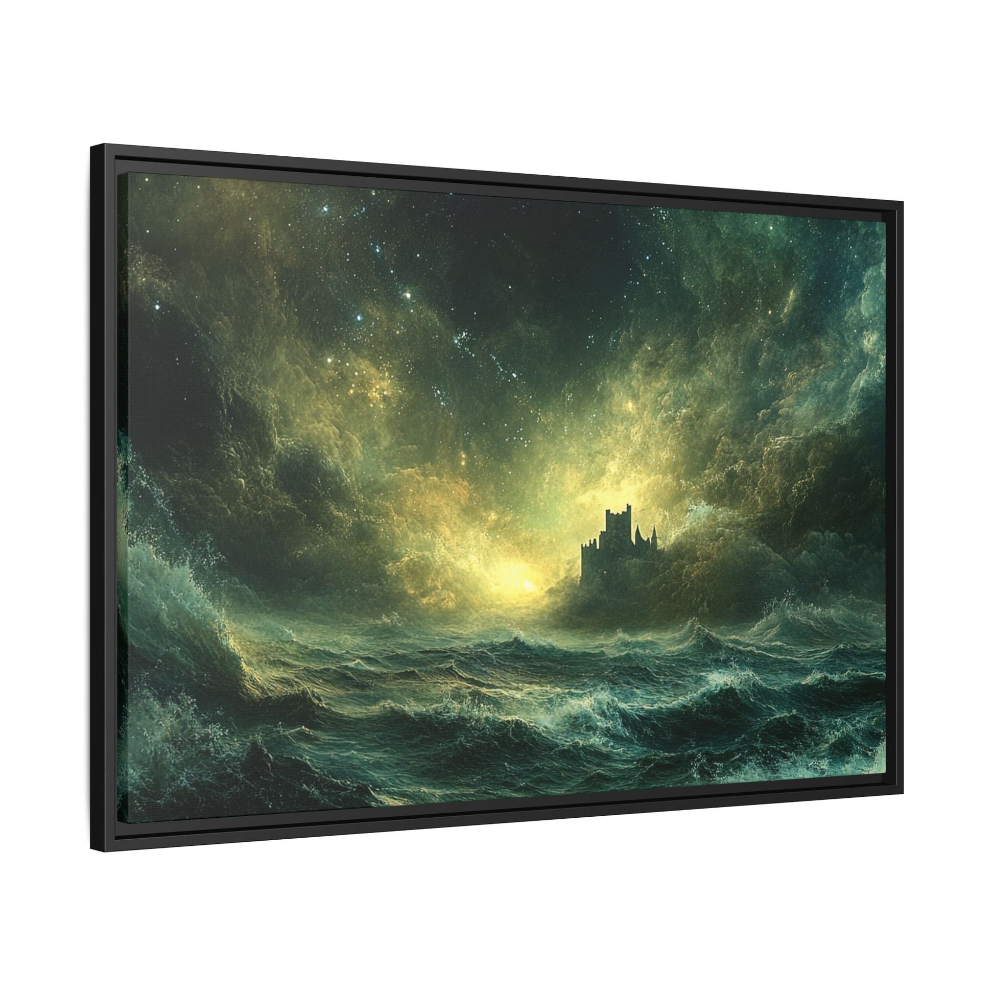 A mesmerizing digital artwork that captures the raw power and ethereal beauty of nature. This stunning piece depicts a lone castle perched precariously on a distant shore, battered by towering waves under a tumultuous, star-strewn sky. The artist masterfully blends deep teals and rich golds to create a sense of both danger and wonder.