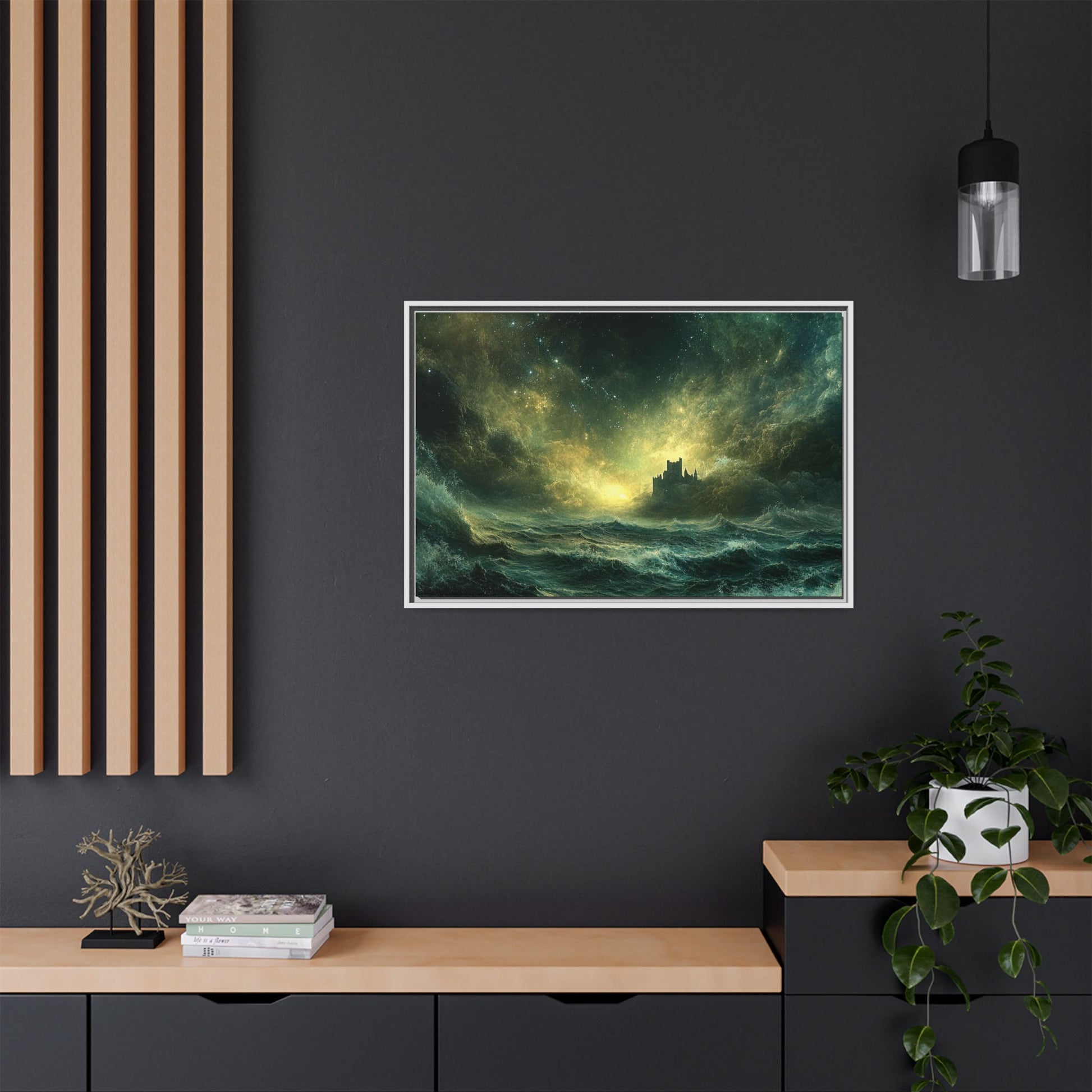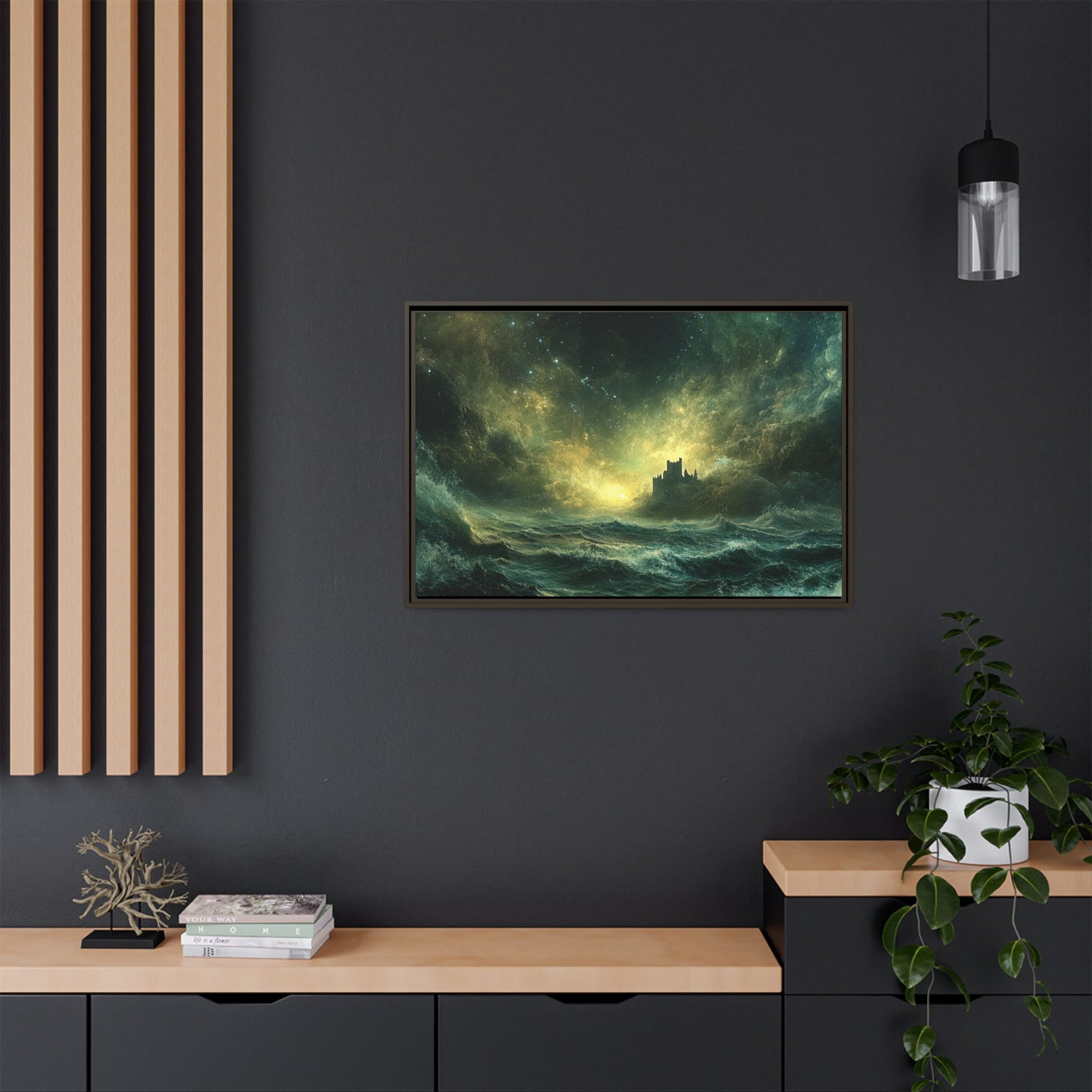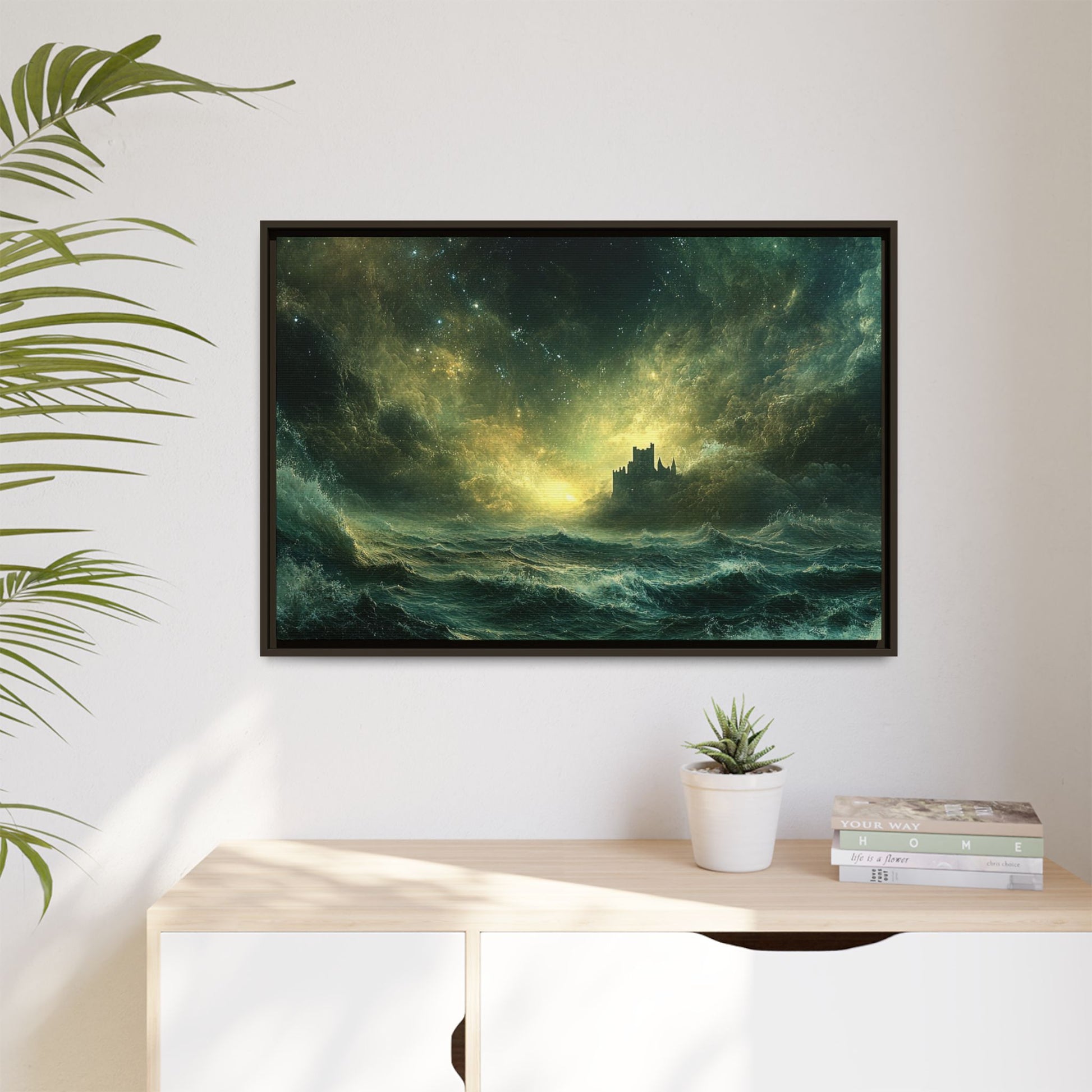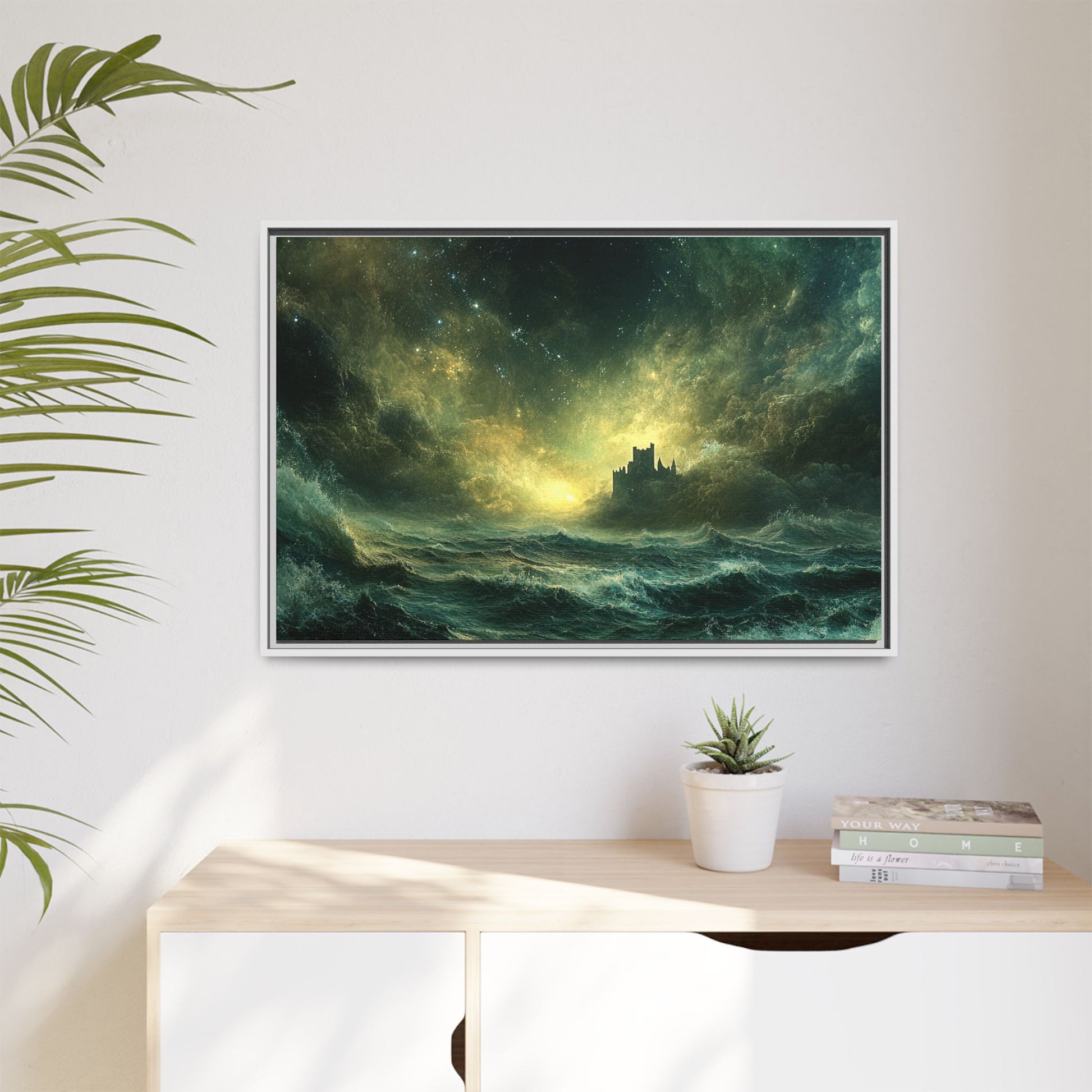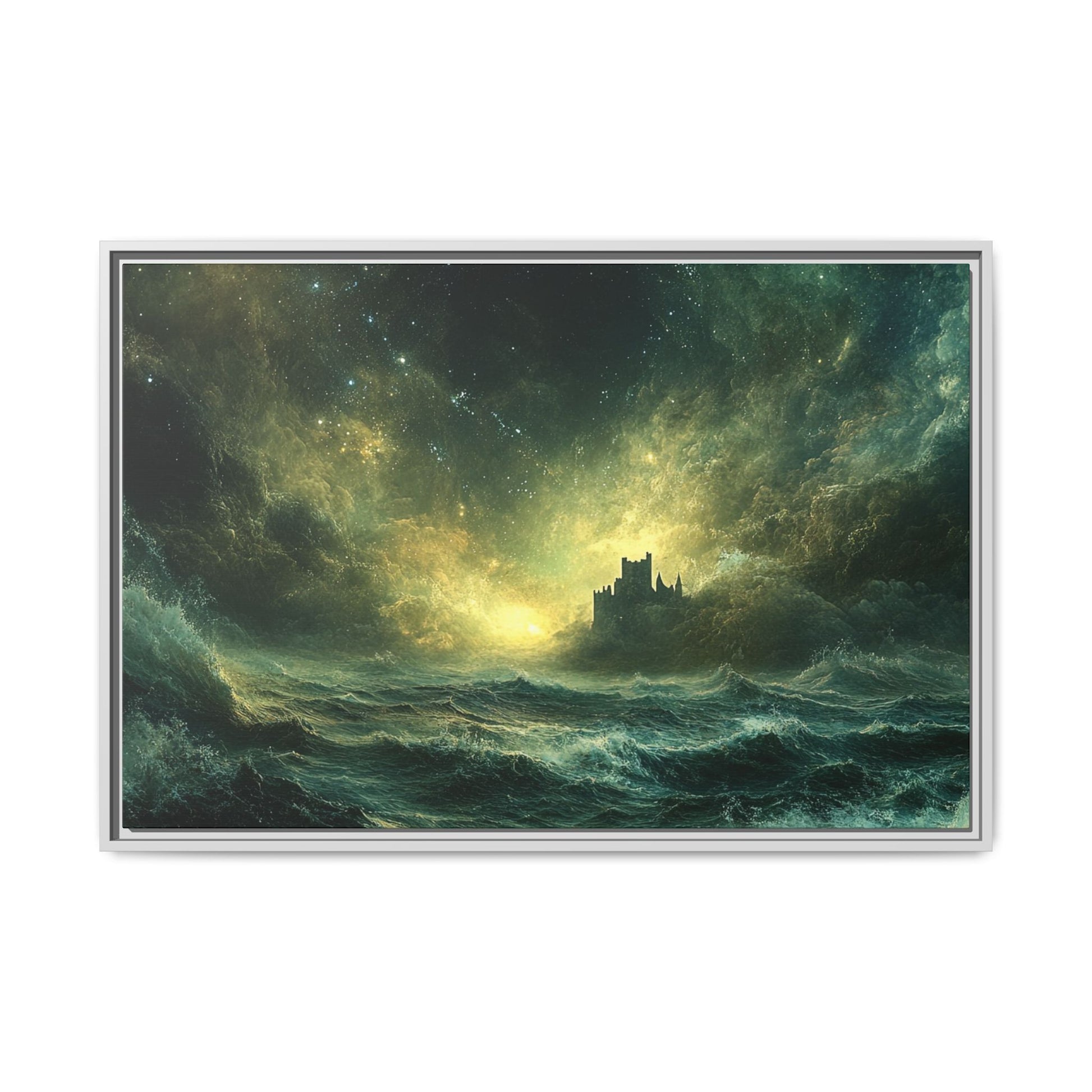 A mesmerizing digital artwork that captures the raw power and ethereal beauty of nature. This stunning piece depicts a lone castle perched precariously on a distant shore, battered by towering waves under a tumultuous, star-strewn sky. The artist masterfully blends deep teals and rich golds to create a sense of both danger and wonder.
