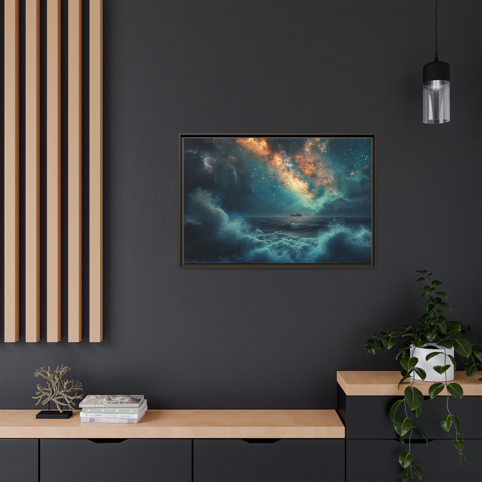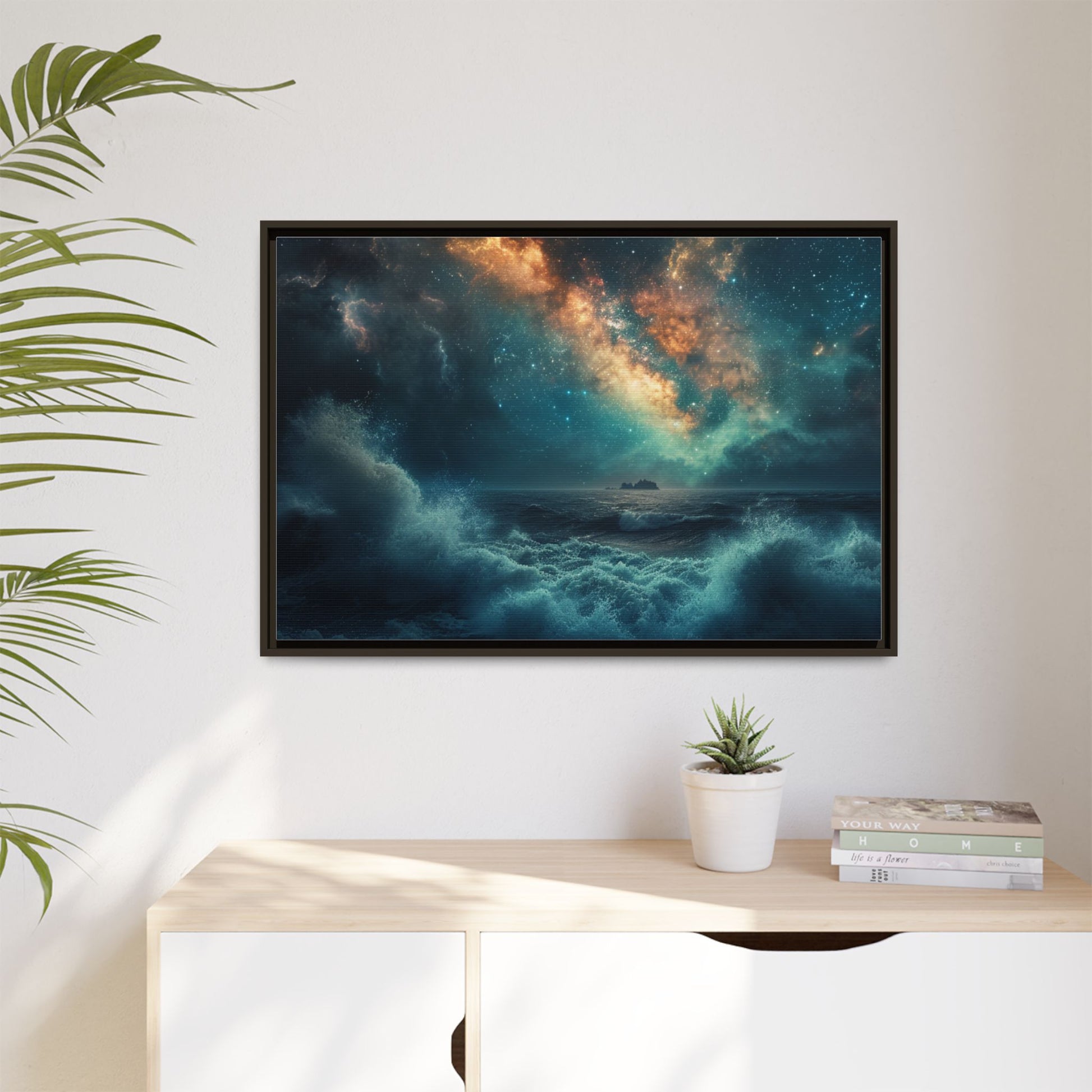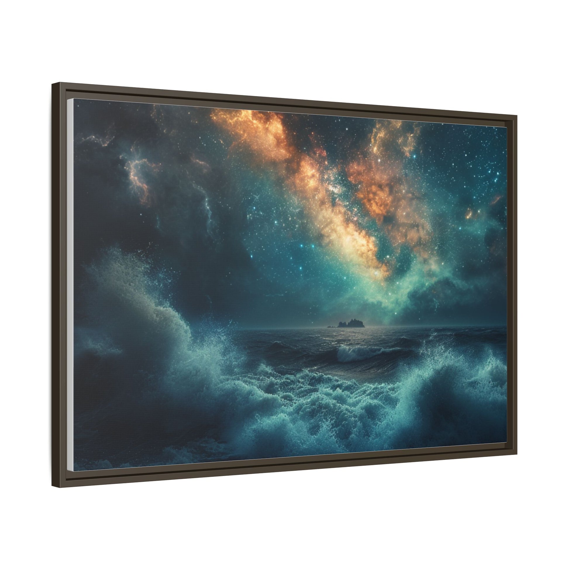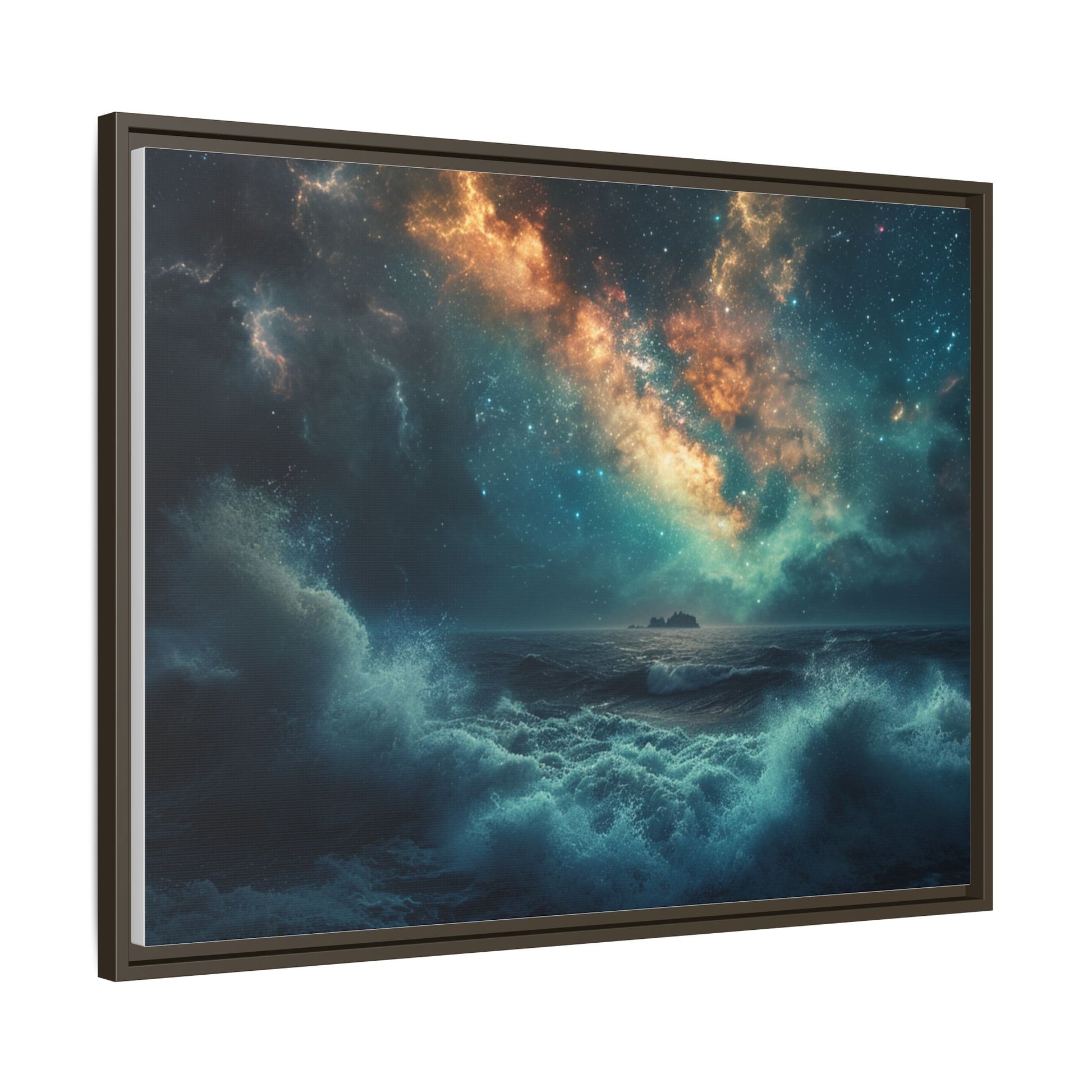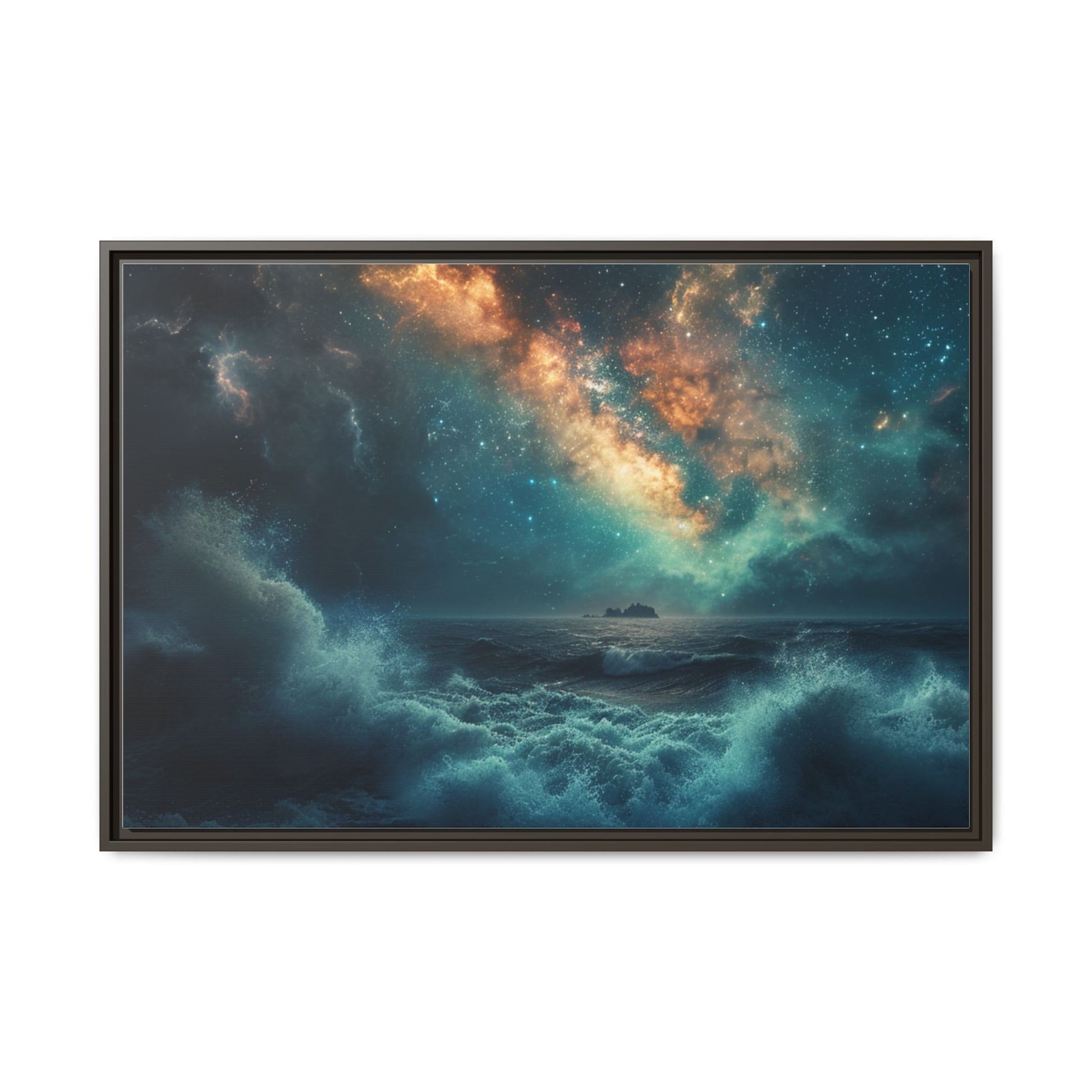 Above this turbulent expanse, the heavens unfurl in a breathtaking display of celestial wonder. A vast galaxy sprawls across the night sky, its spiraling arms awash in hues of gold, amber, and teal. Countless stars punctuate the cosmic canvas, their light piercing through veils of cosmic dust and gas. At the horizon, a lone island stands sentinel, a silent witness to the marriage of sea and stars, grounding the ethereal scene in earthly reality. This artwork is a visual poem, singing of the beauty and mystery that exist in the liminal spaces between our world and the infinite cosmos beyond.