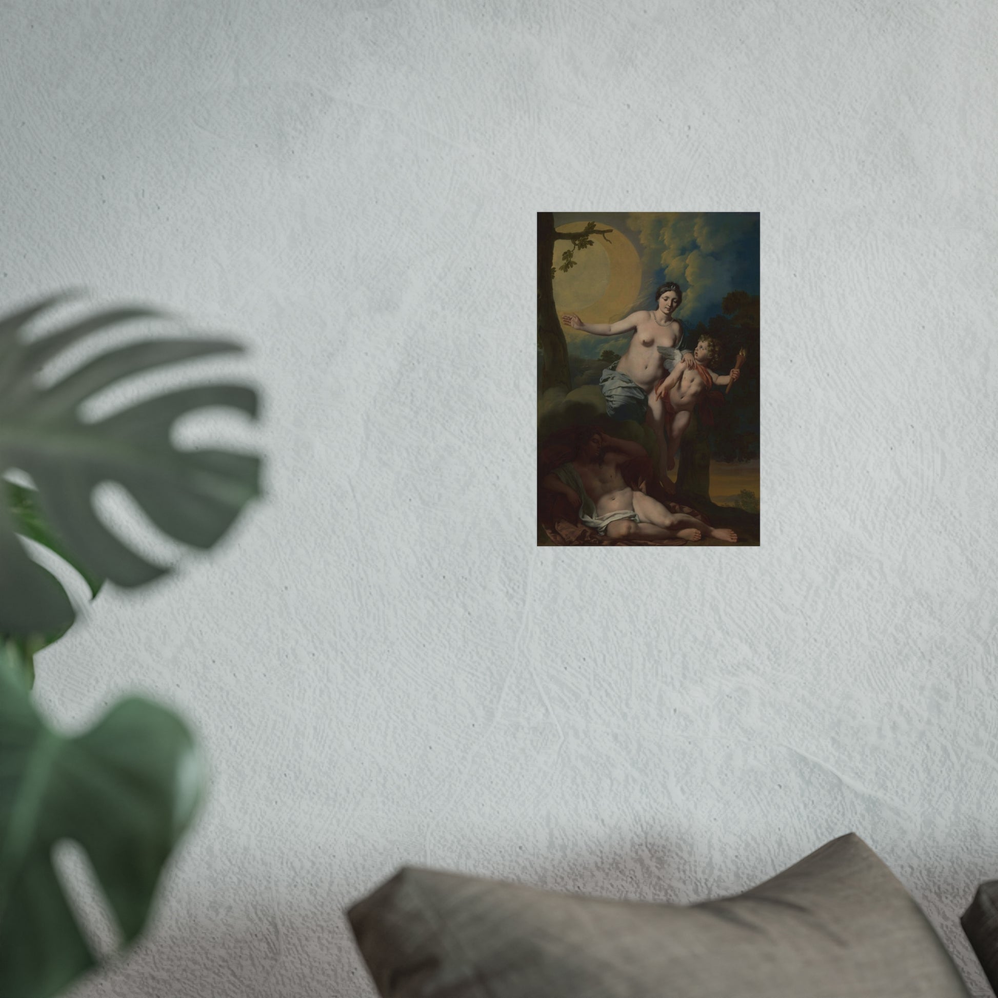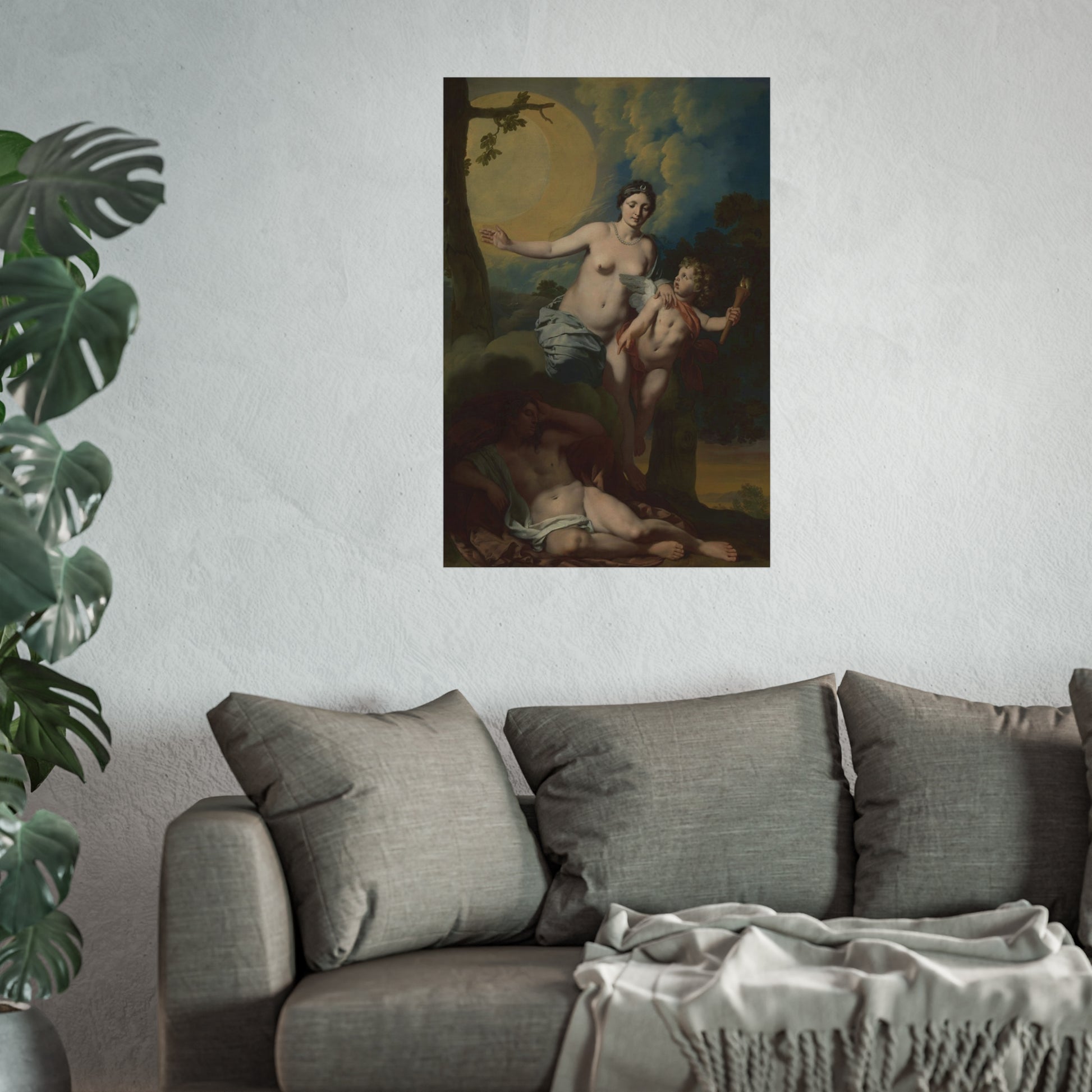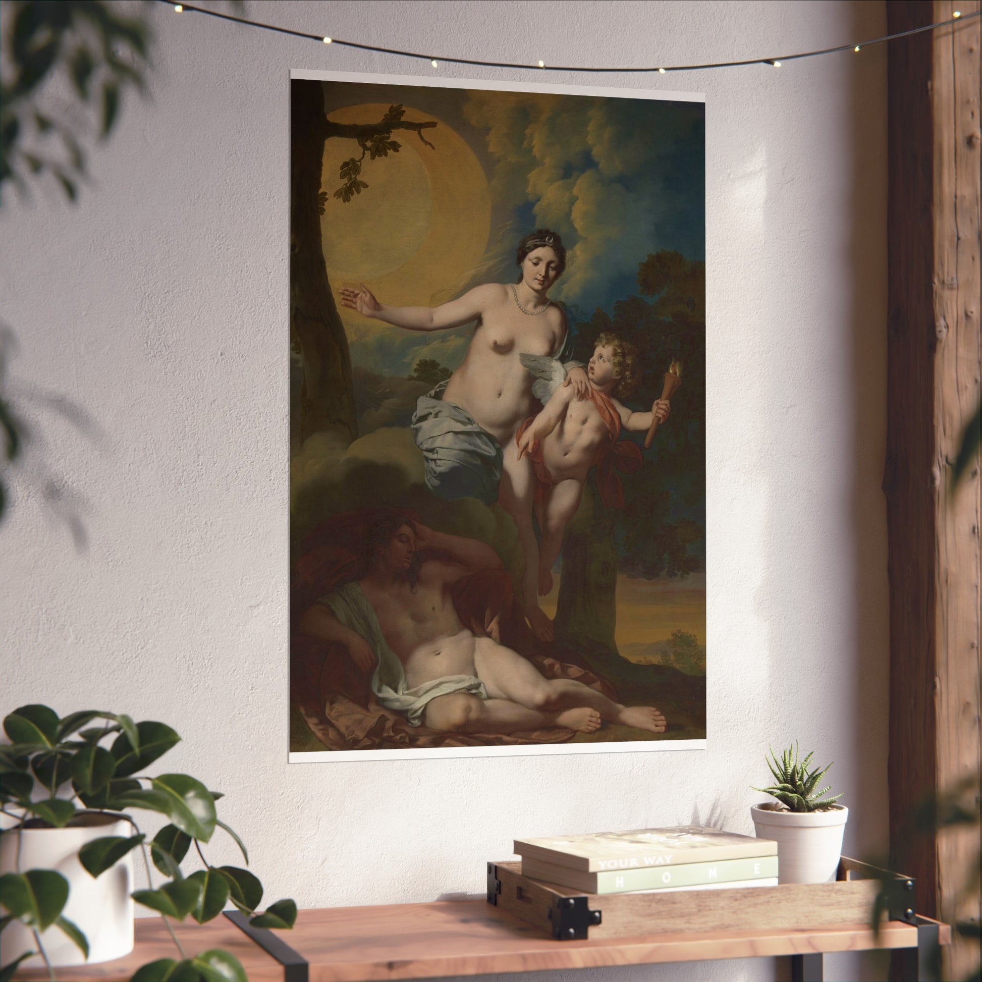 This captivating artwork showcases Cupid, armed with a burning torch, drawing the attention of Selene (or Diana) to the sleeping Endymion. Behind the moon goddess, the moon radiates brilliantly in the sky, nestled amongst the clouds. The scene is a stunning depiction of mythological lore, painted with exquisite detail and emotion.