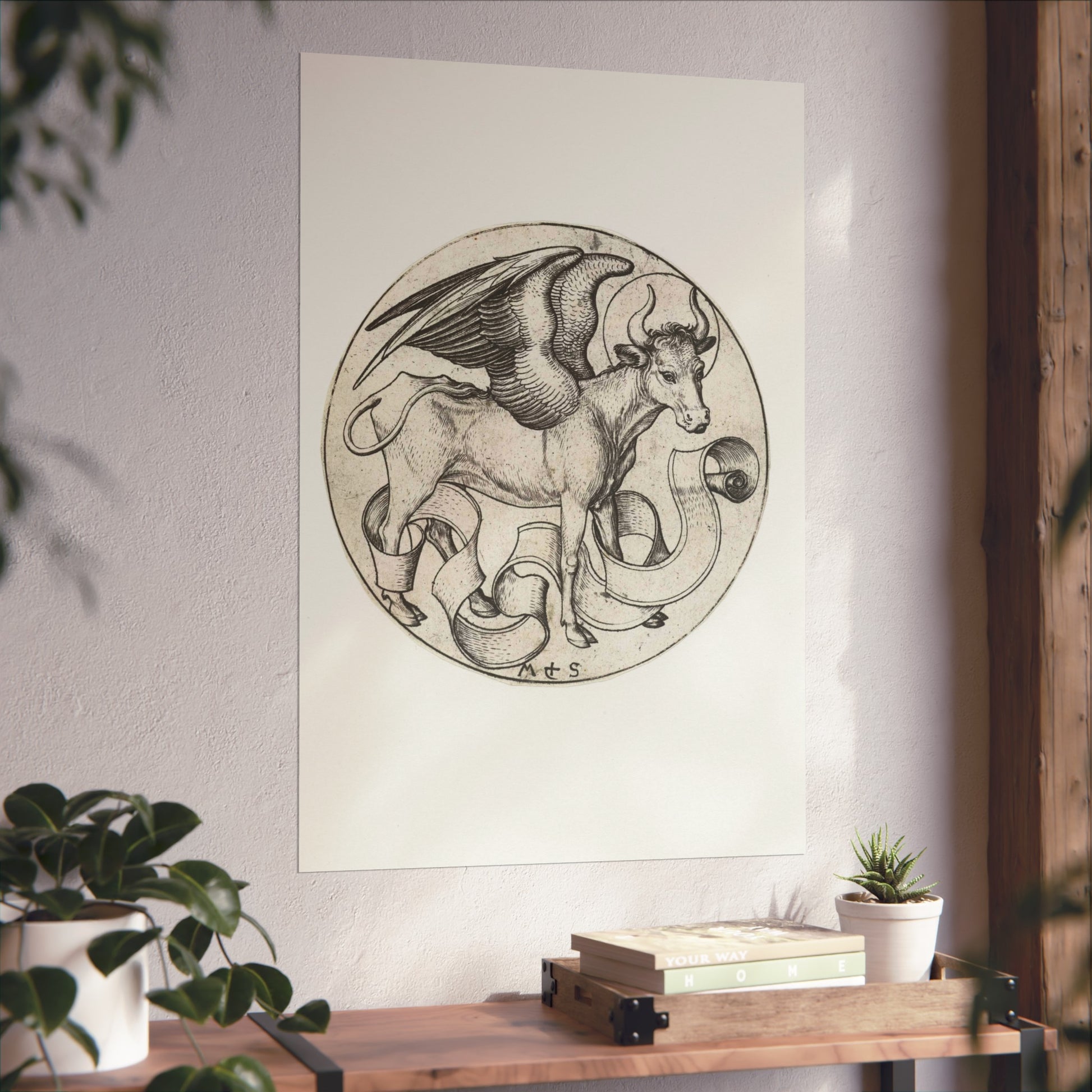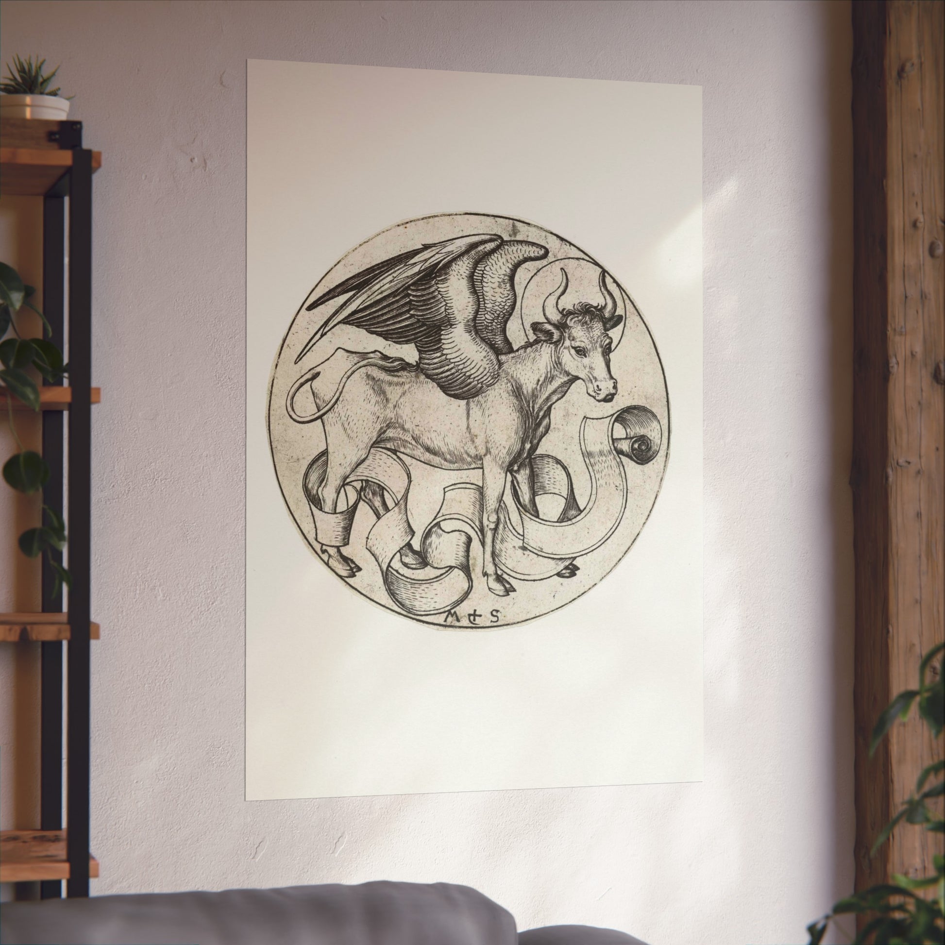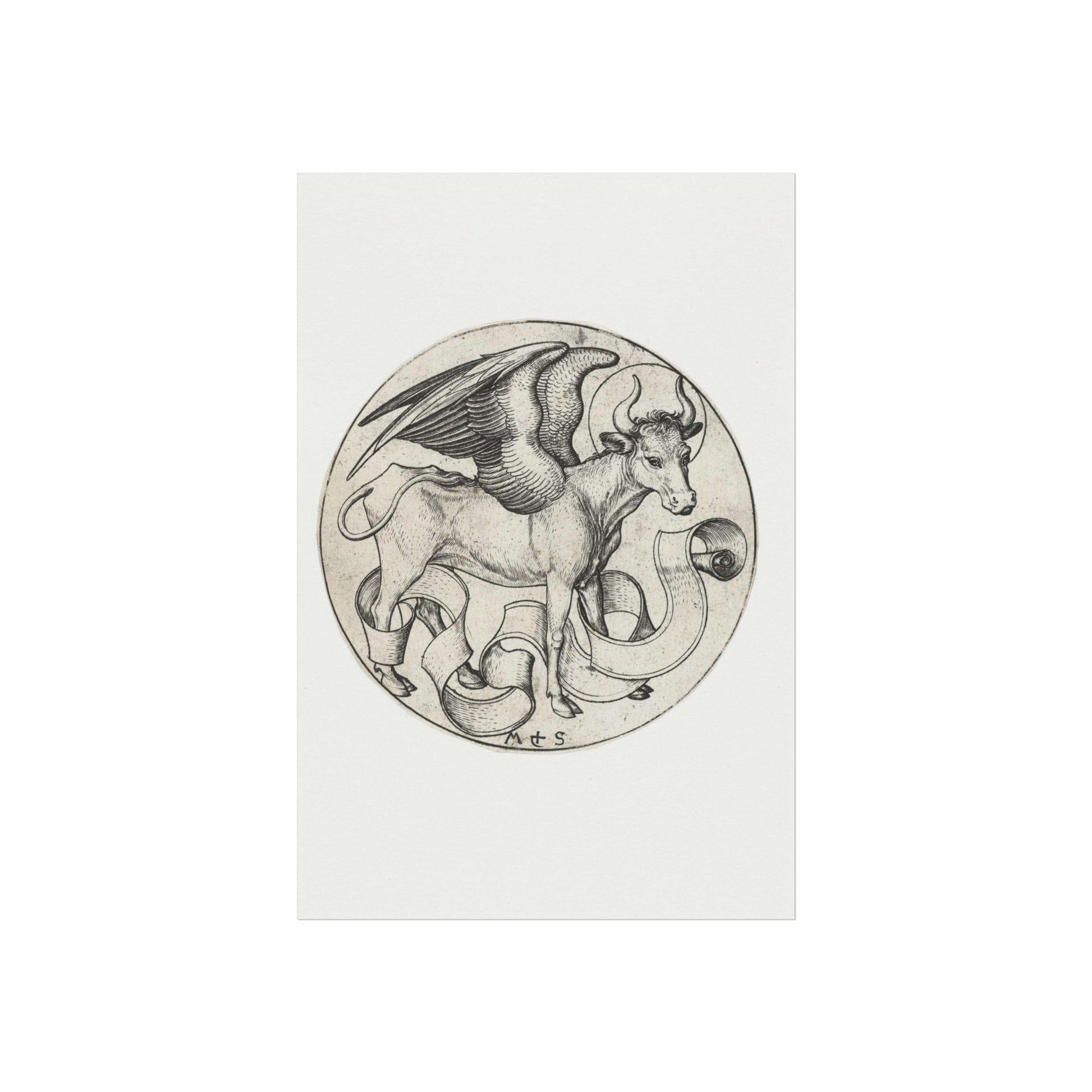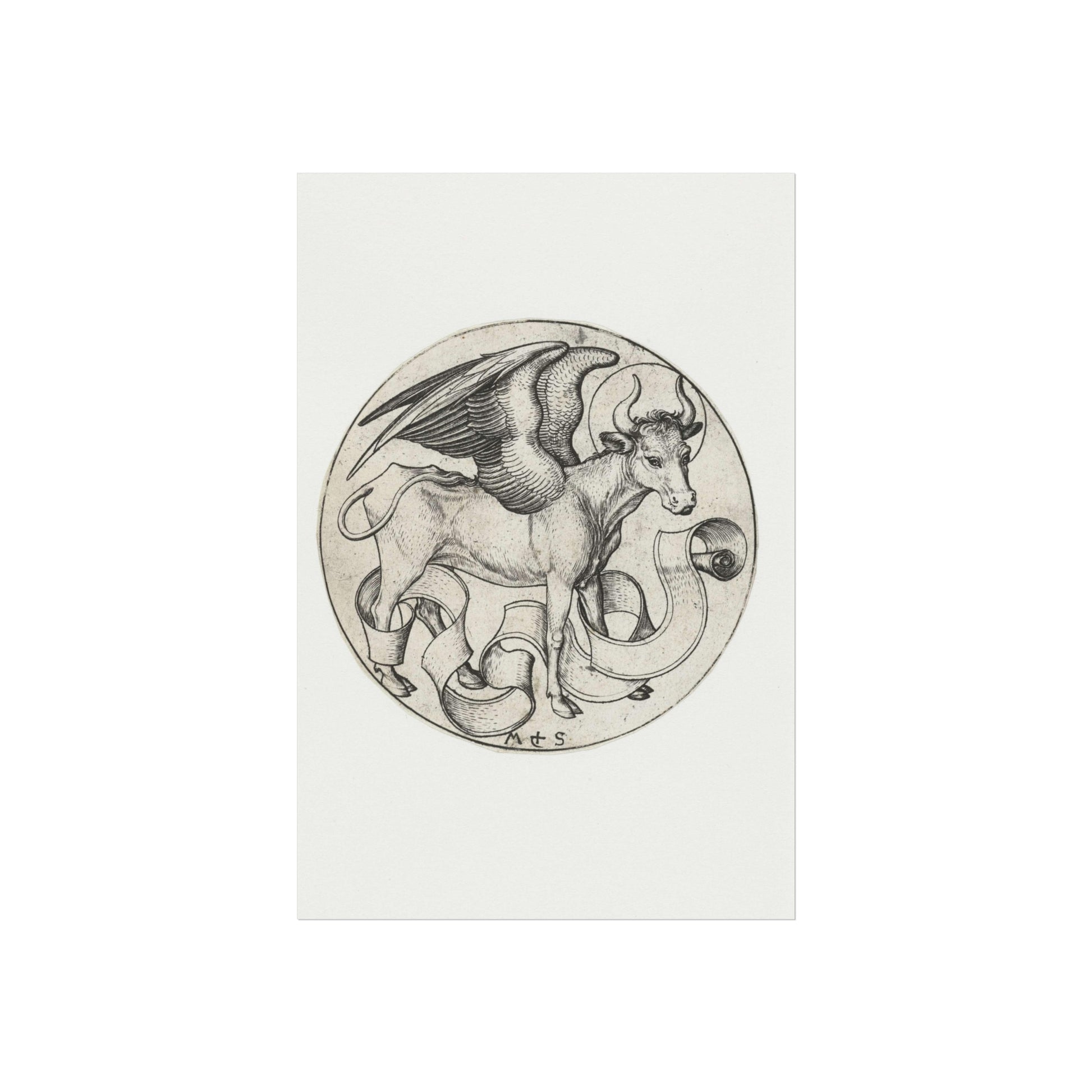 Behold a winged ox, adorned with a banner between its legs, symbolizing the evangelist Luke. This captivating print is part of a series of four circular prints, each representing the symbols of the Evangelists. A splendid work from the masterful hands of Martin Schongauer.